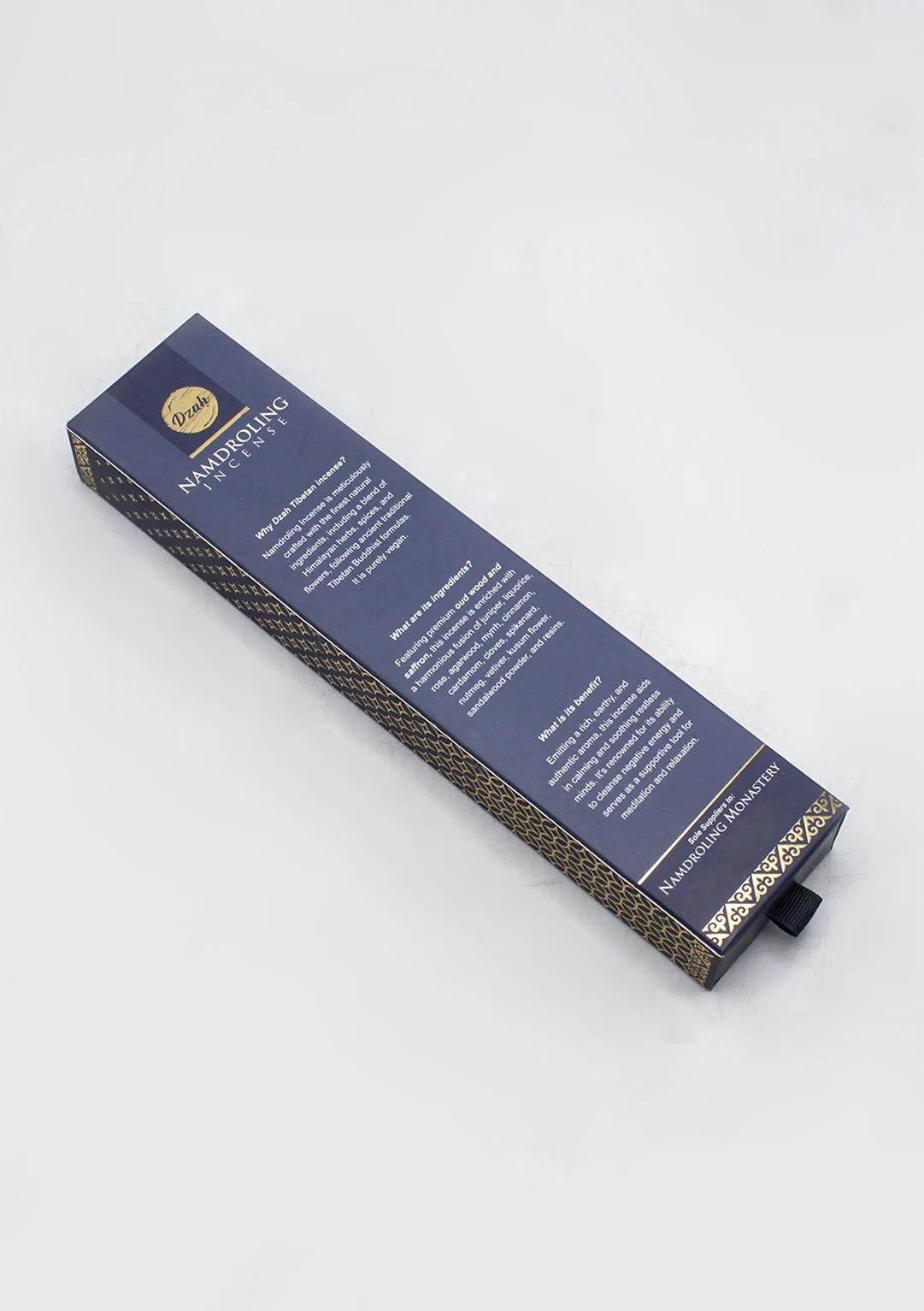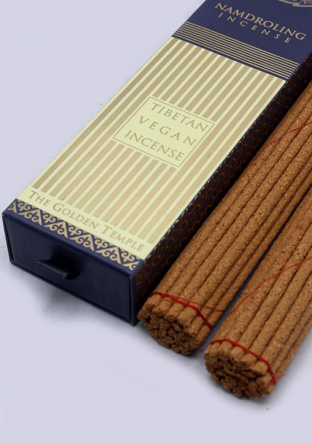 Namdroling Tibetan herbal incense is composed of a blend of precious aromatic substances such as juniper, agarwood, myrrh, cardamon, sandal, saffron and many other ingredients that are listed on the package.