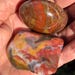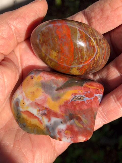 Gorgeous Ocean Jasper Palm Stone, round and polished, with gorgeous colors of gold, orange, bronze, and blue-grey.