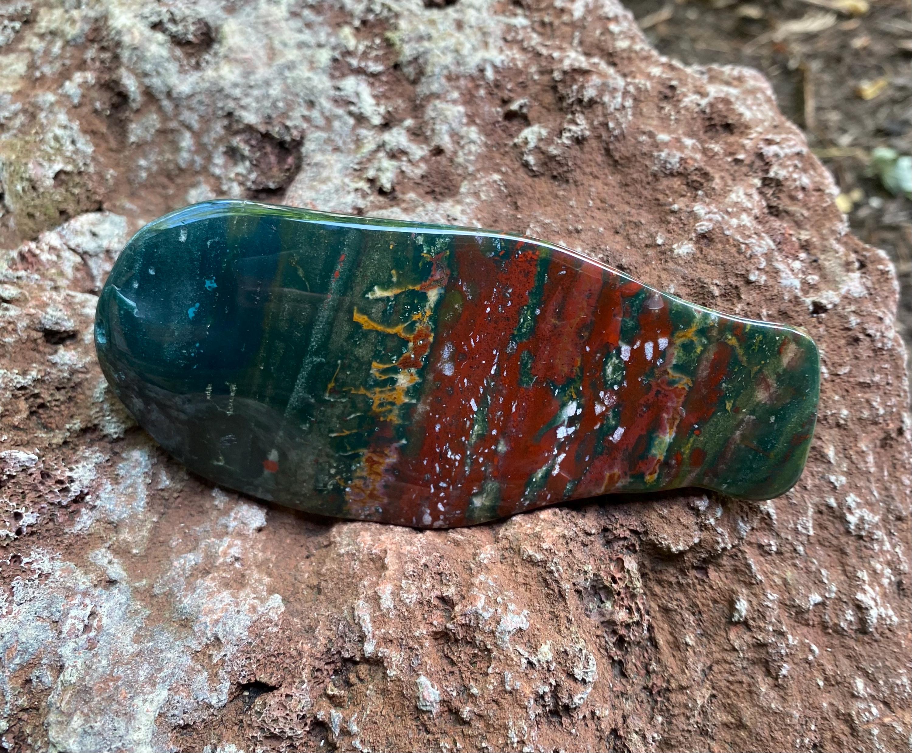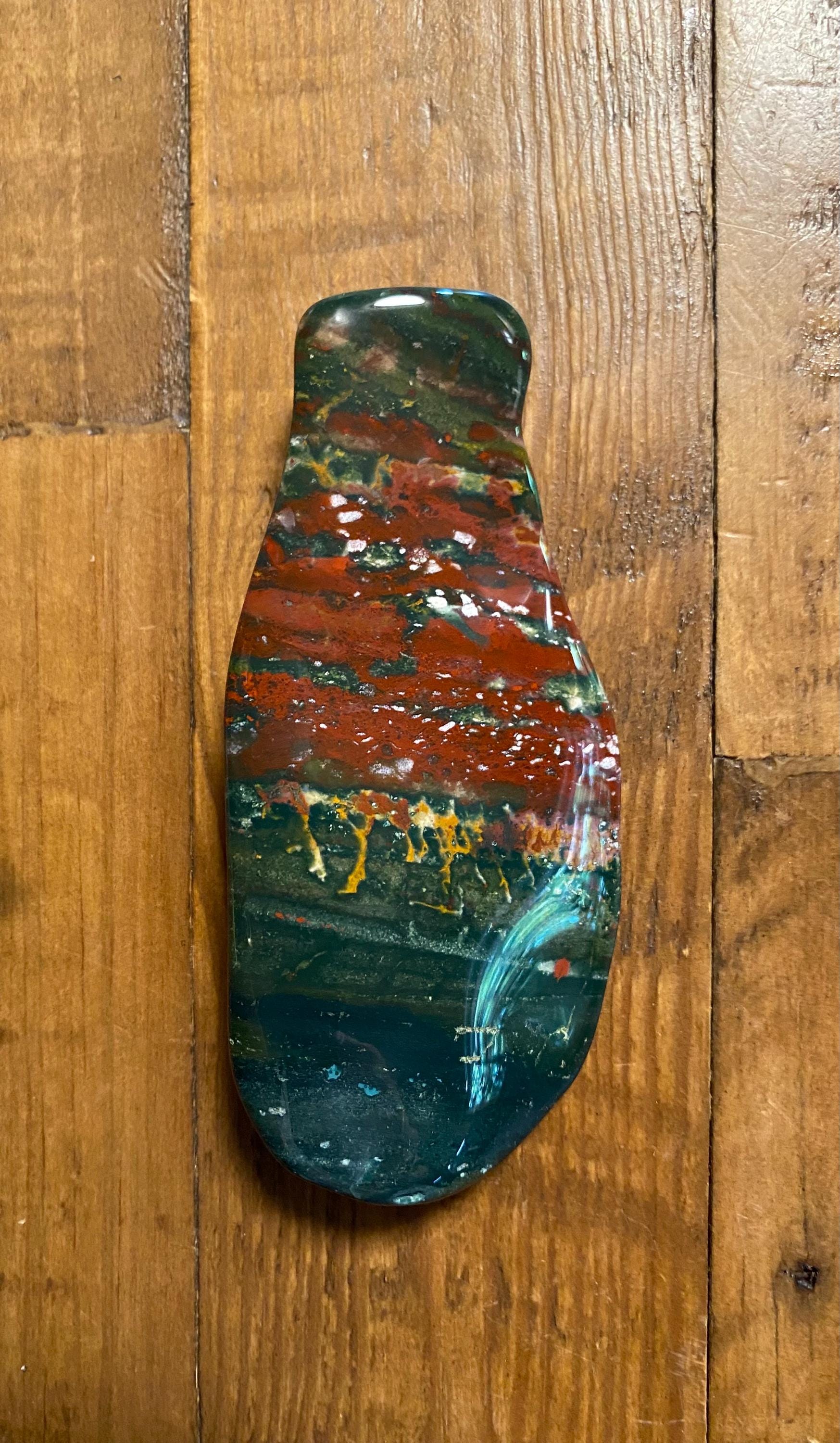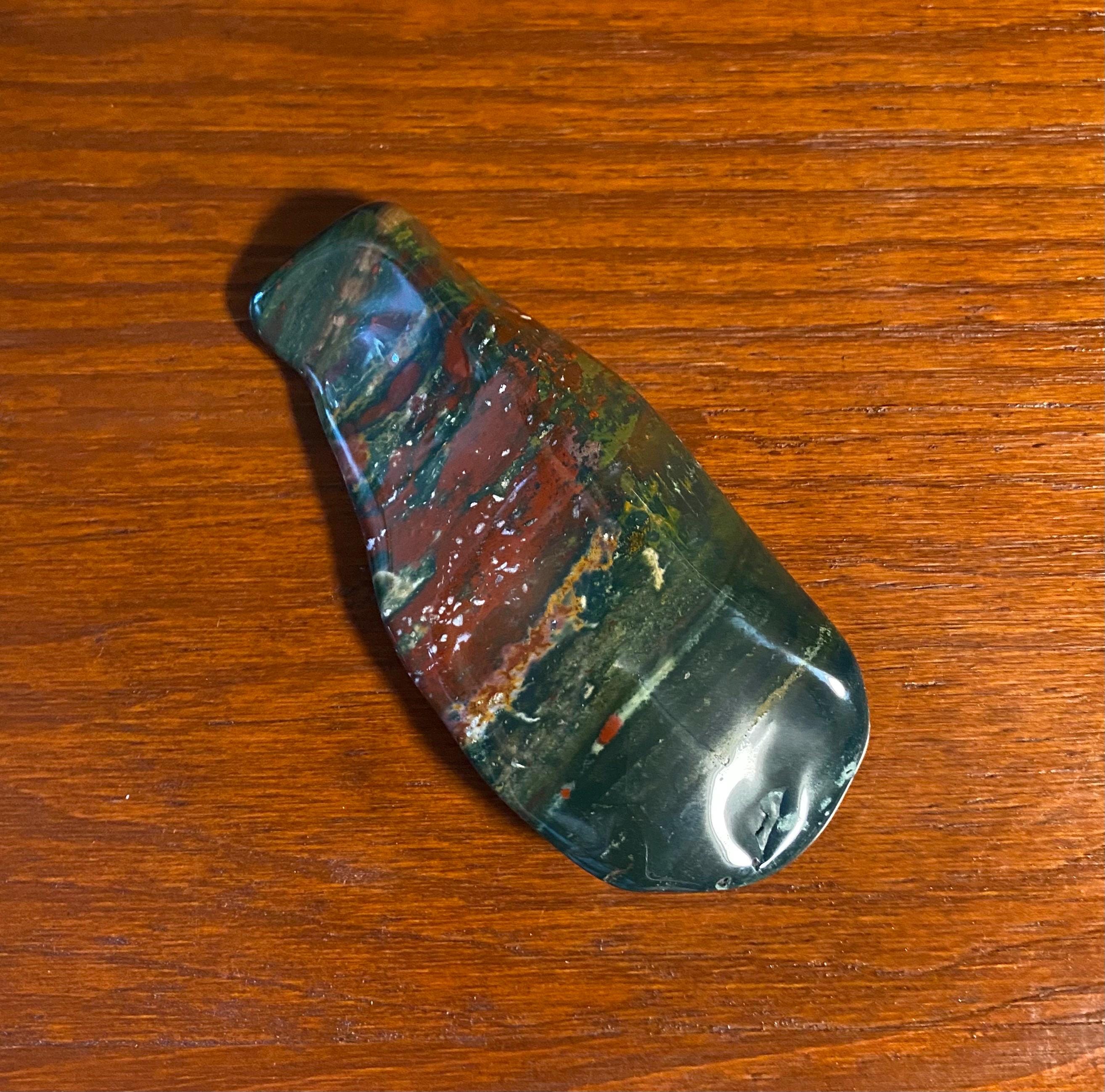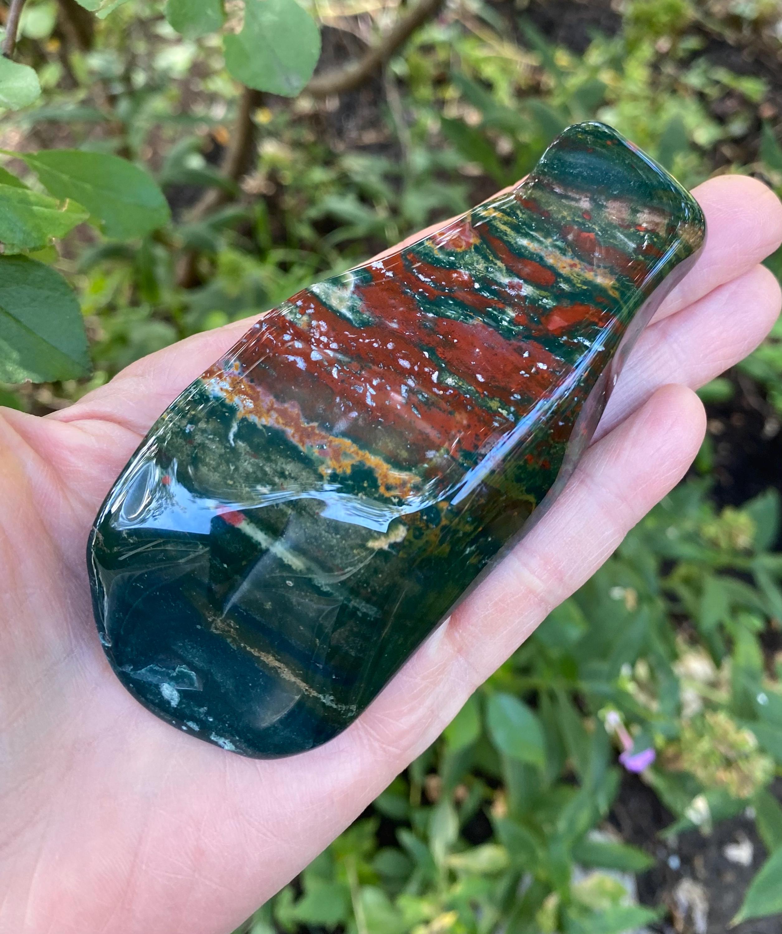 A lovely freeform polished Bloodstone with an elongated shape, gorgeous coloring of varying shades of green, red, gold and white, with a shallow crevice or two.