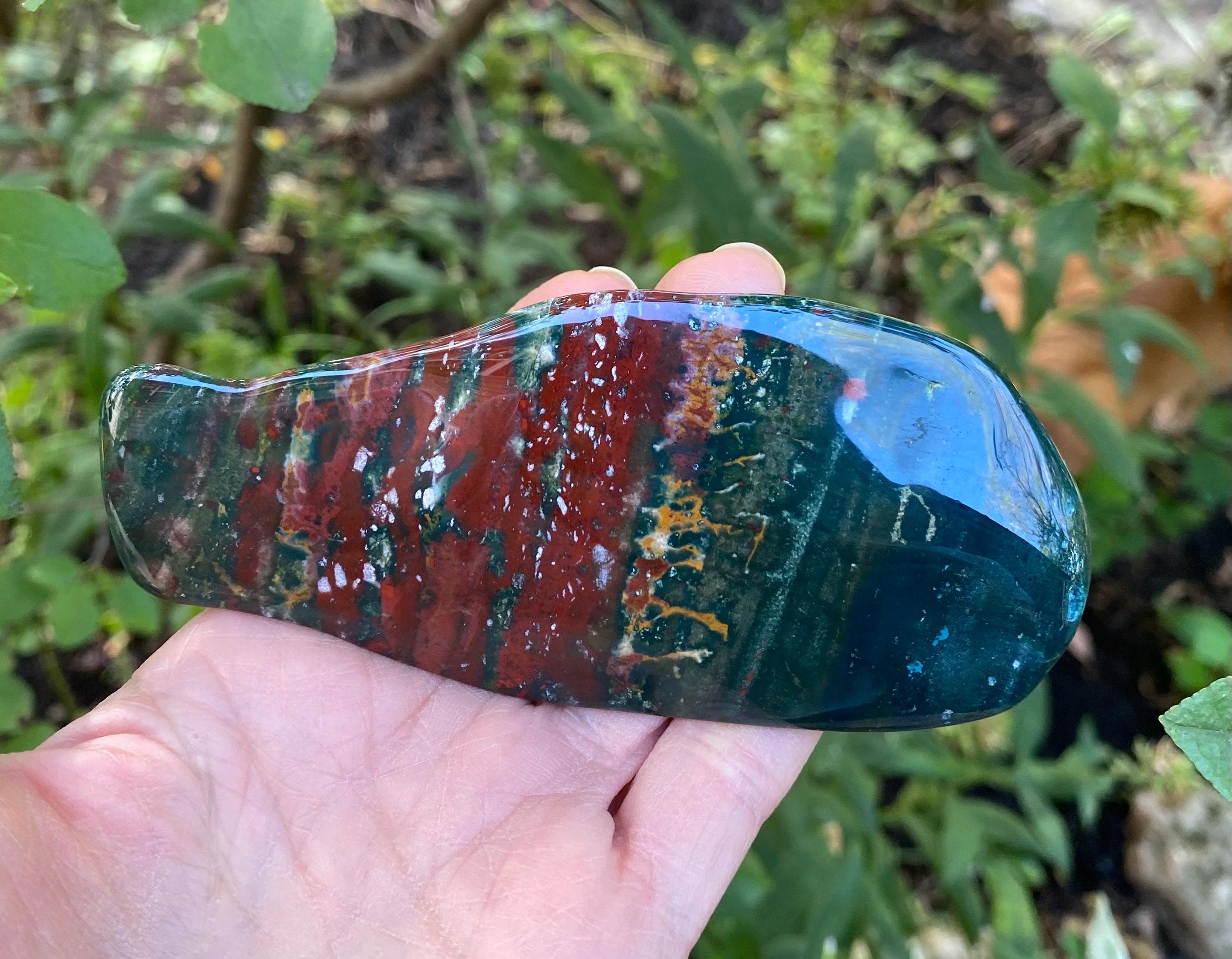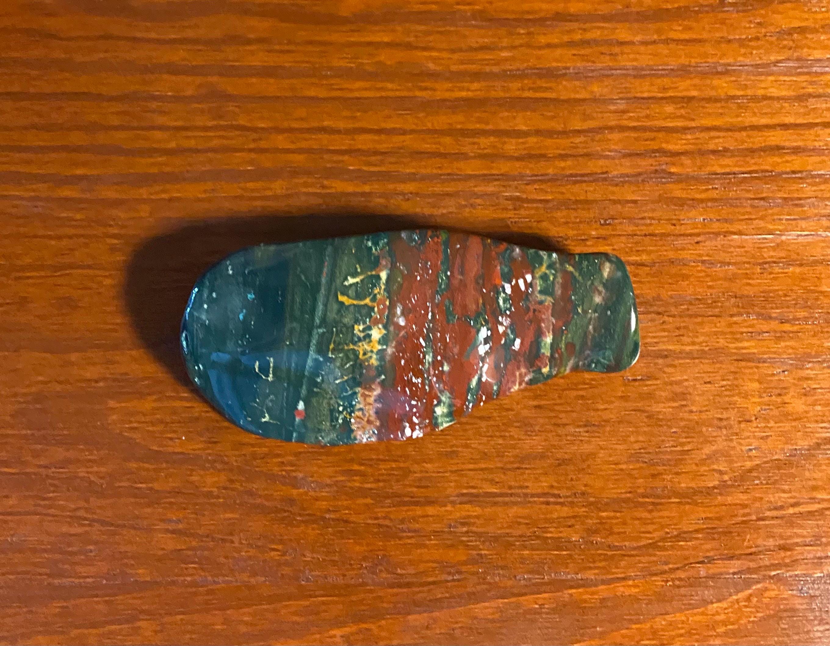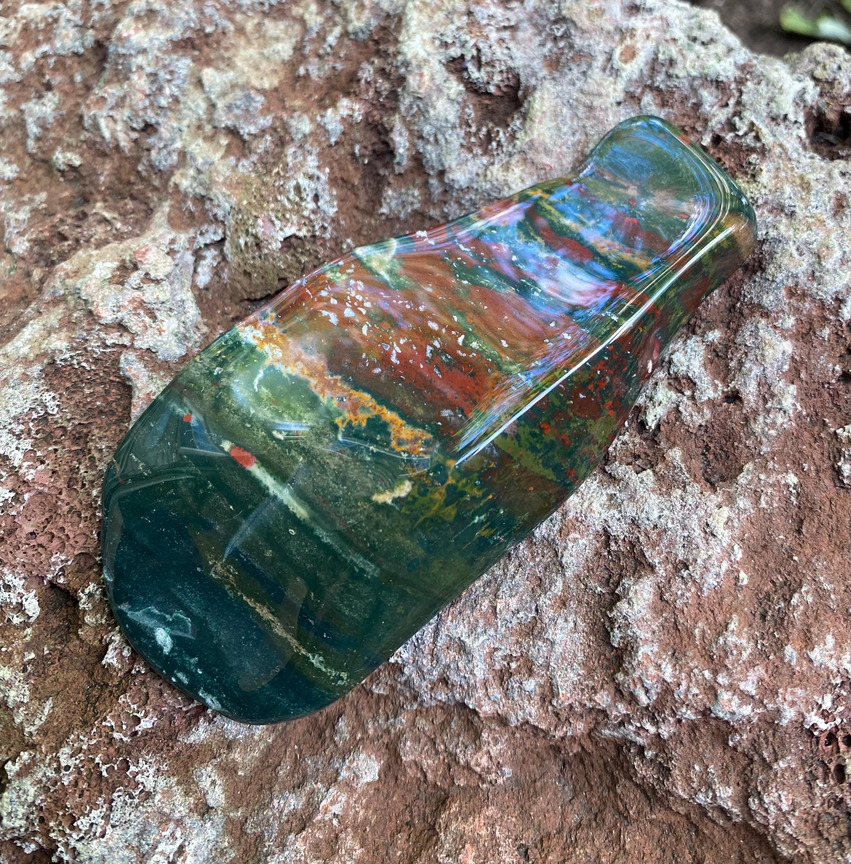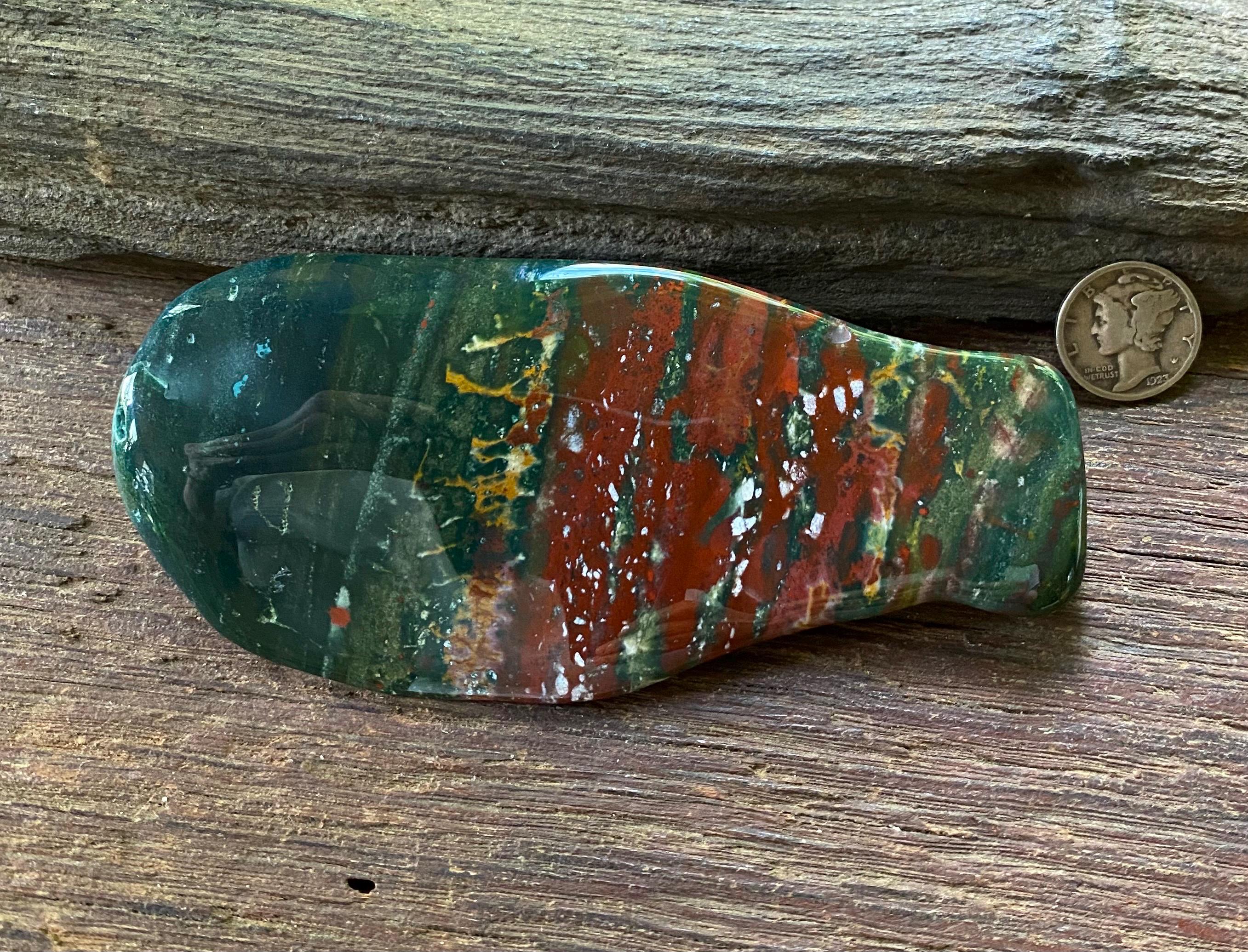 A lovely freeform polished Bloodstone with an elongated shape, gorgeous coloring of varying shades of green, red, gold and white, with a shallow crevice or two.