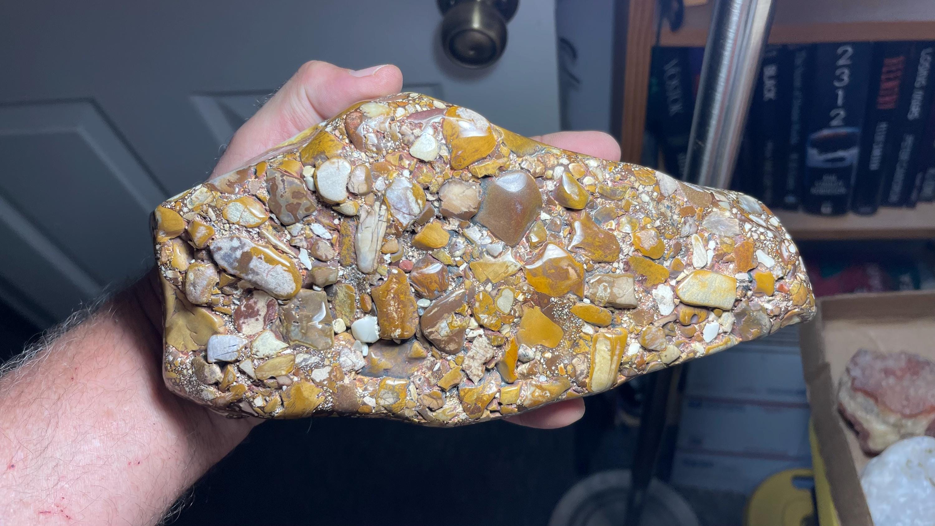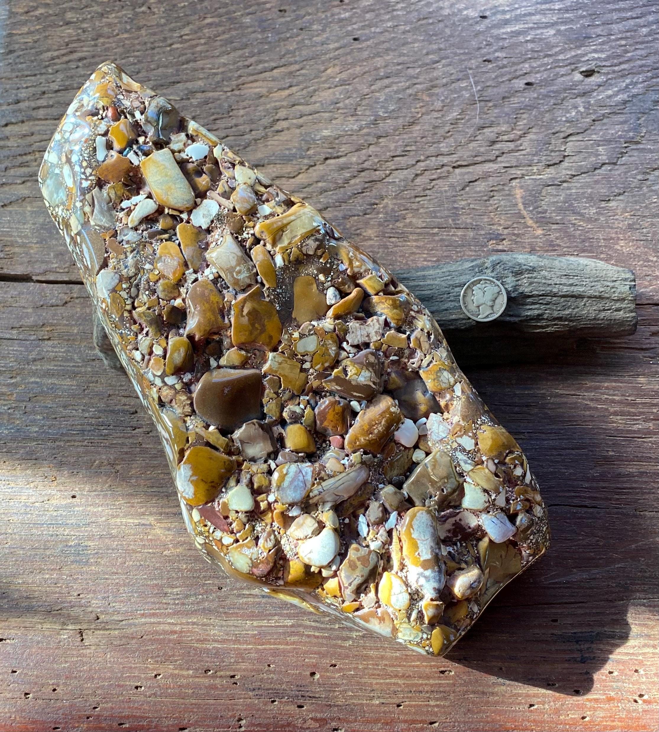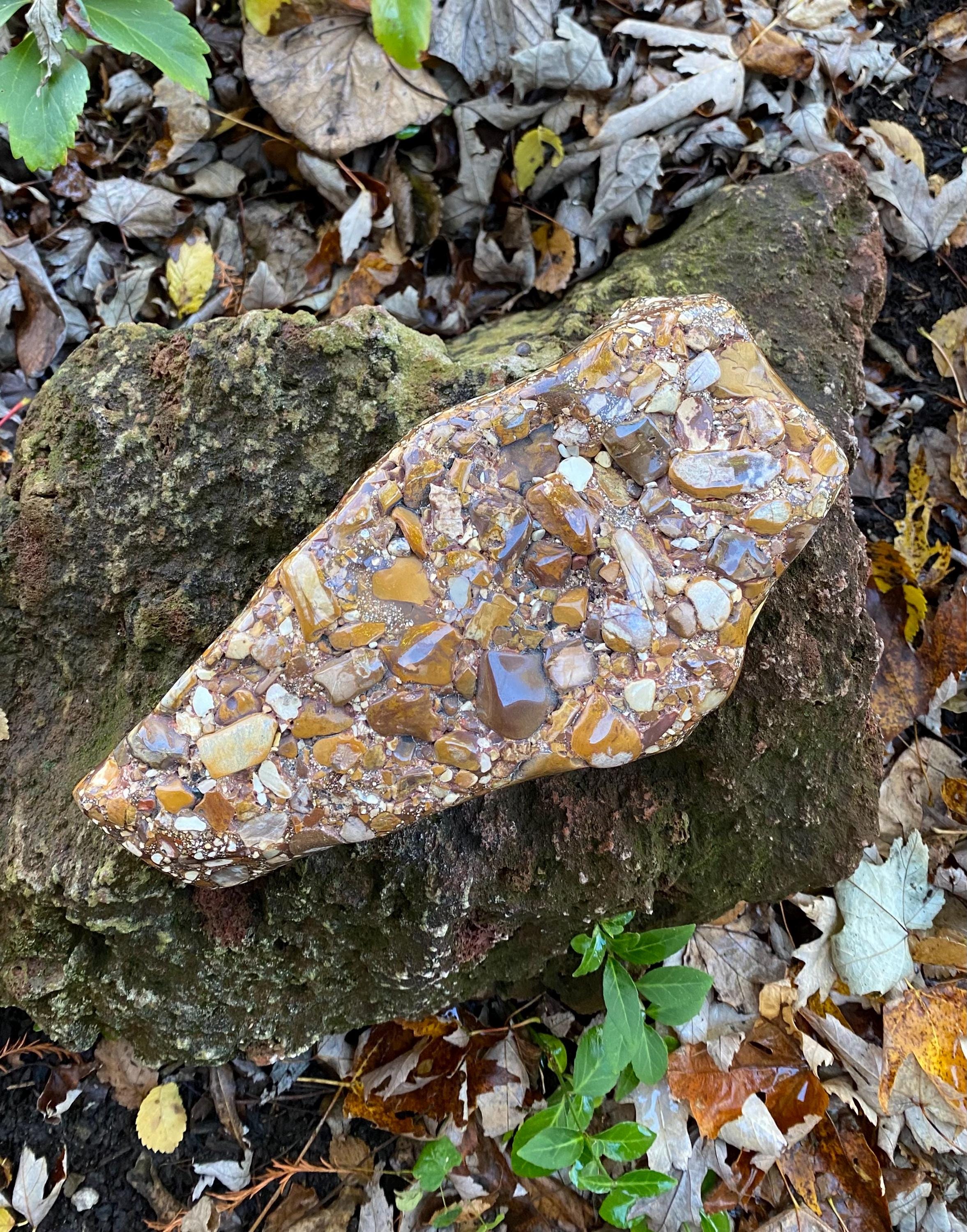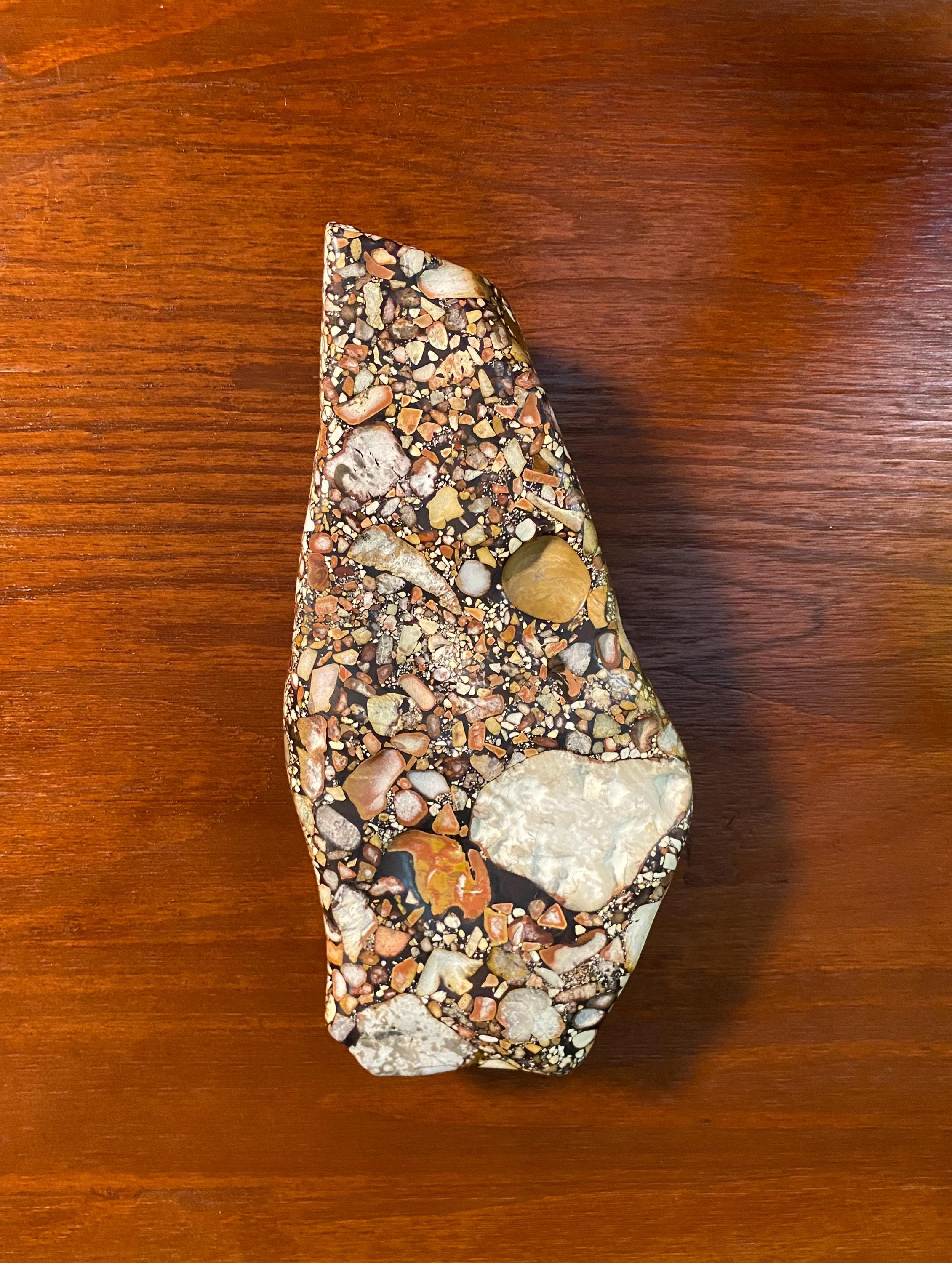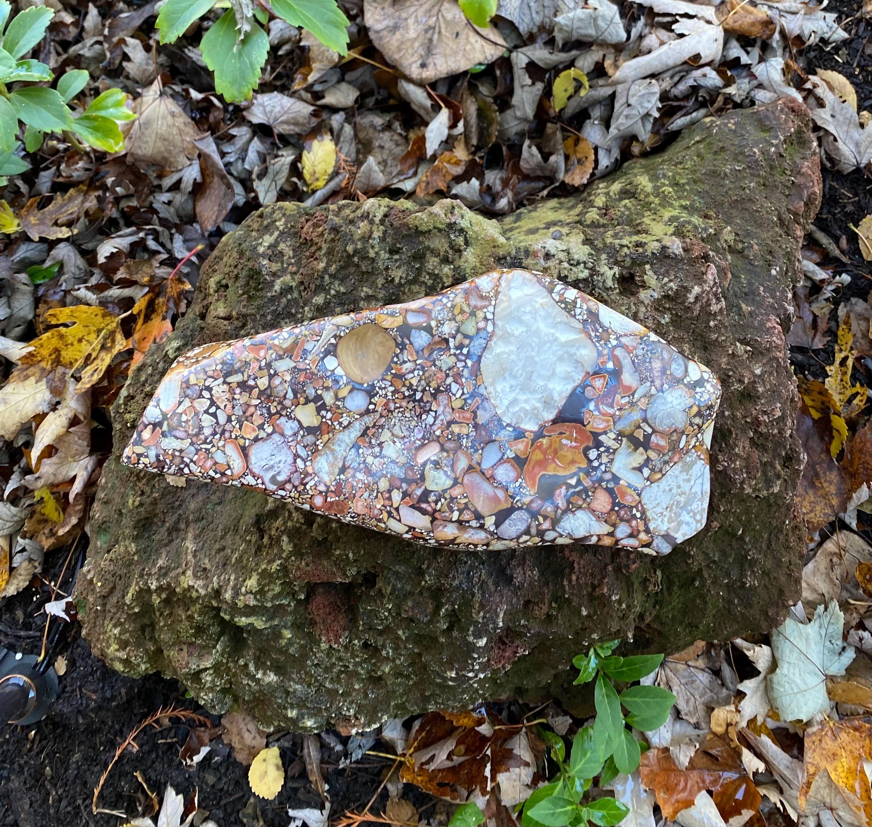 A conglomerate stone exhibiting differing materials in a lovely display of colors, PUDDING STONE generally containing jasper, chert, quartz, etc.