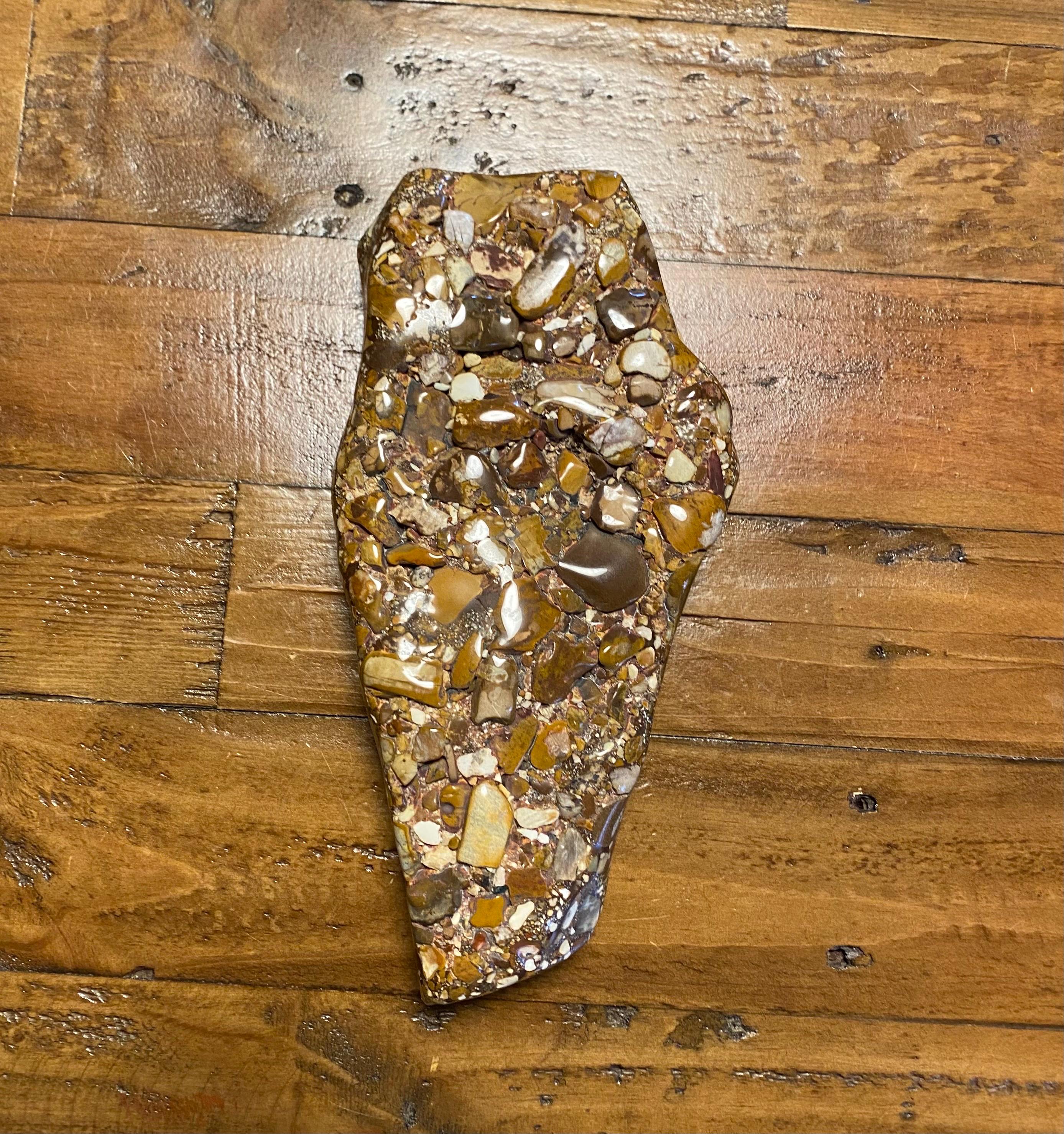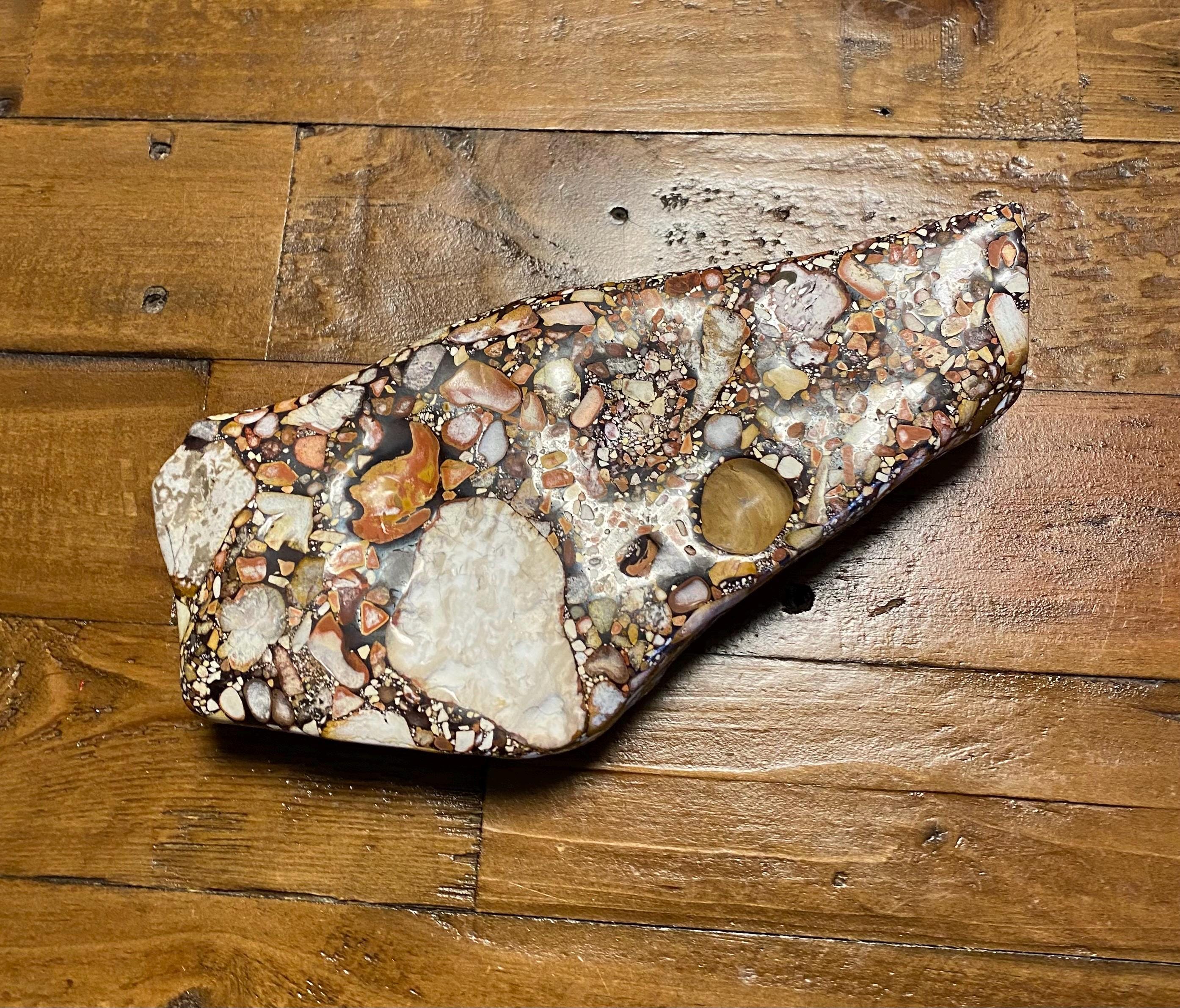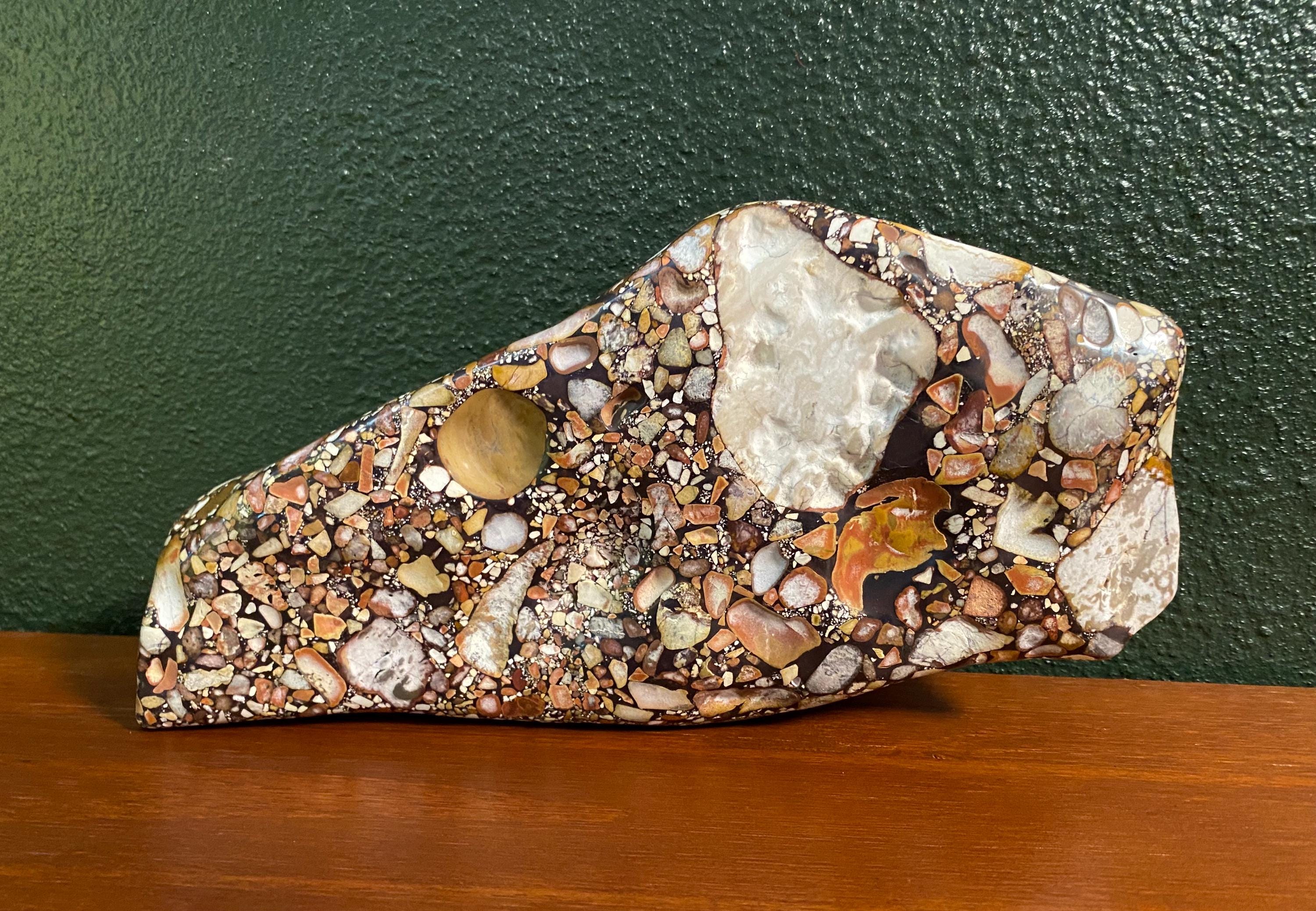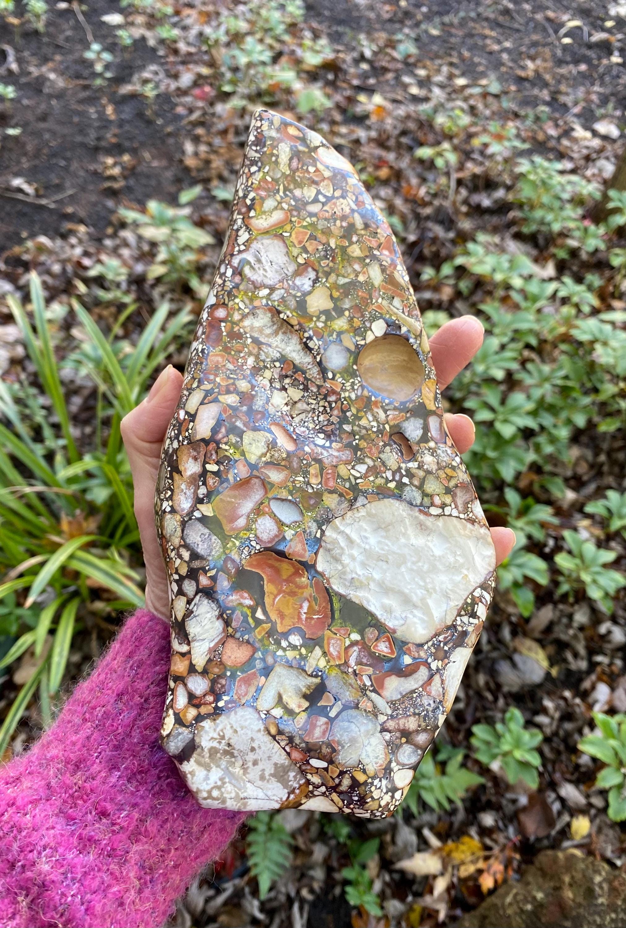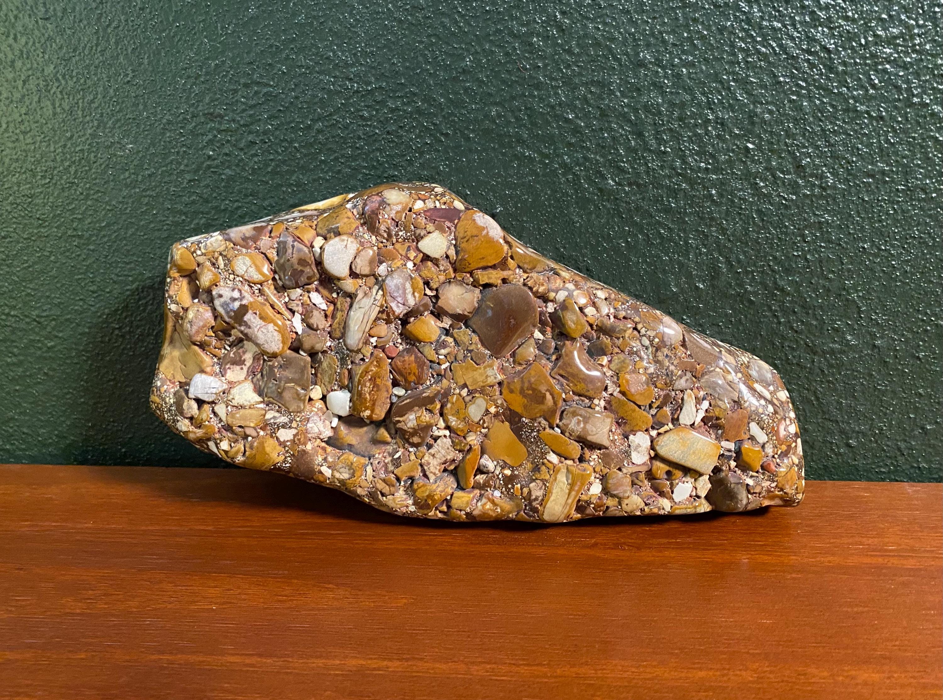 This is a lovely & polished XX-large freeform cabinet sized Pudding stone from Tennessee with gorgeous patterns, rich, deep color, and a large amount of stone texture.