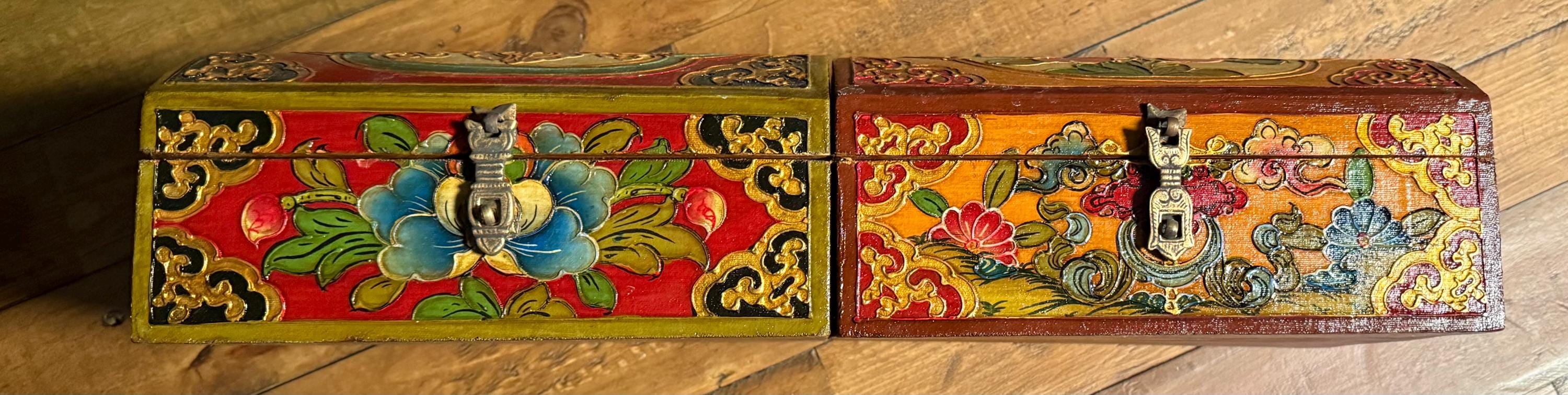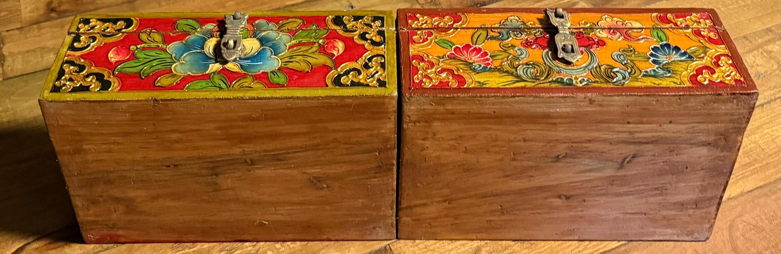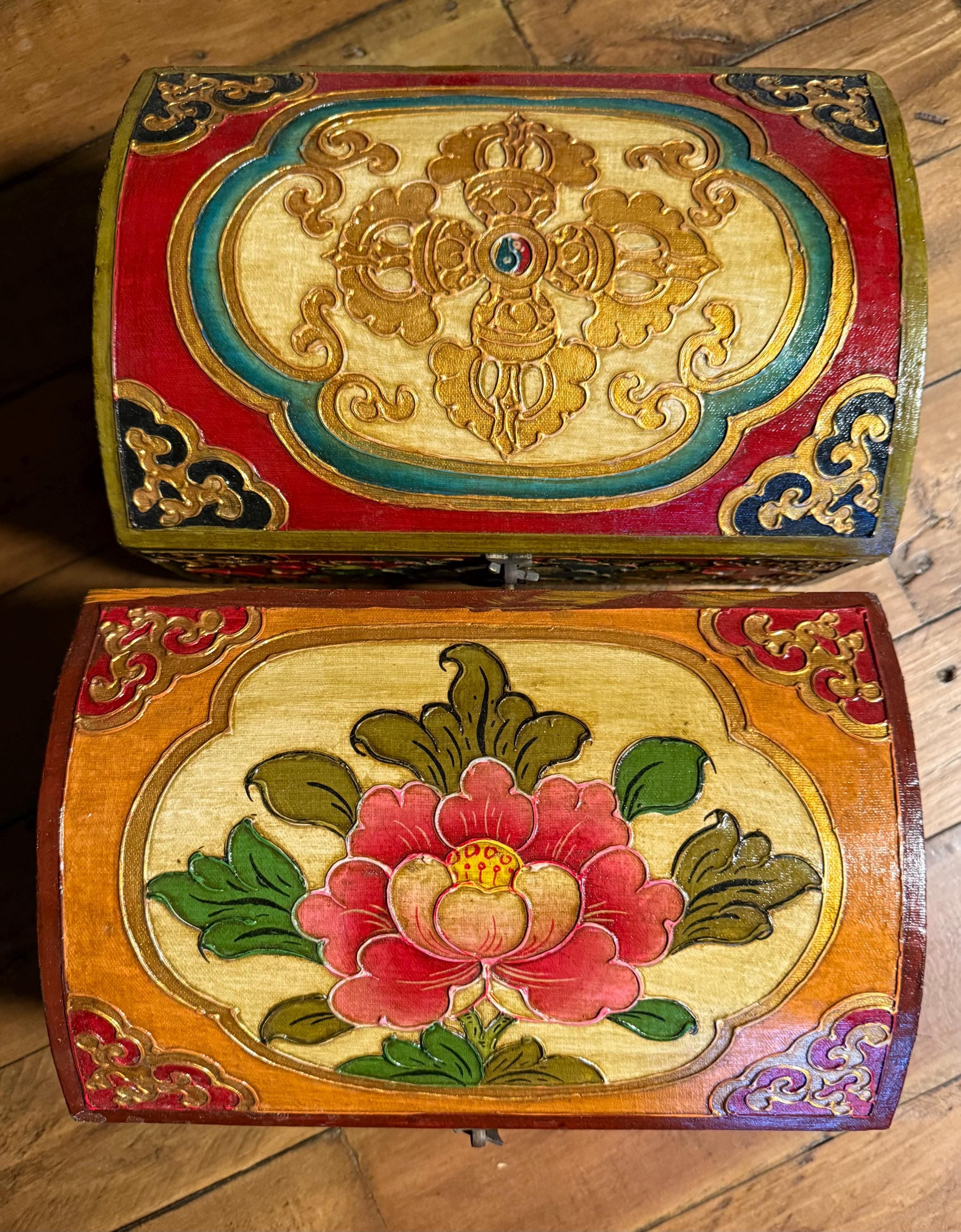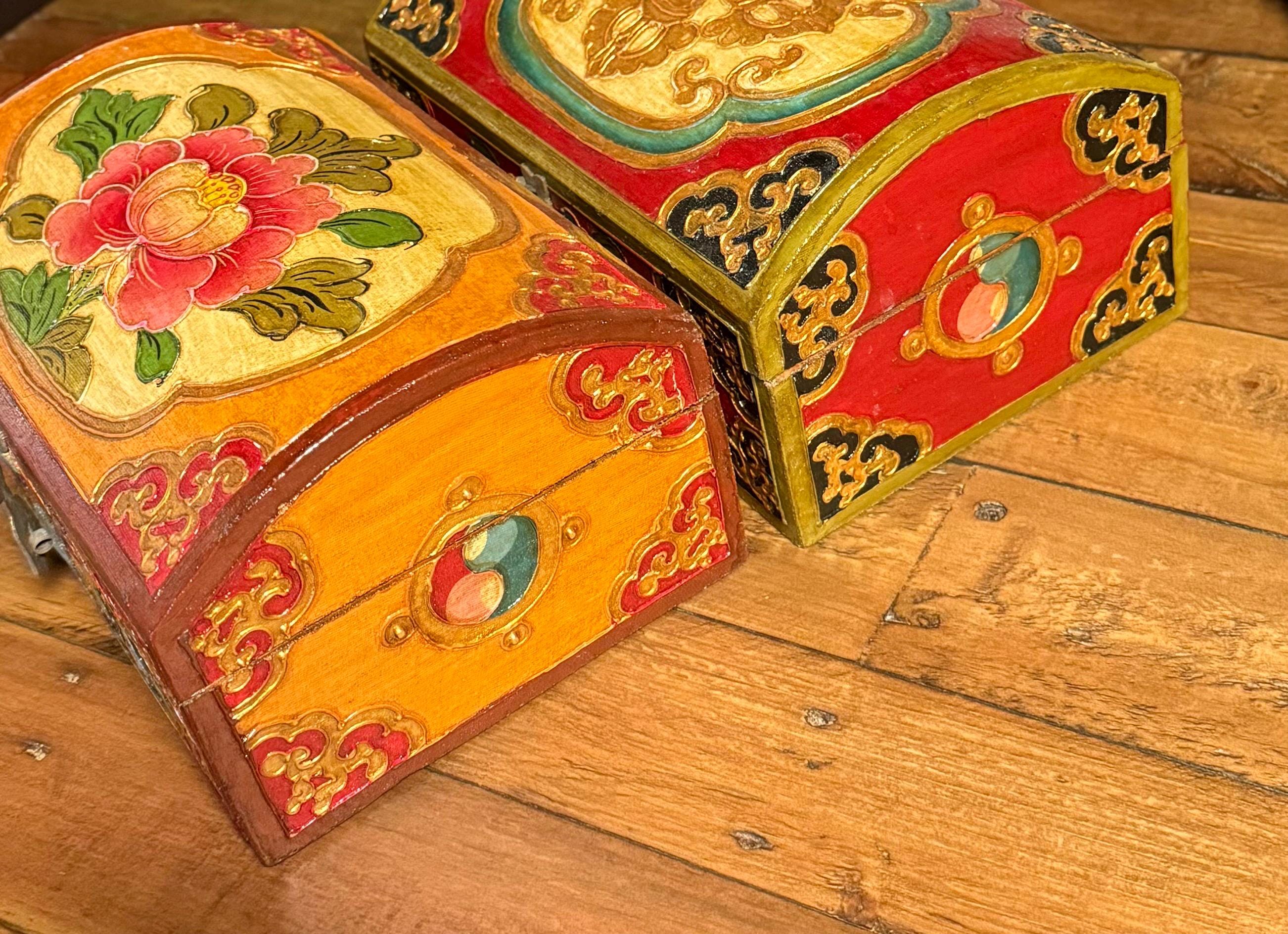 These are beautifully hand painted, rustic & unlined Tibetan Boxes in Indian Yellow (orange-yellow) color, or Red, which can store various things.