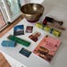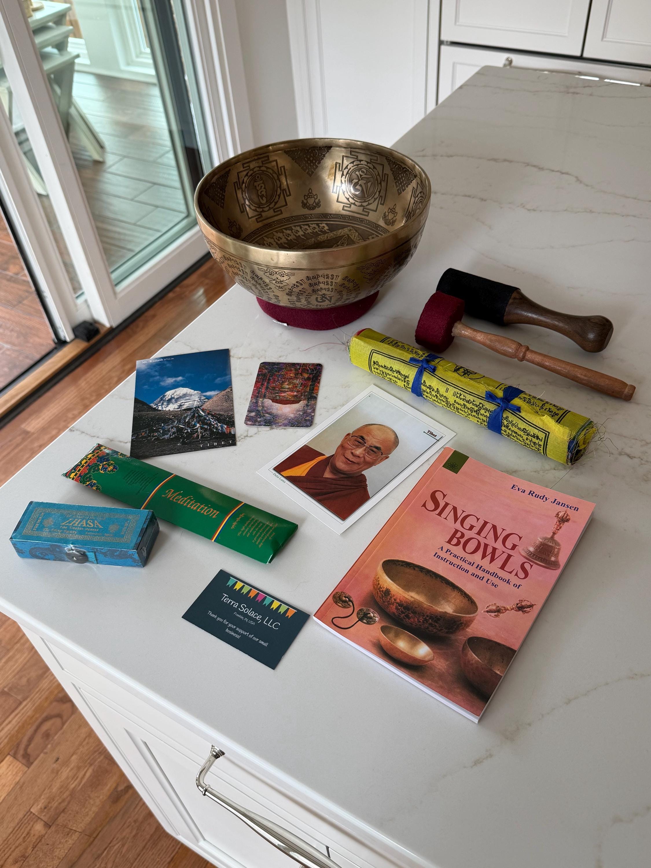 We have added 2 mallets, a dark red fabric-covered ring cushion, and a singing bowl booklet (may or may not be the one shown).