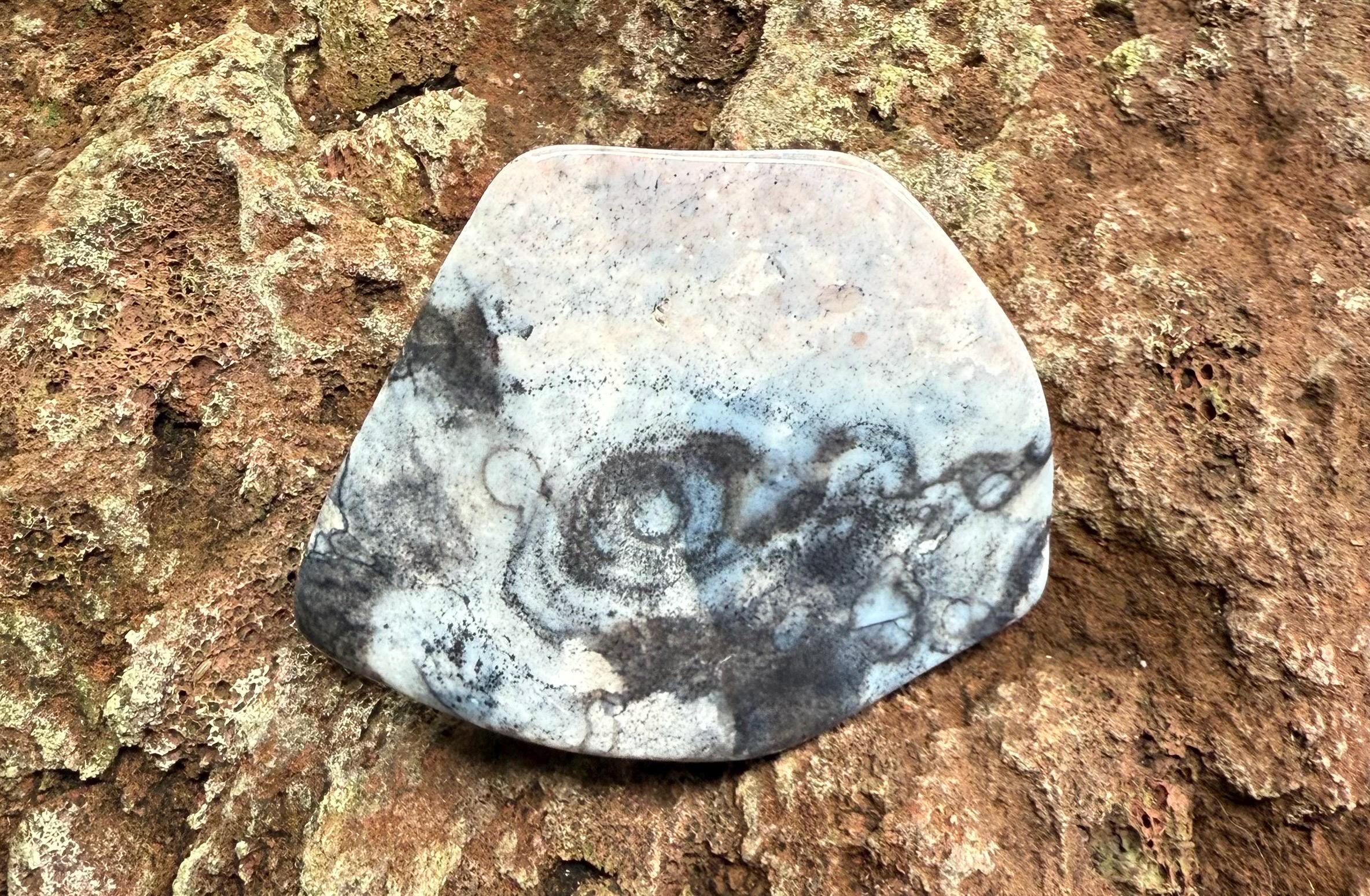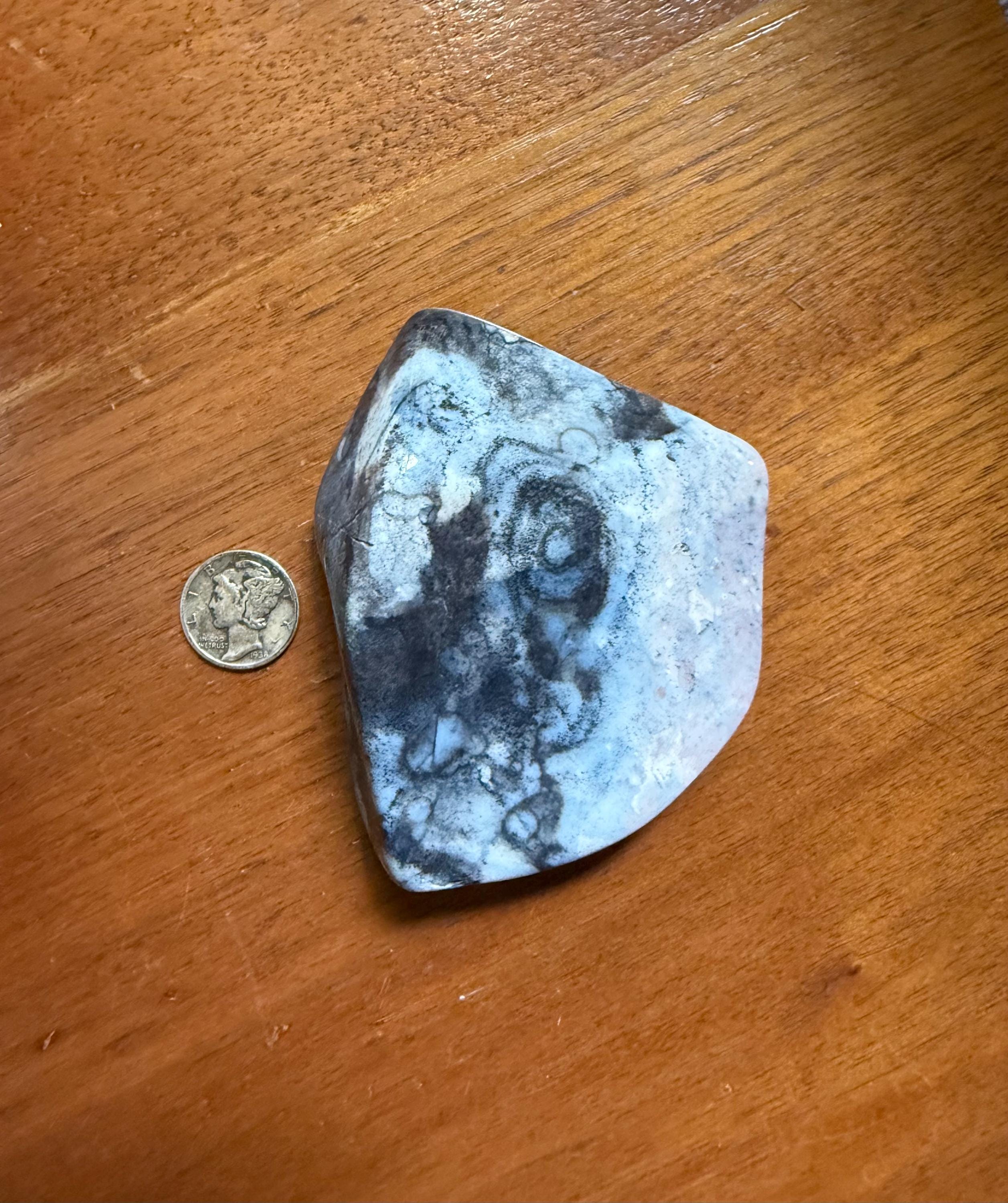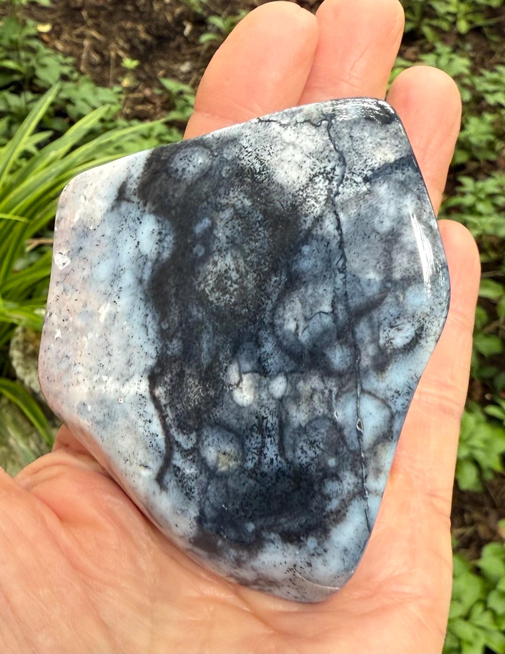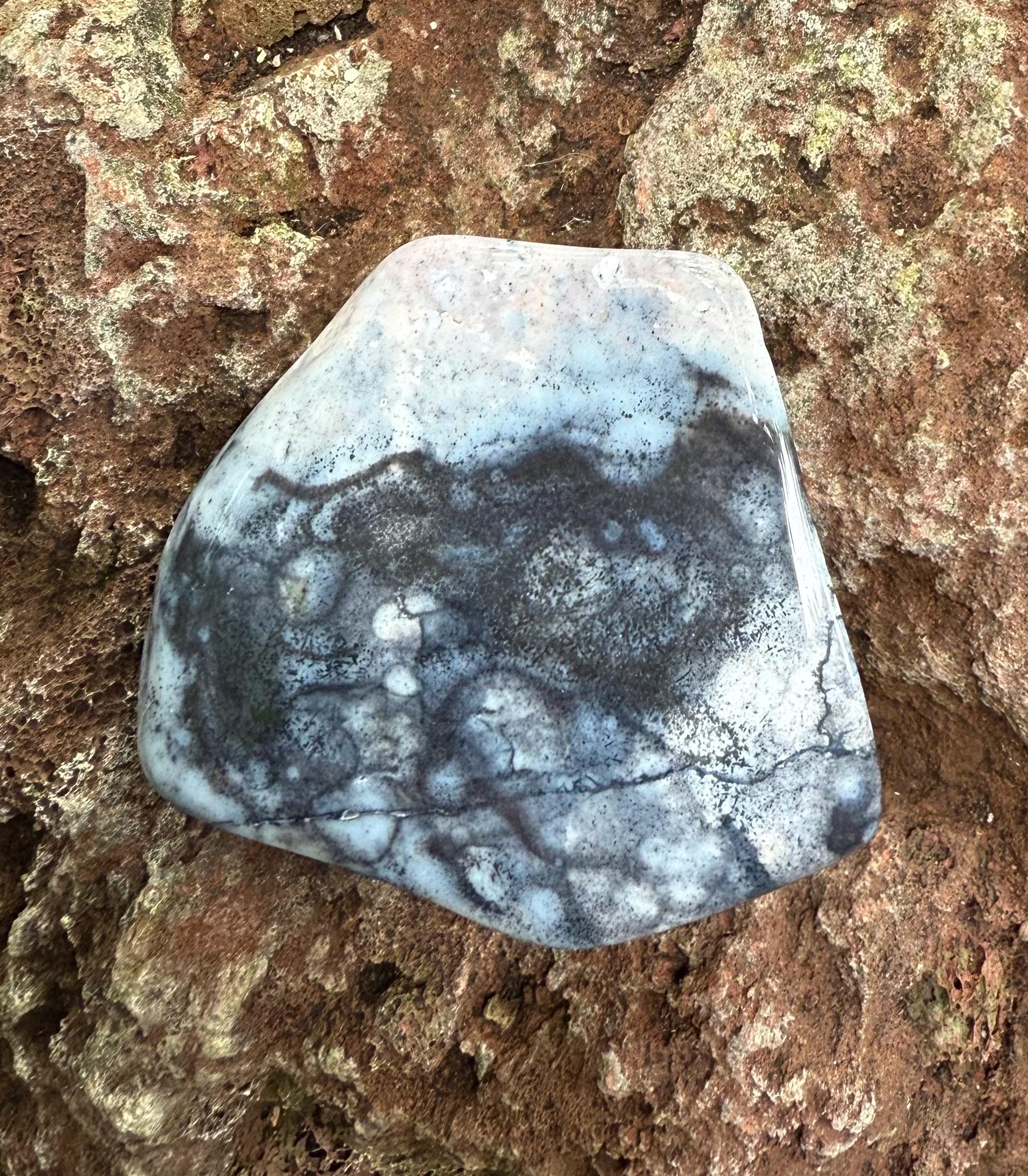 This is a lovely, freeform & smoothly polished Black Dendritic Agate from Mexico that has orbs and stands up on one side with included dendrites of black Manganese and some blue color on a cream colored background.