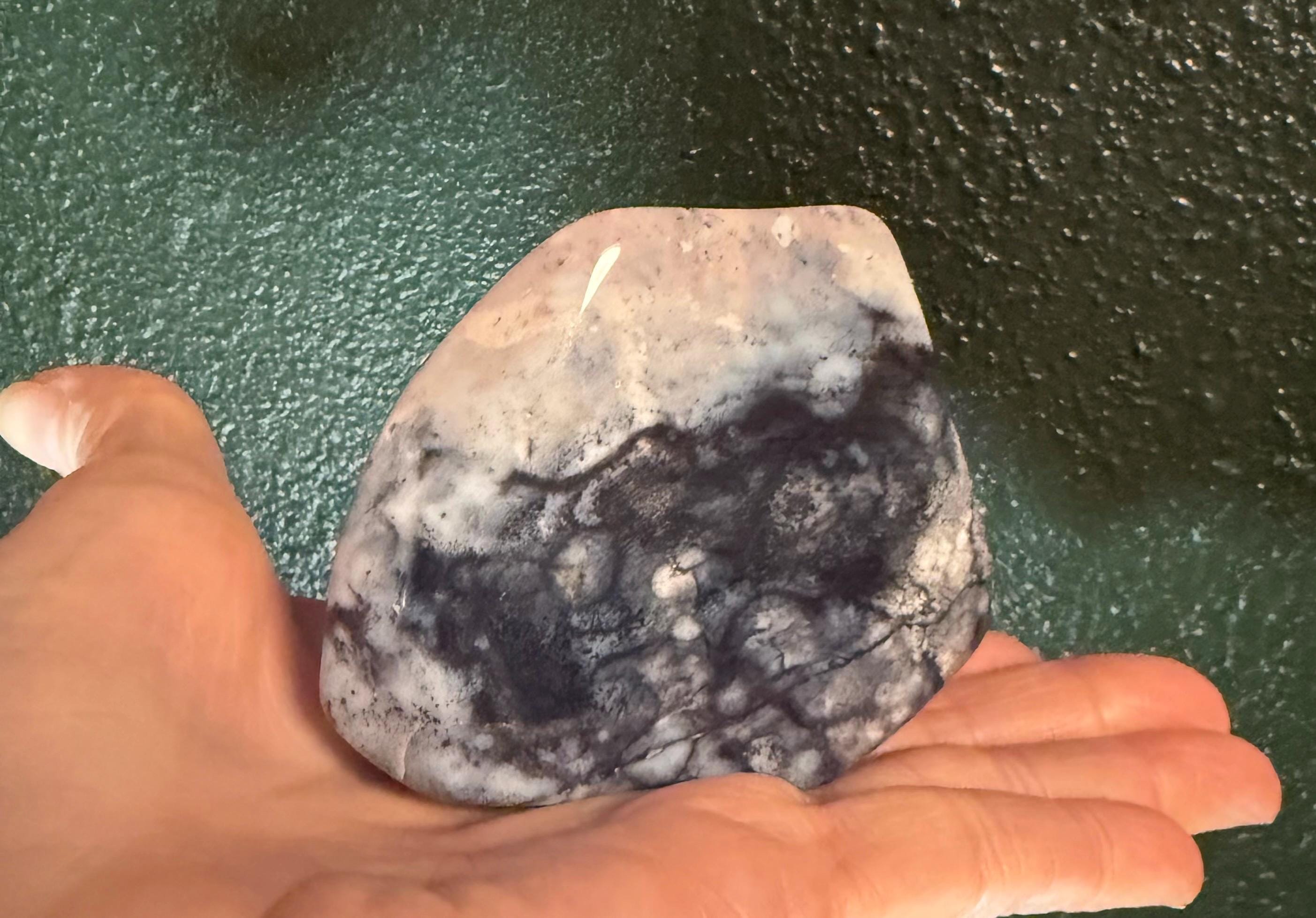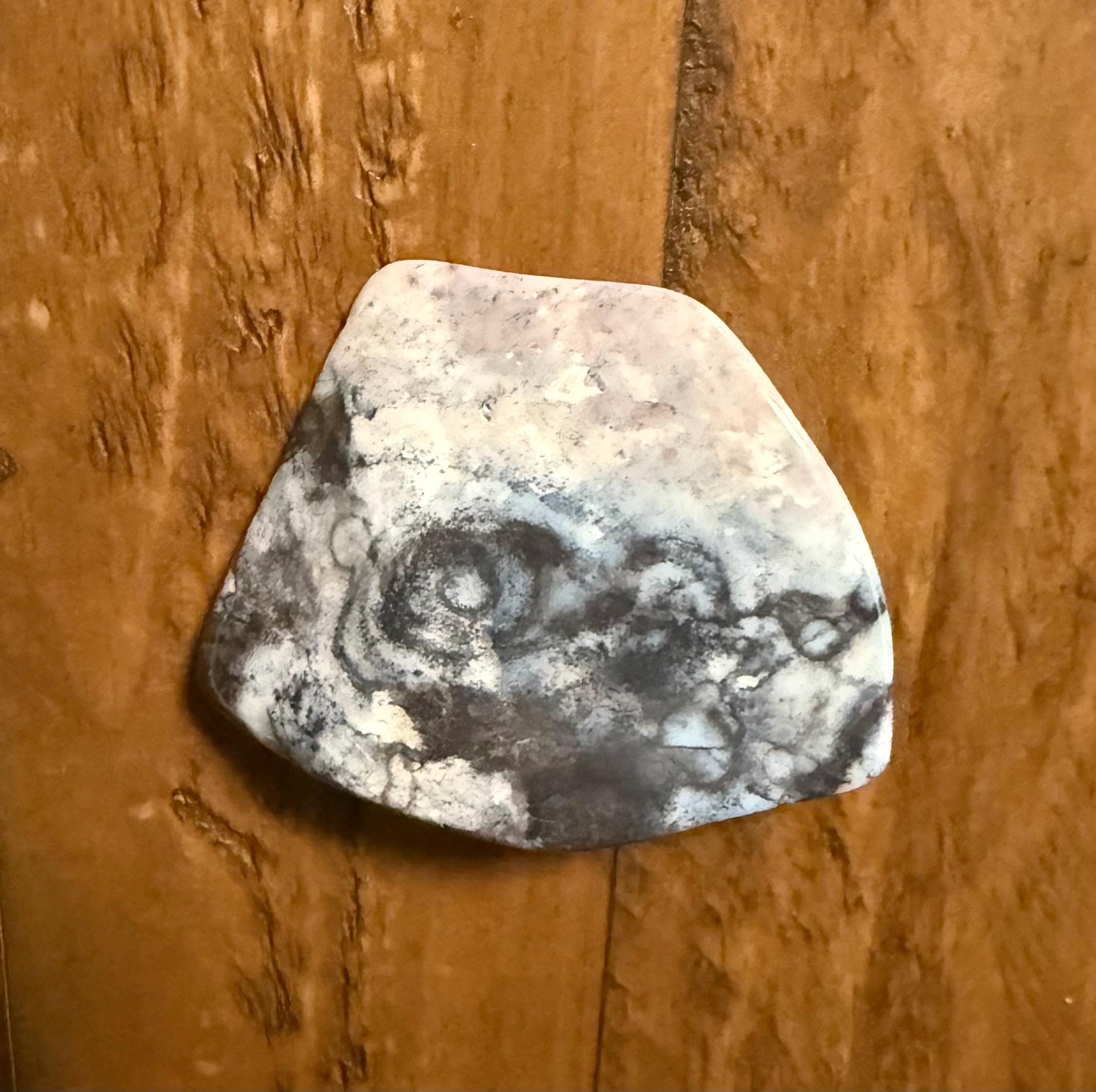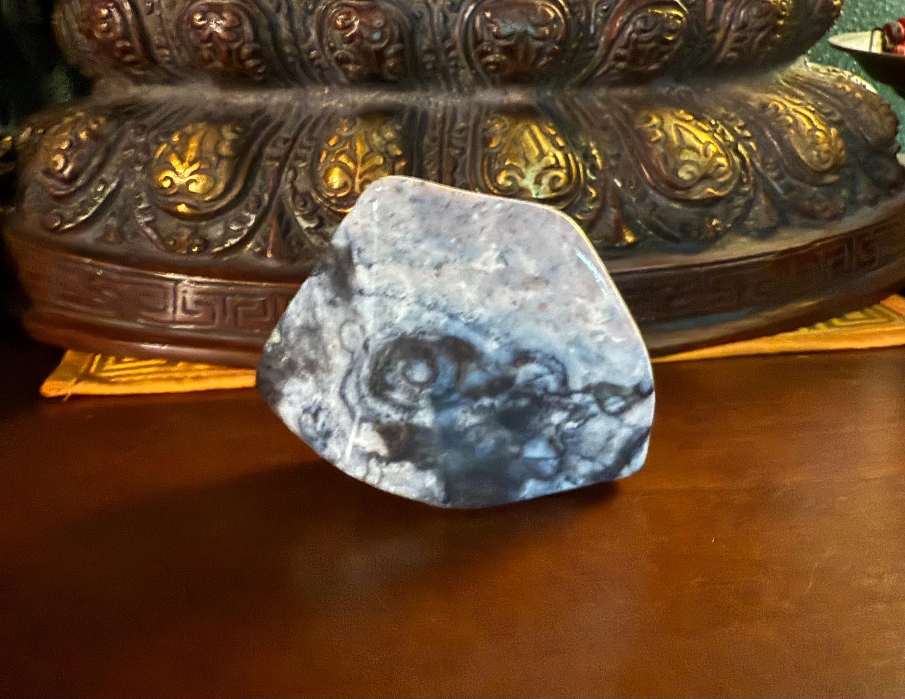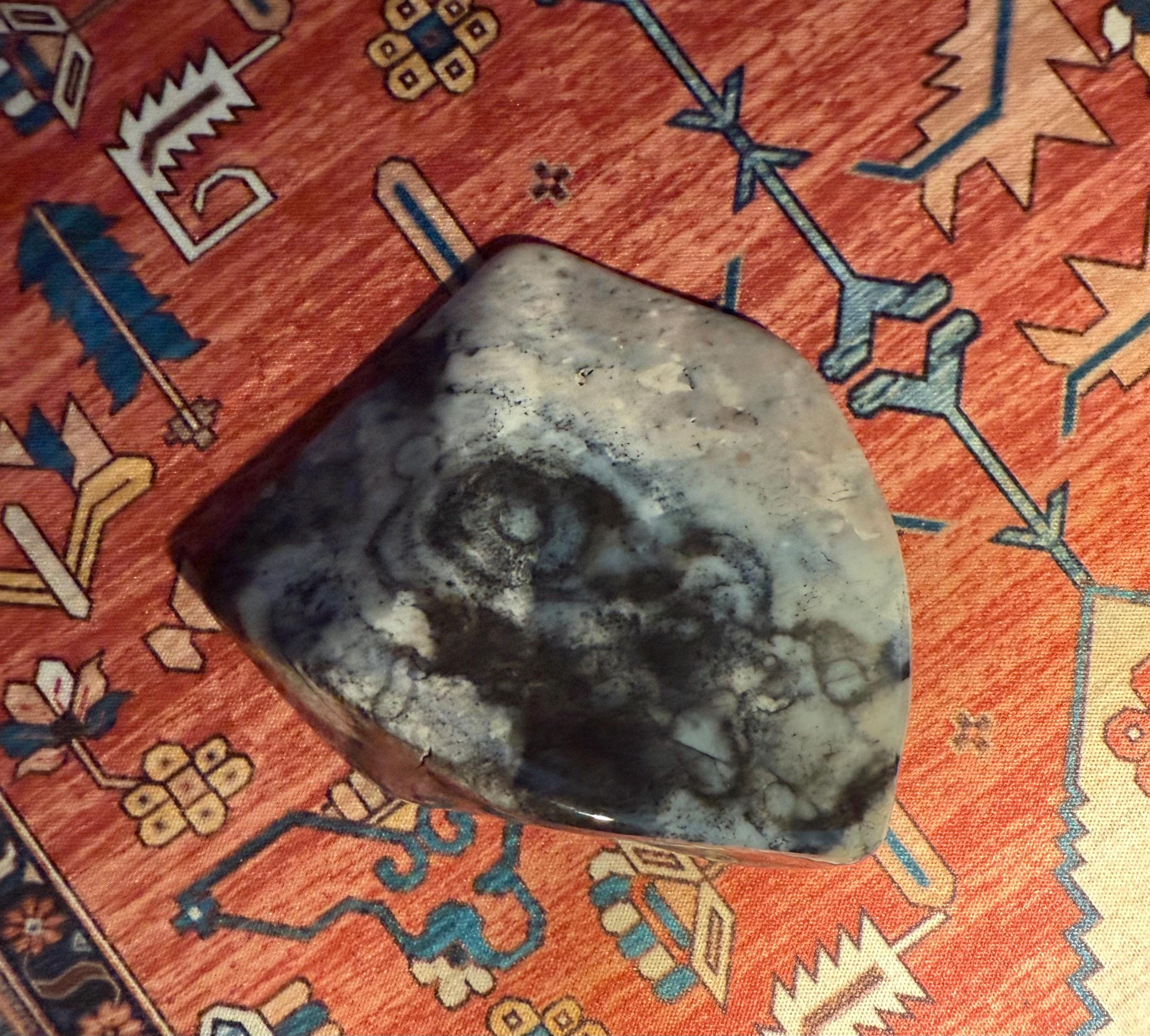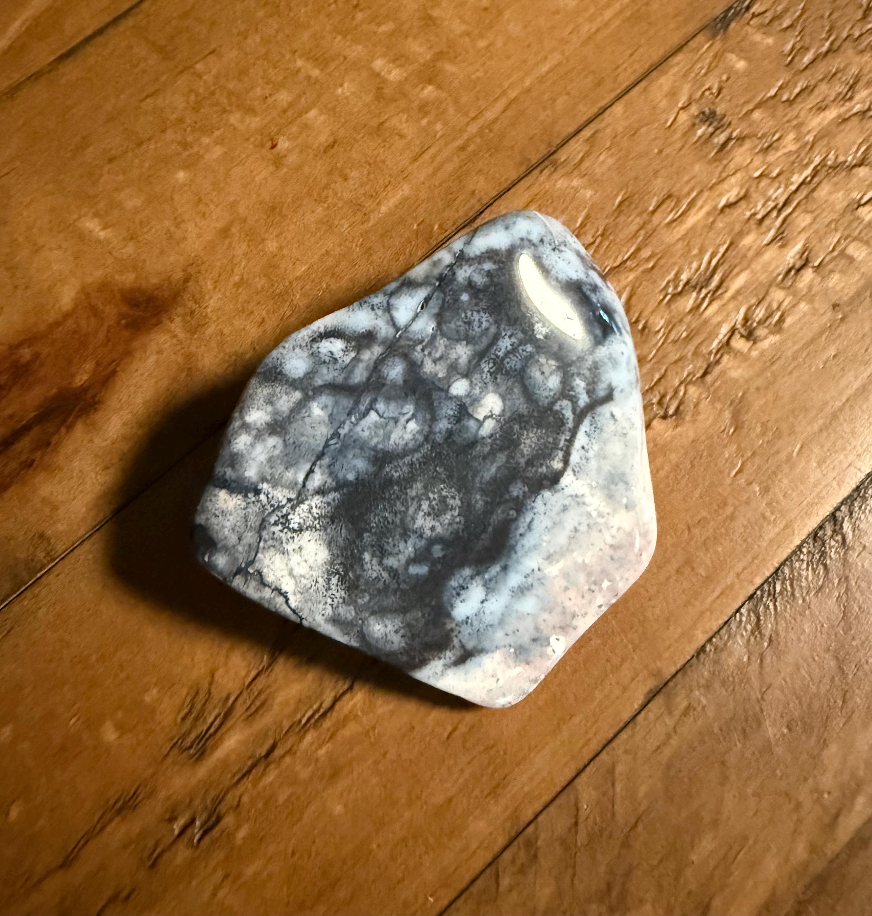 This is a lovely, freeform & smoothly polished Black Dendritic Agate from Mexico that has orbs and stands up on one side with included dendrites of black Manganese and some blue color on a cream colored background.