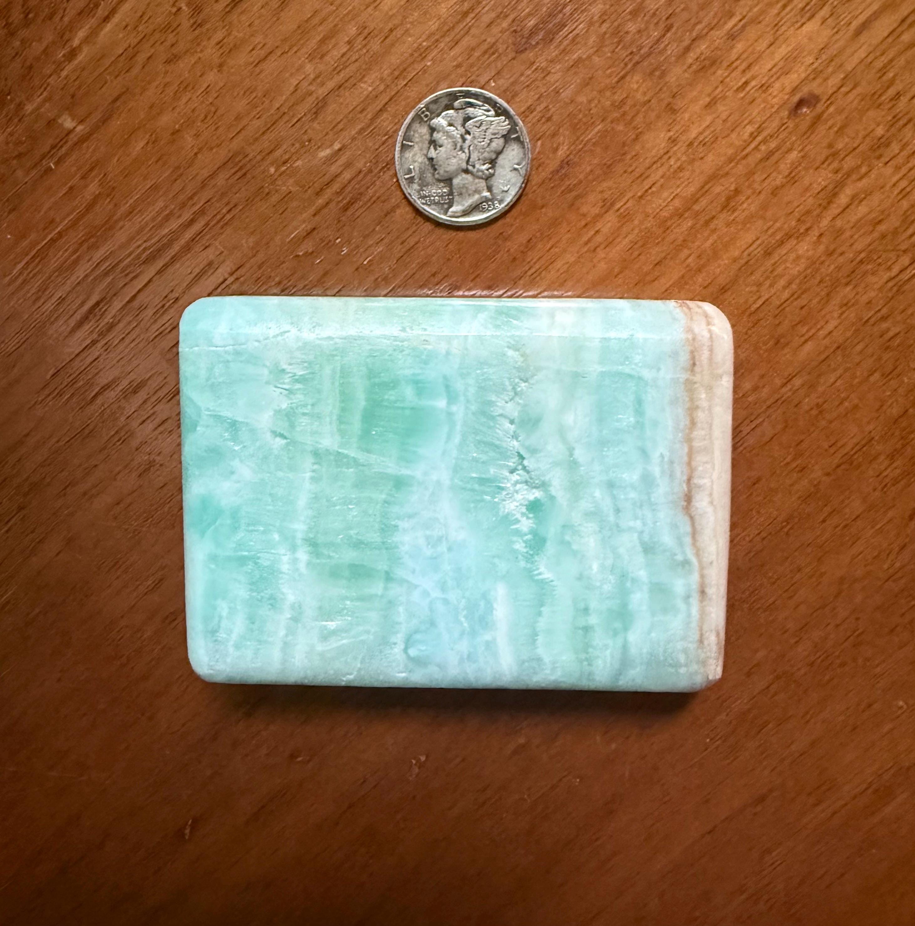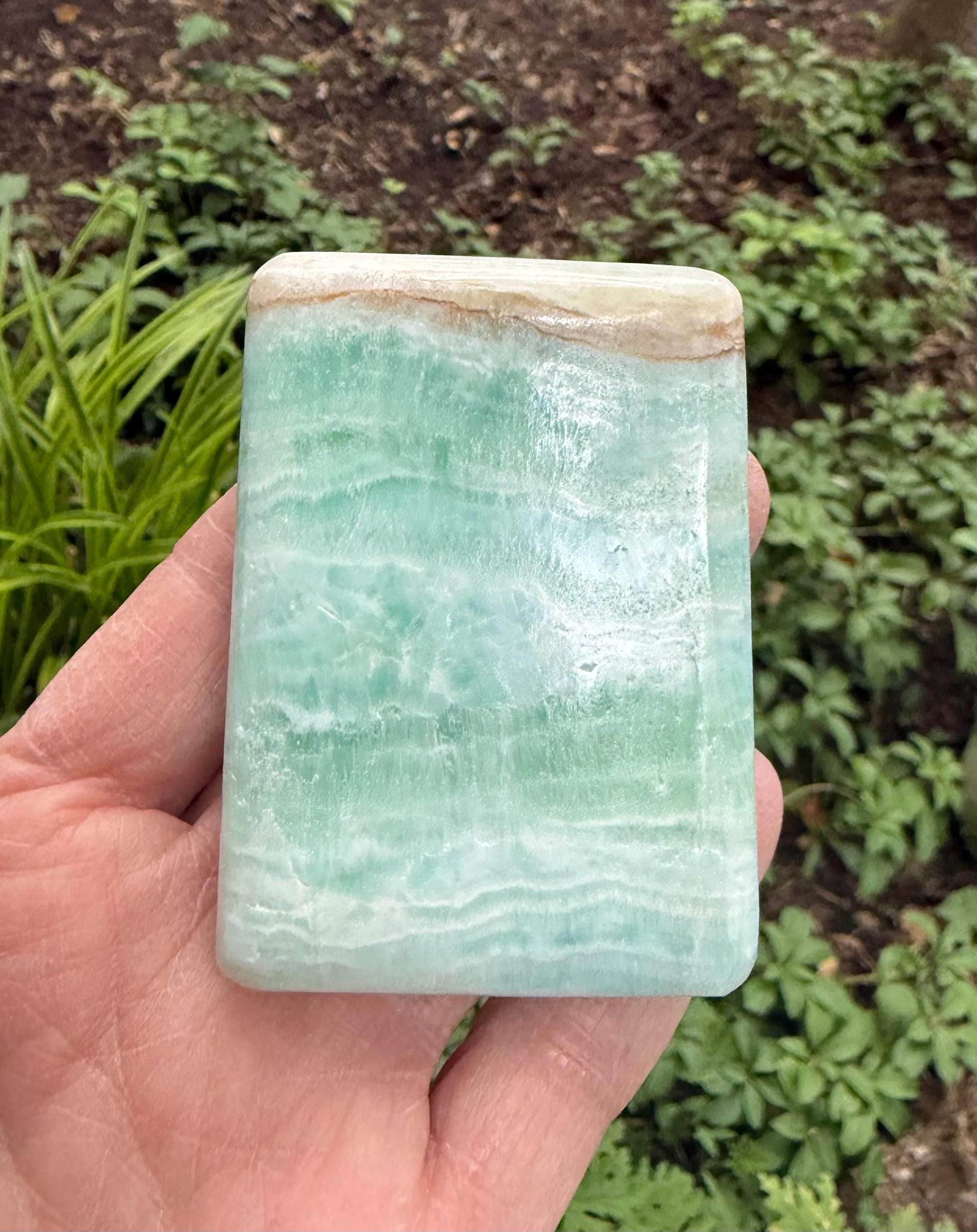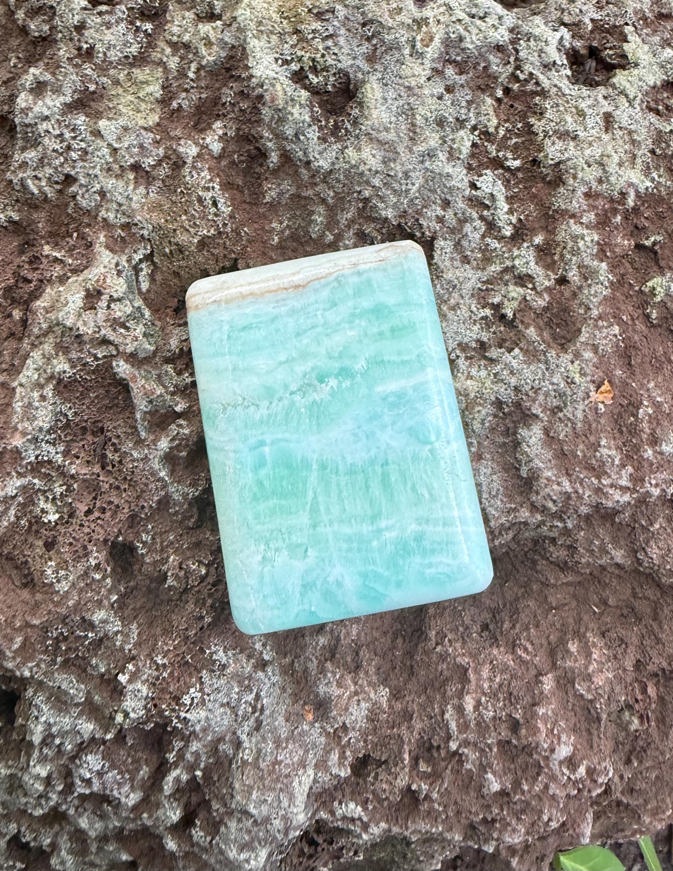 A gorgeous, large and polished rectangular stone of Caribbean Blue Calcite with Brown Aragonite.