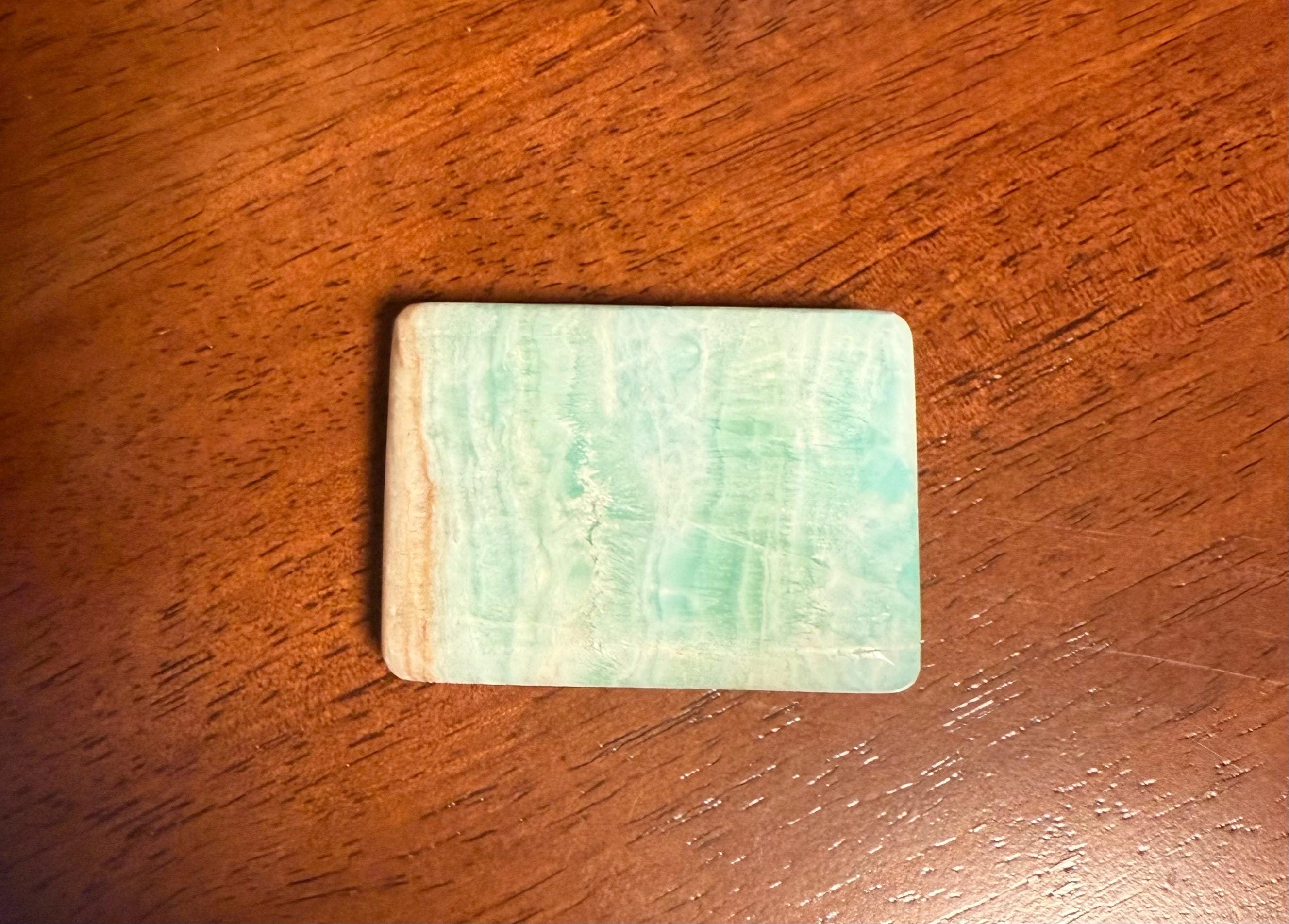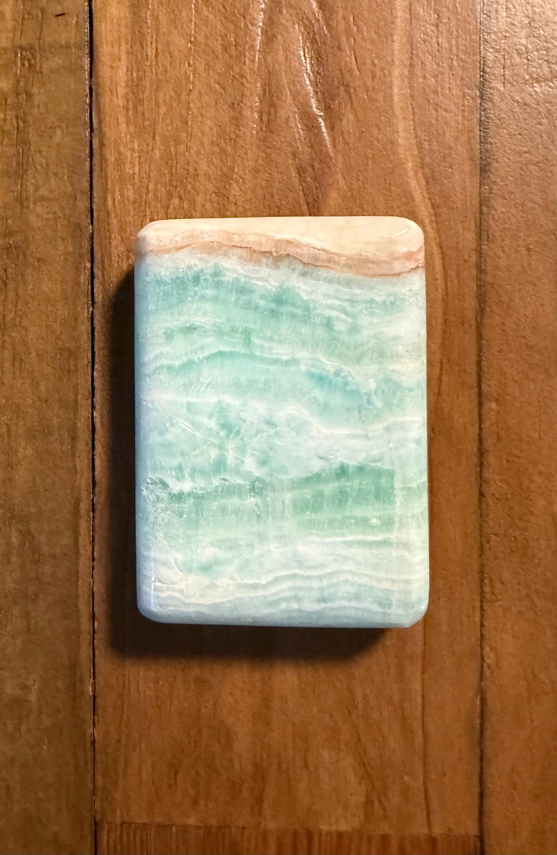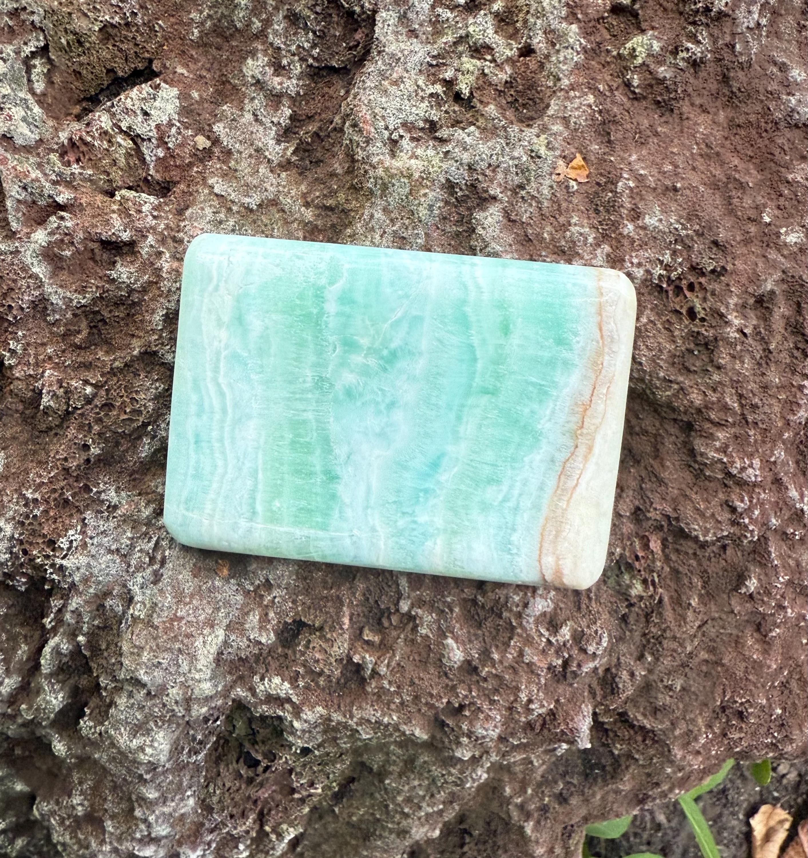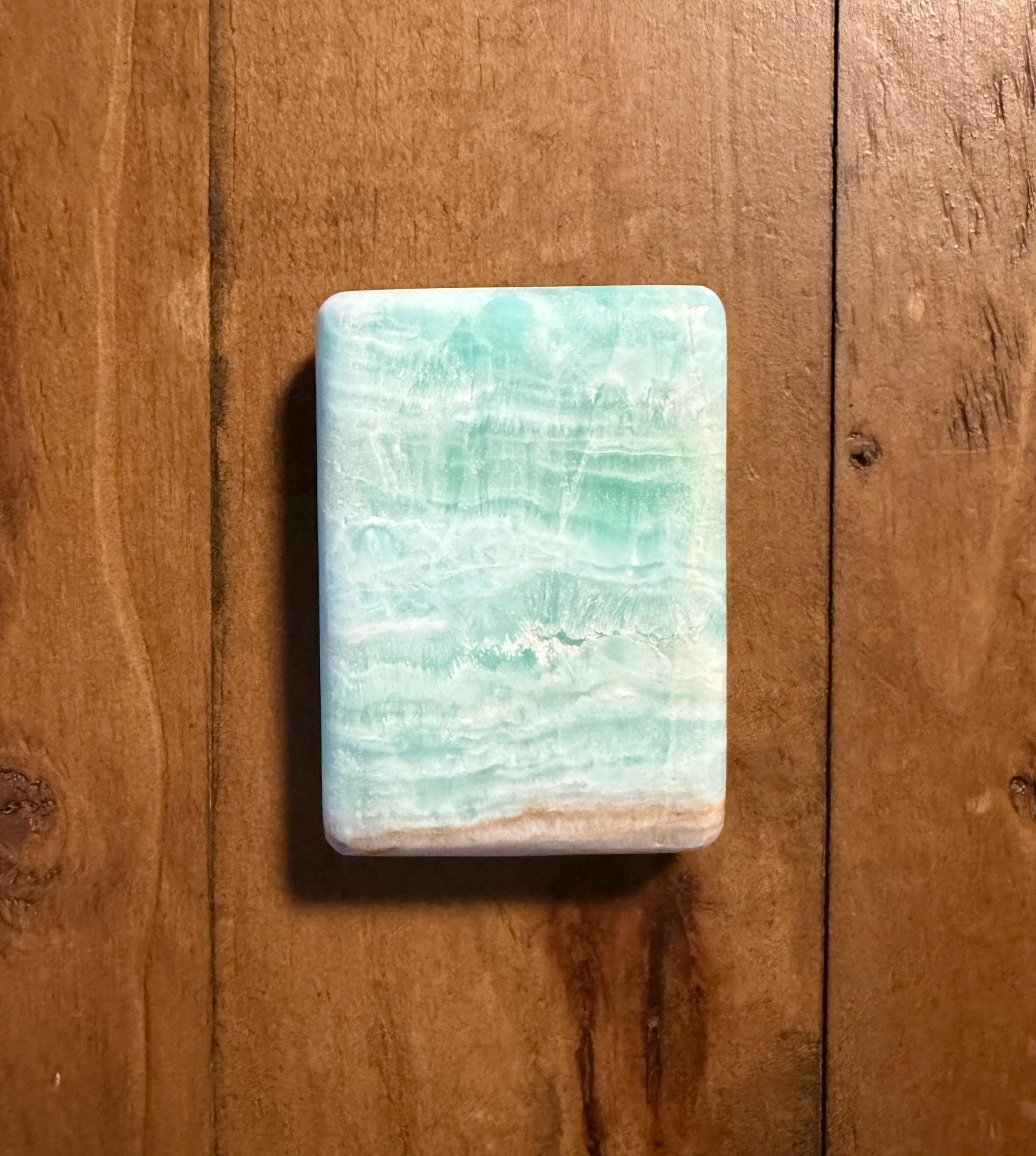 A gorgeous, large and polished rectangular stone of Caribbean Blue Calcite with Brown Aragonite.