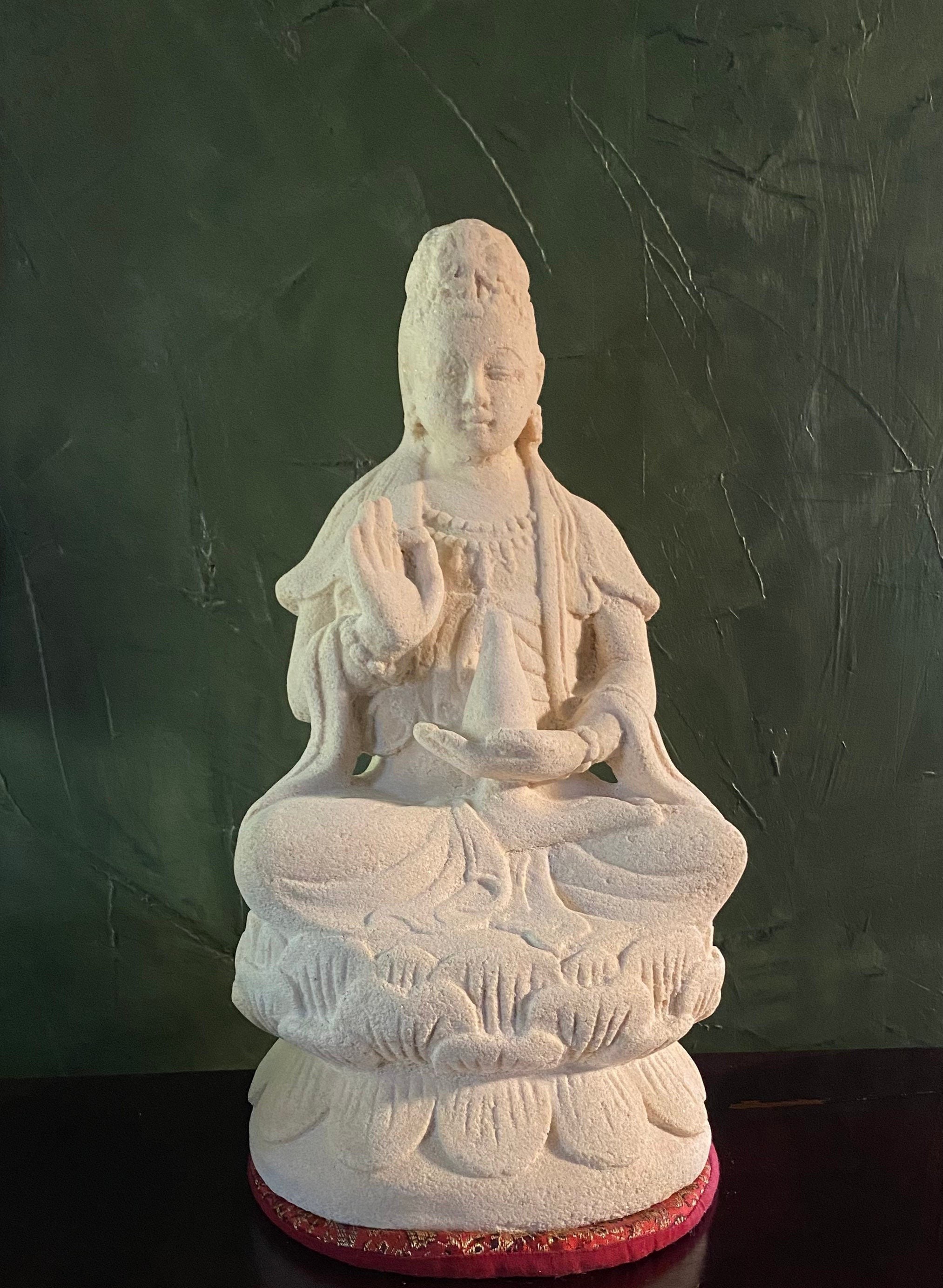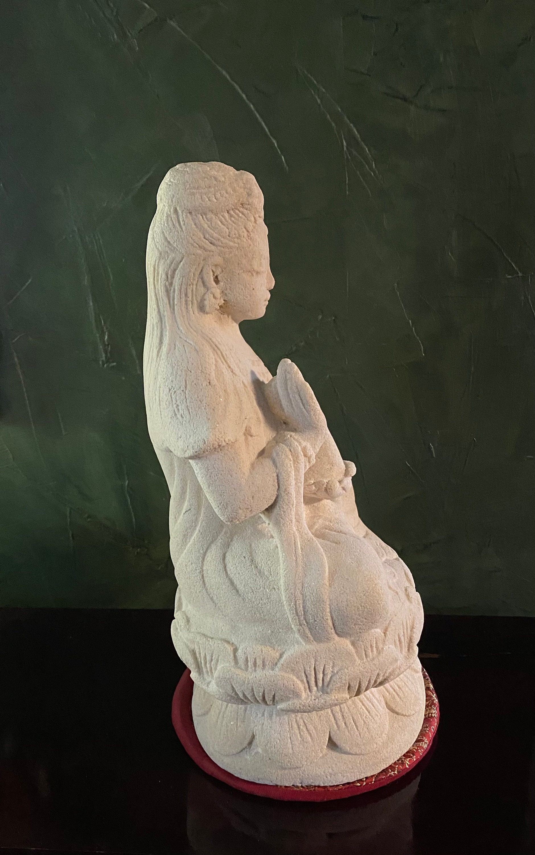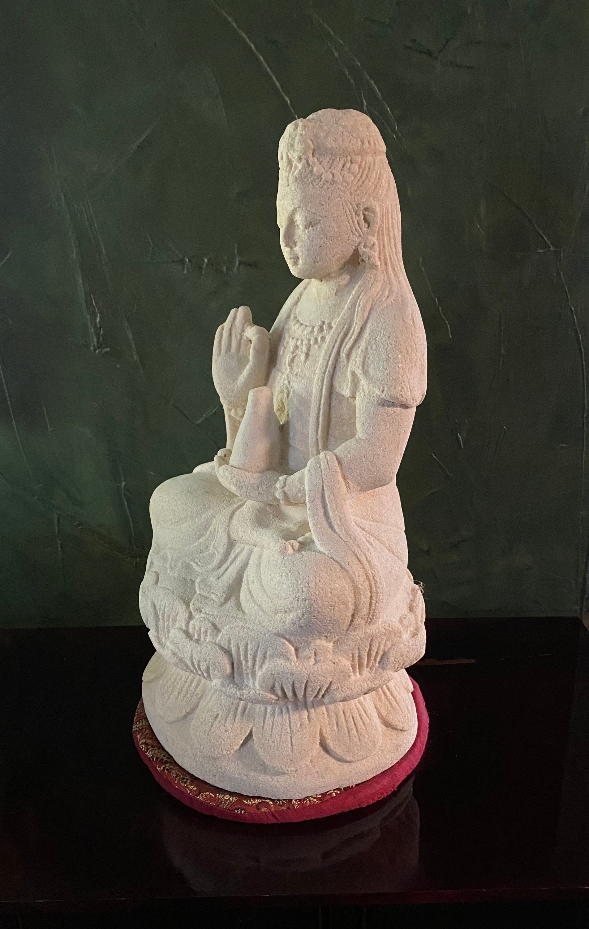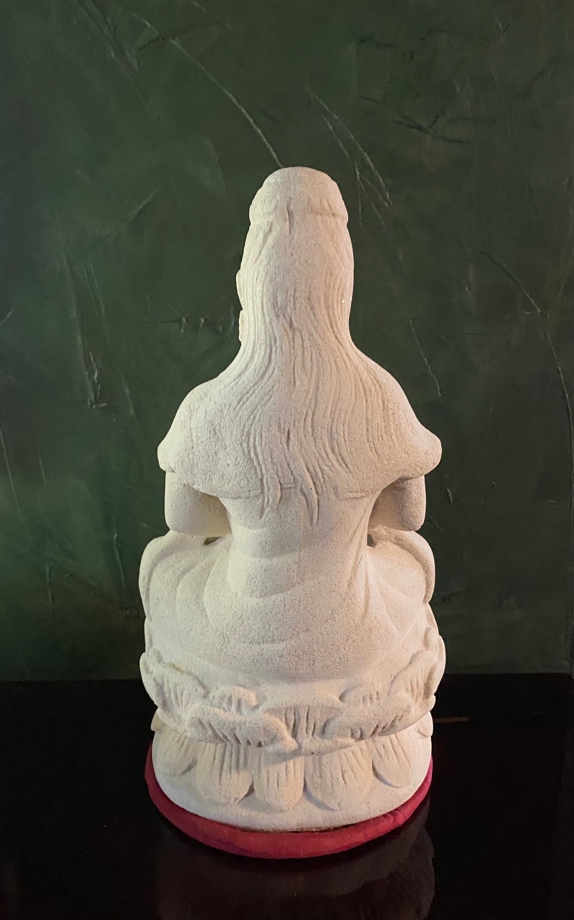 This is Quan Yin, Guanyin solid stone statue molded from Indonesian white volcanic stone and hand finished.