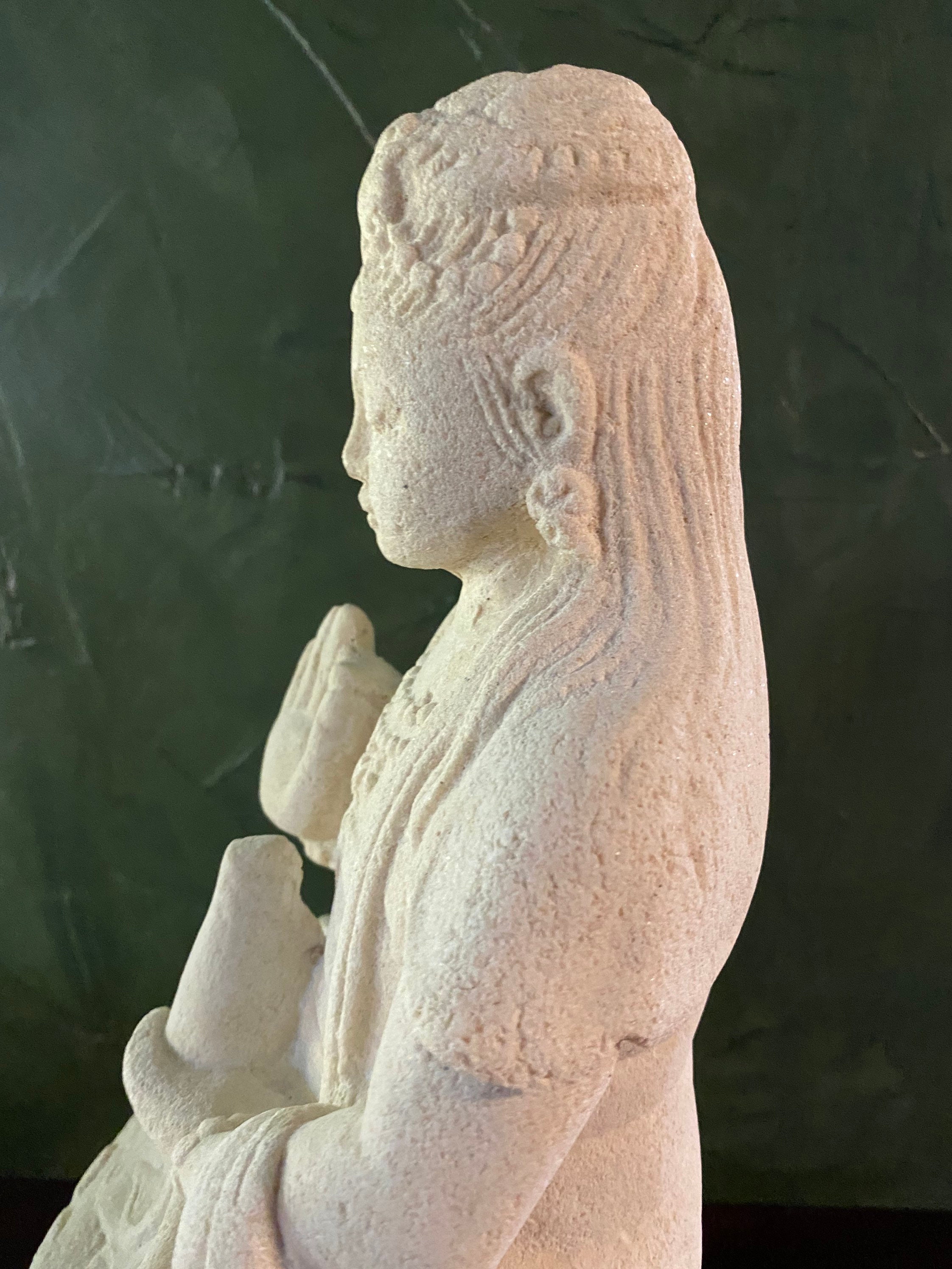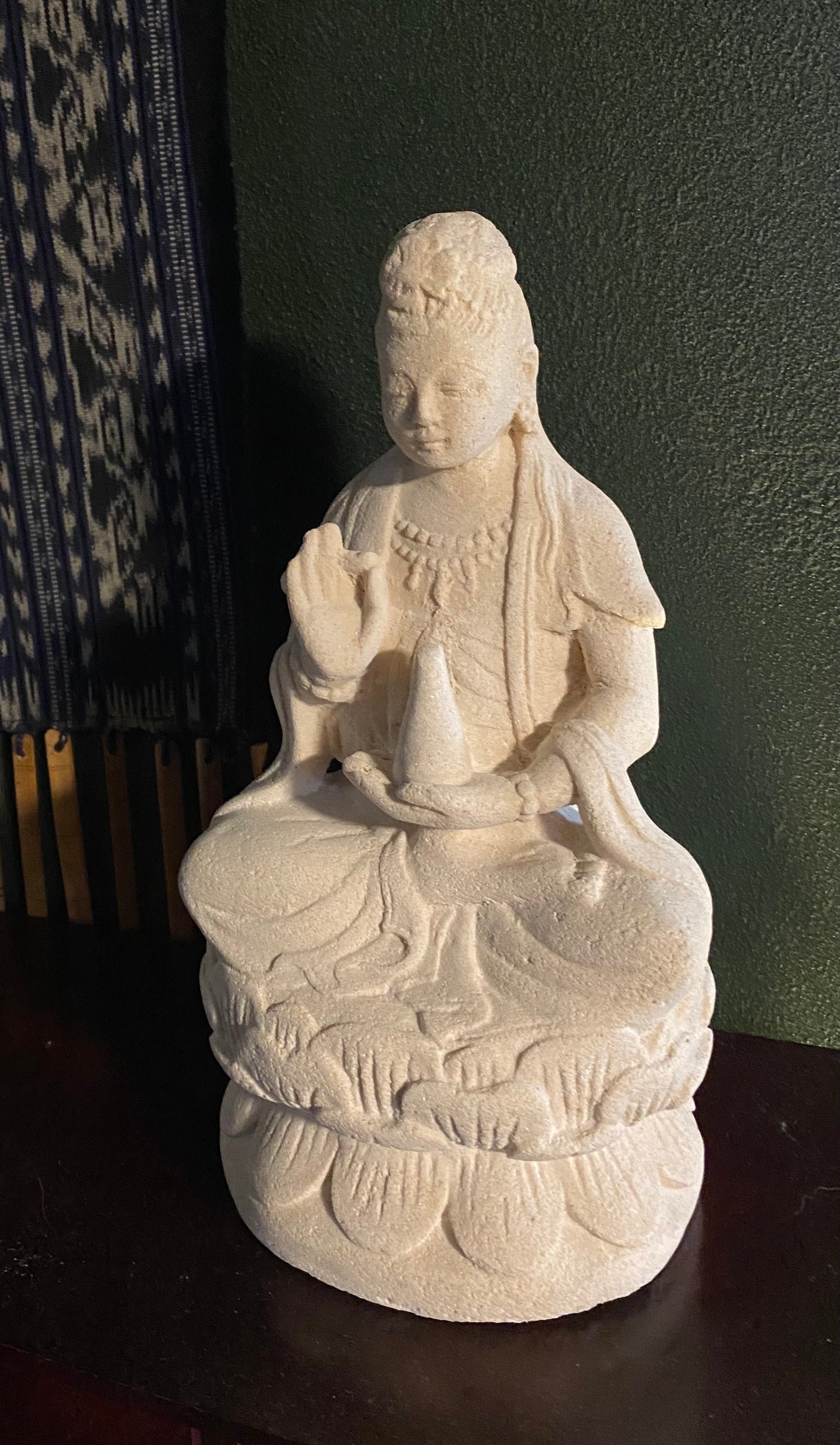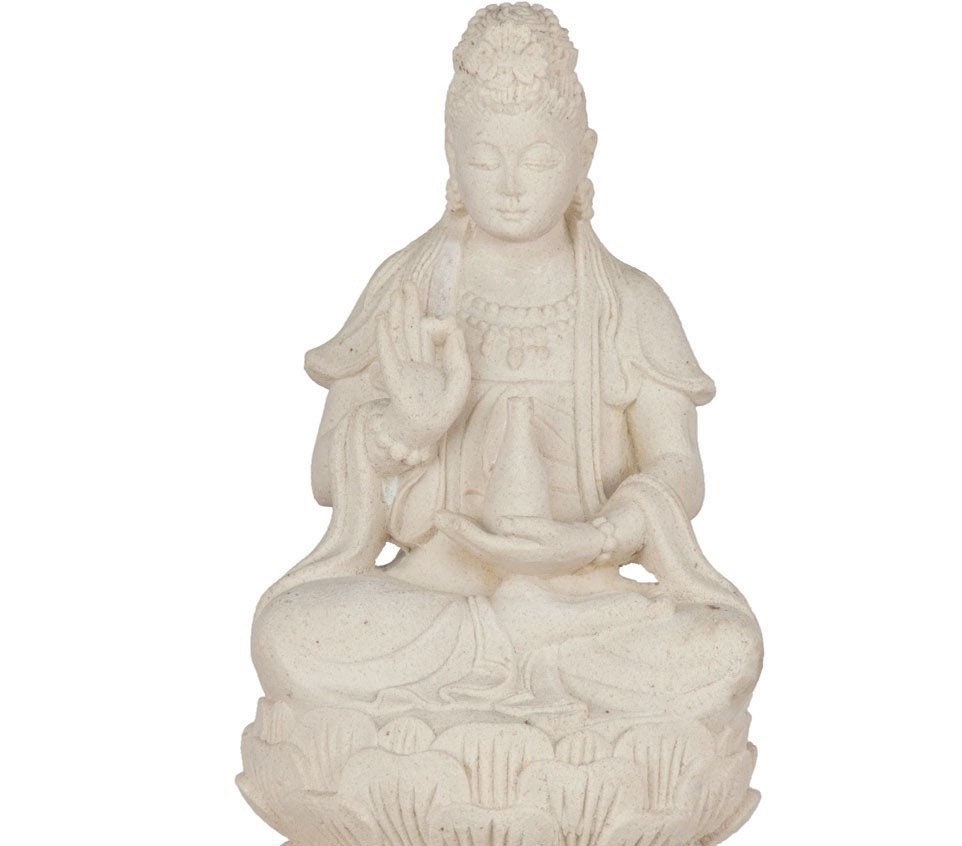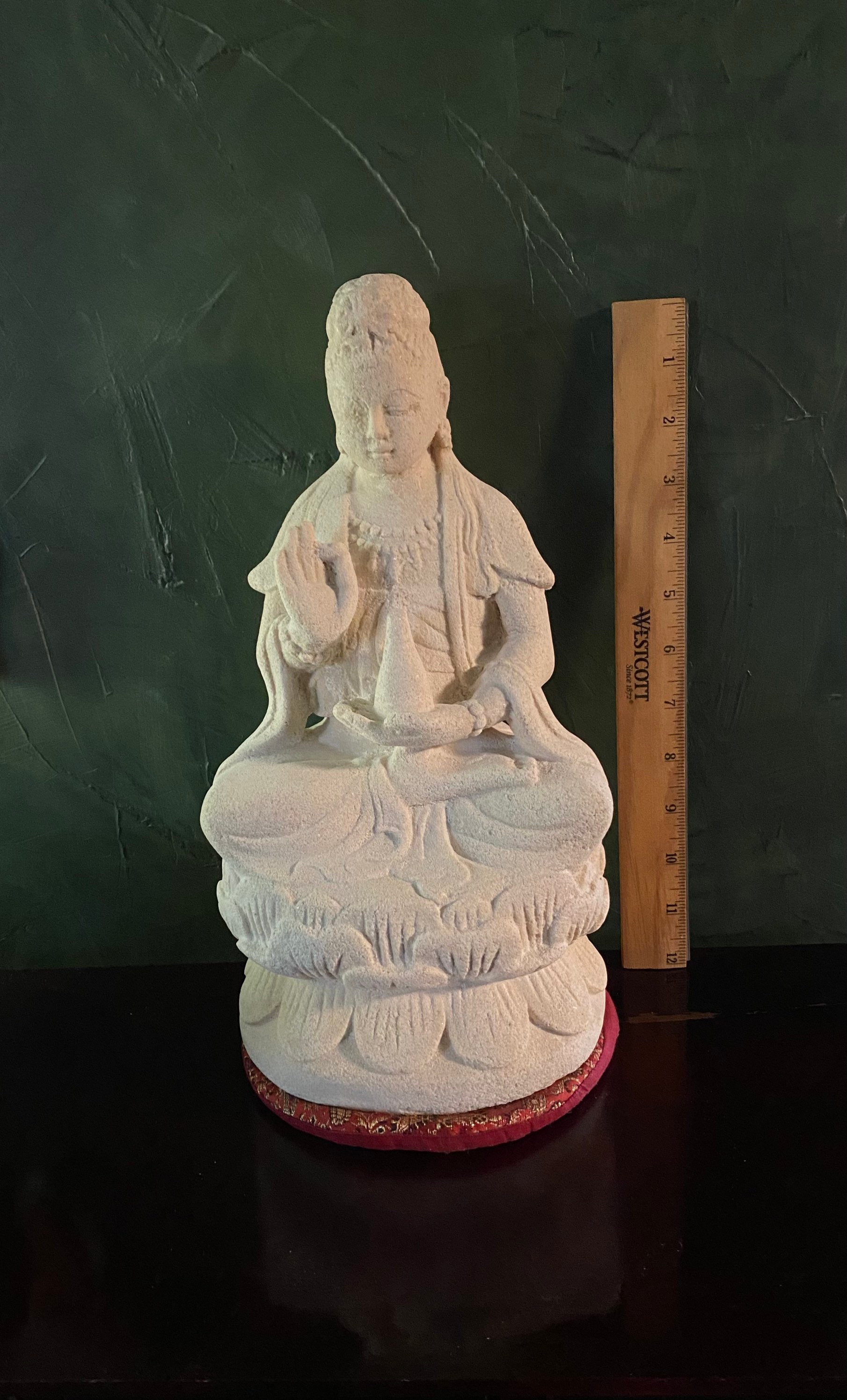 This is Quan Yin, Guanyin solid stone statue molded from Indonesian white volcanic stone and hand finished.