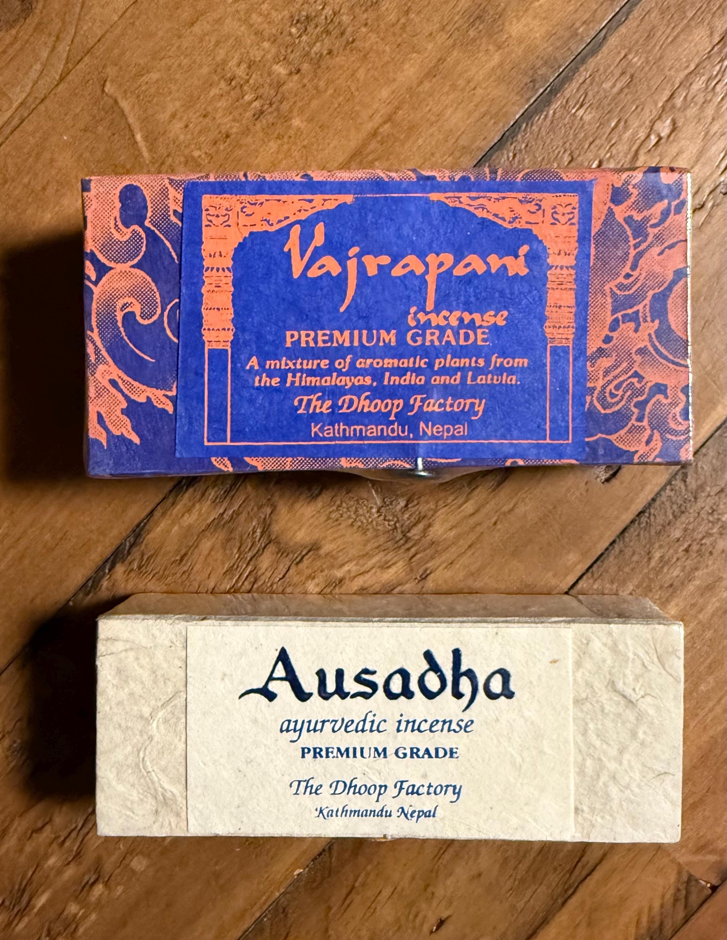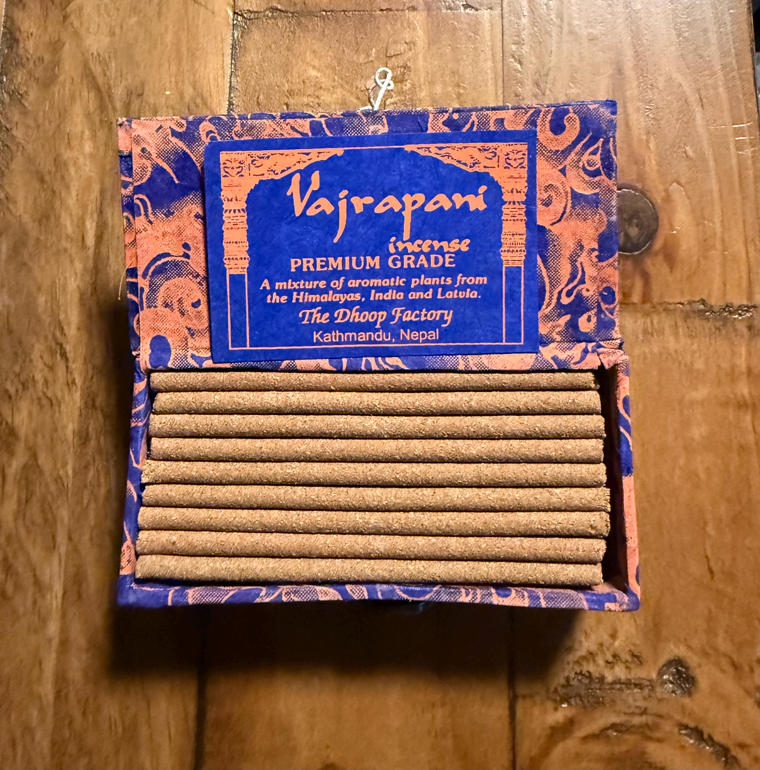 5. VAJRAPANI (vaj-ra-pani) - contains juniper and other plants from the Himalayan mountains in Nepal, spices such as cloves from India, and spruce and pine extracts and powdered amber from Latvia and Australian eucalyptus oil. It has a powerful fresh forest aroma. It is great for freshening home, office or temple. It is our strongest-smelling incense.