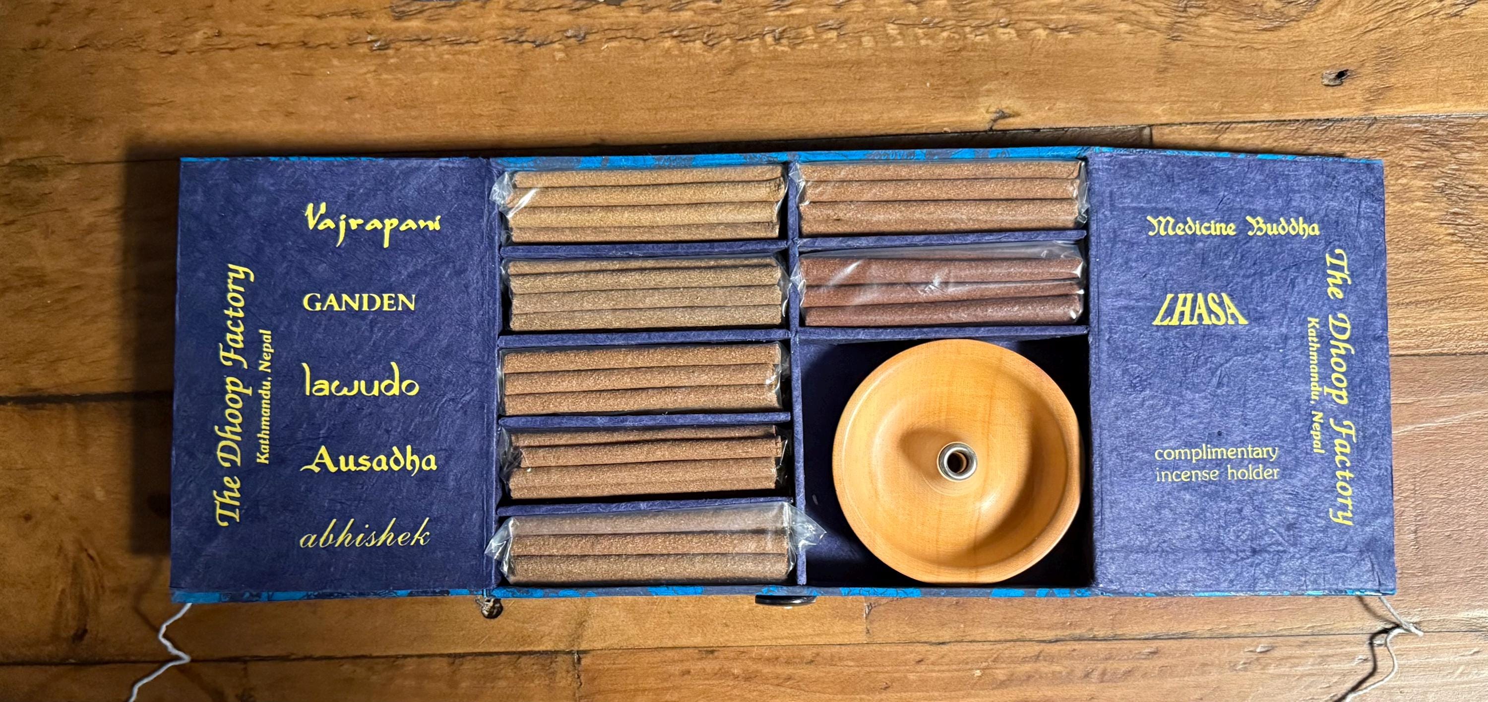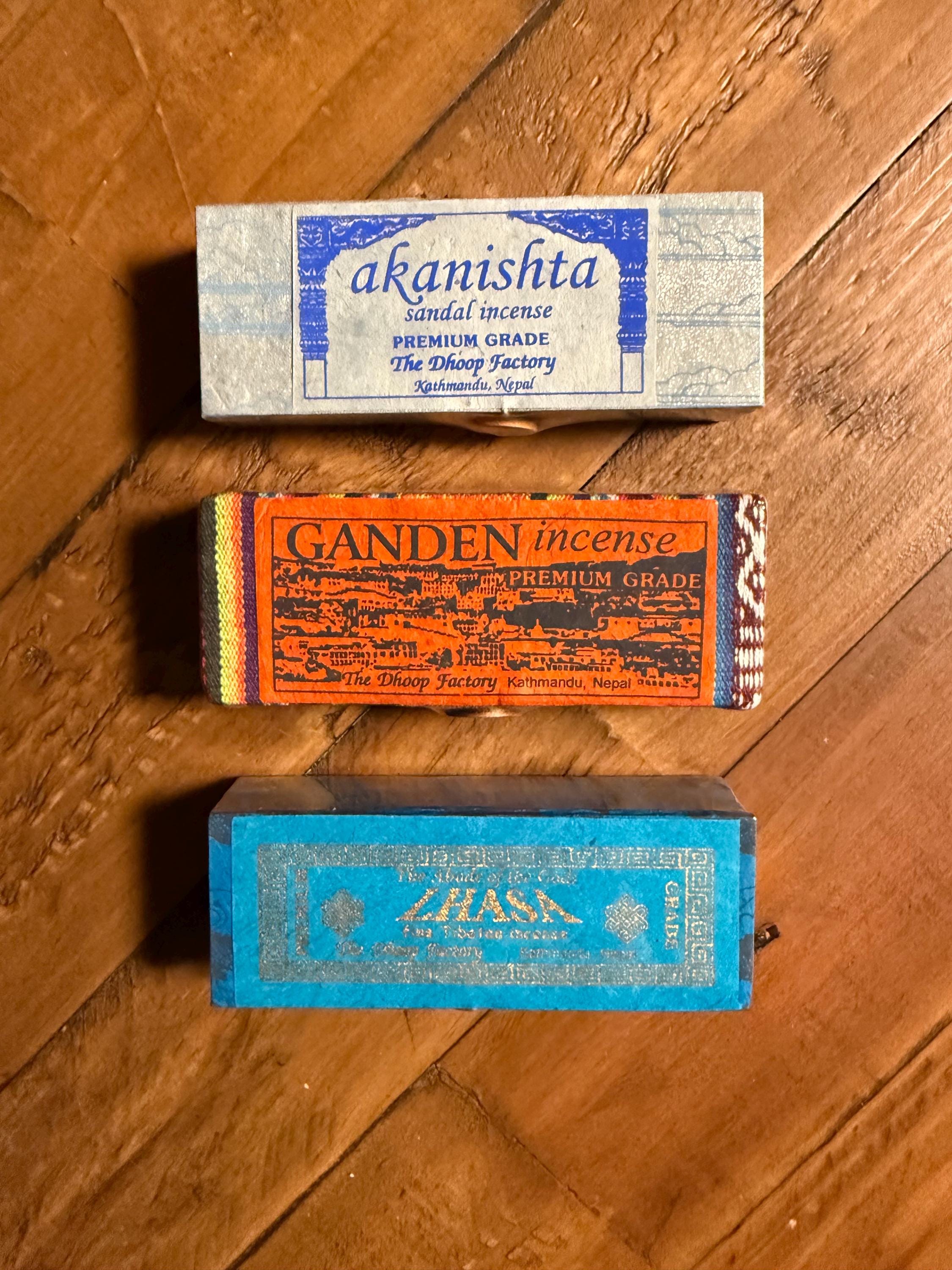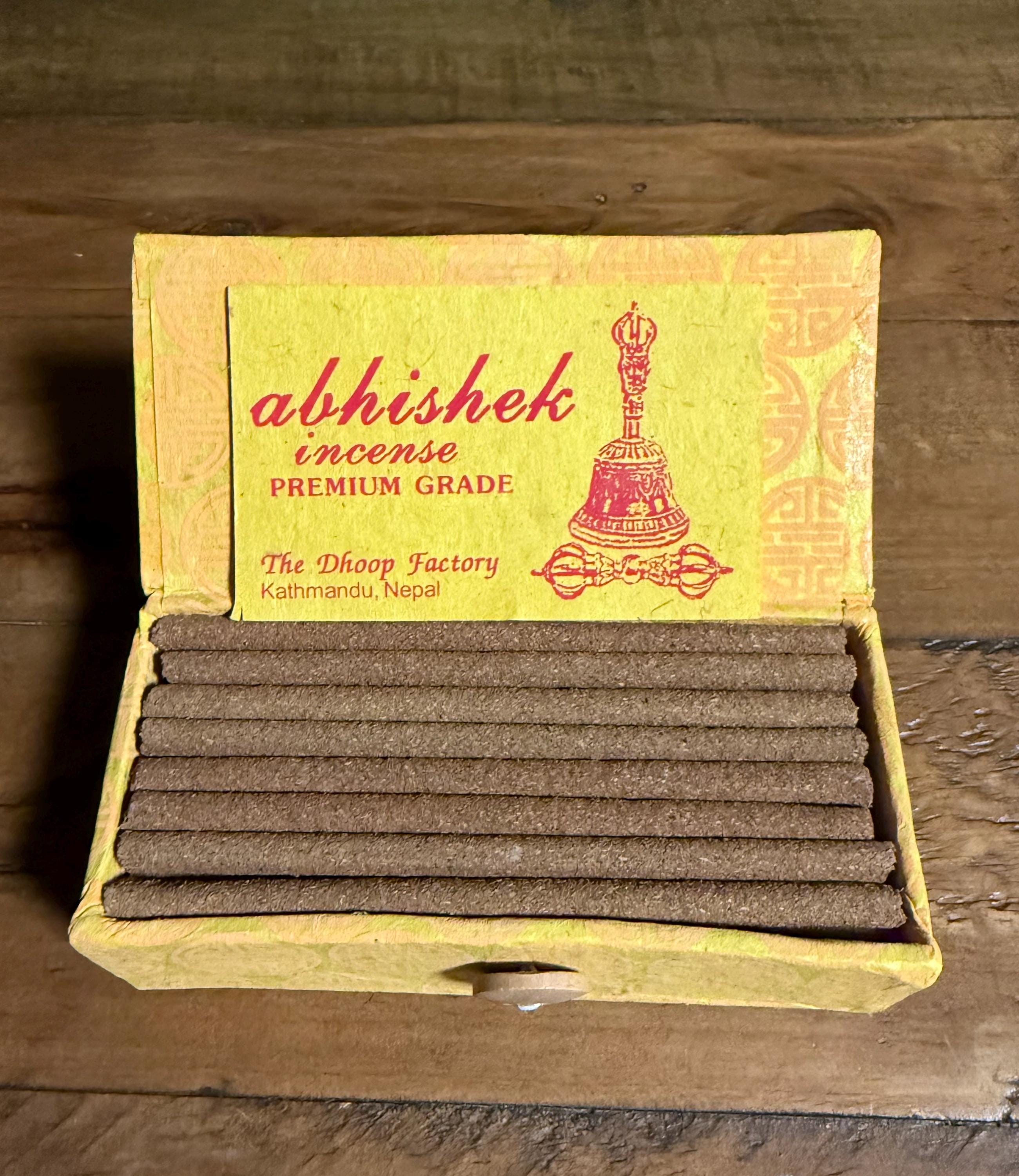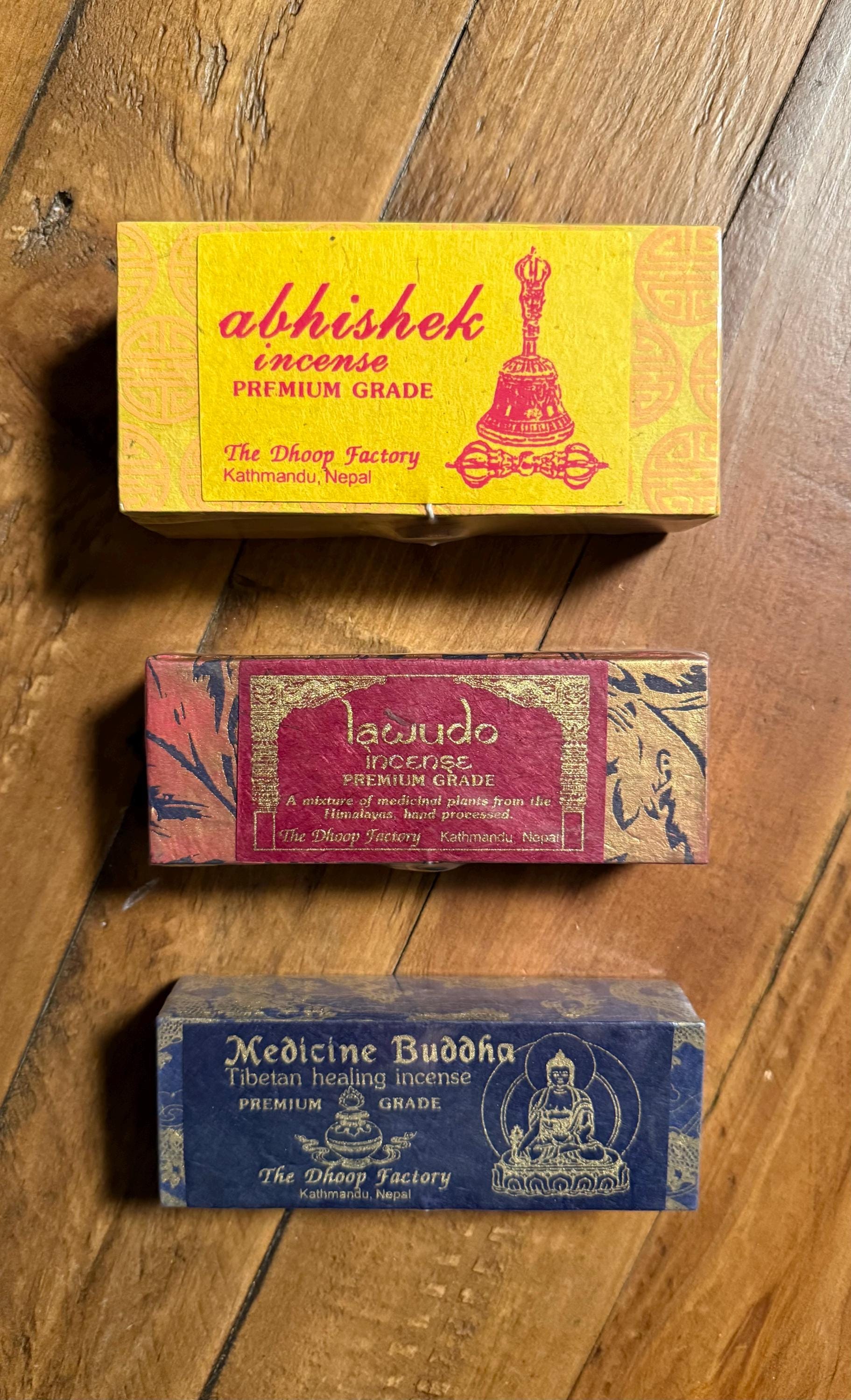 3. ABHISHEK (a-b’ee-shek) - a mix of high-altitude plants including juniper, rhododendron and sage, and includes frankincense, a resin produced in India, which is often burnt during Buddhist tantric initiations. It is our sweetest-smelling incense.