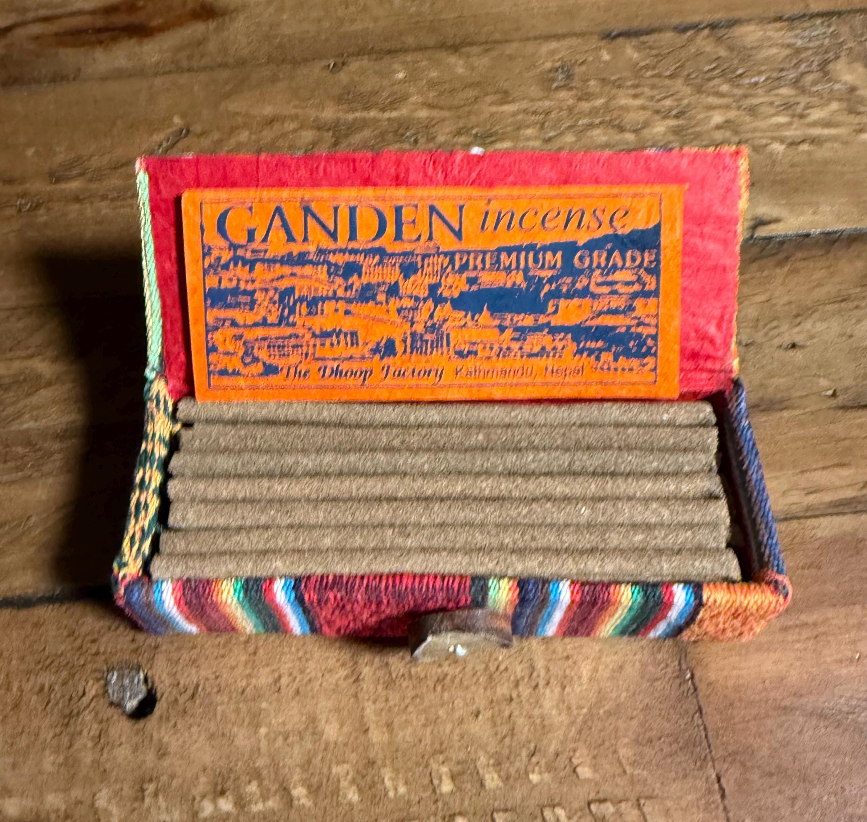 2. GANDEN is made from a sage-like herb gathered near the Ganden monastery, 30km outside Lhasa, Tibet. It has a bitter aroma with a hint of mint. Its medicinal properties are described by the physician to H.H. the Dalai Lama who believes it soothes cold and flu as well as purifying the environment. These herbs are burned in large quantities by Tibetans both indoors and out. Effective for purifying homes and offices of domestic smells, smoke etc.