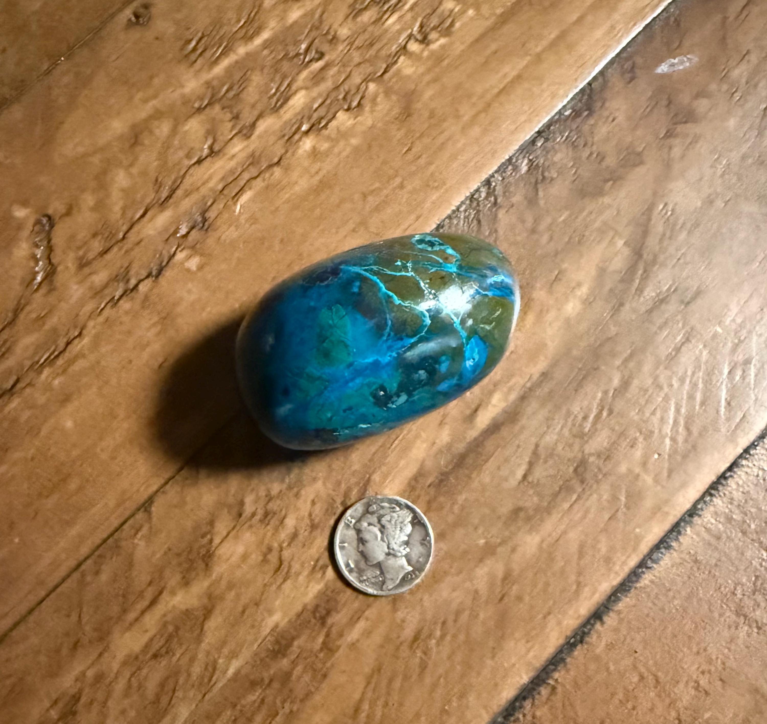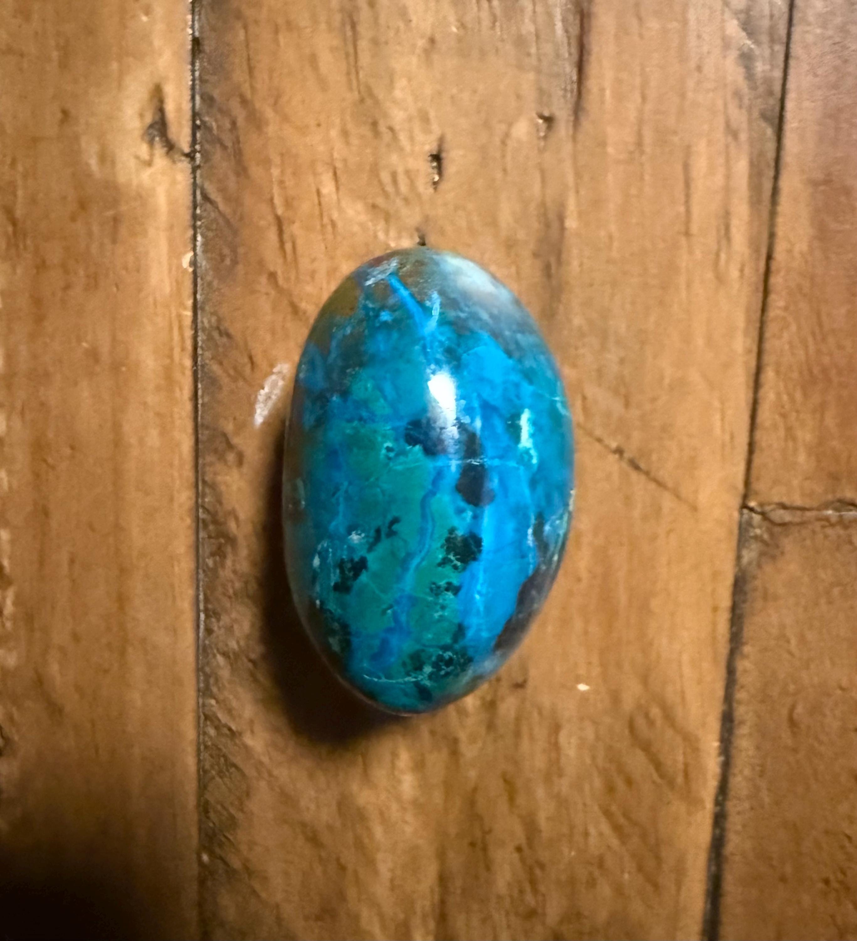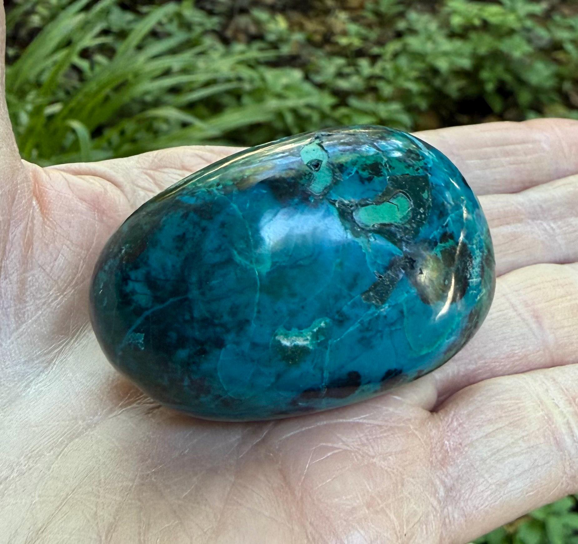 This is a gorgeous, large and polished Chrysocolla nugget with varying shades of green and blue.