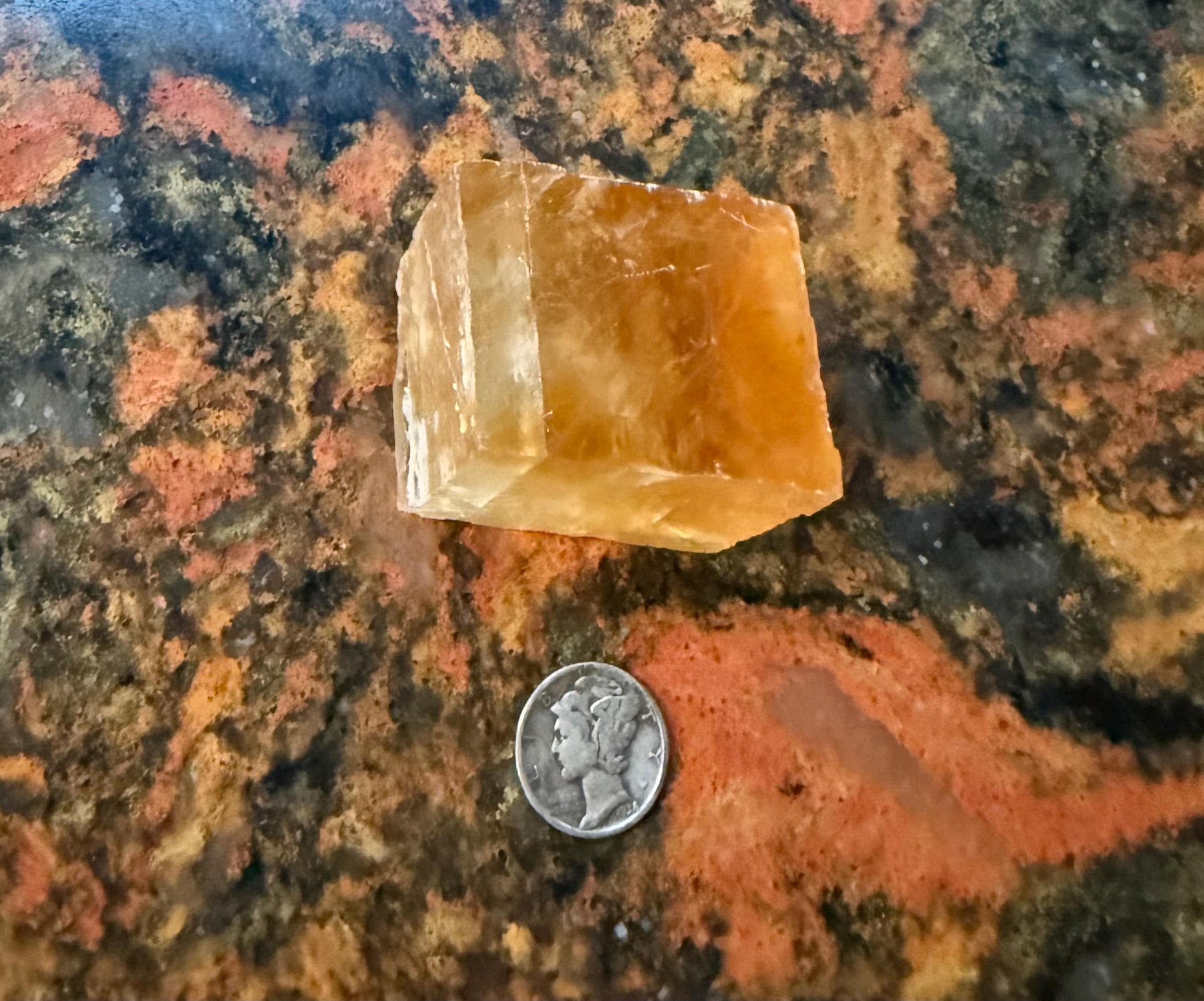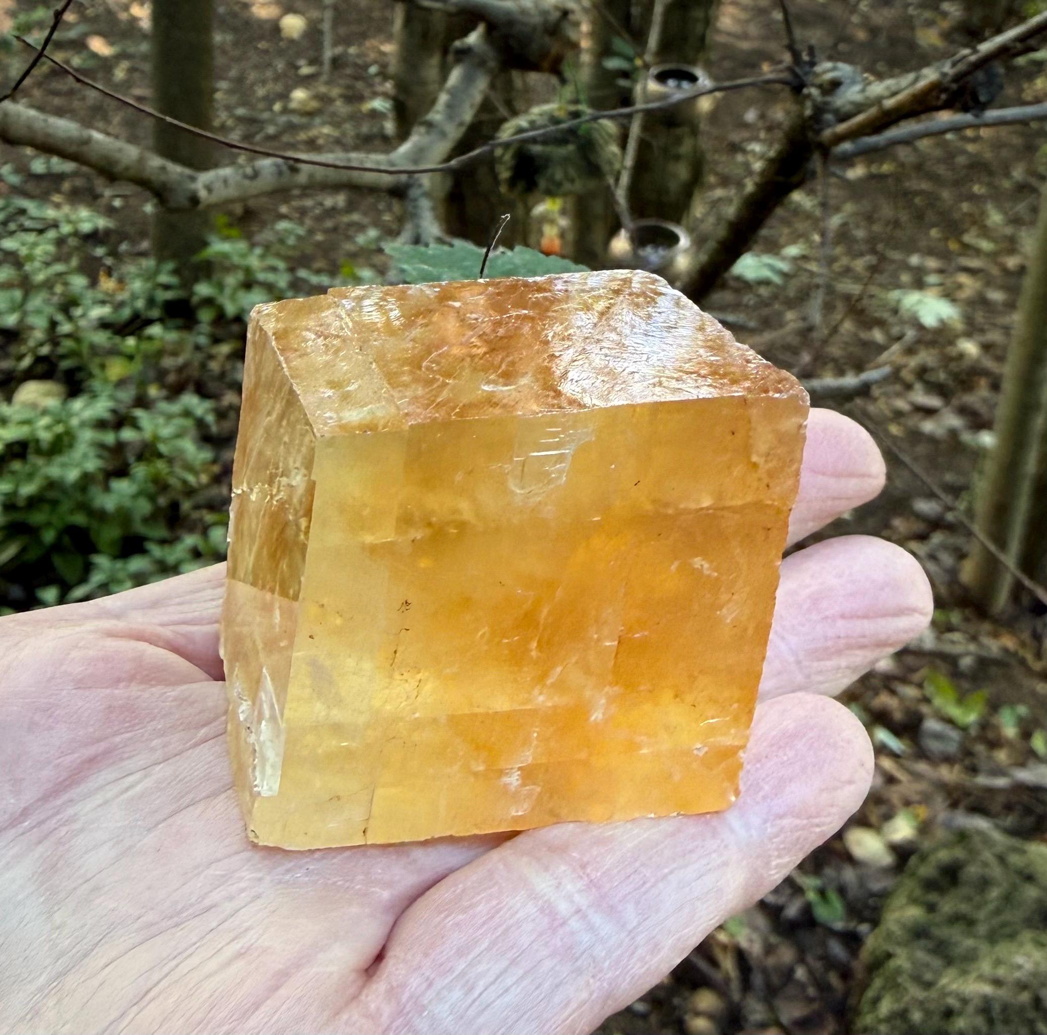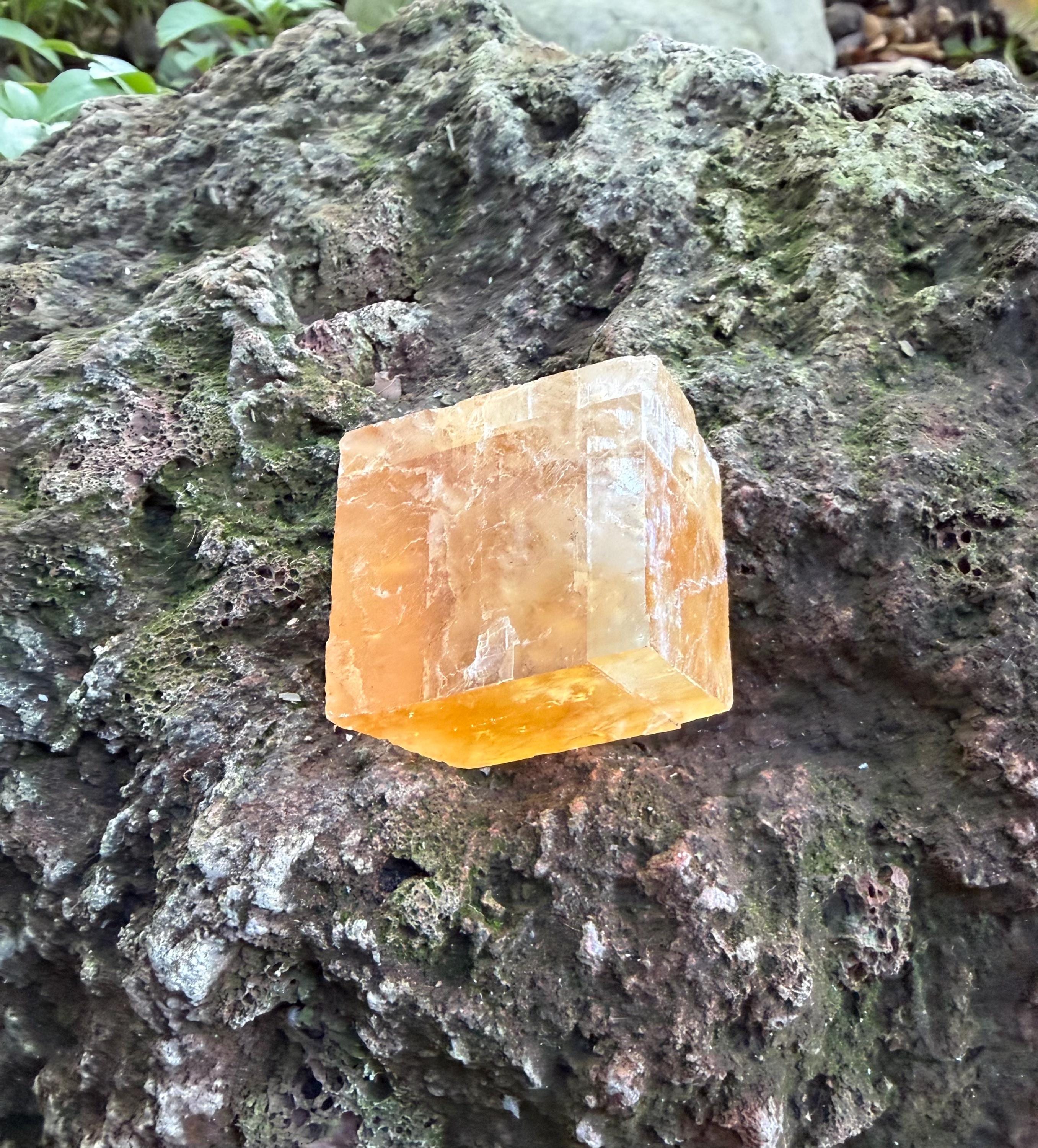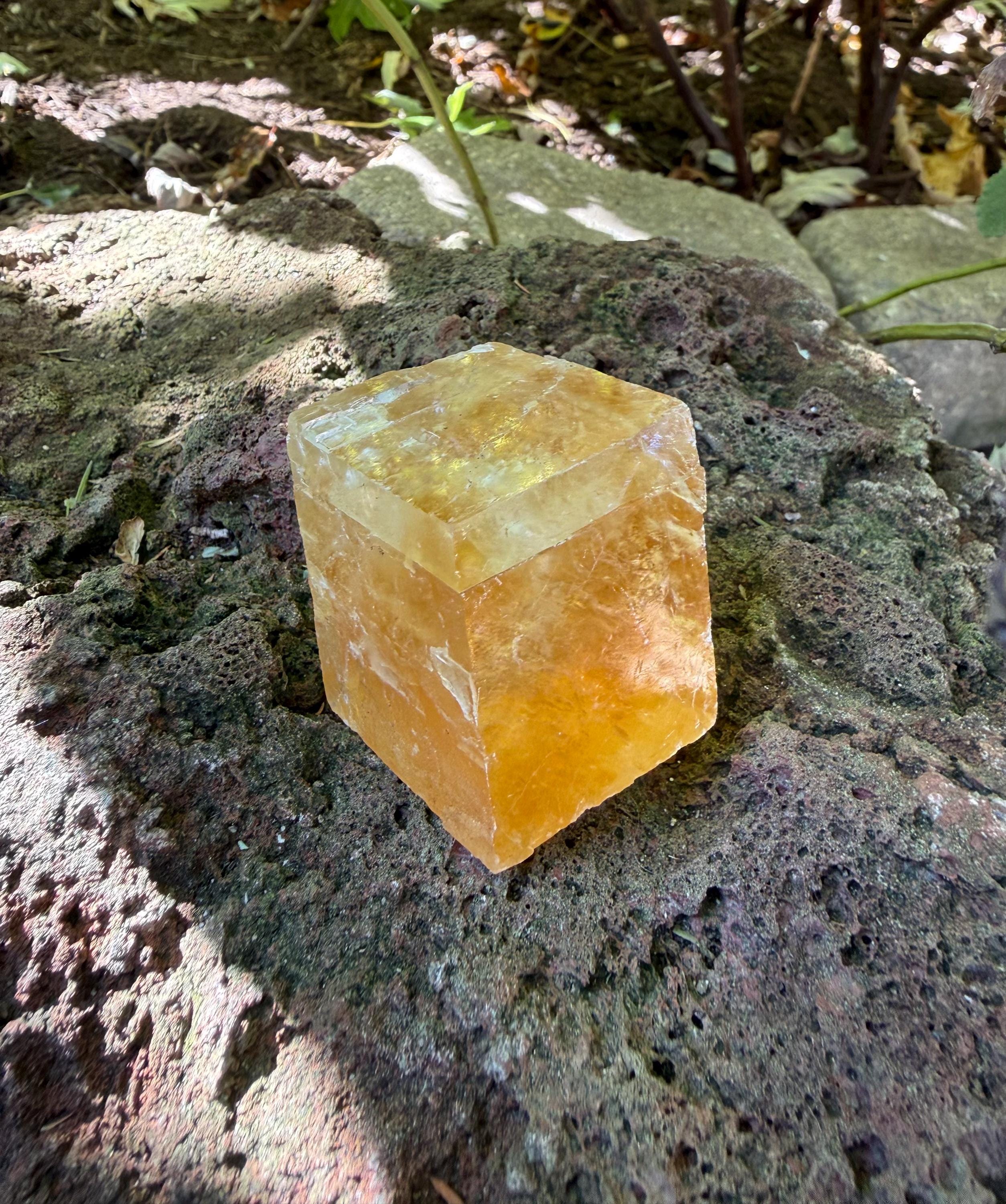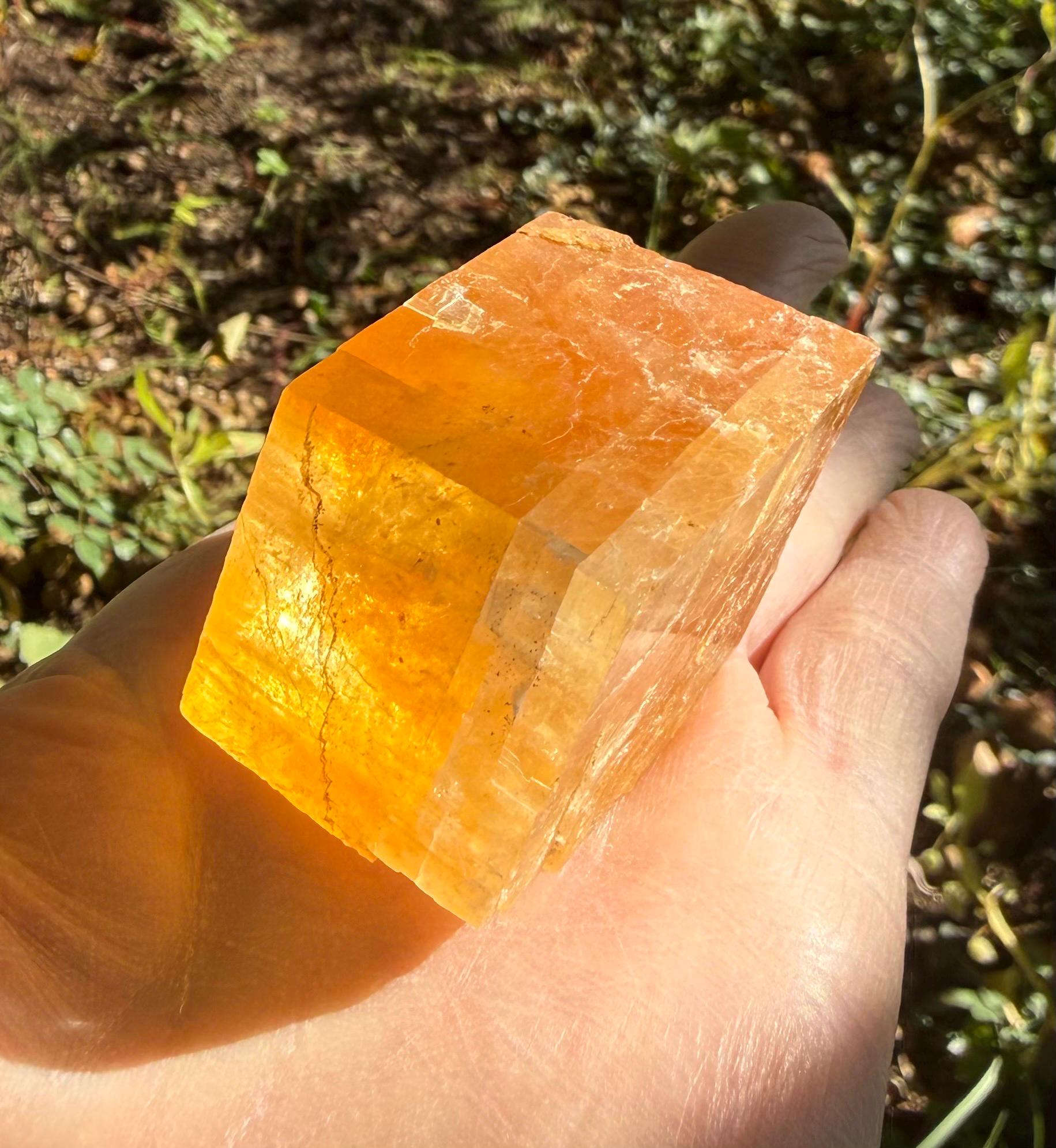 This is a beautiful, deep golden Amber Calcite from China with beautiful iridescence, and a propensity to gather and hold light.