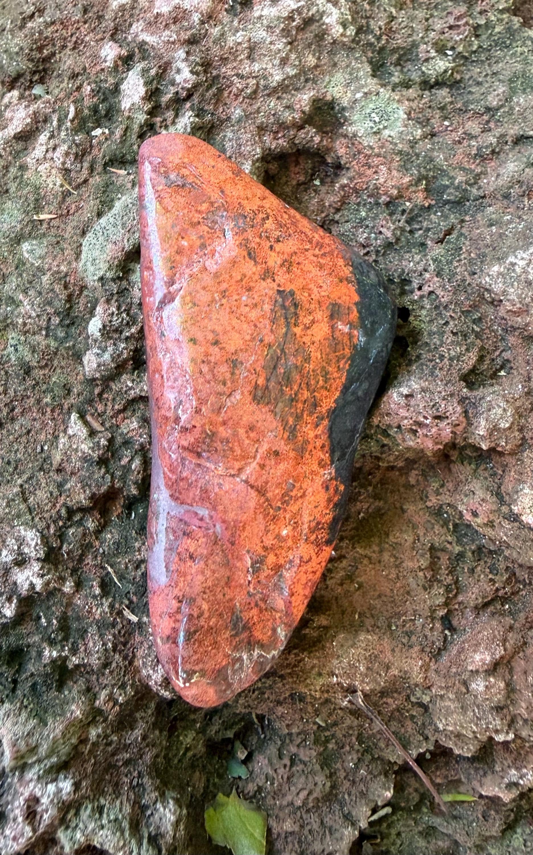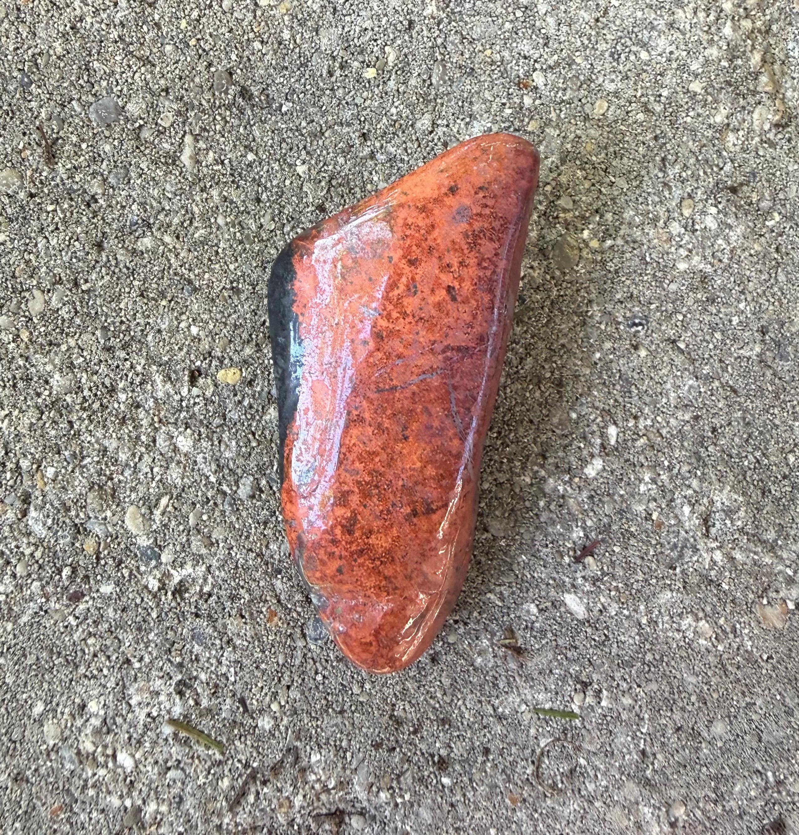 It is a very deep orangish-red to reddish black in color, due to its copper content.