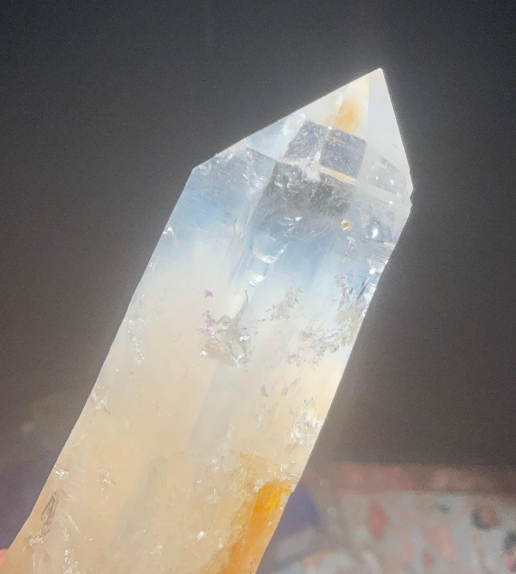 An absolutely incredible Blue Mist Lemurian from Colombia with included Cookeite blue mist phantoms and Rich Golden Oxide.
