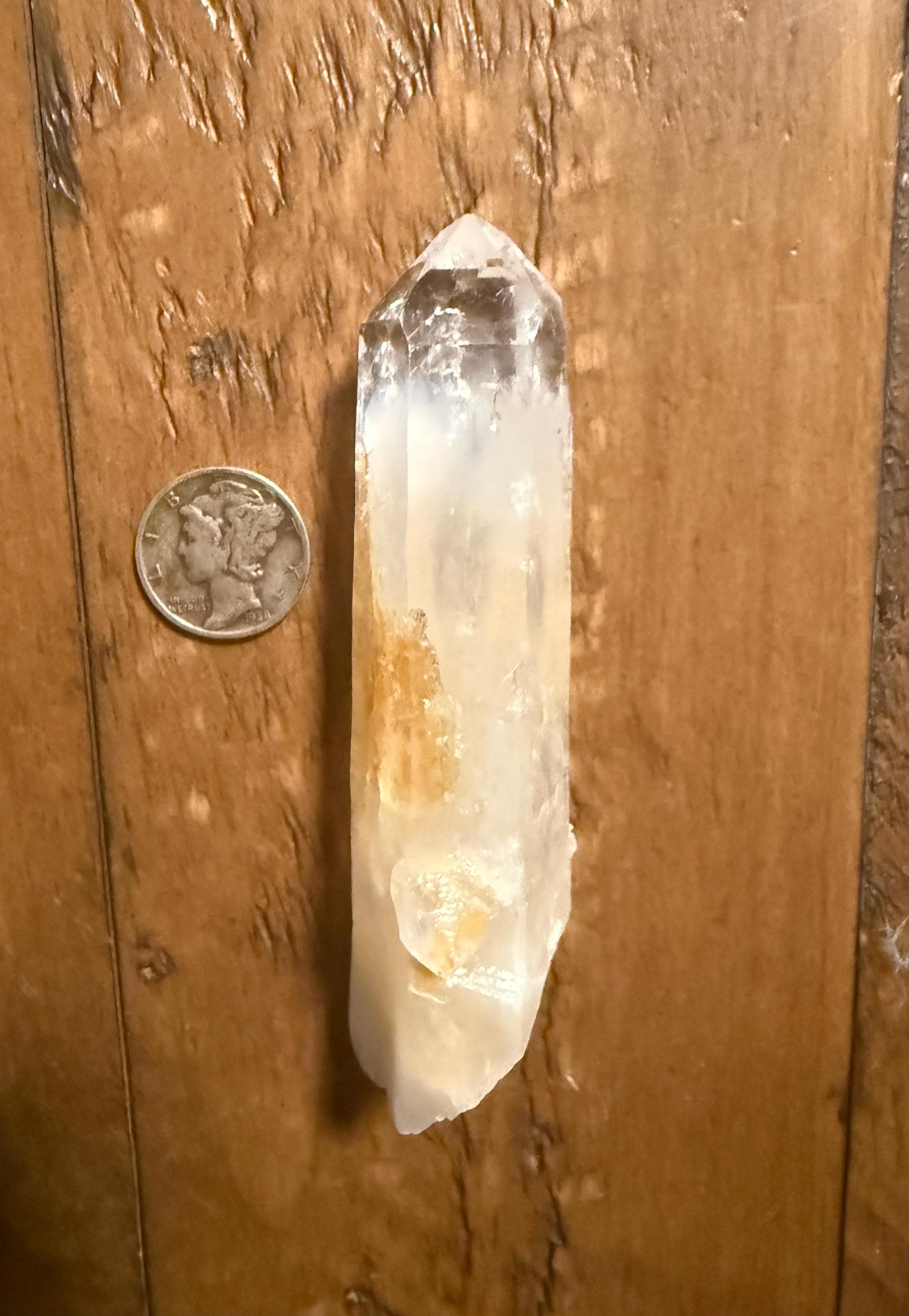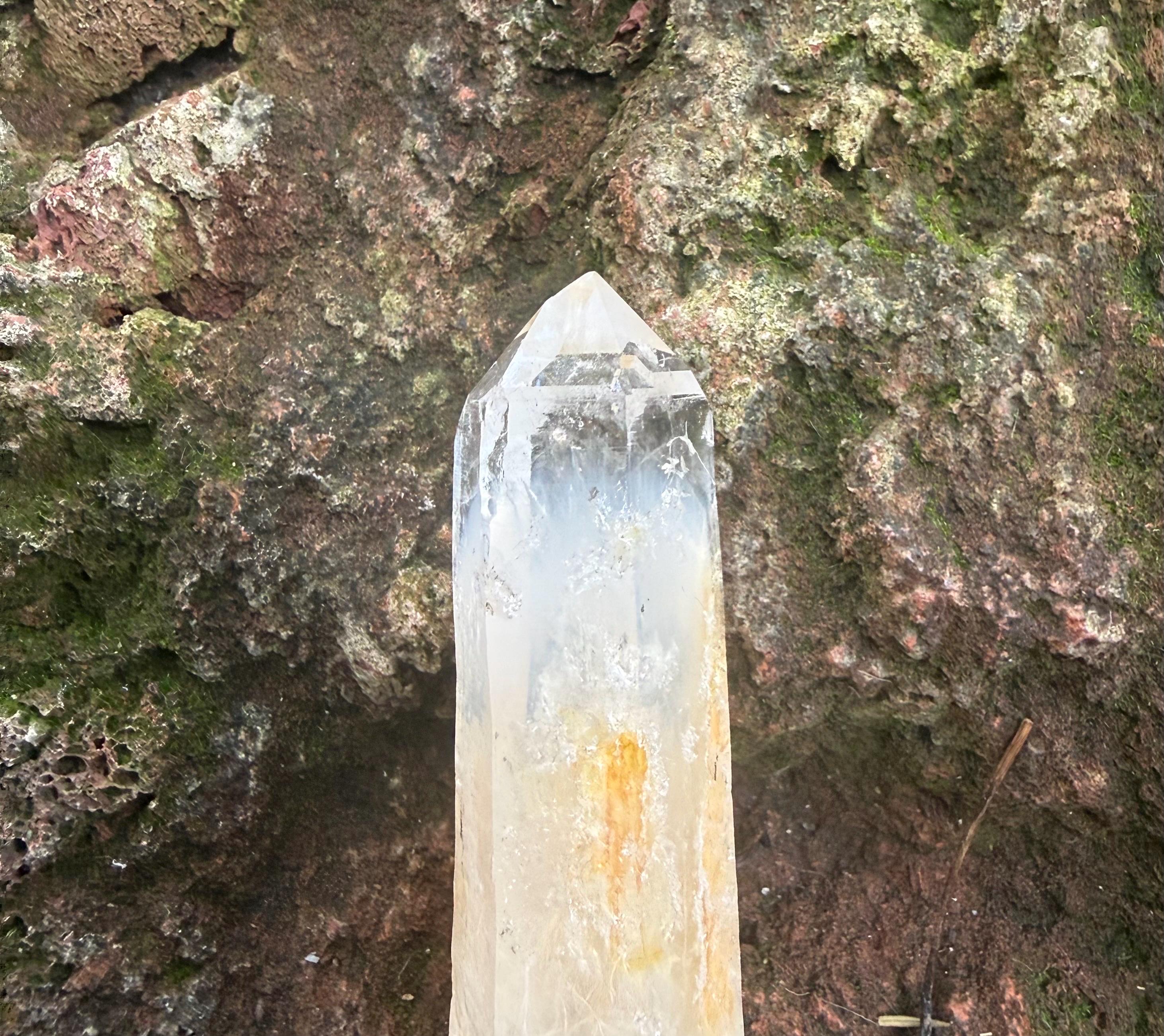 This stunning and clear crystal has a self-healed base and a shallow key area above the base.