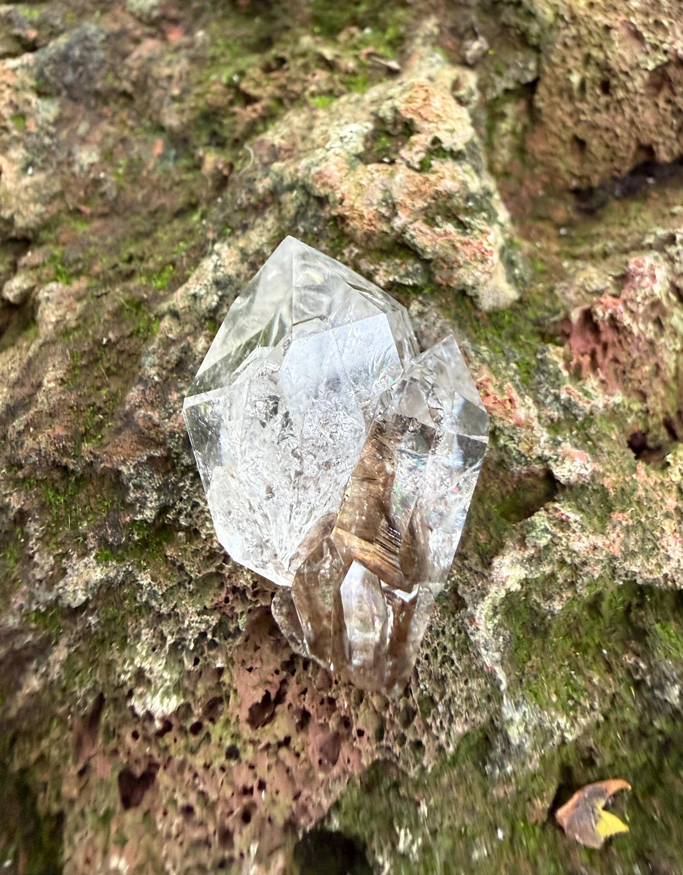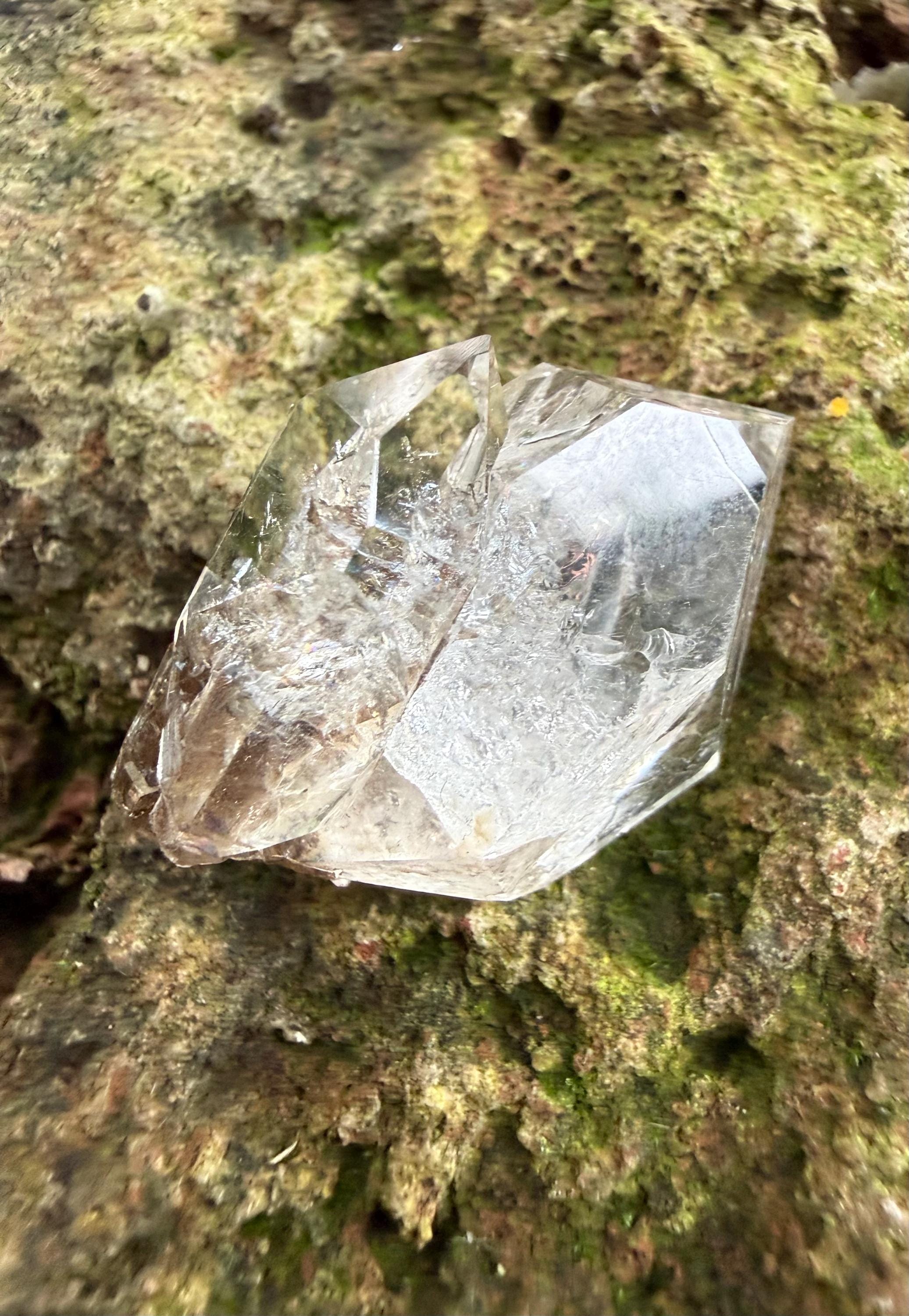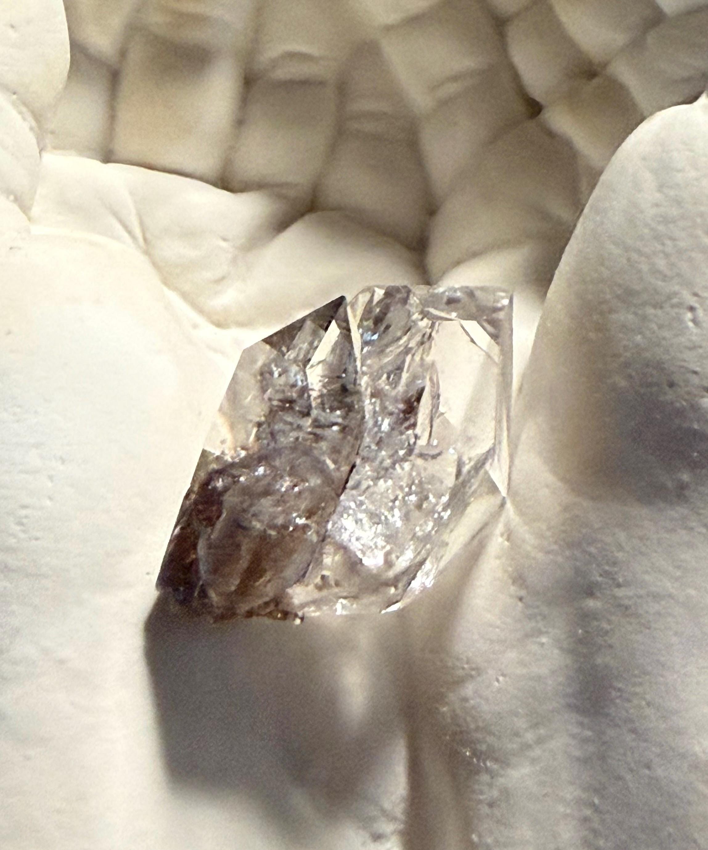 This very beautiful, double terminated Herkimer Diamond pocket crystal from Herkimer County, NY, is sparkling with gorgeous silver veiling and colorful rainbow points.