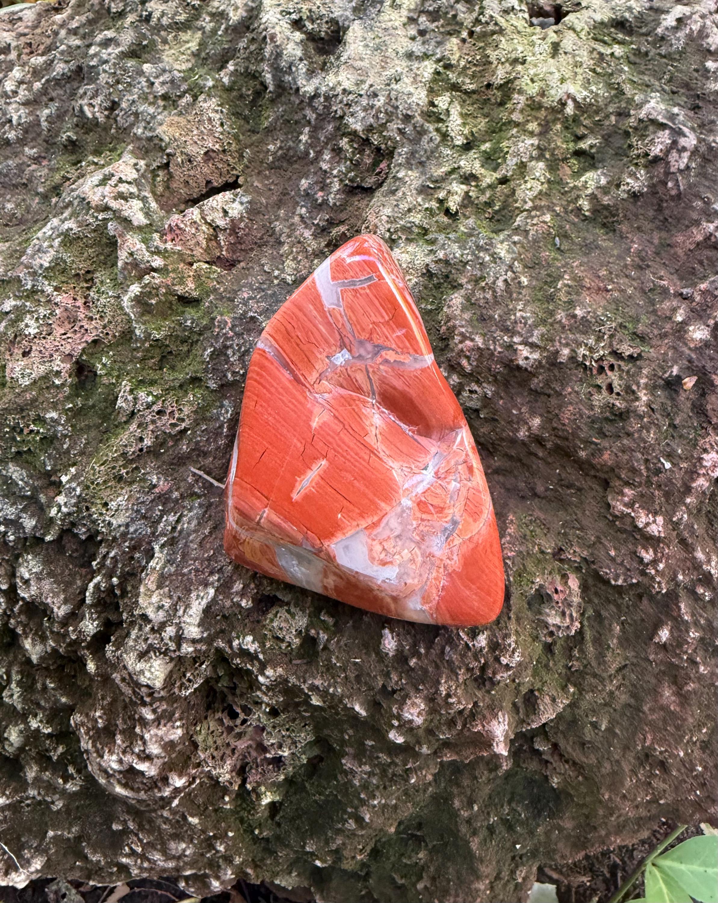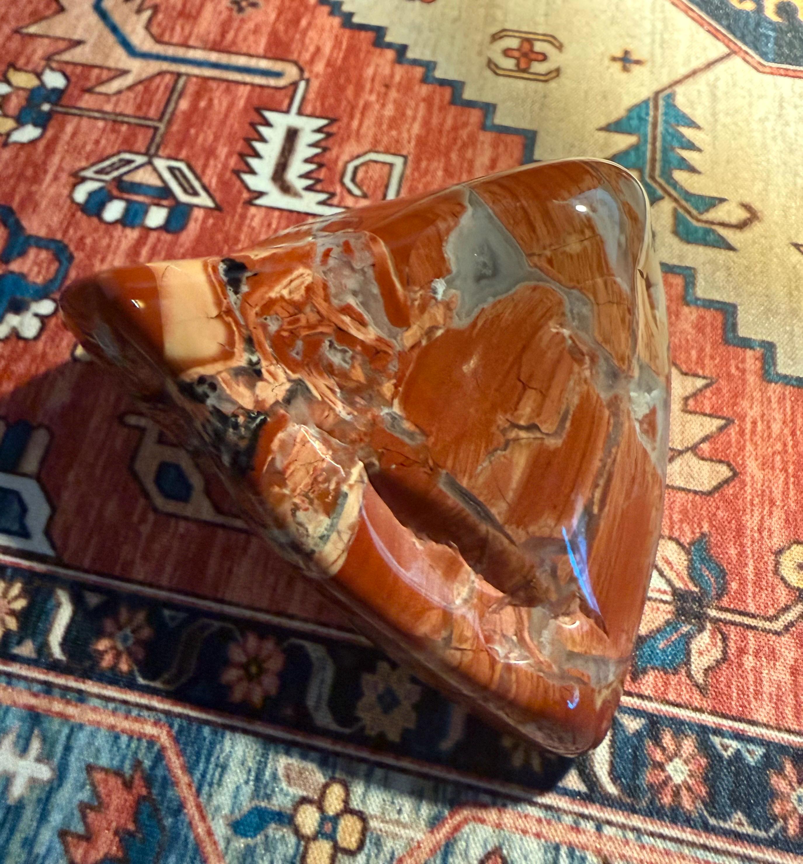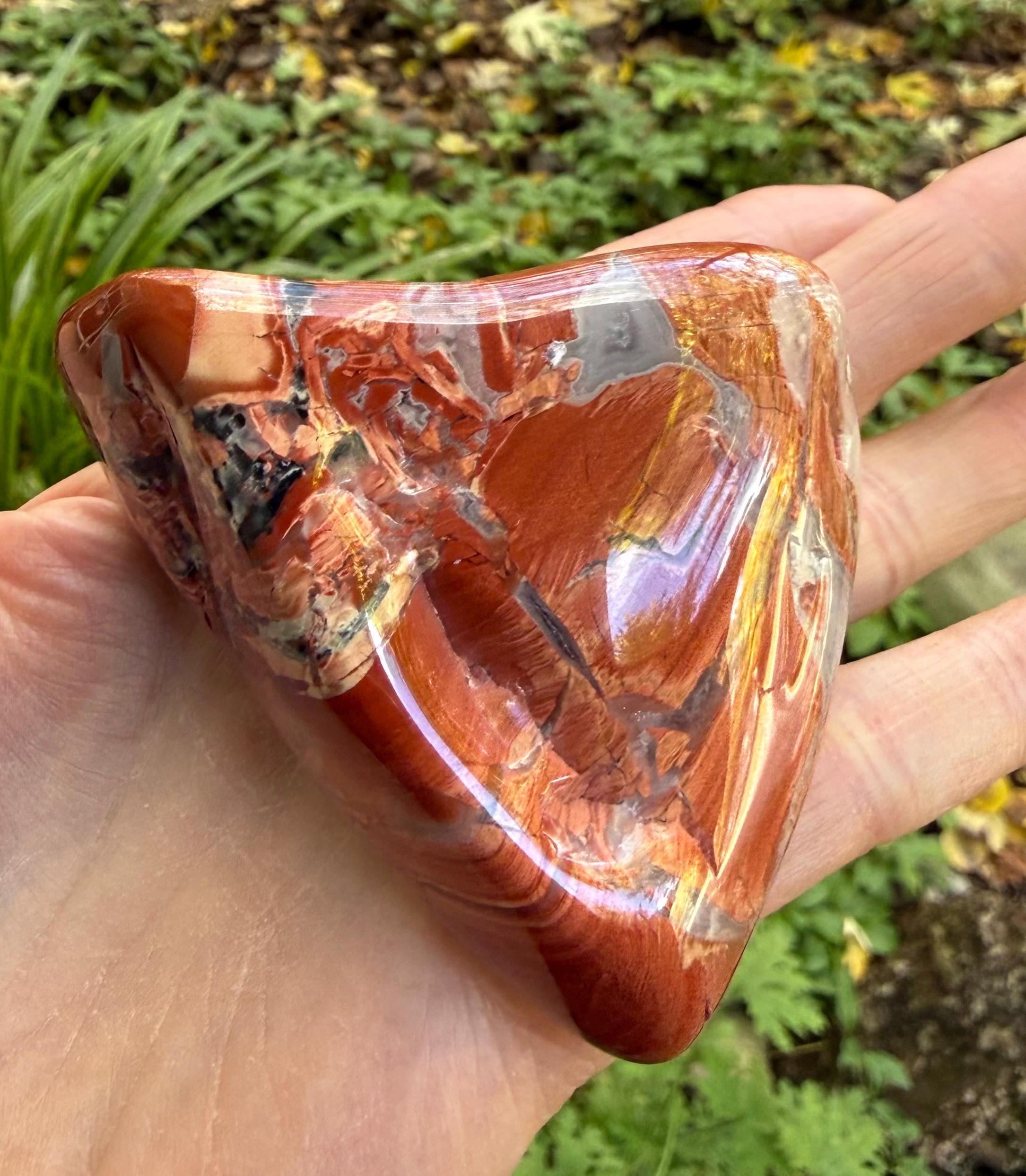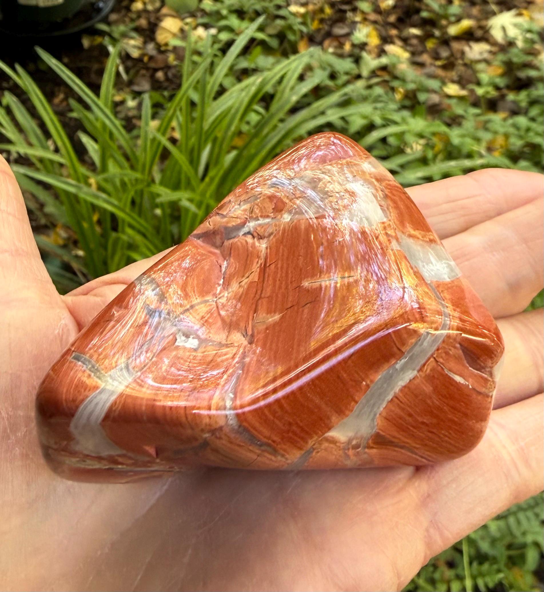 This is a beautiful Red River Jasper polished, freeform palm stone from South Africa.