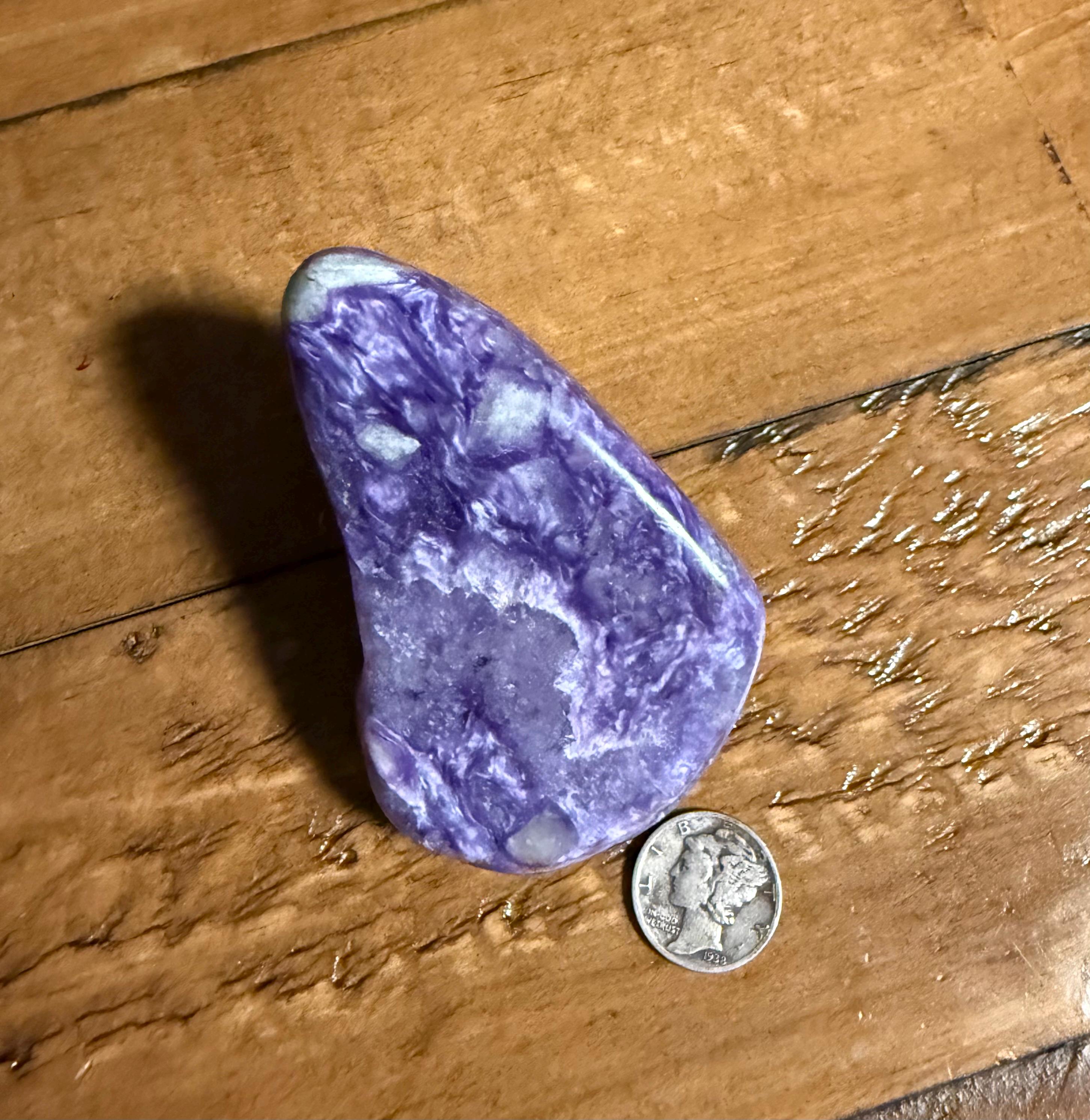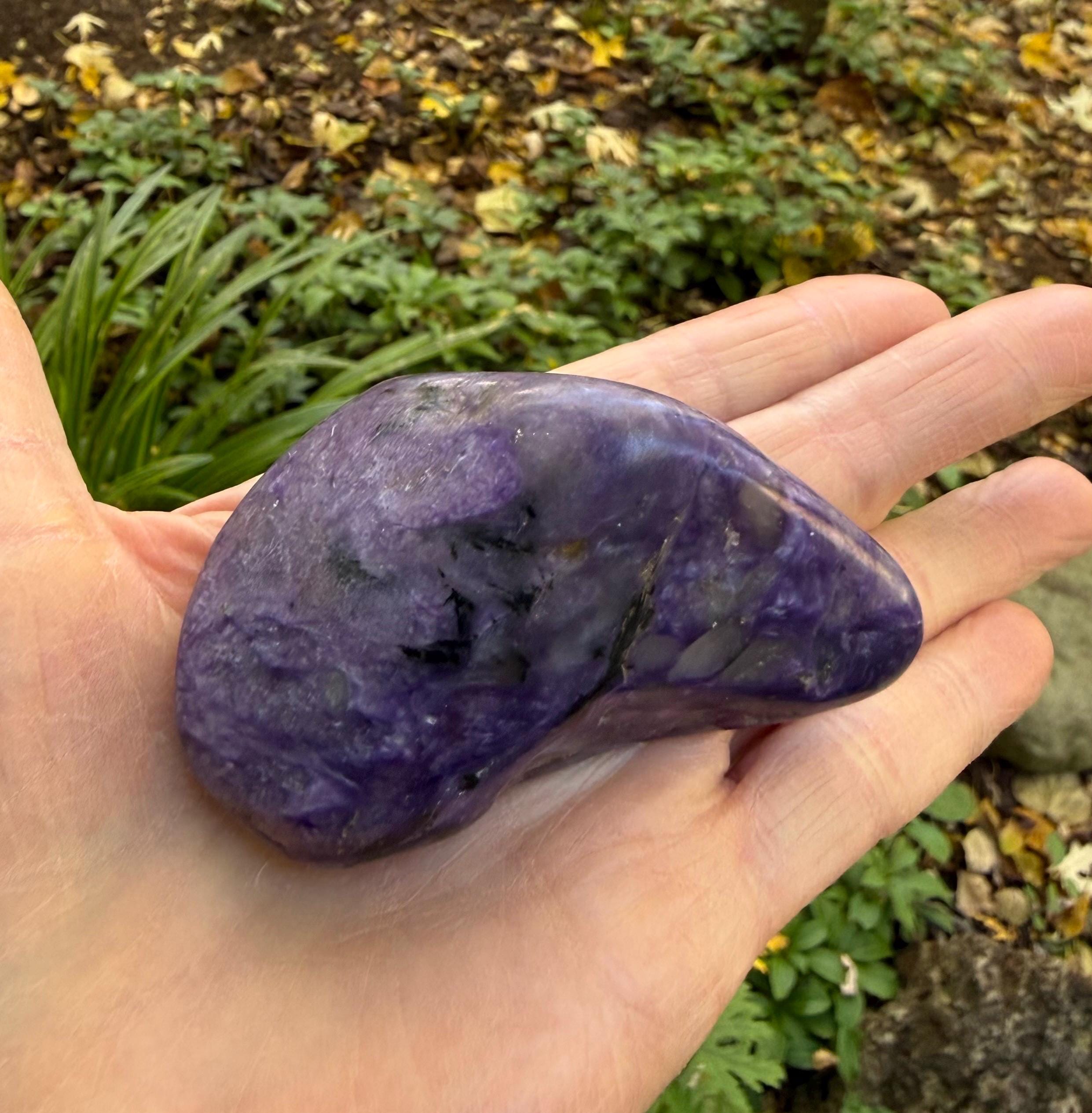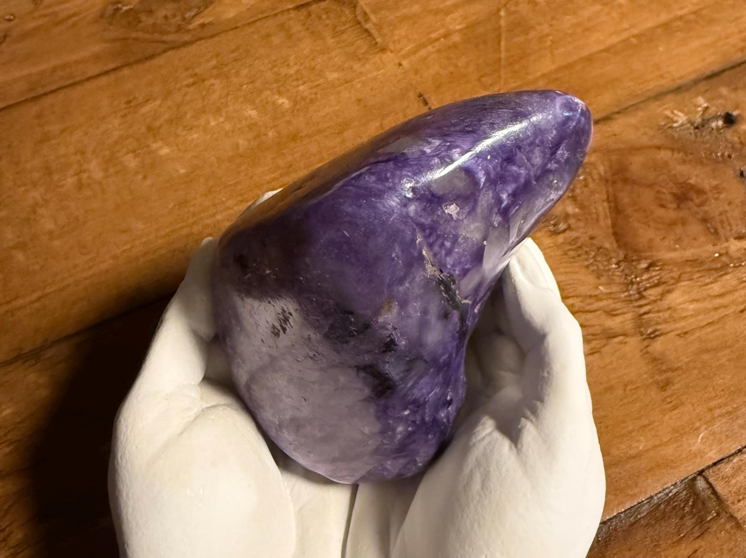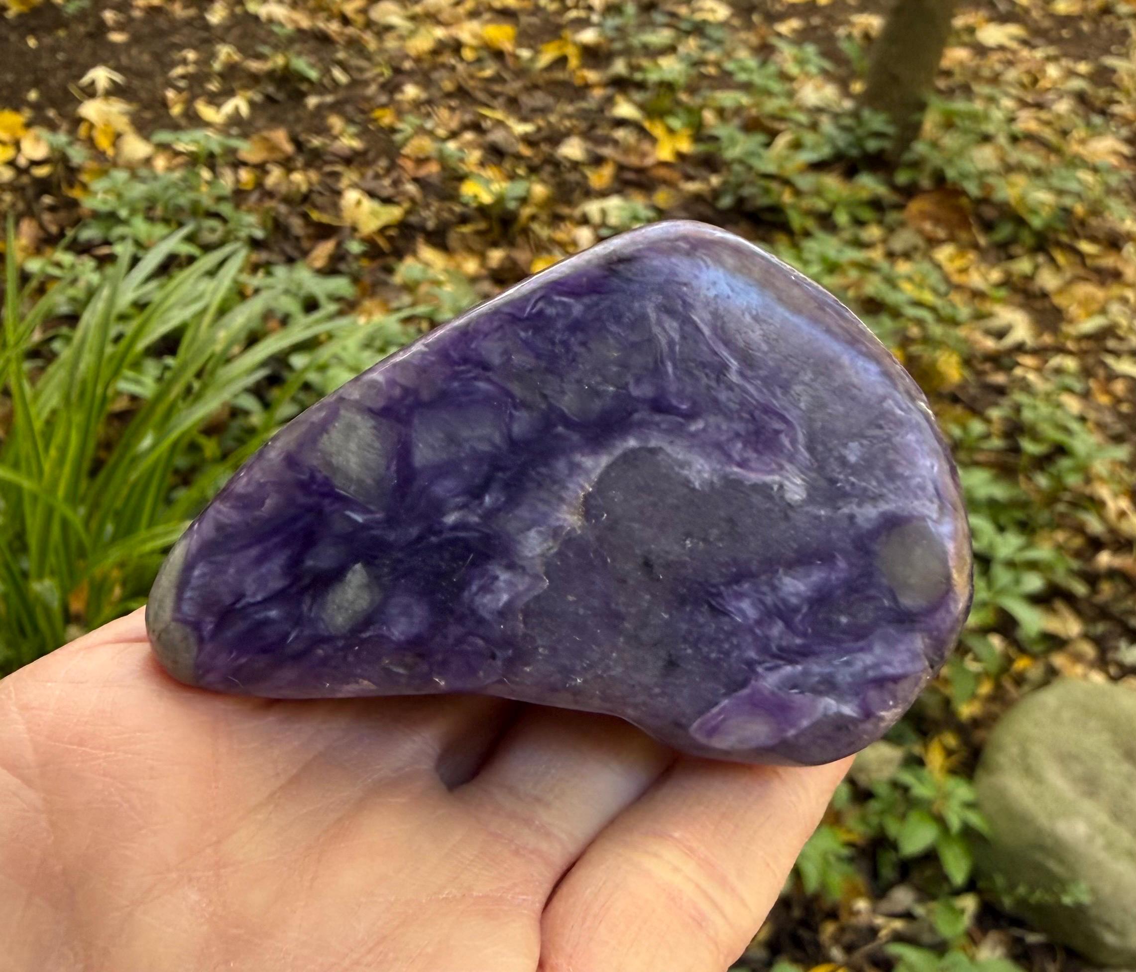 A beautiful, smoothly polished freeform palm stone of Charoite from Russia.