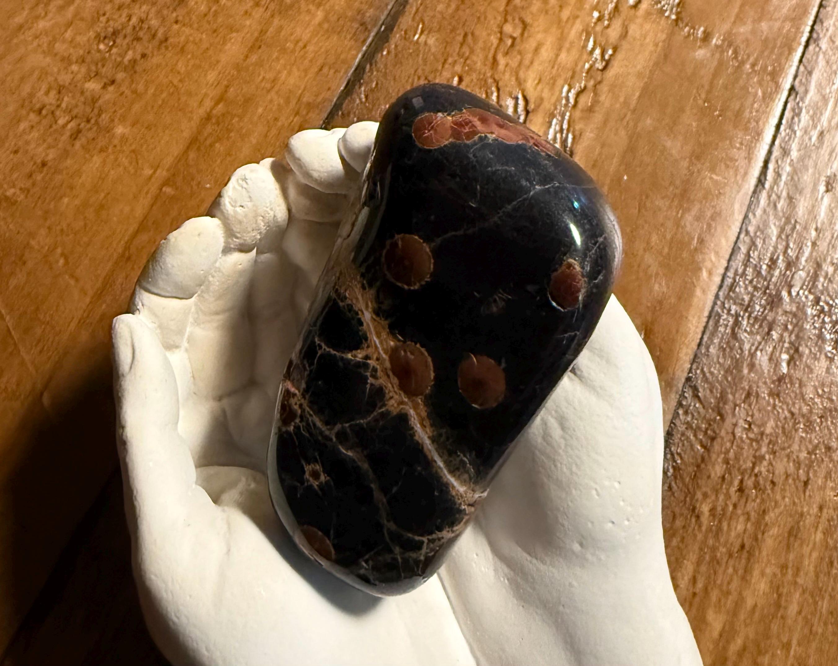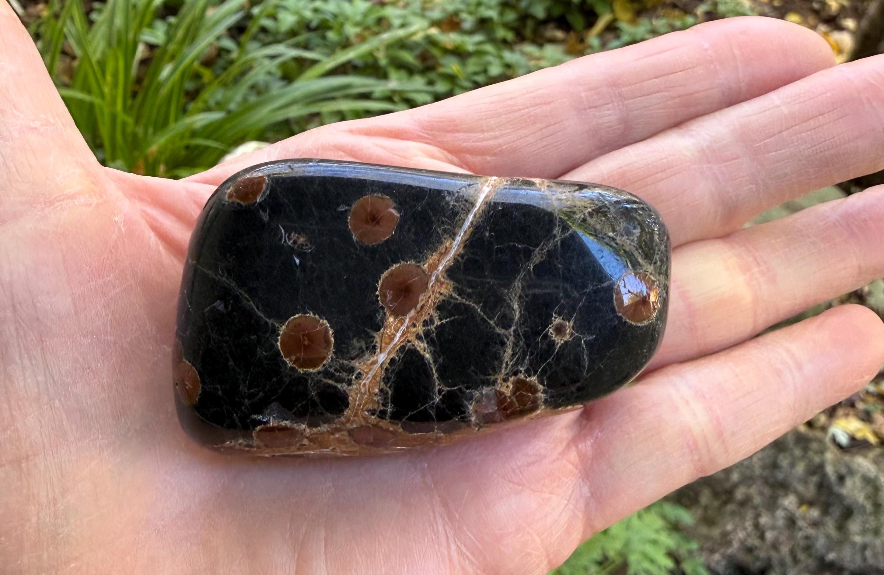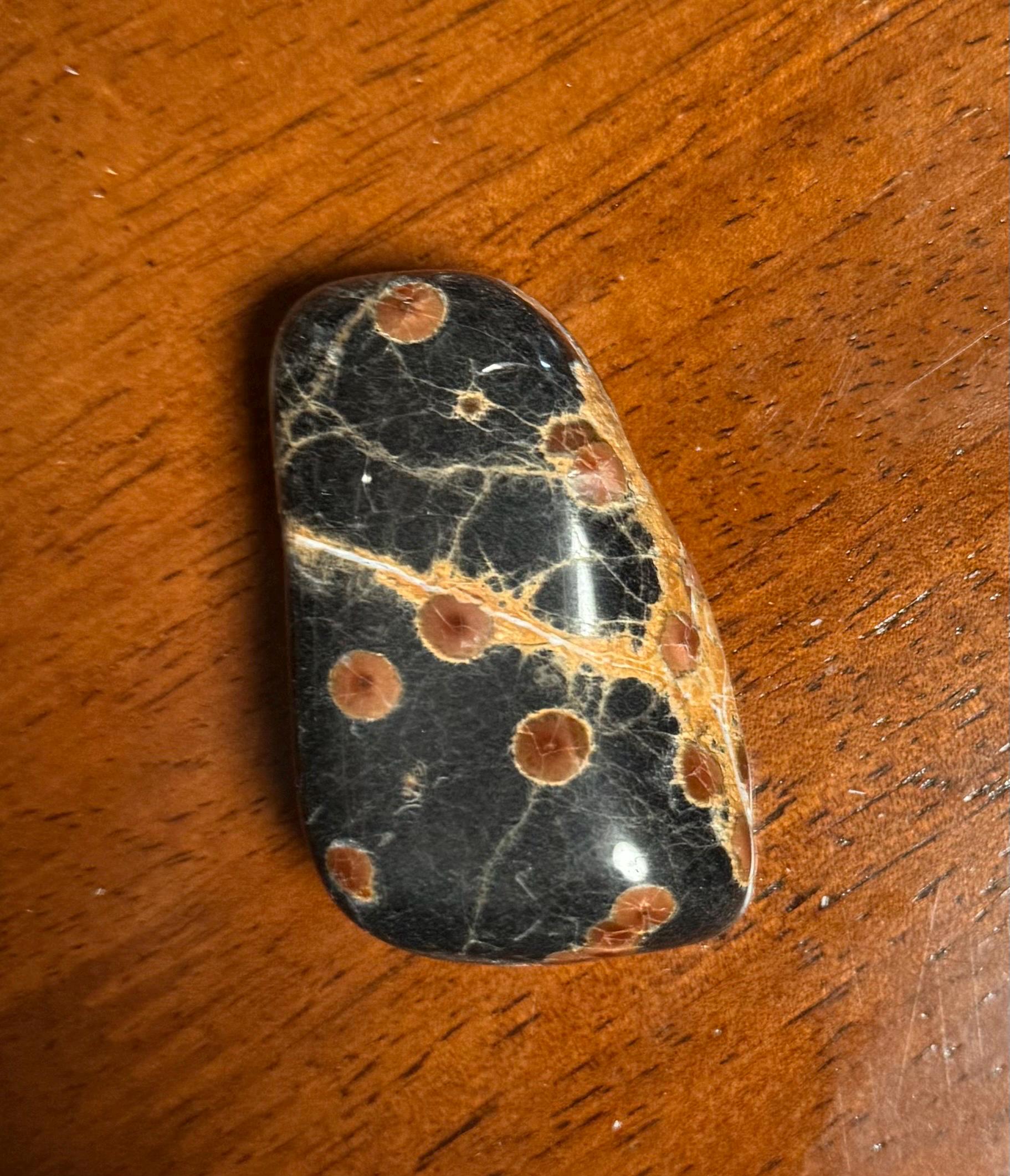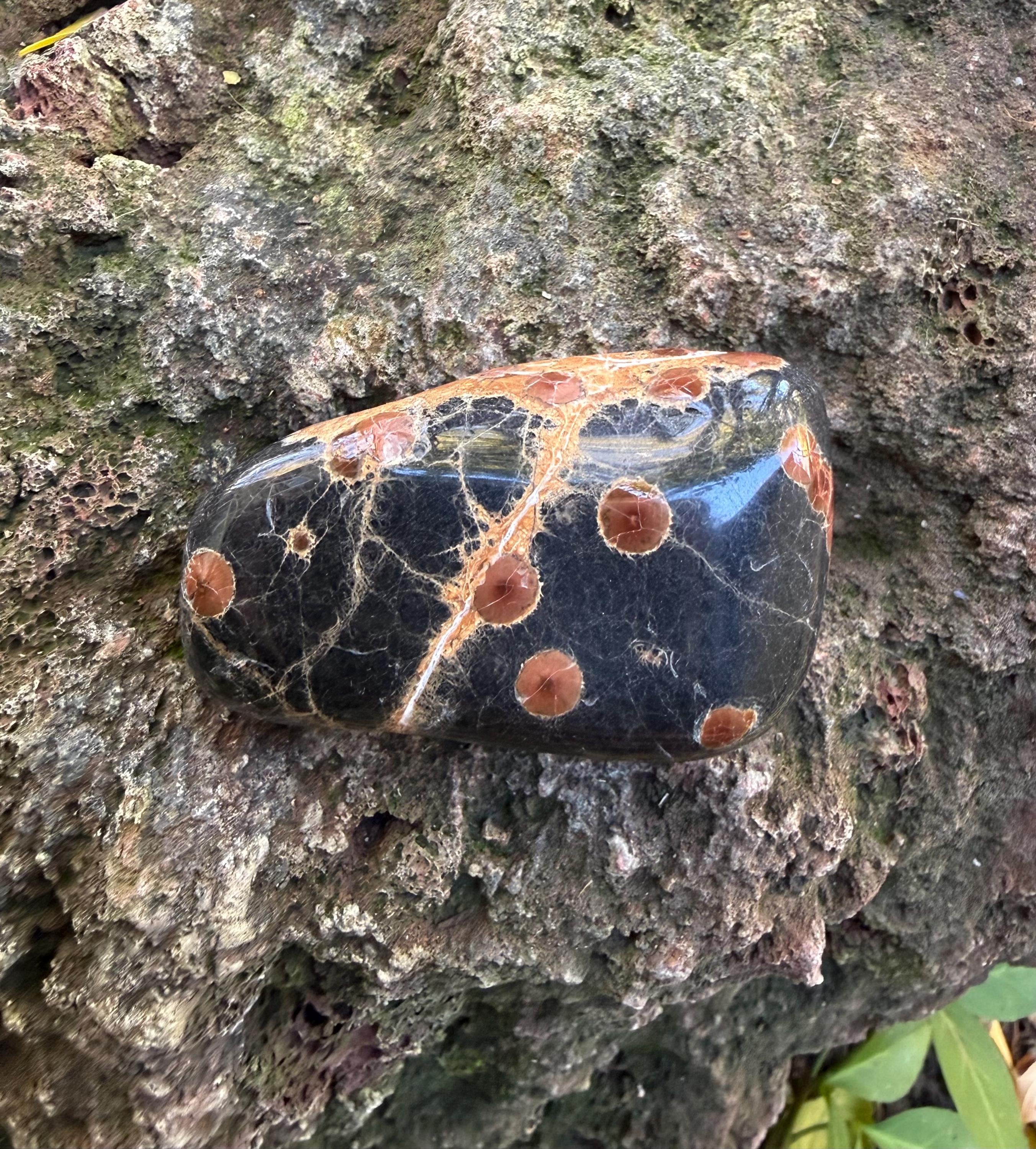 This is a very beautiful, polished Peanut Obsidian polished stone from Mexico with pitch black color and gorgeous reddish-orange orbs.