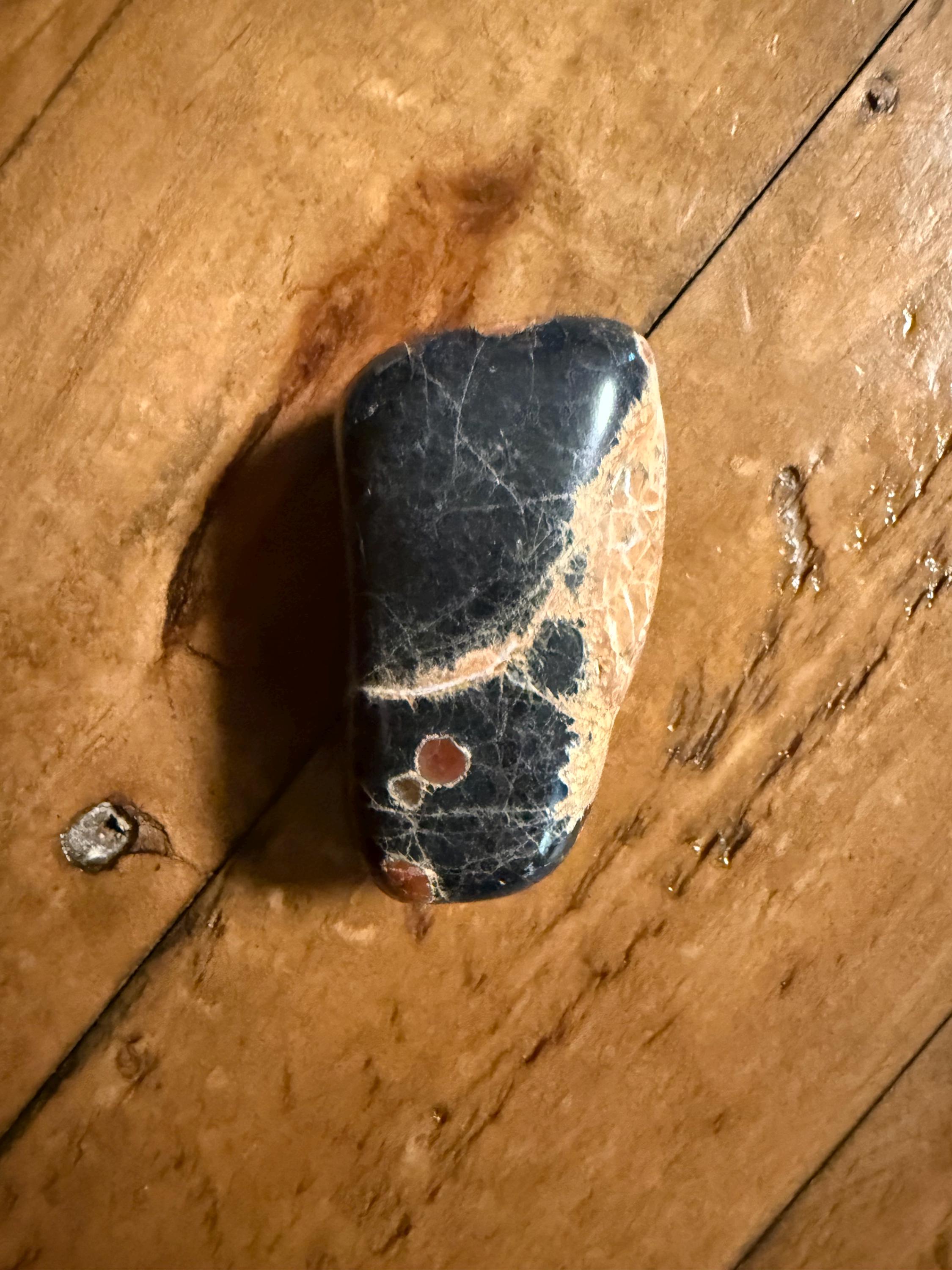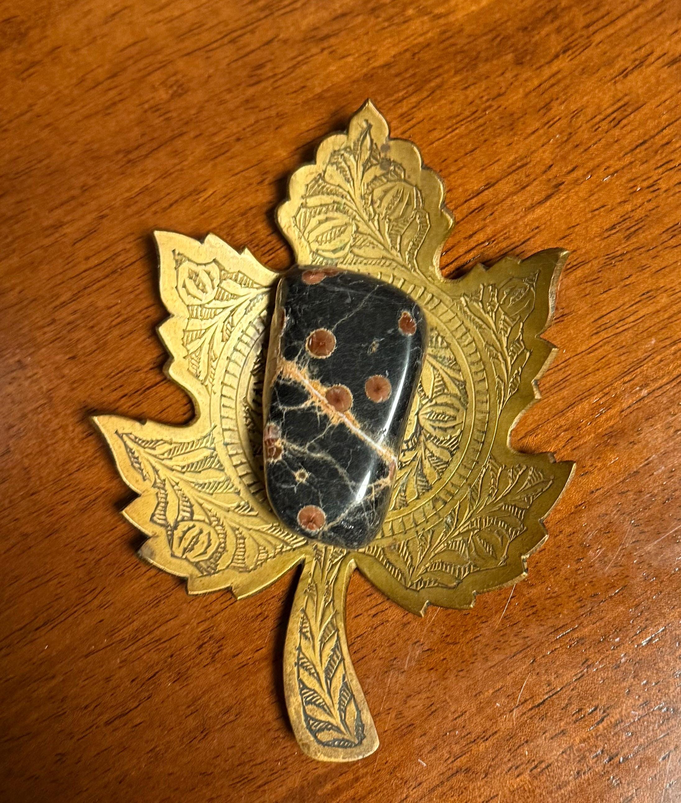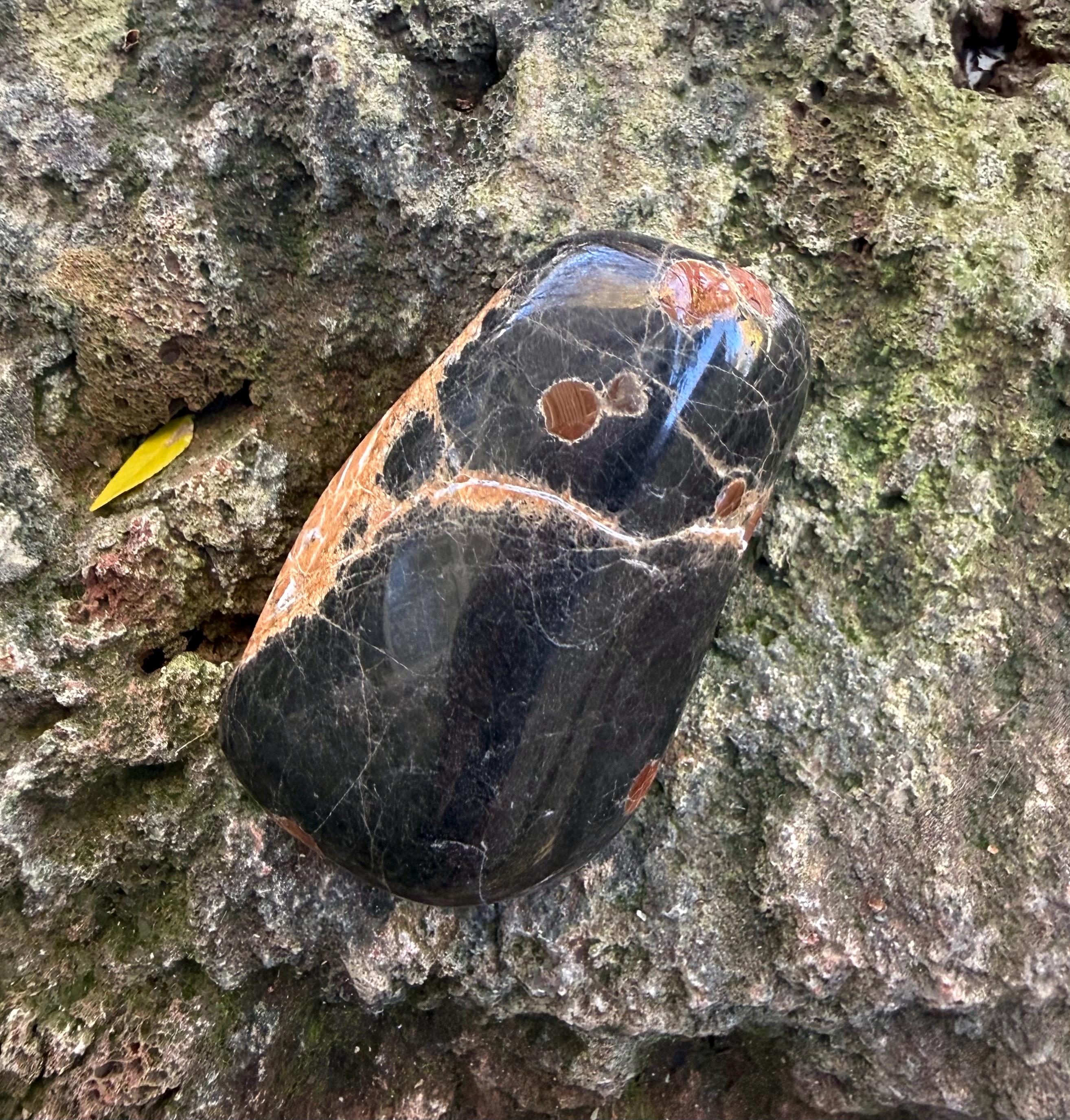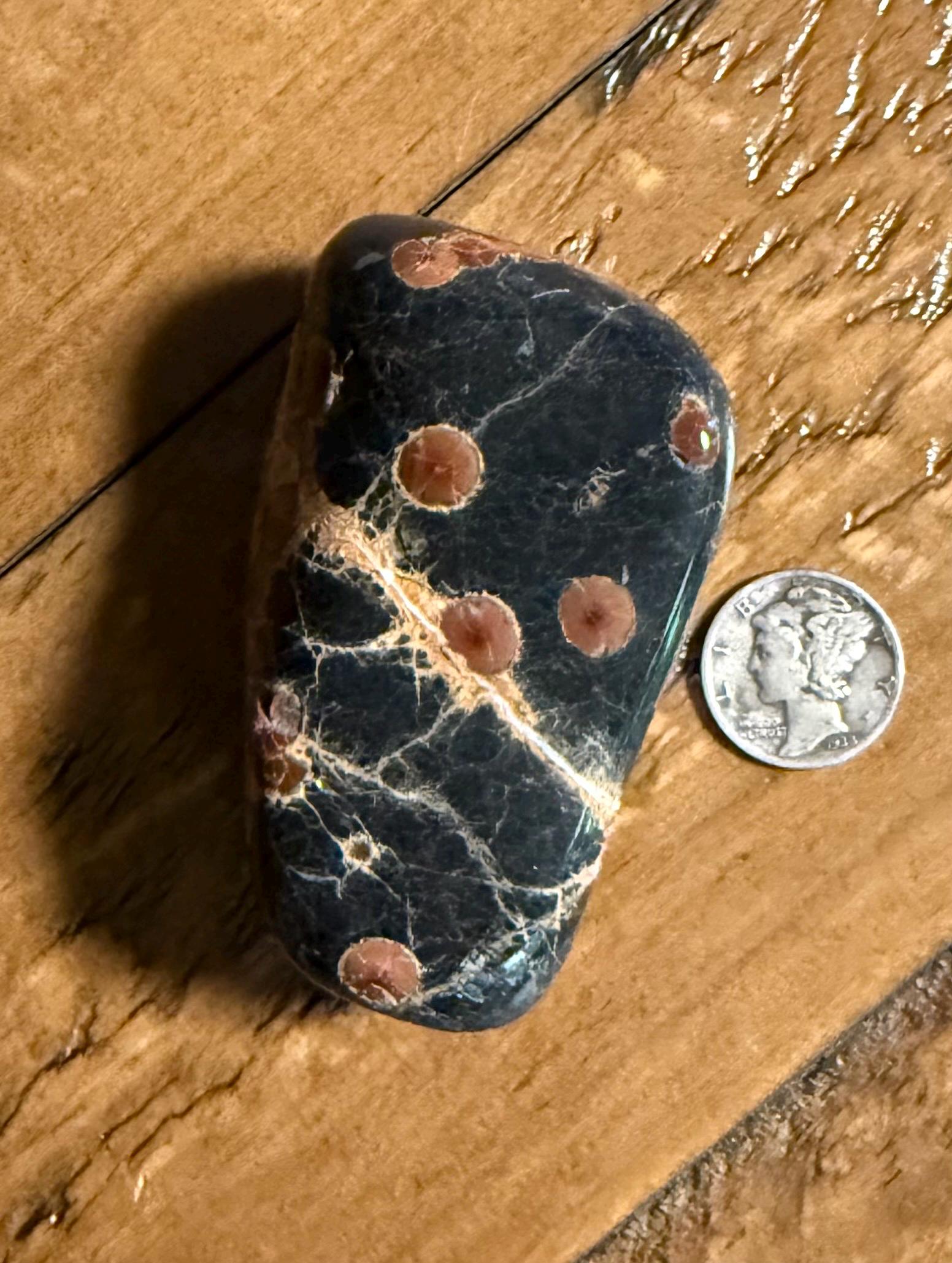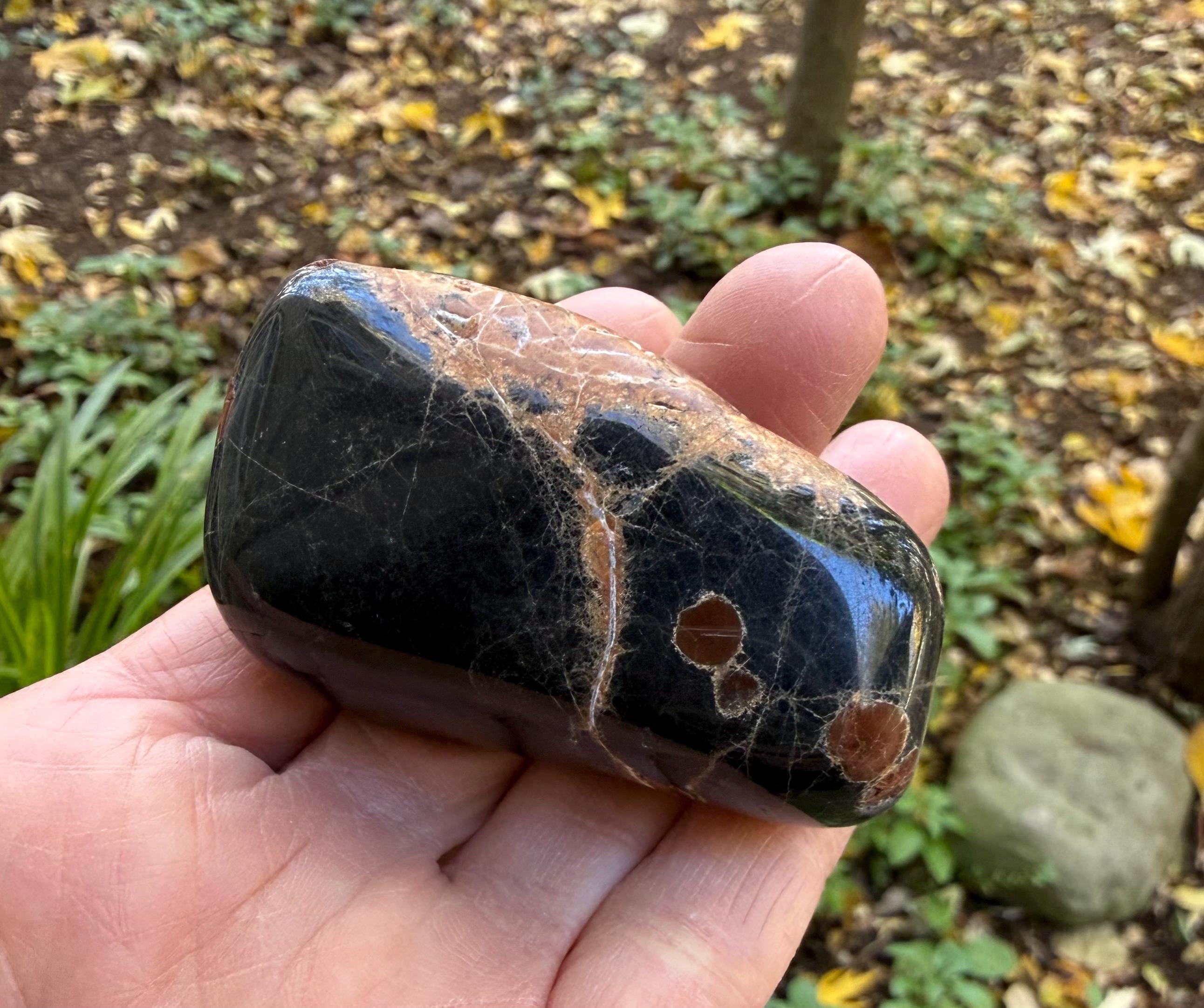 This is a very beautiful, polished Peanut Obsidian polished stone from Mexico with pitch black color and gorgeous reddish-orange orbs.