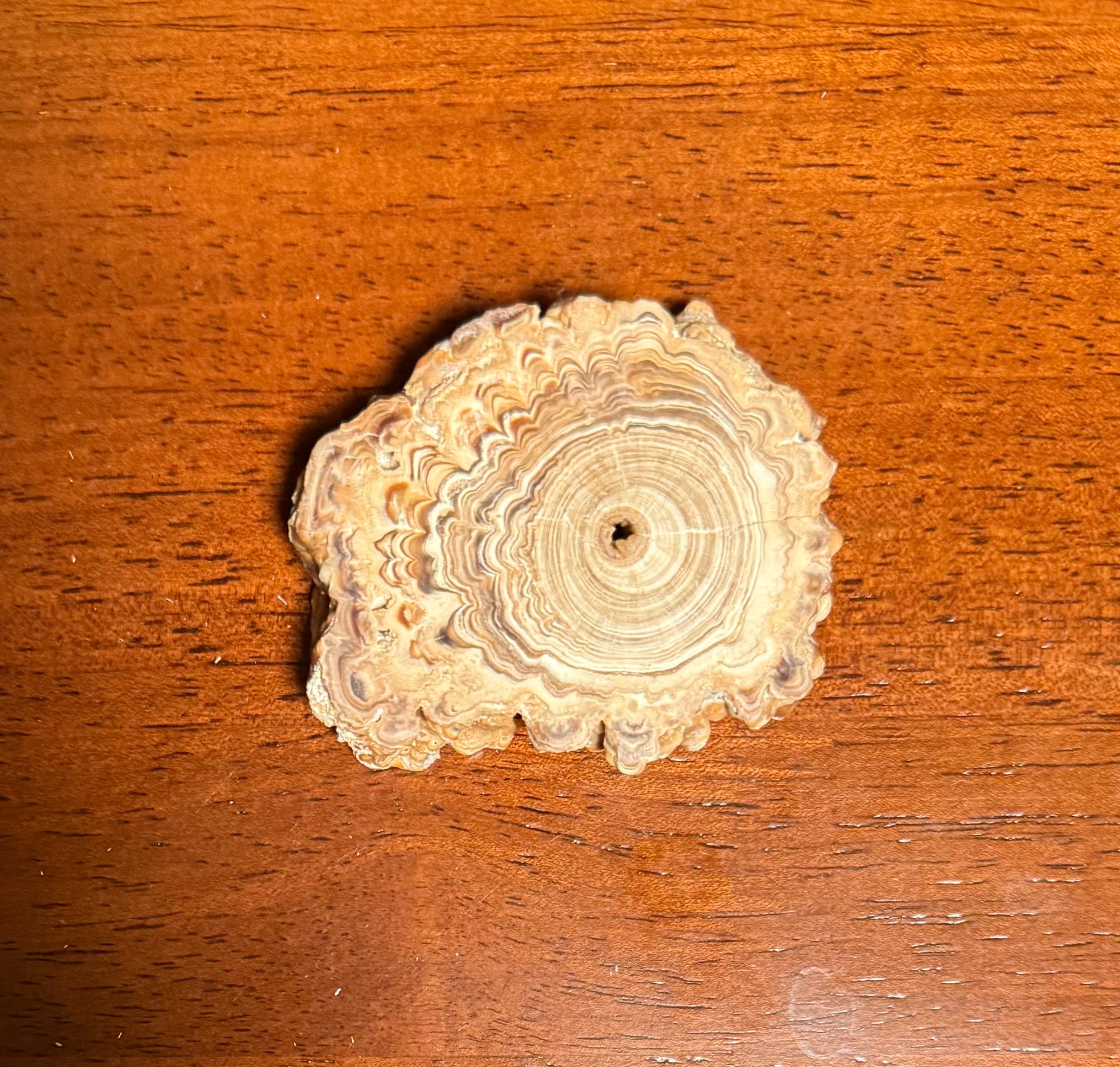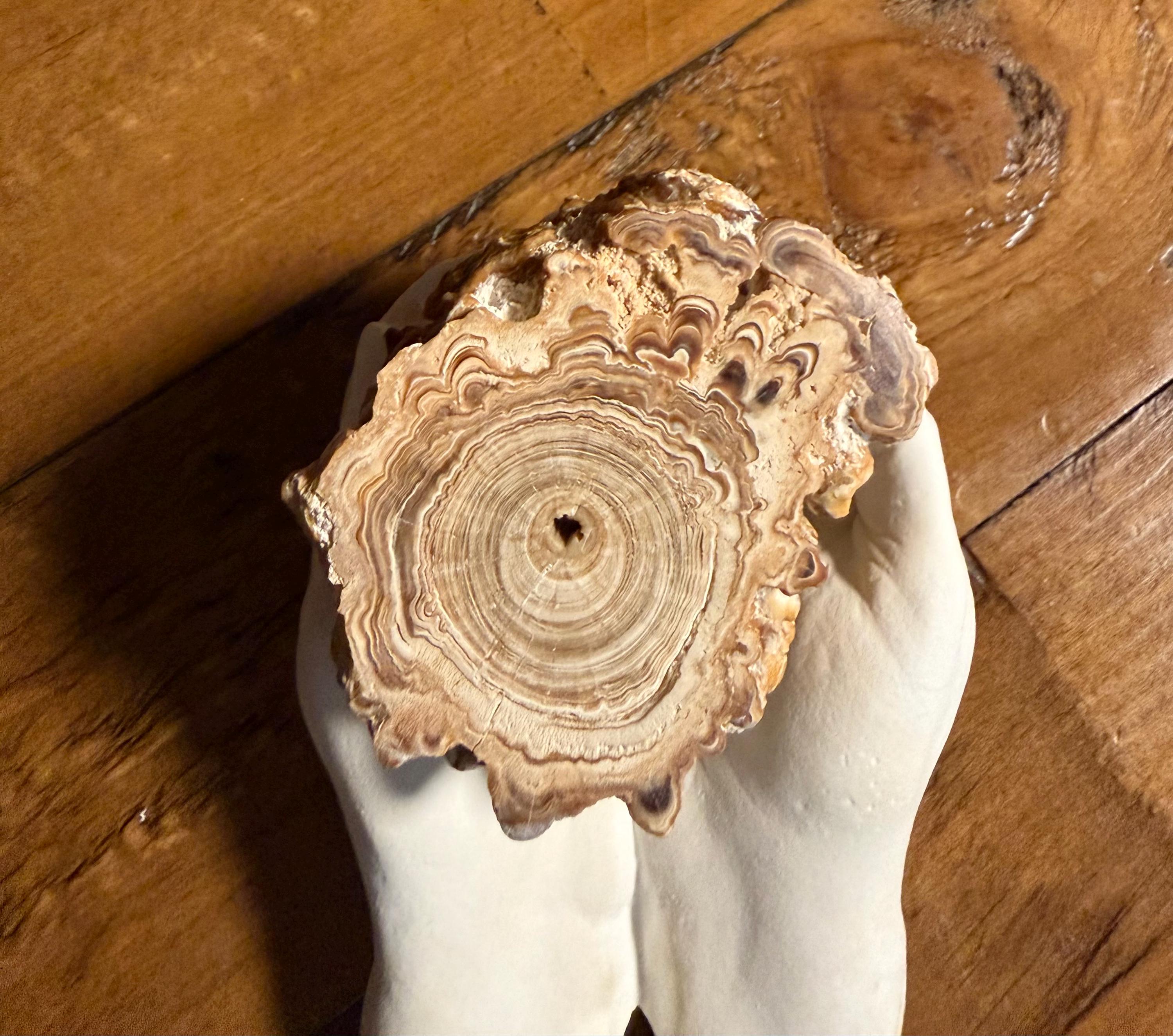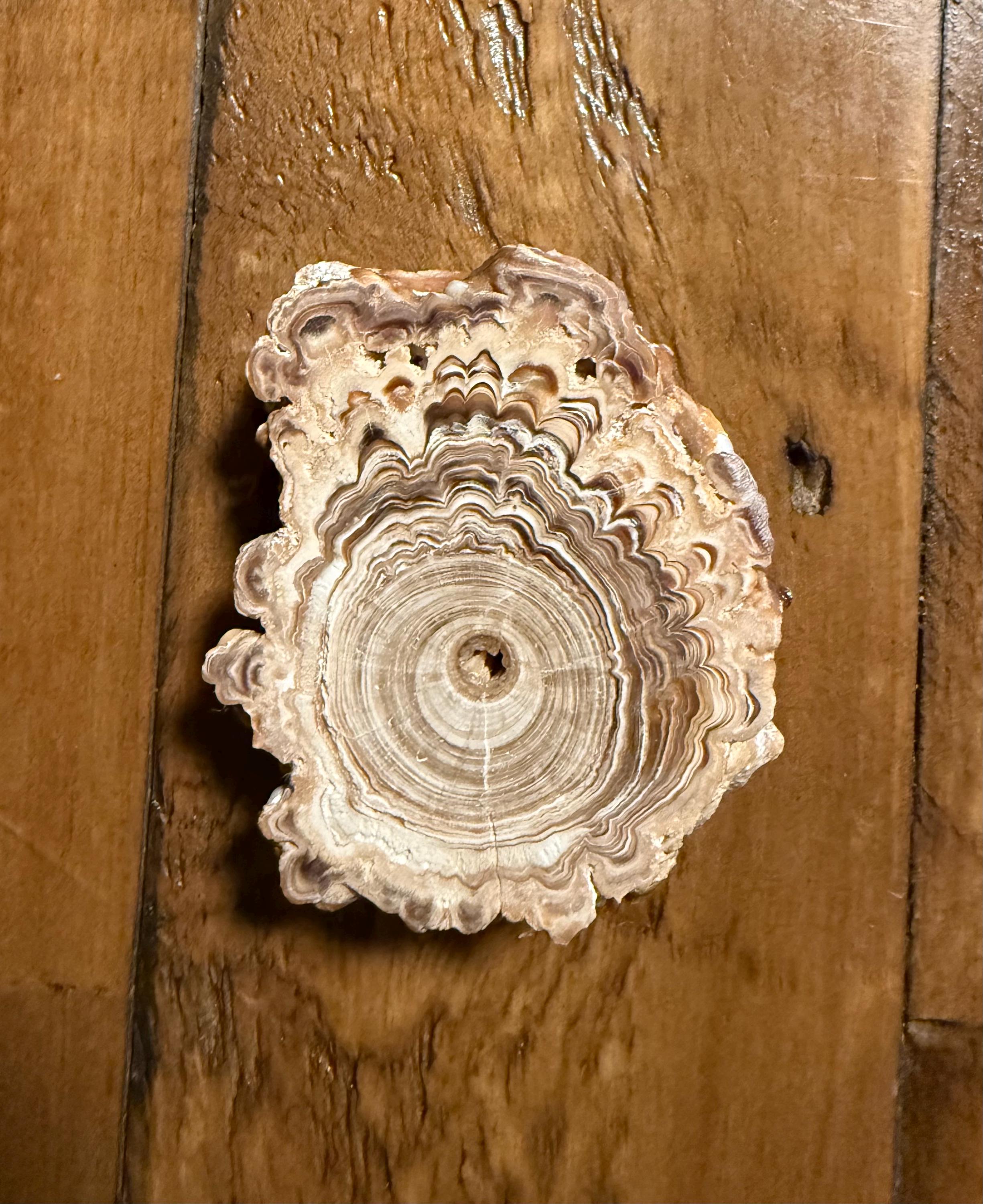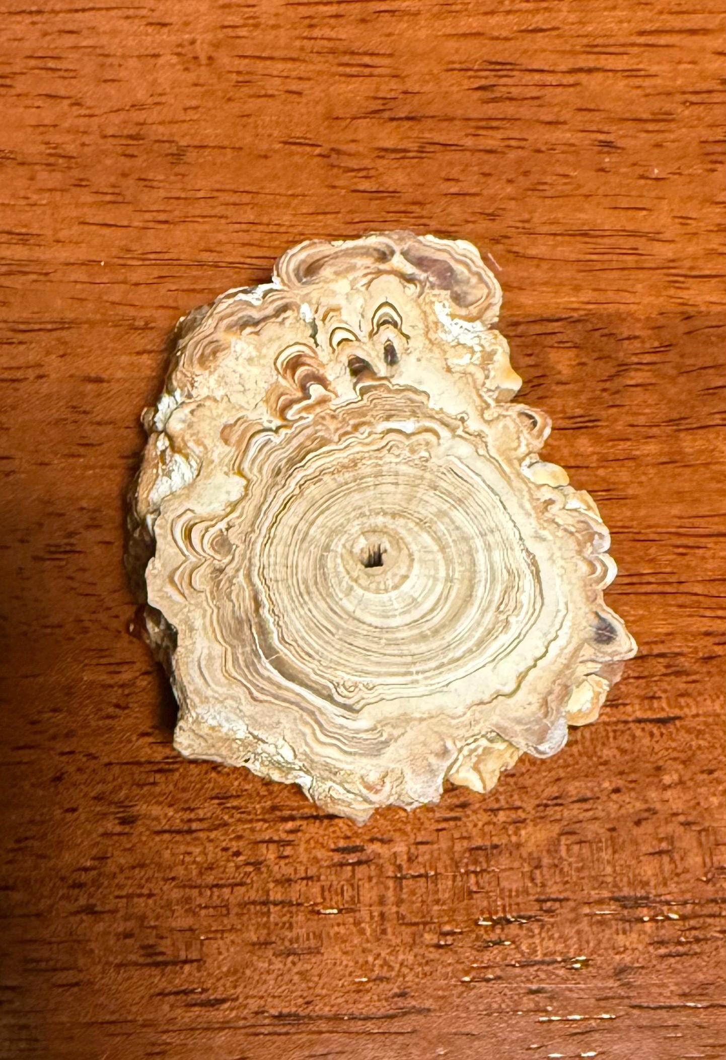 A lovely Orbicular Aragonite polished slab with banded brown and cream colors and an orbicular, wavy appearance.