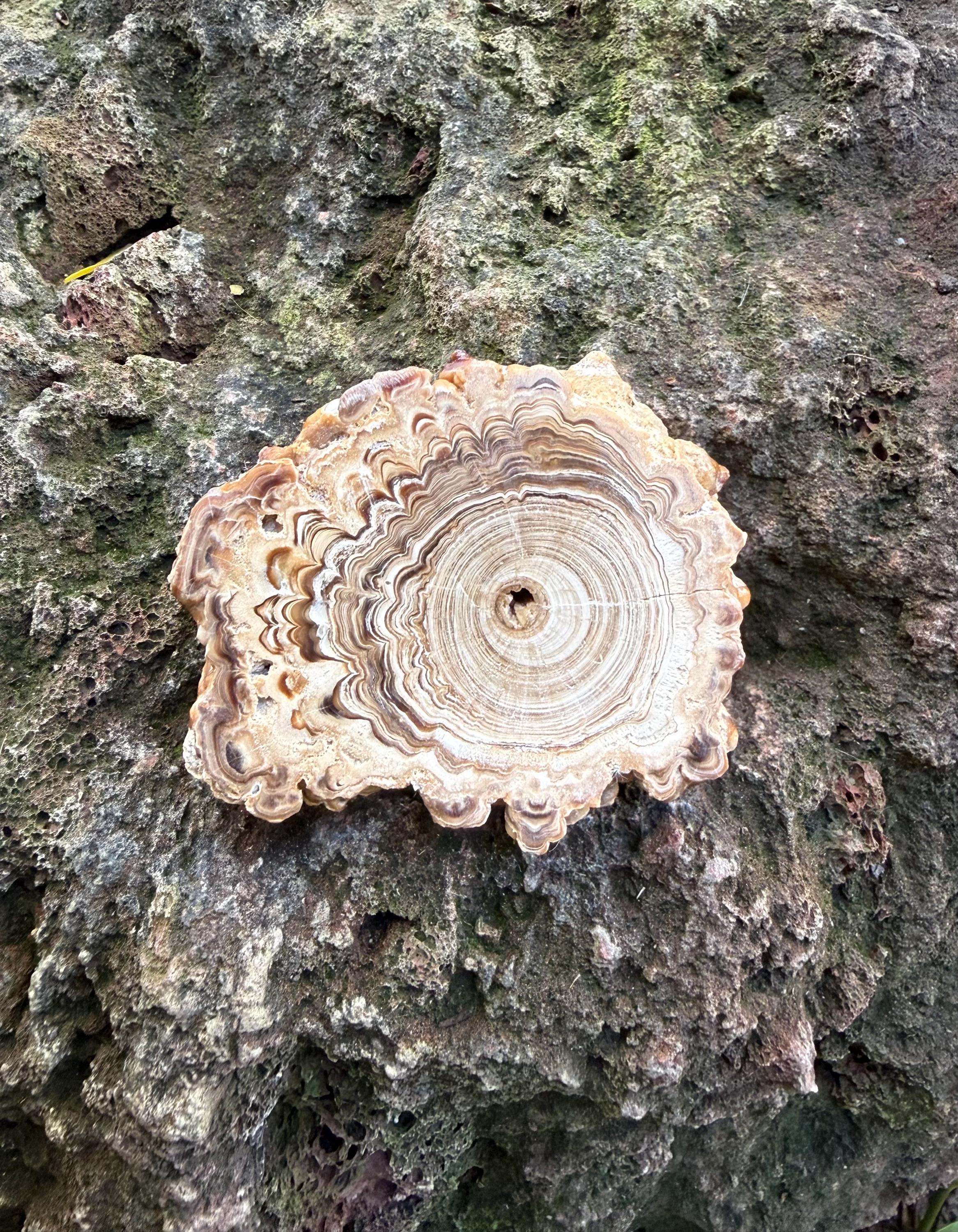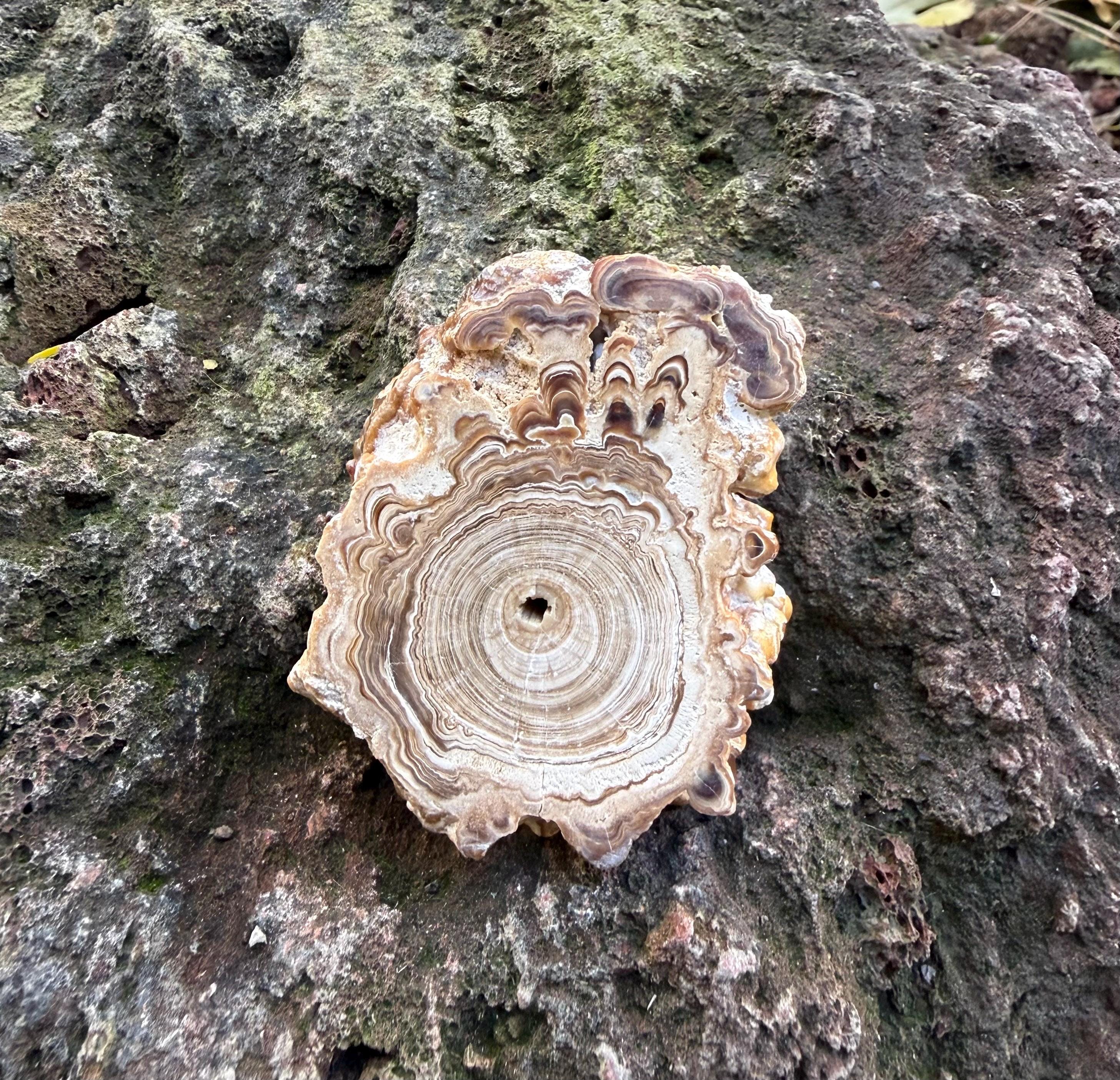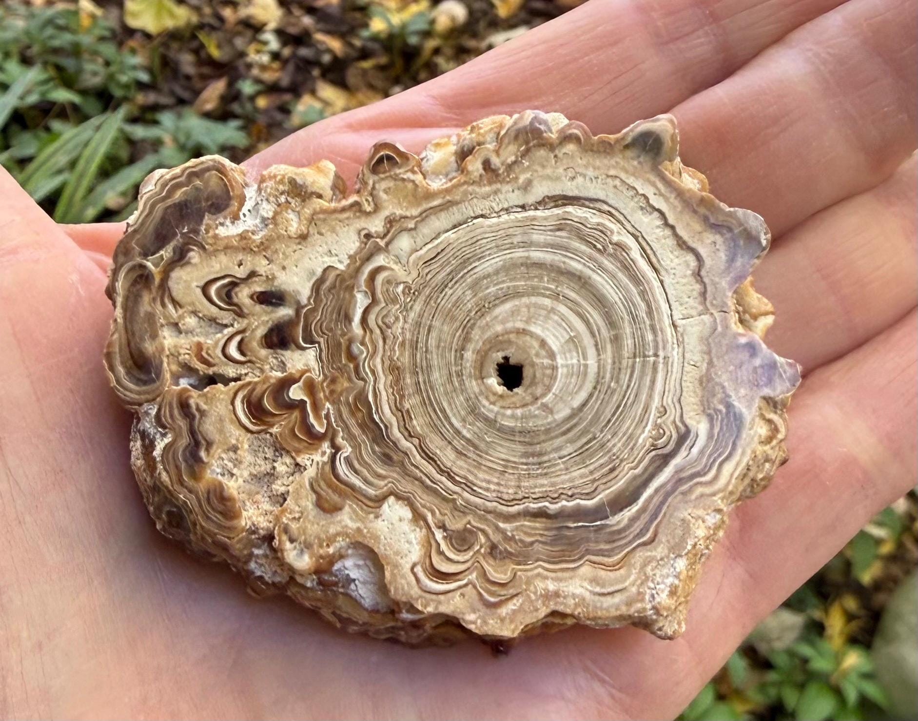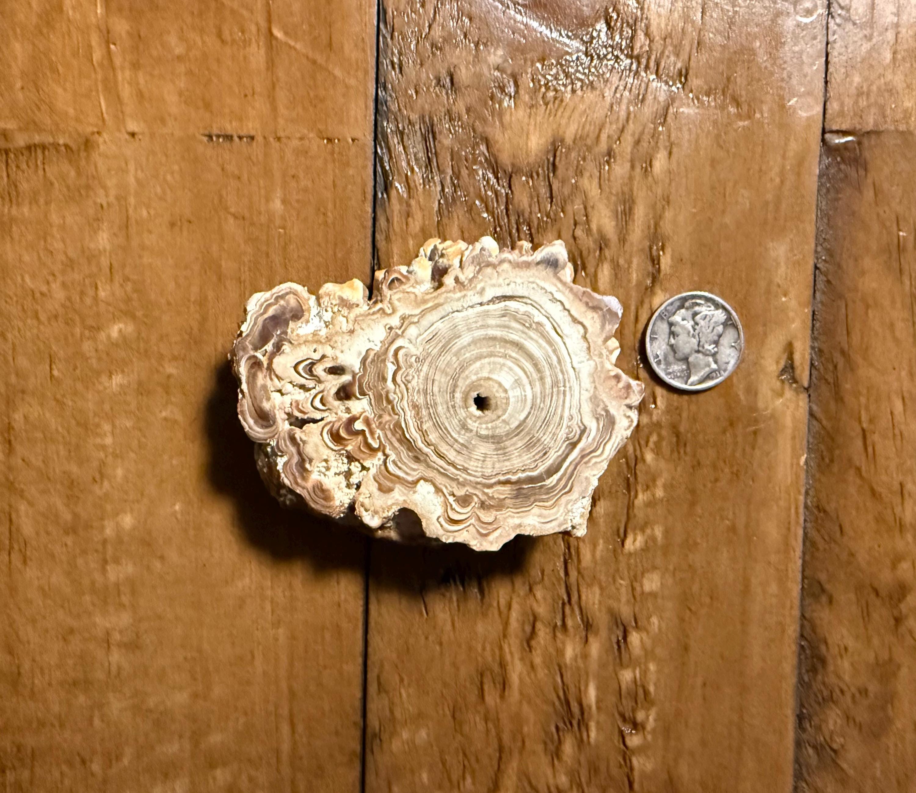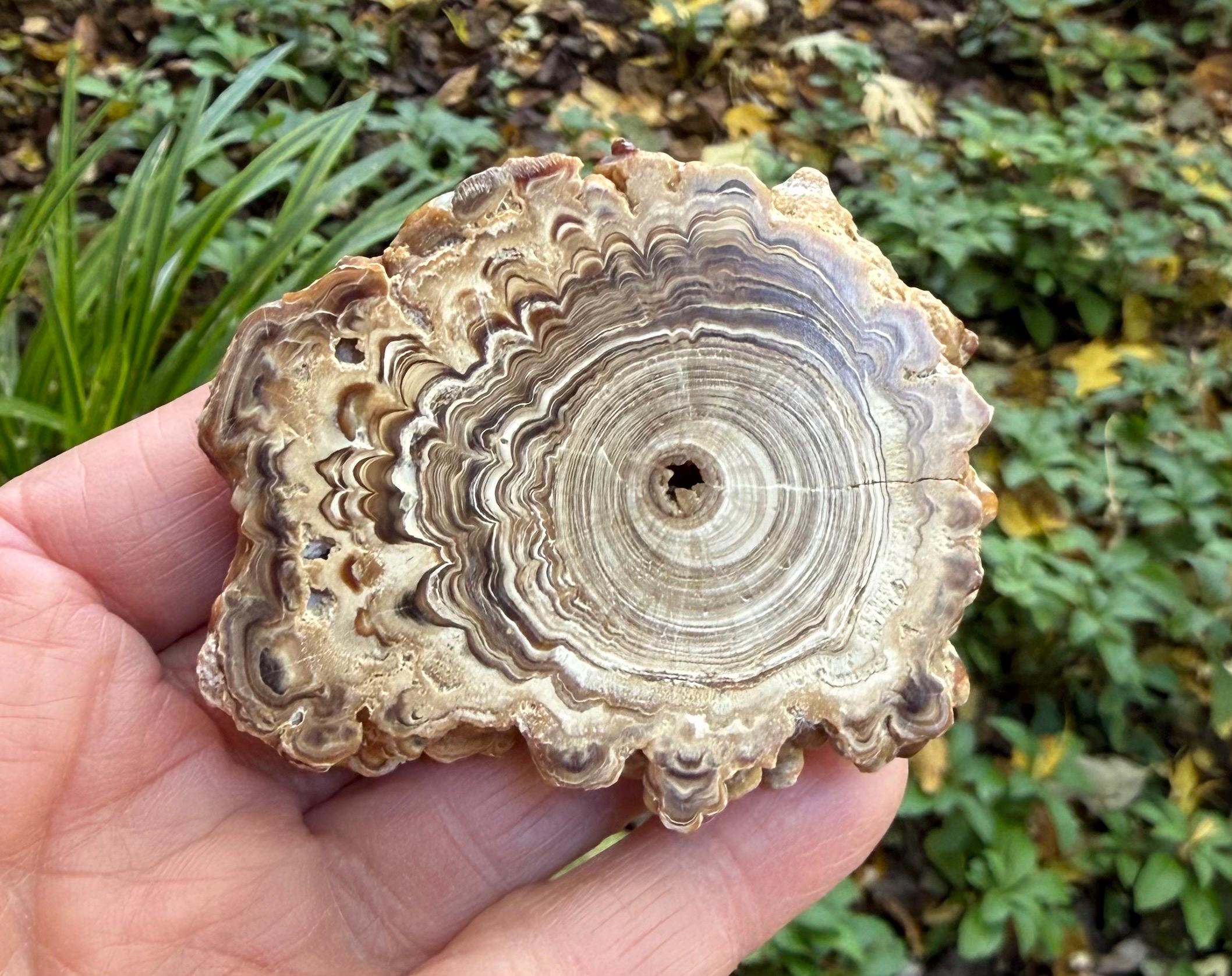 A lovely Orbicular Aragonite polished slab with banded brown and cream colors and an orbicular, wavy appearance.