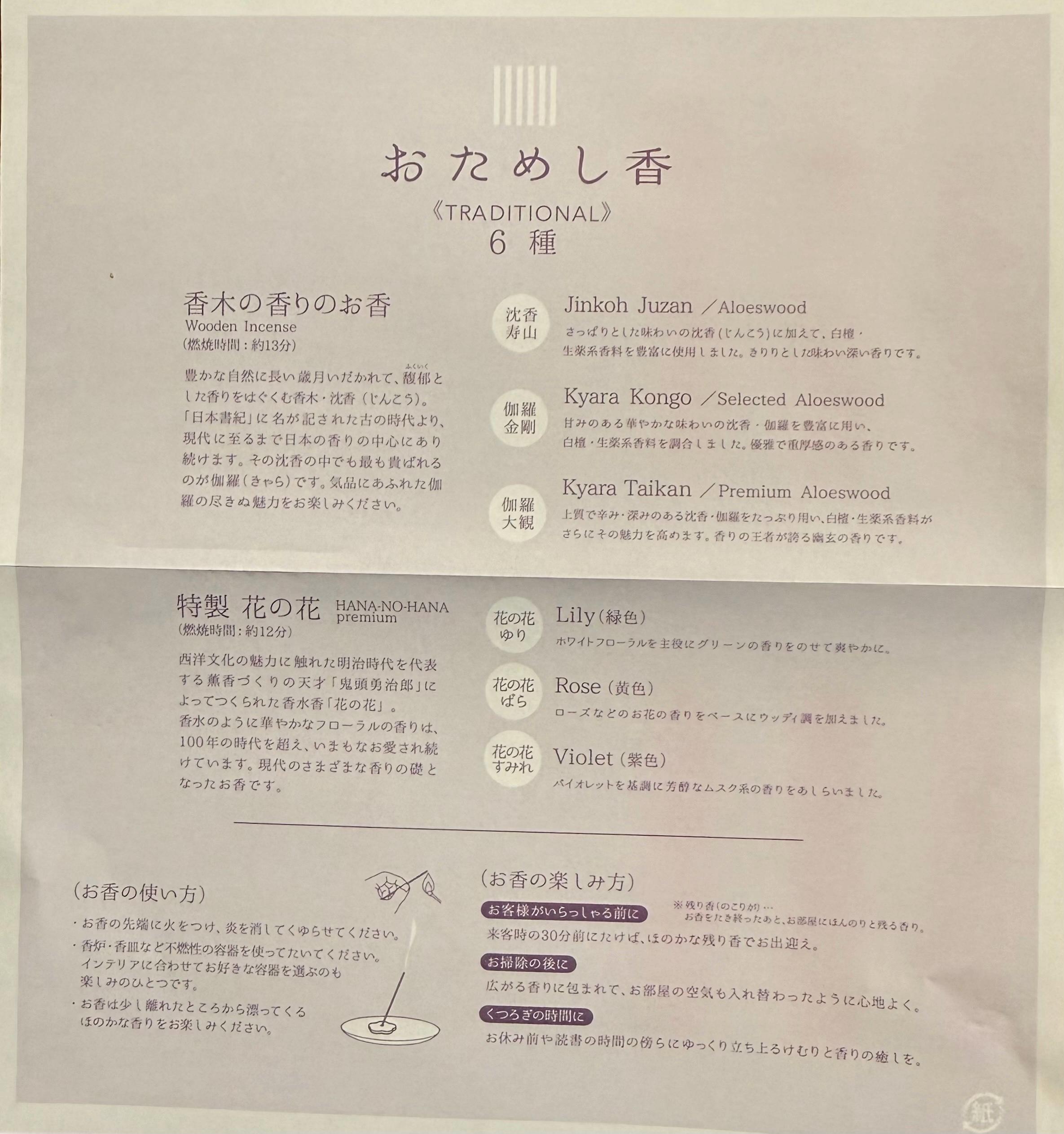 Passed down since the fifteenth century, 香の十徳 - the "Ten Virtues of Koh" - lists the benefits of using incense. The list is still cited today for its unique appreciation of the spirit of incense.