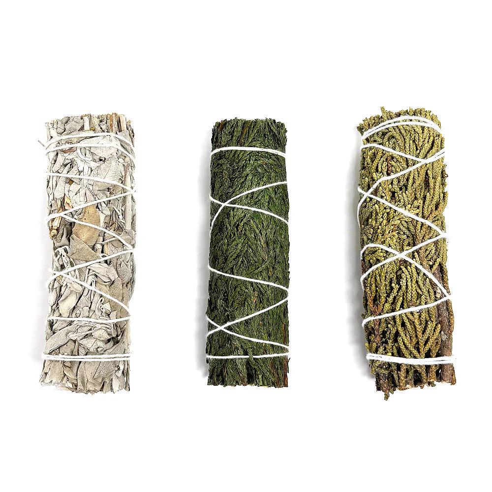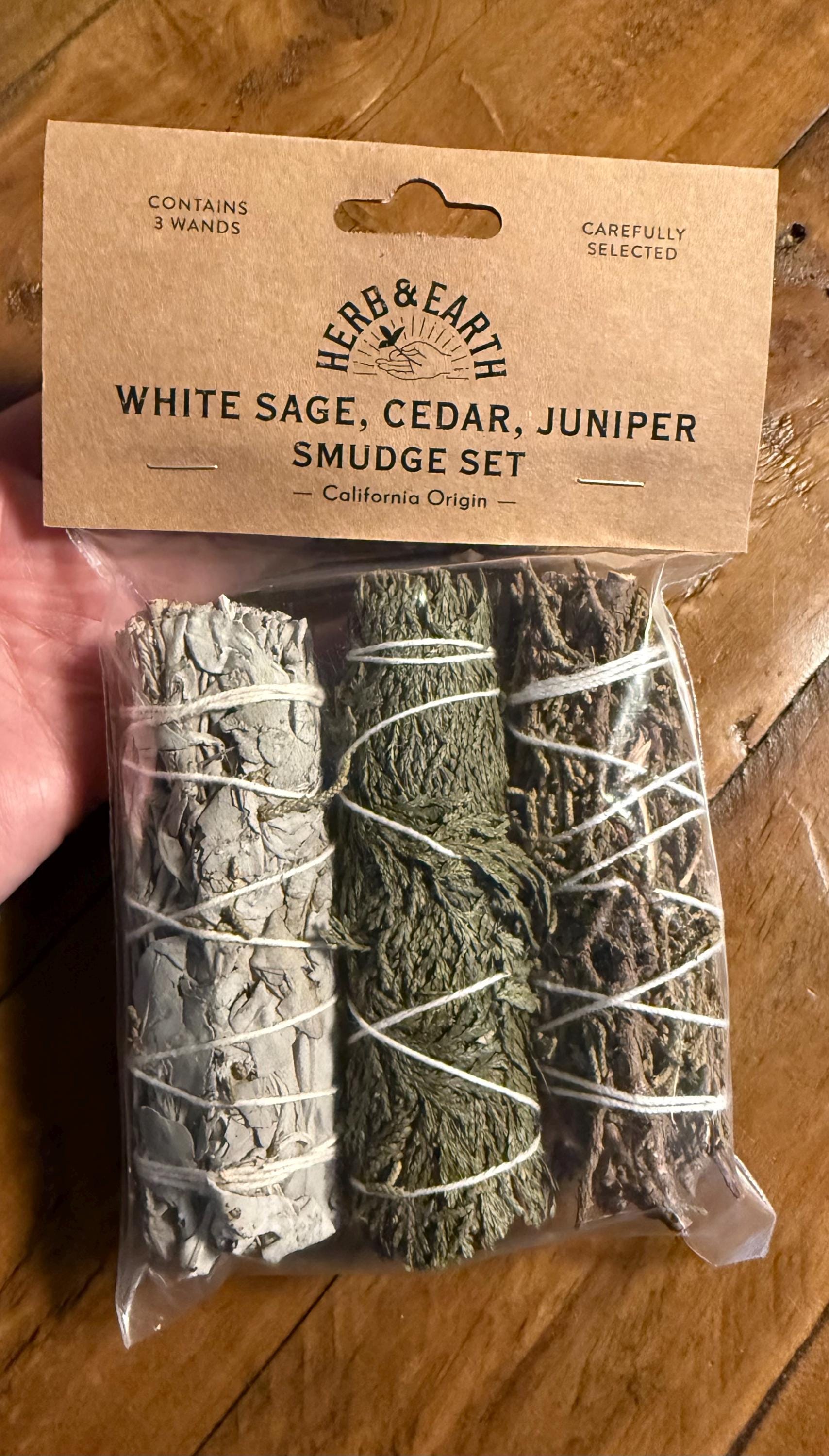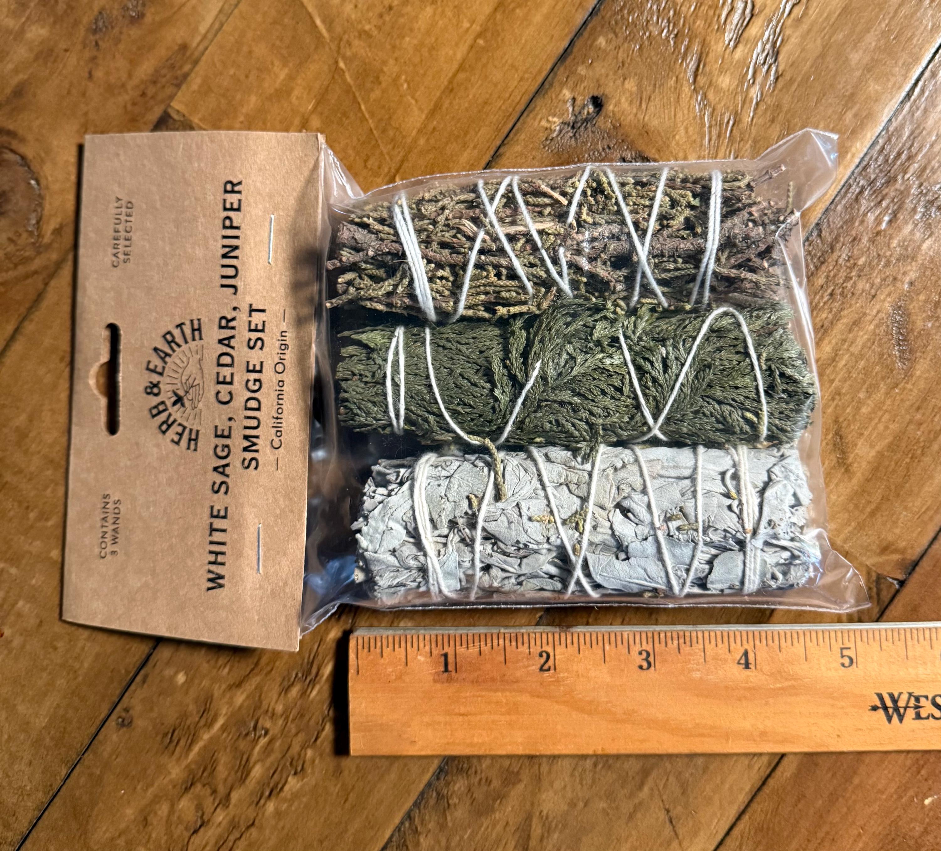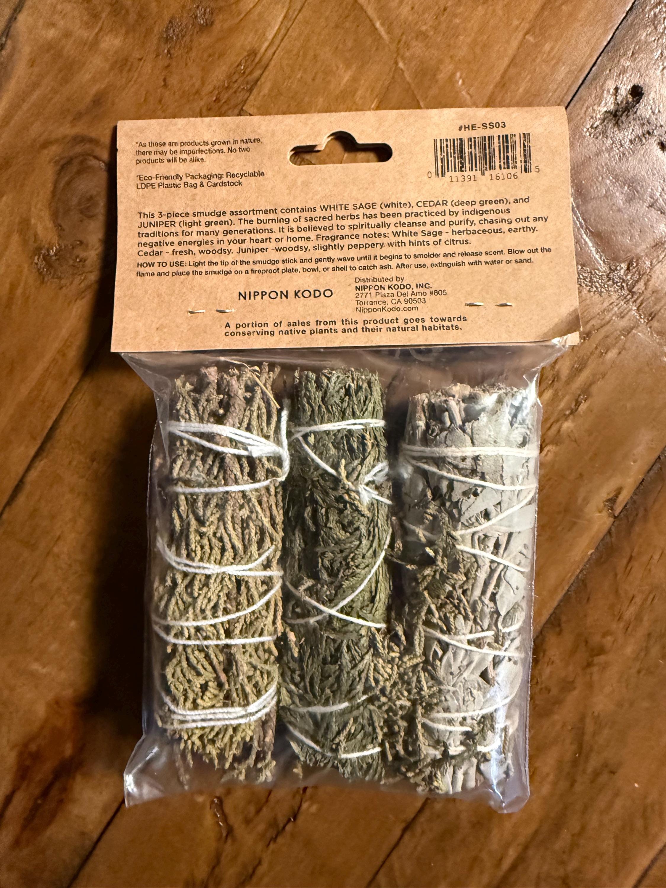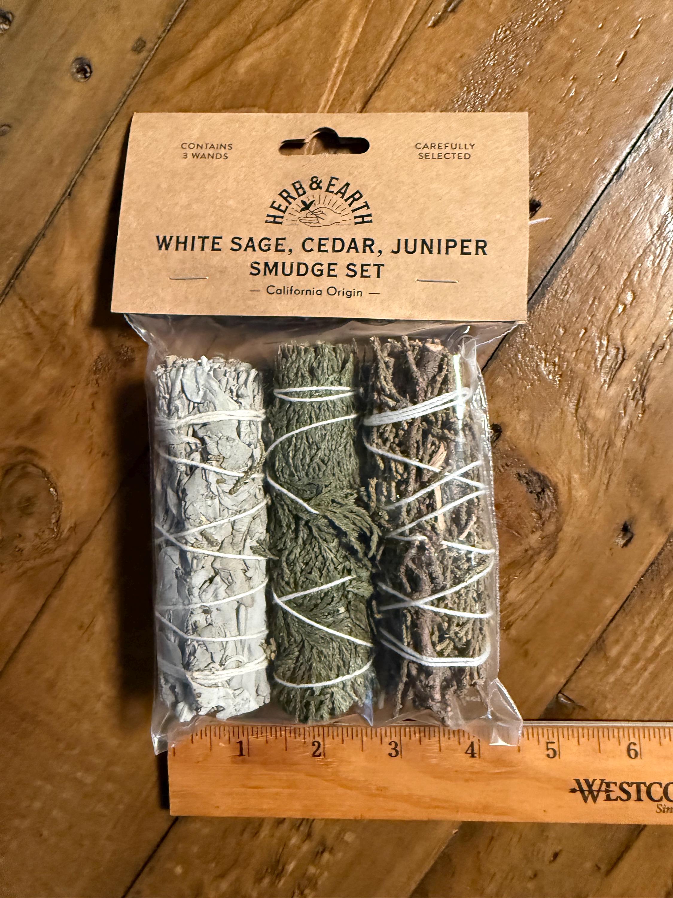 This 3-piece smudge assortment contains WHITE SAGE, CEDAR, and JUNIPER.