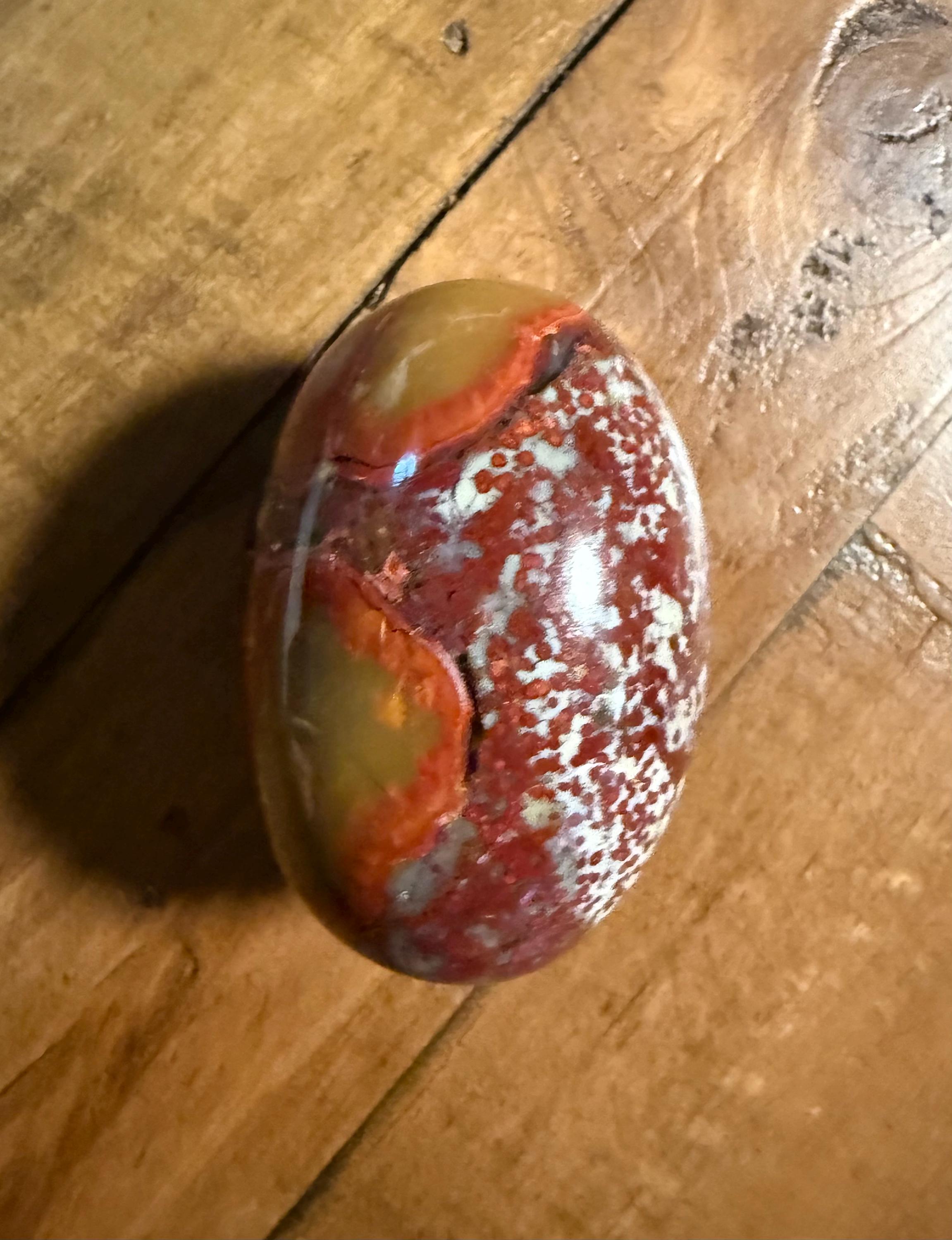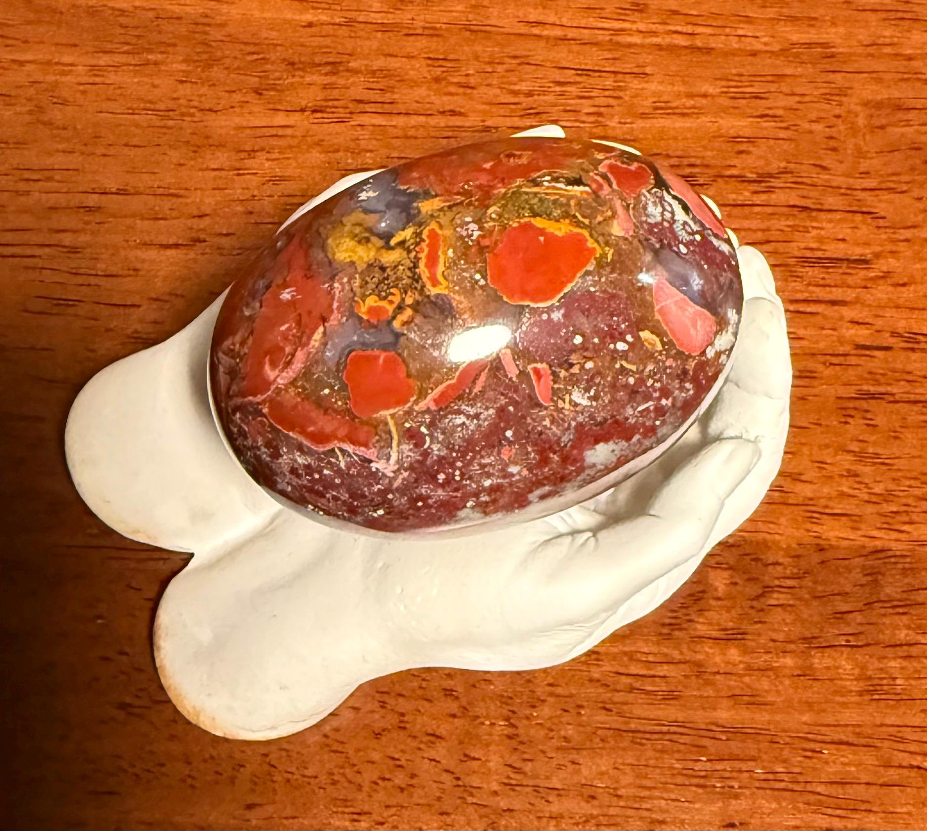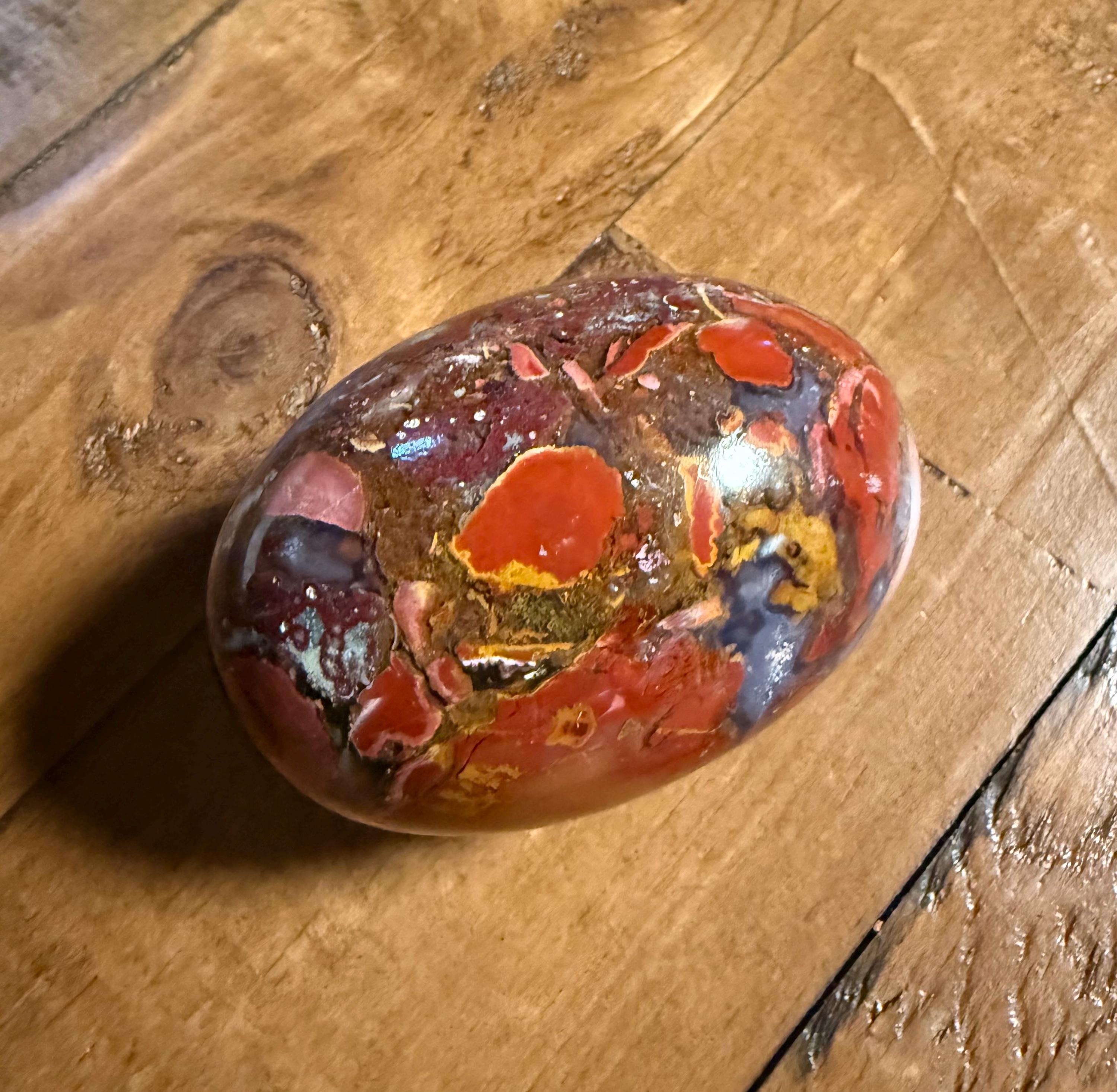 Beautifully colored and patterned, a truly breathtaking King Cobra Jasper, polished, with rich colors of orange, red, gold, blue, and burgundy.