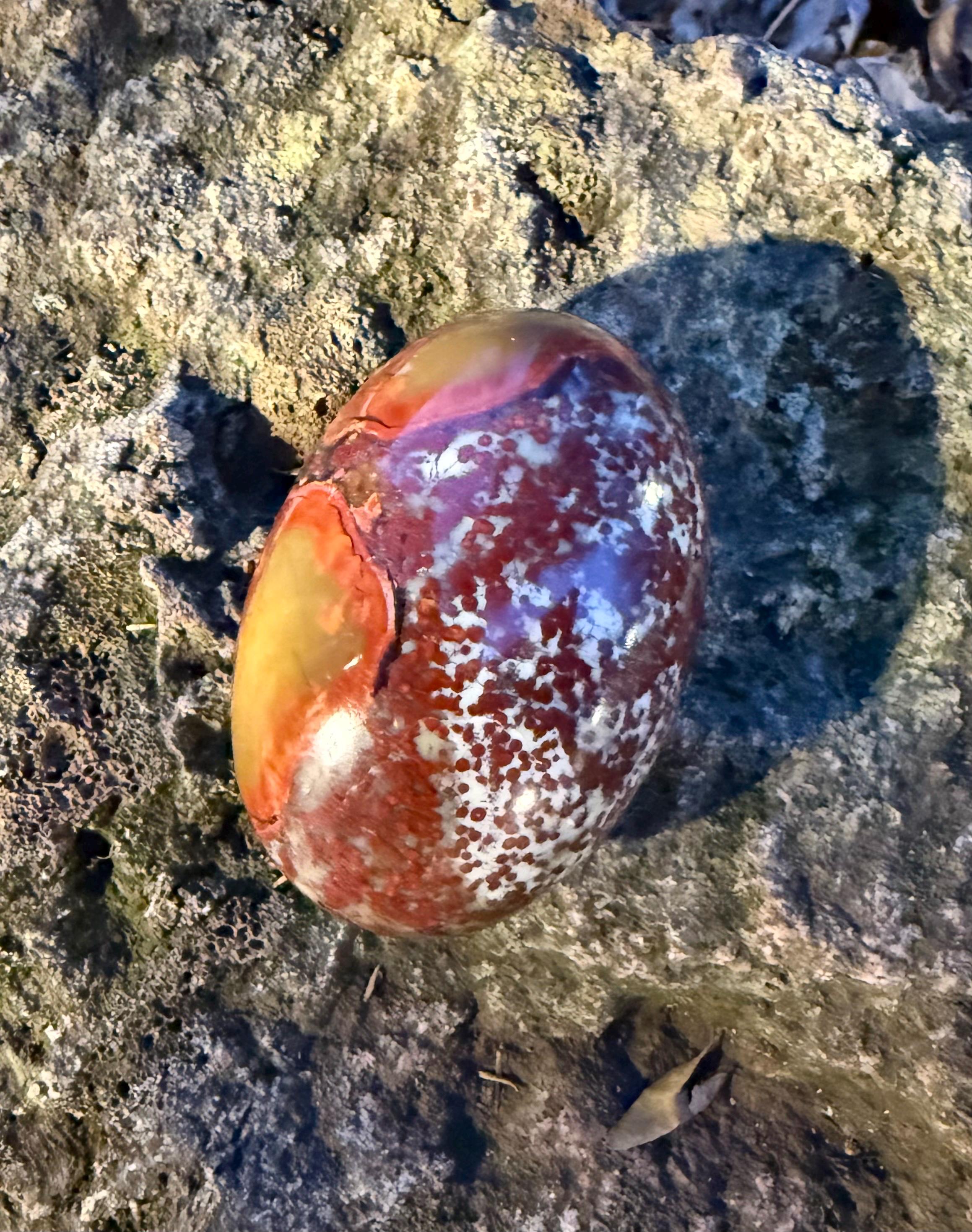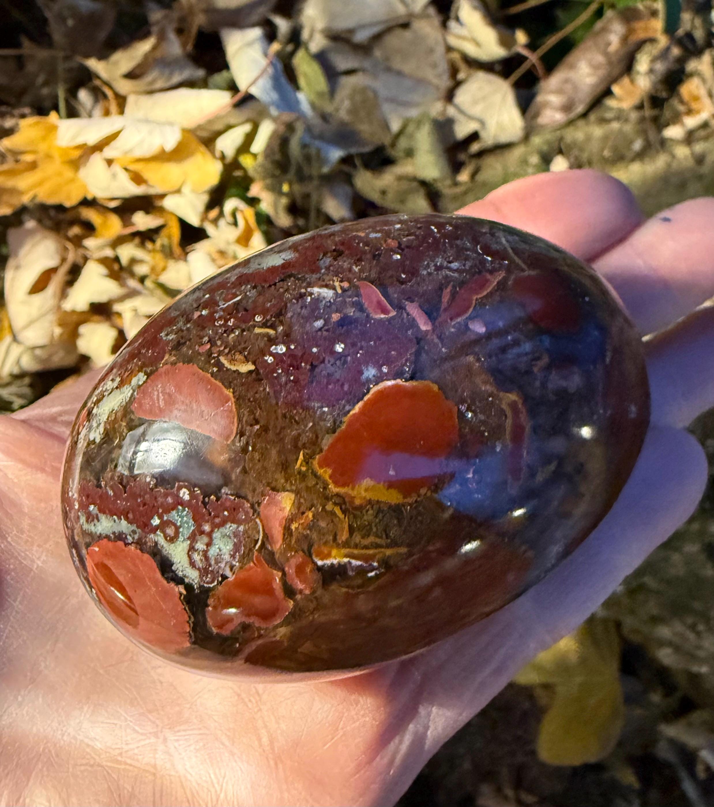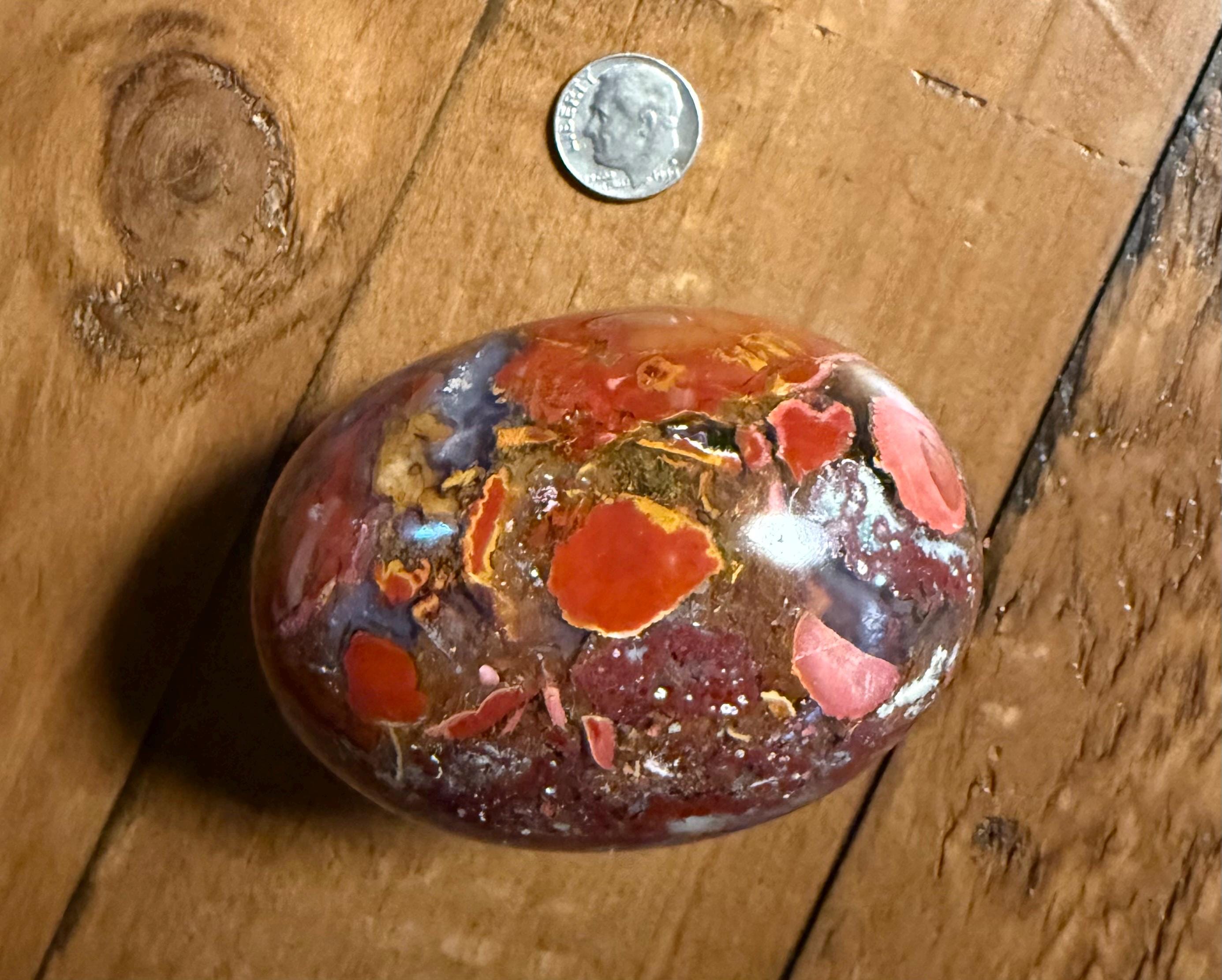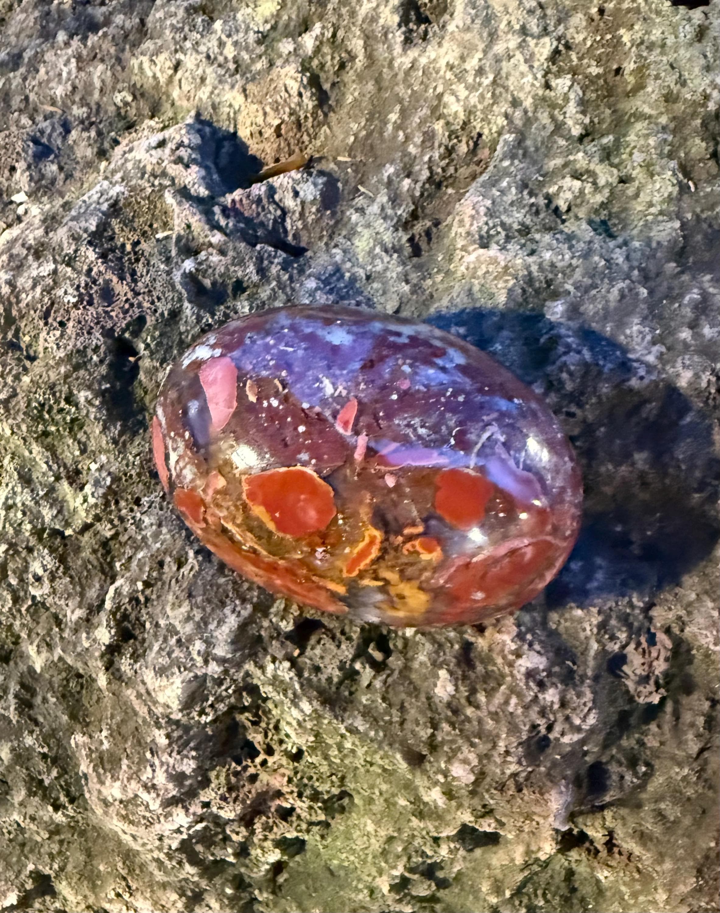 Beautifully colored and patterned, a truly breathtaking King Cobra Jasper, polished, with rich colors of orange, red, gold, blue, and burgundy.