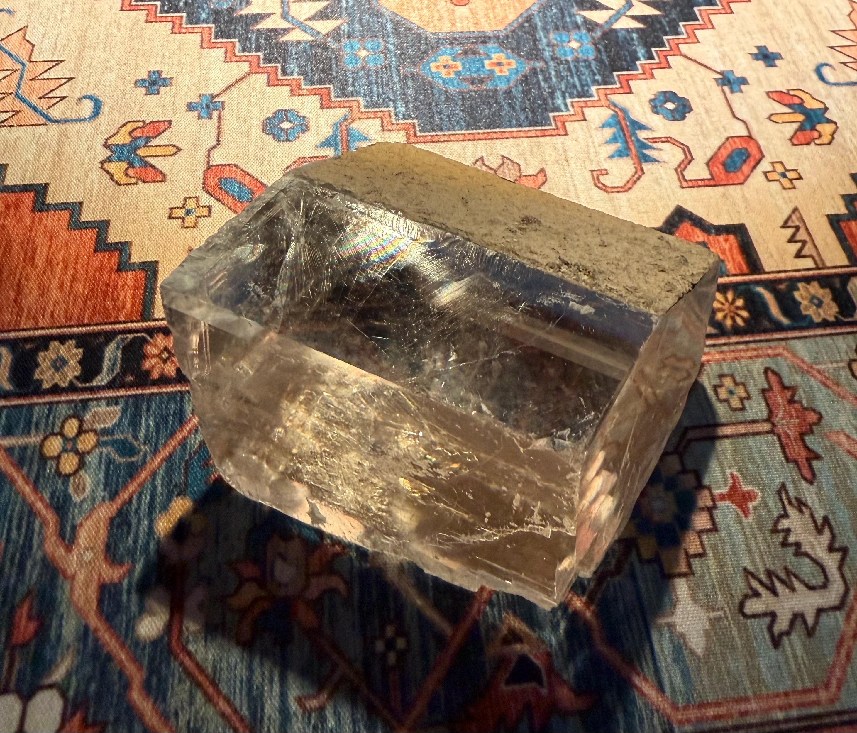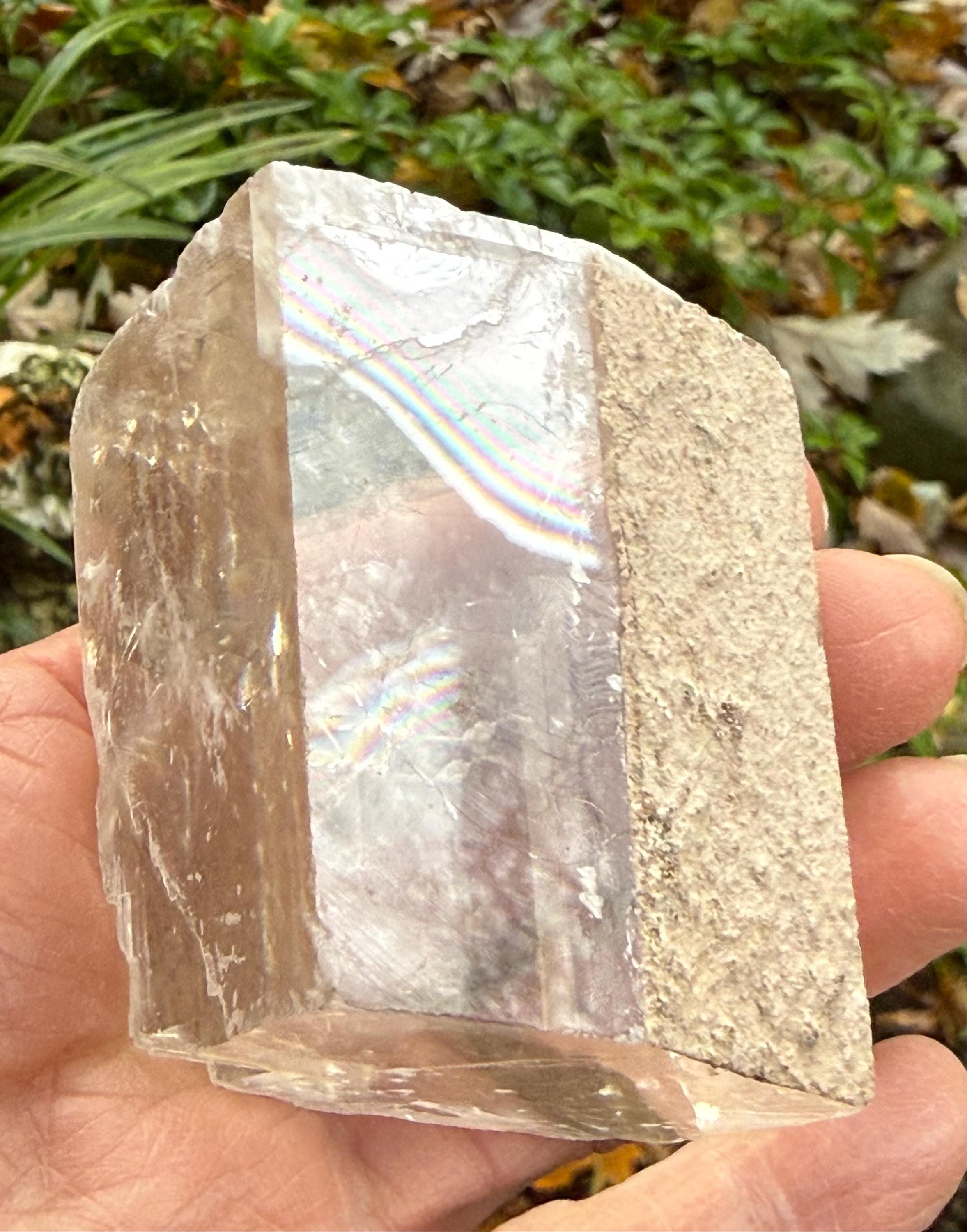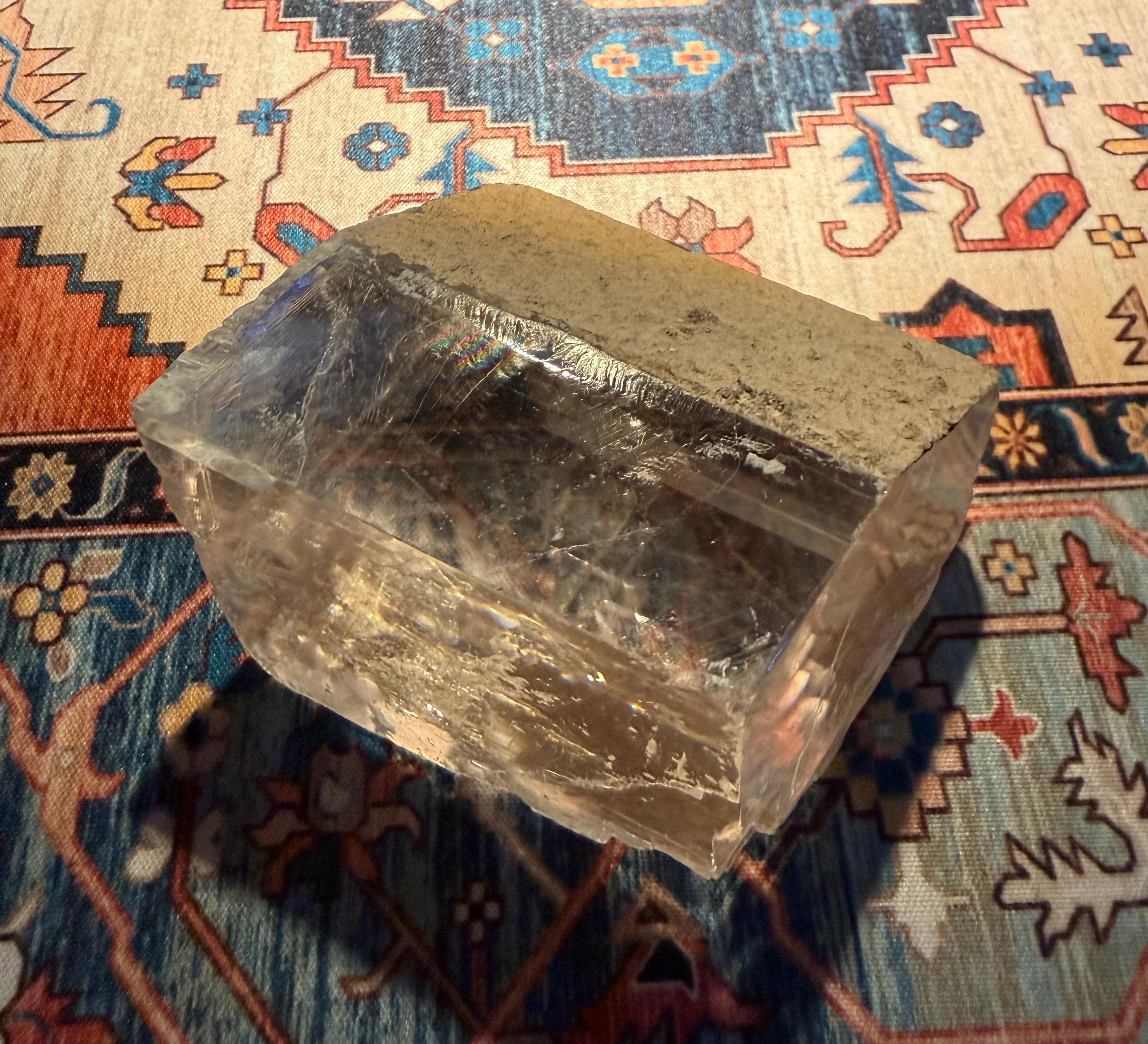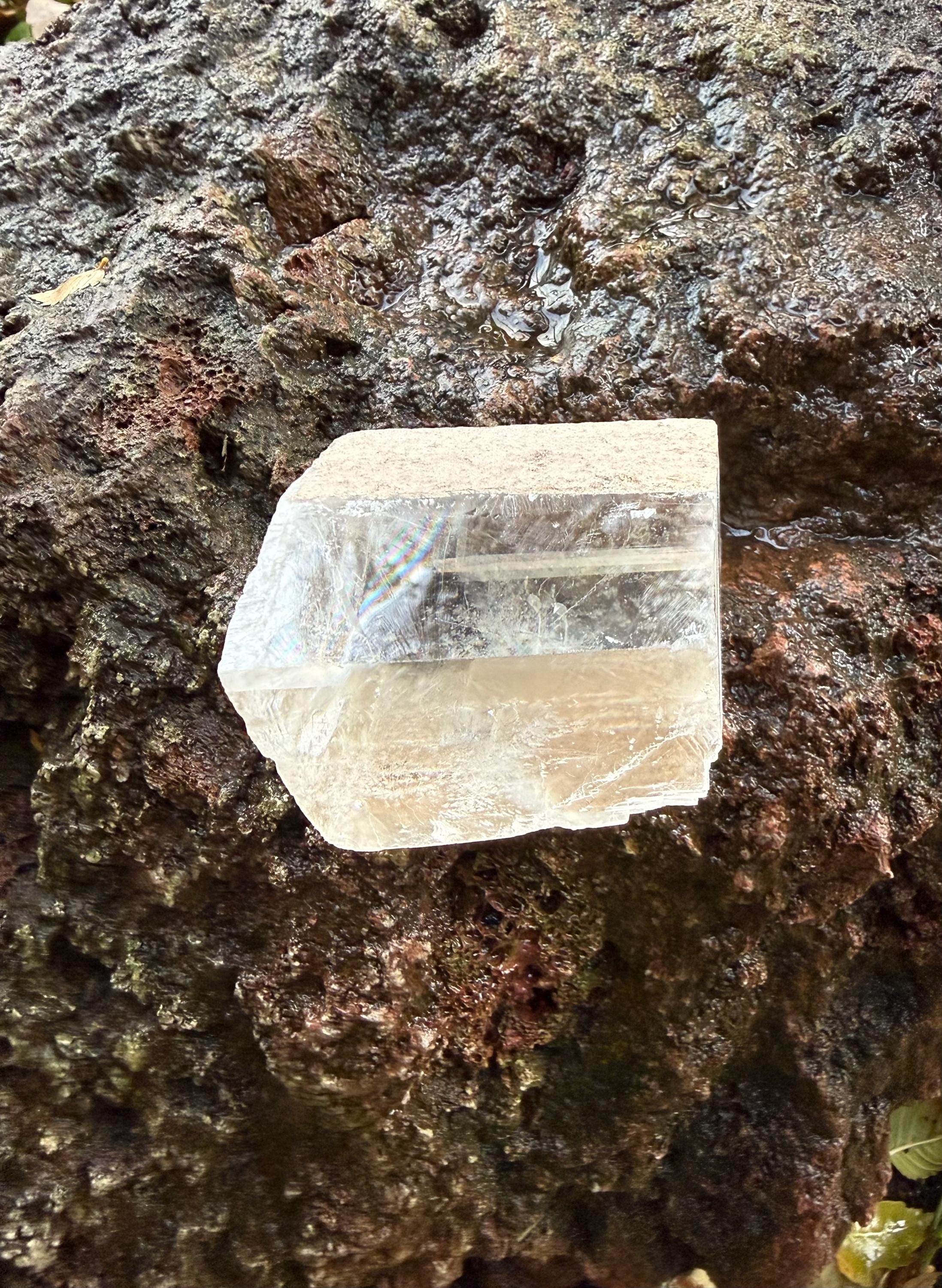 A beautifully clear and RAW Optical Calcite, aka Viking Sunstone, with gorgeous rainbow iridescence and rare matrix on one side.