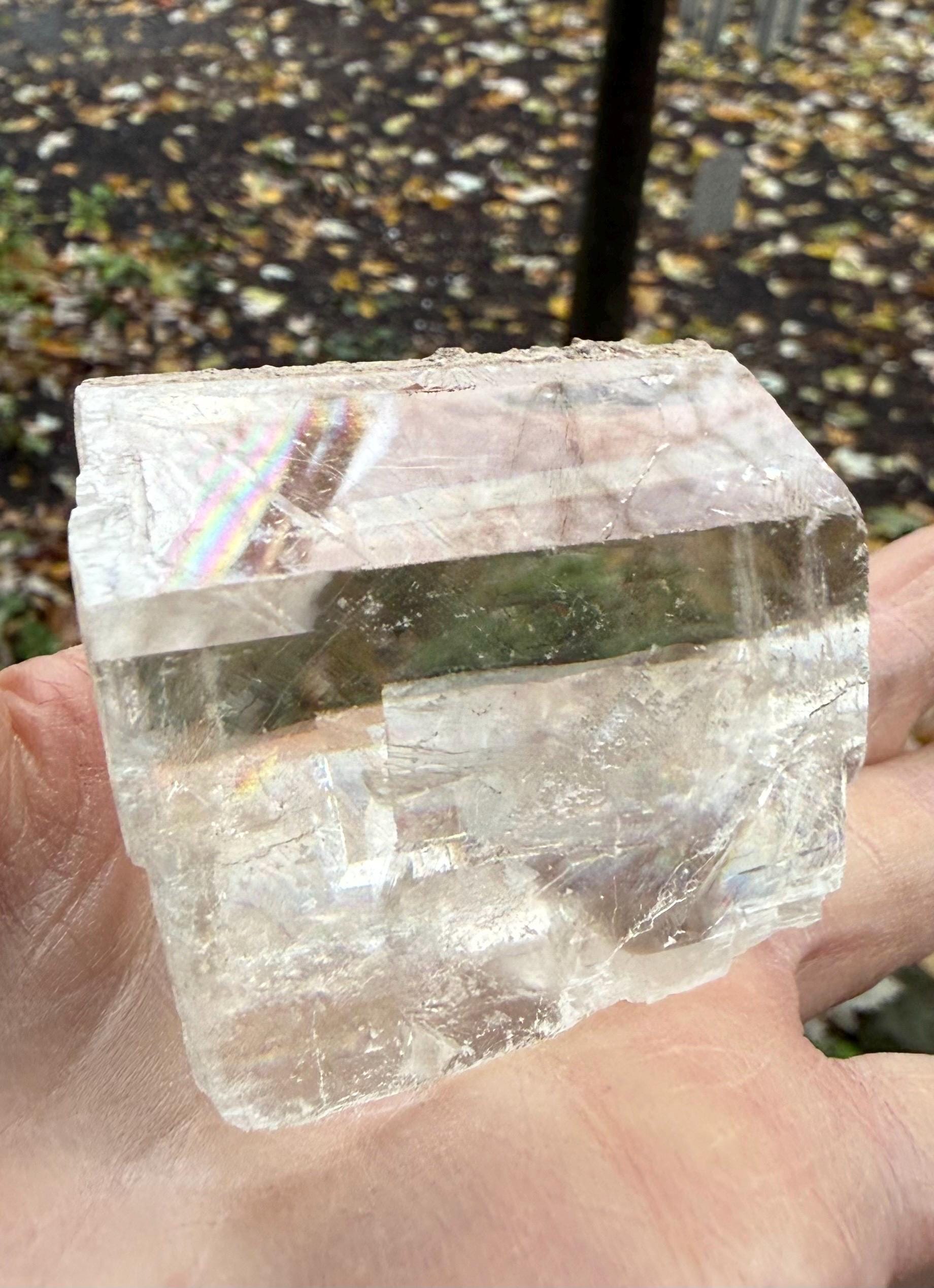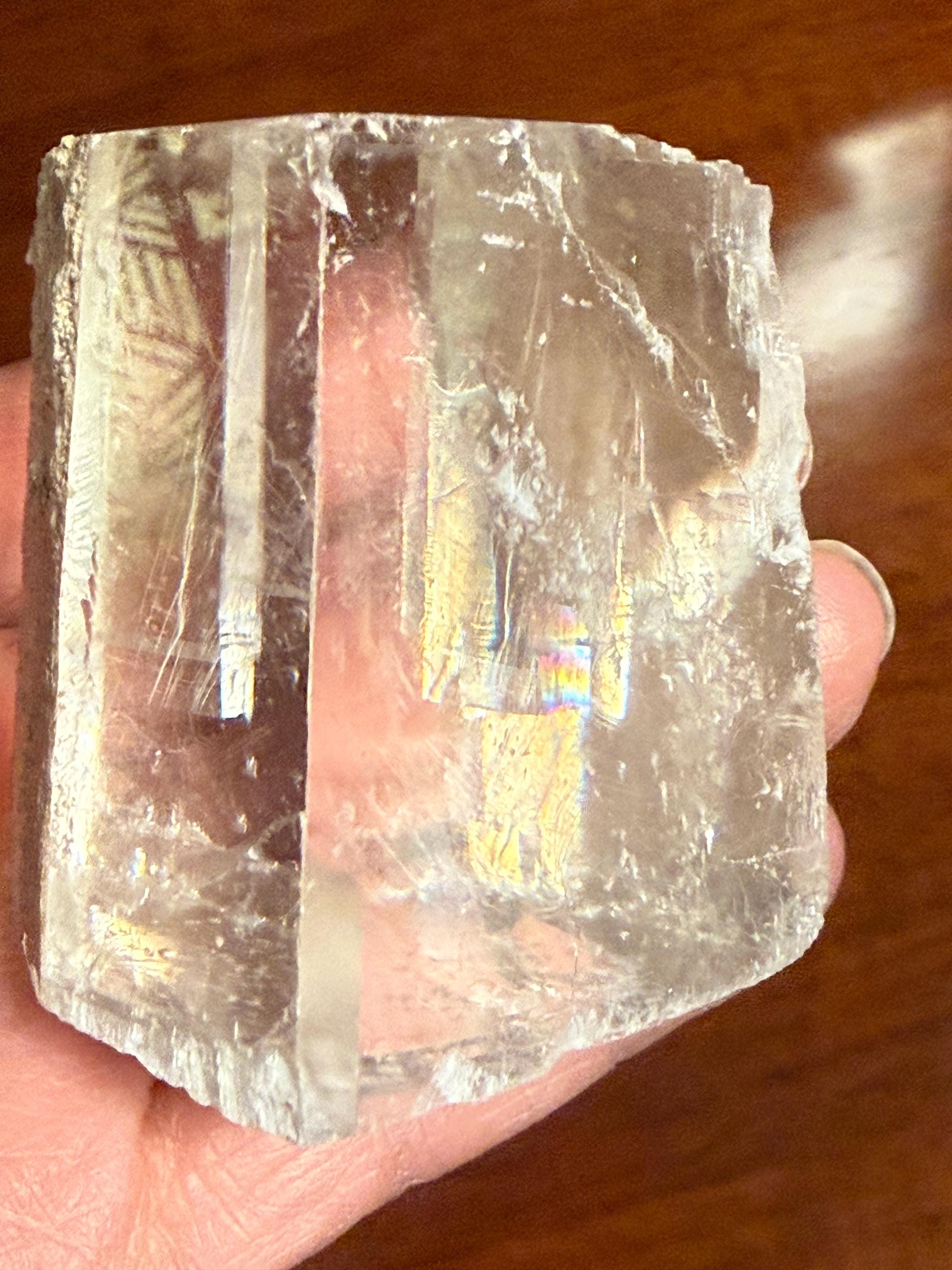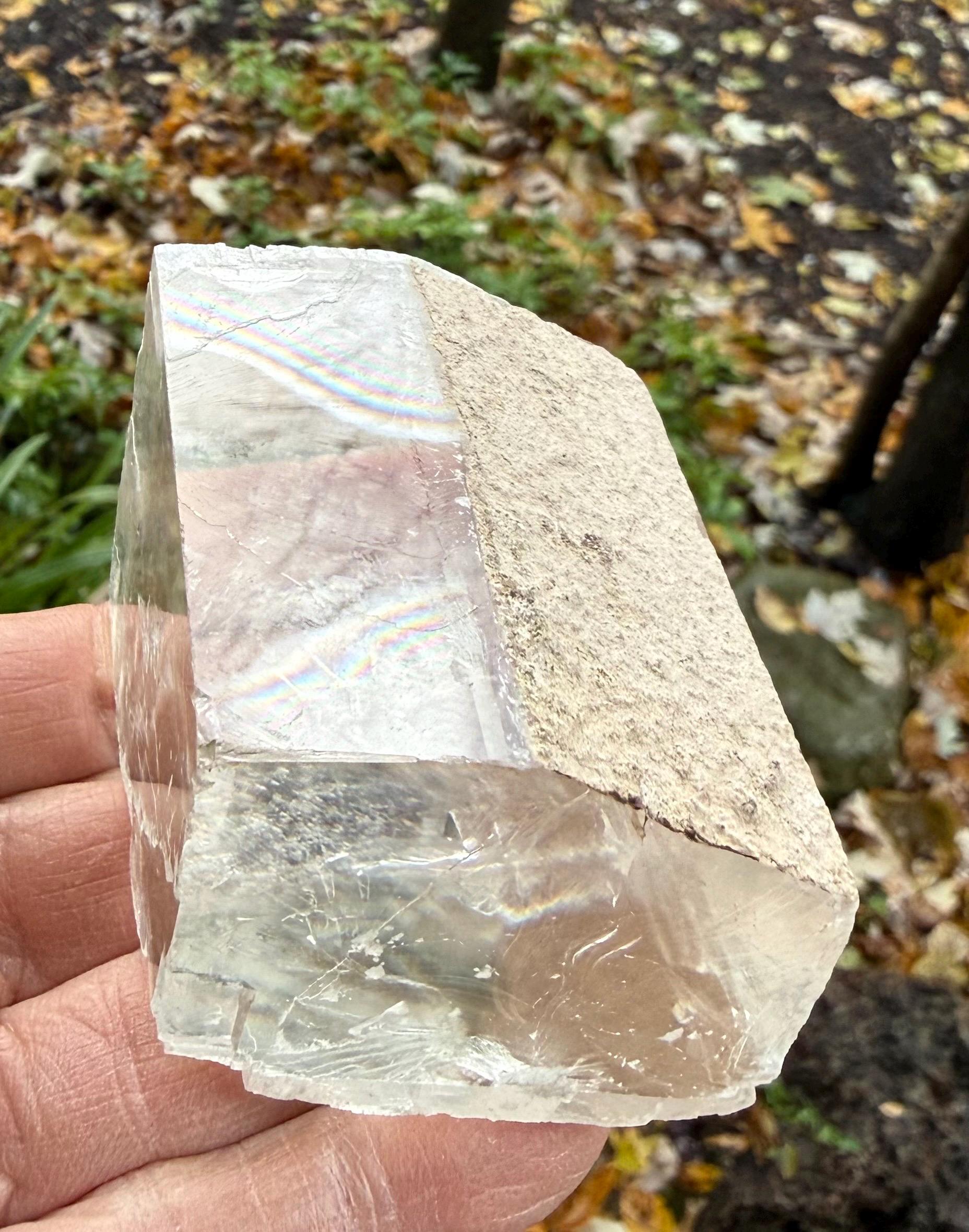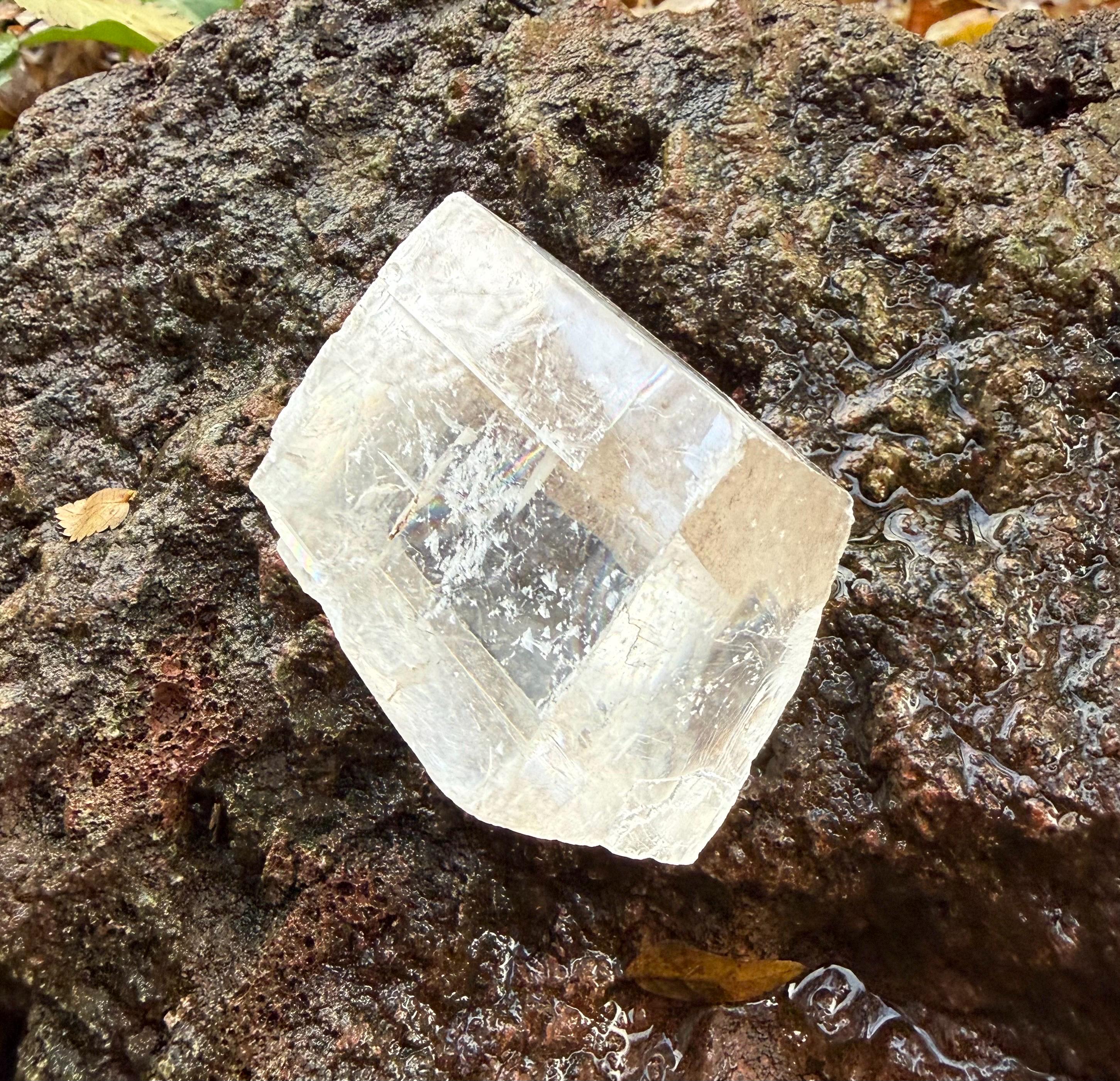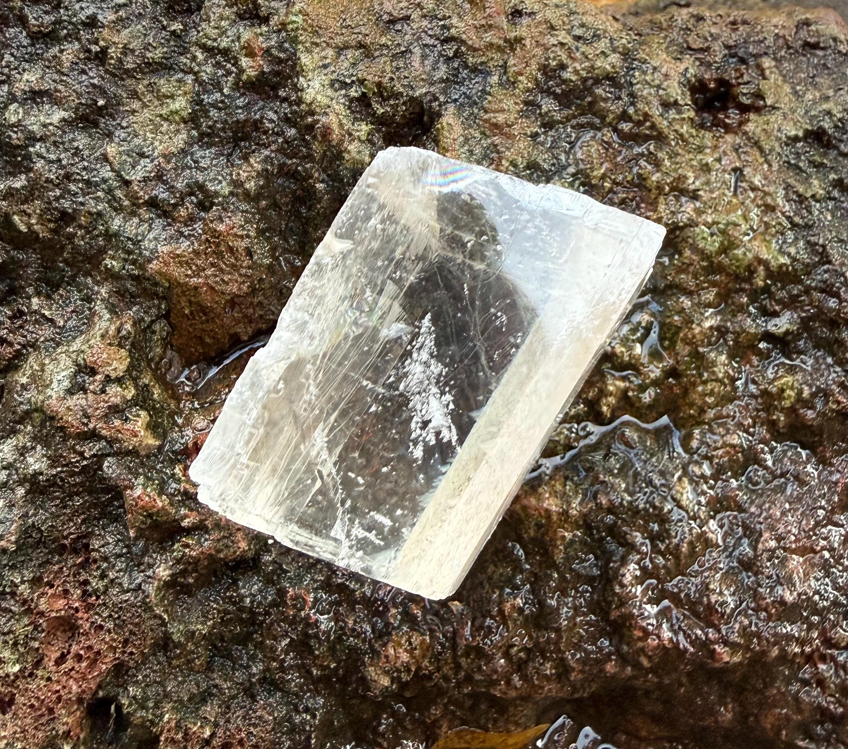 A beautifully clear and RAW Optical Calcite, aka Viking Sunstone, with gorgeous rainbow iridescence and rare matrix on one side.