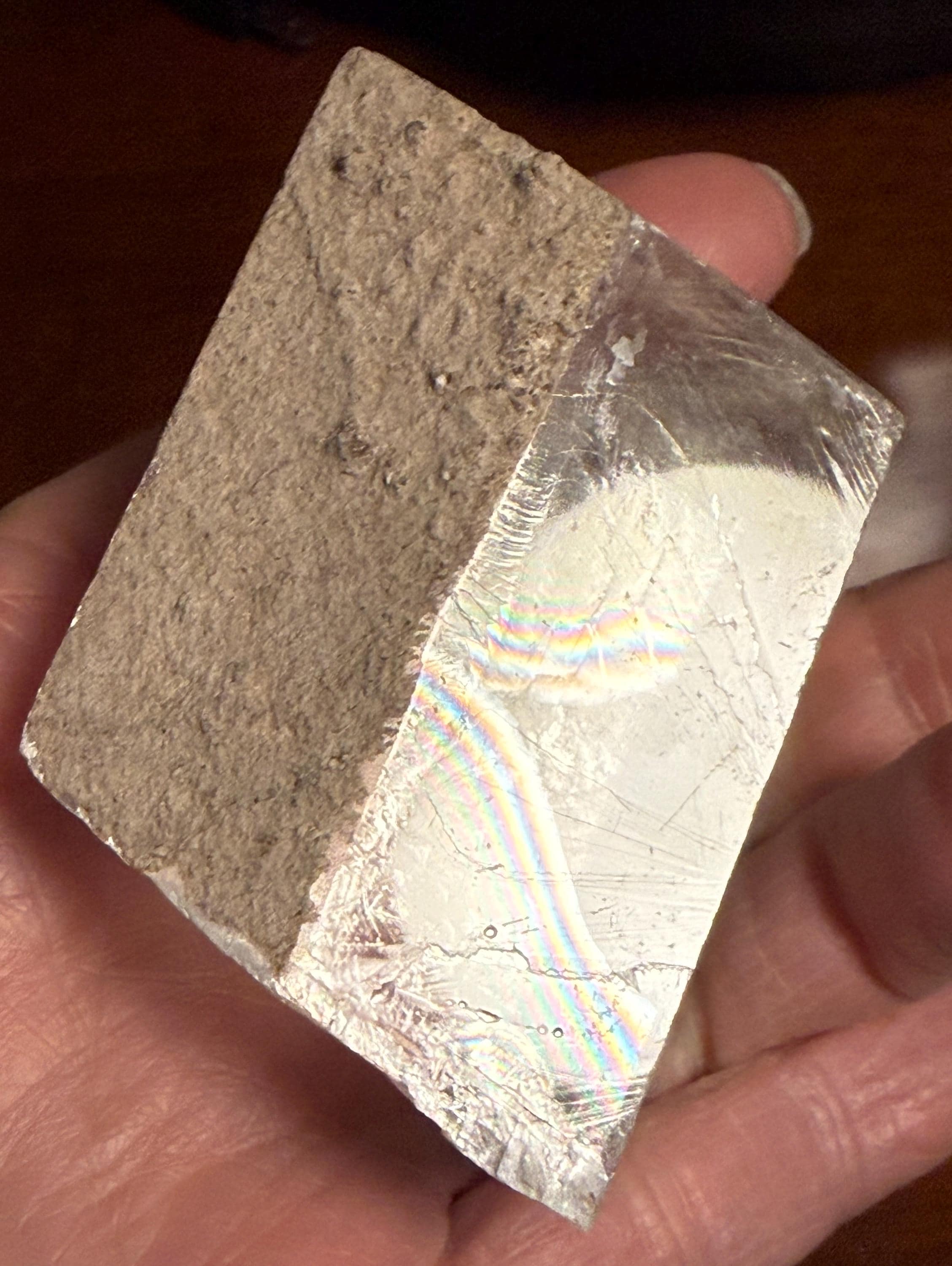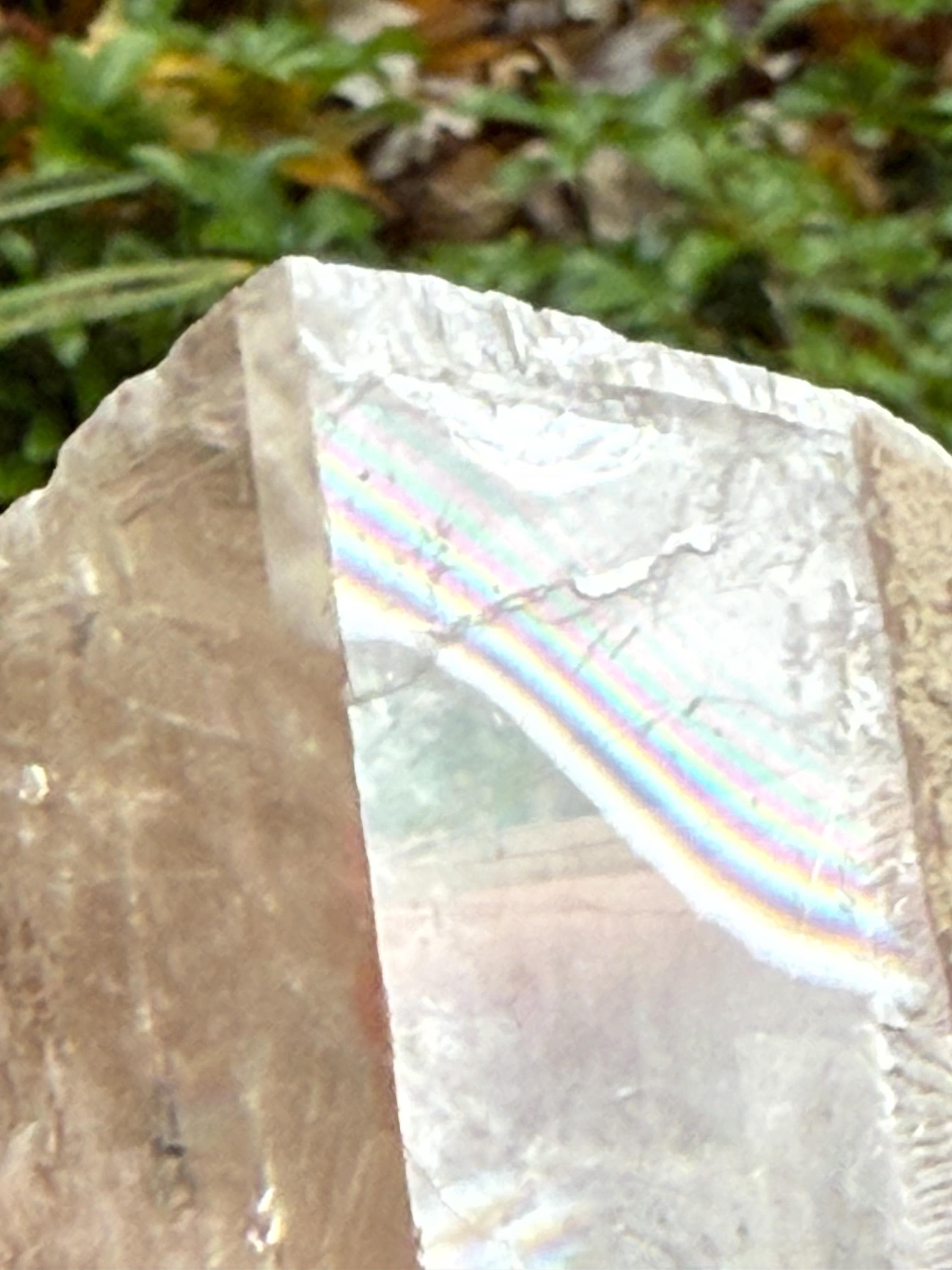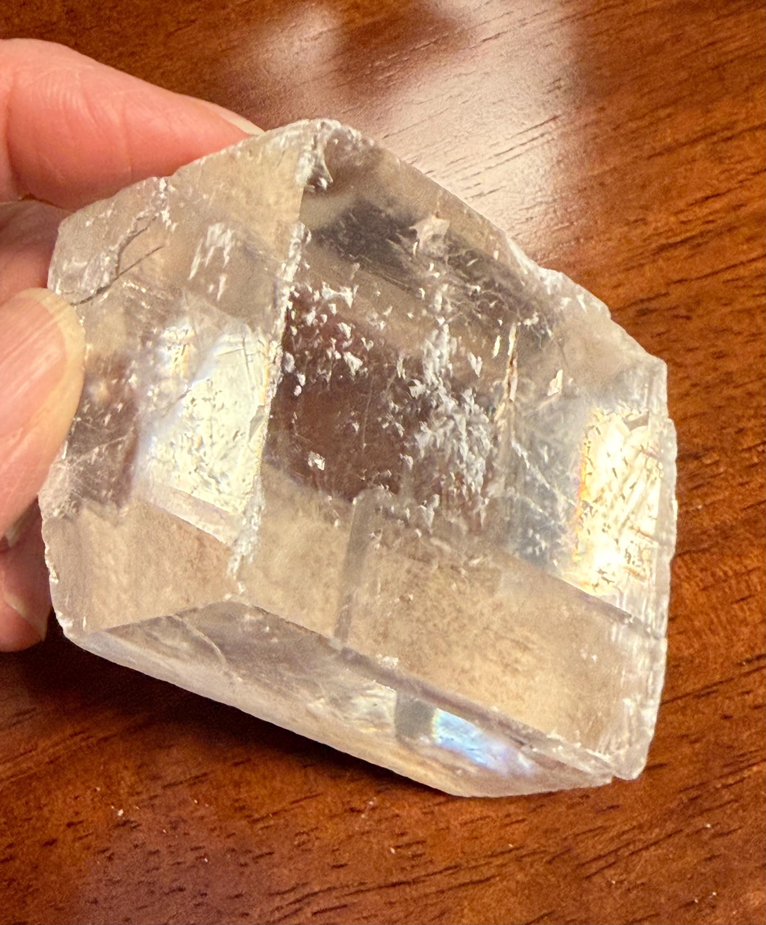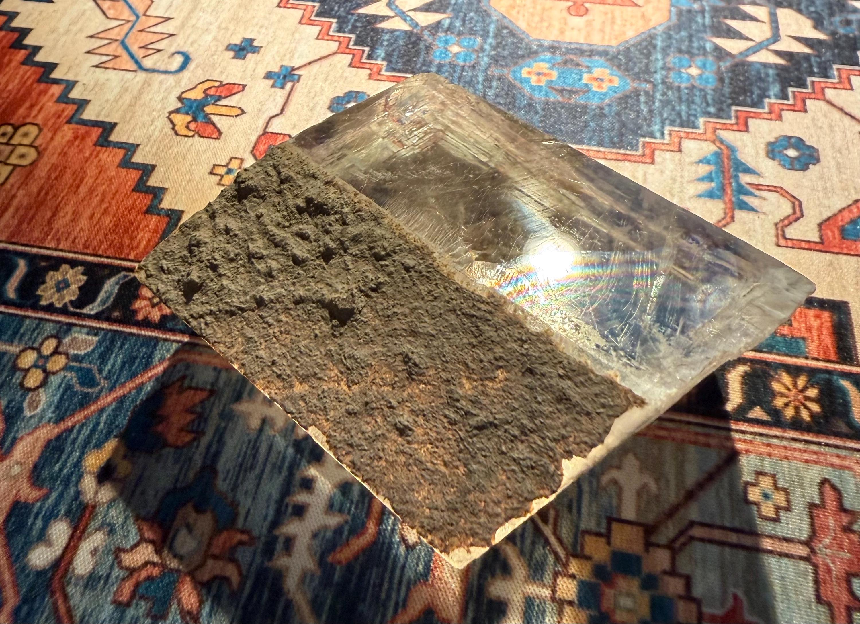 A beautifully clear and RAW Optical Calcite, aka Viking Sunstone, with gorgeous rainbow iridescence and rare matrix on one side.