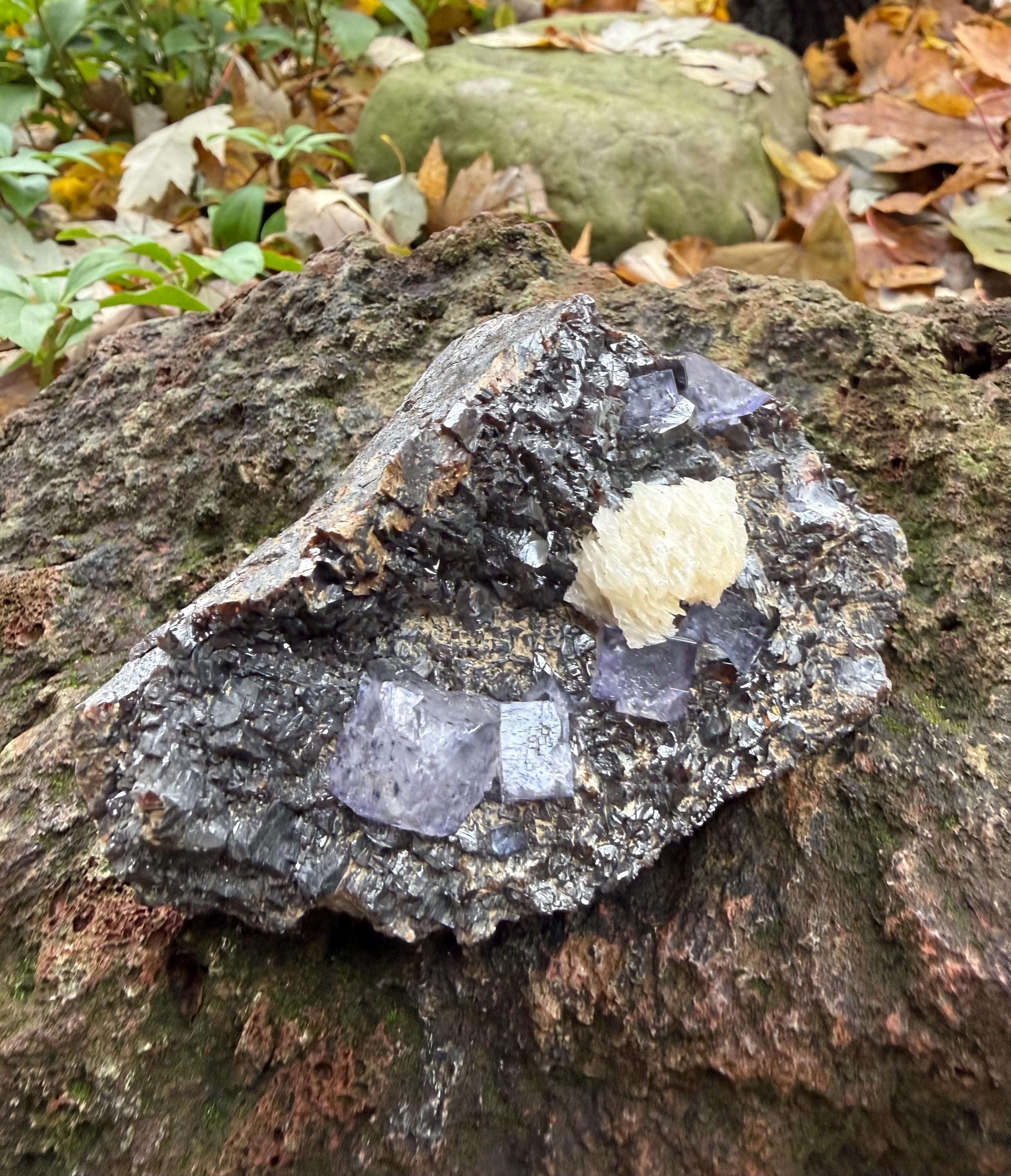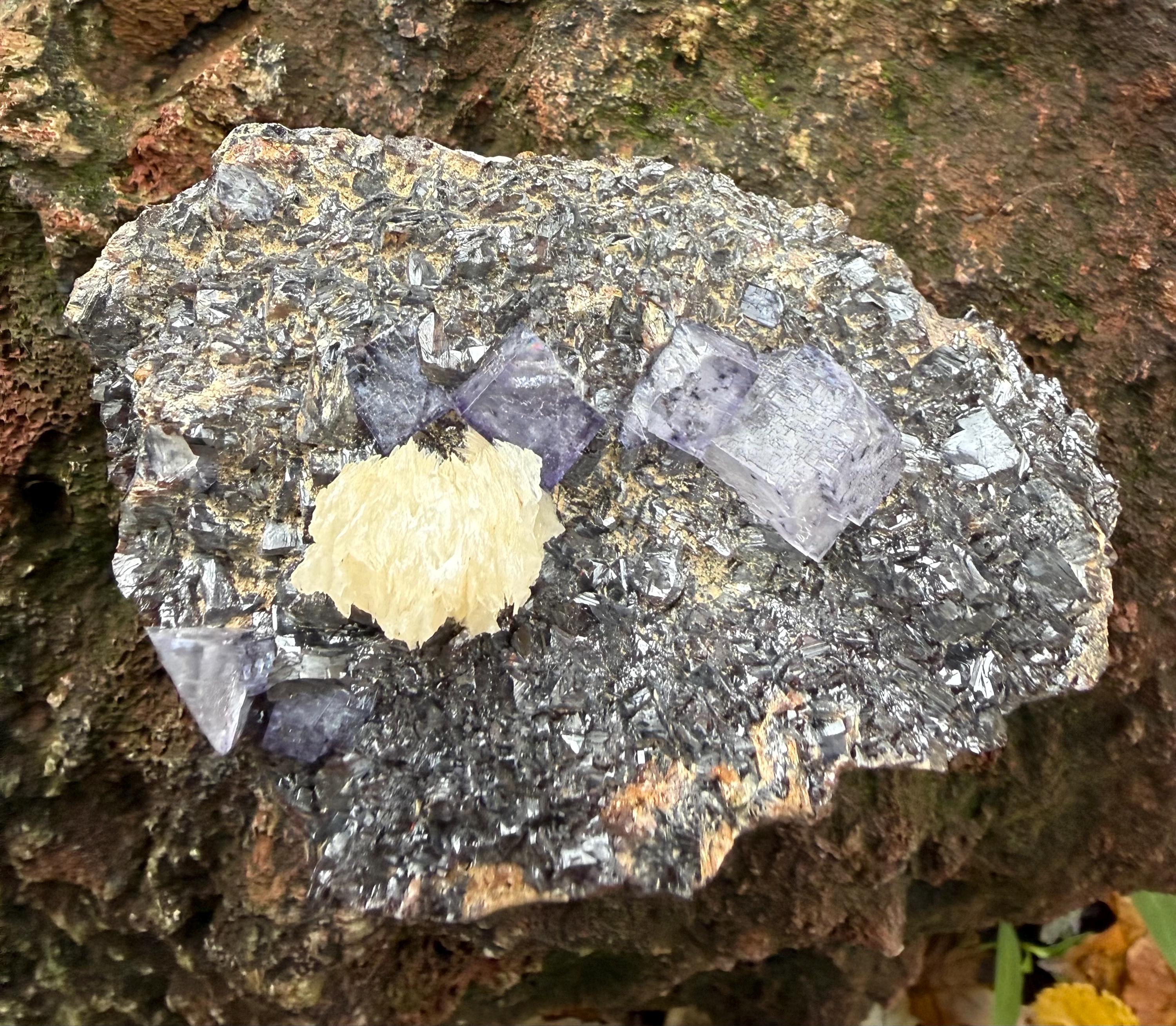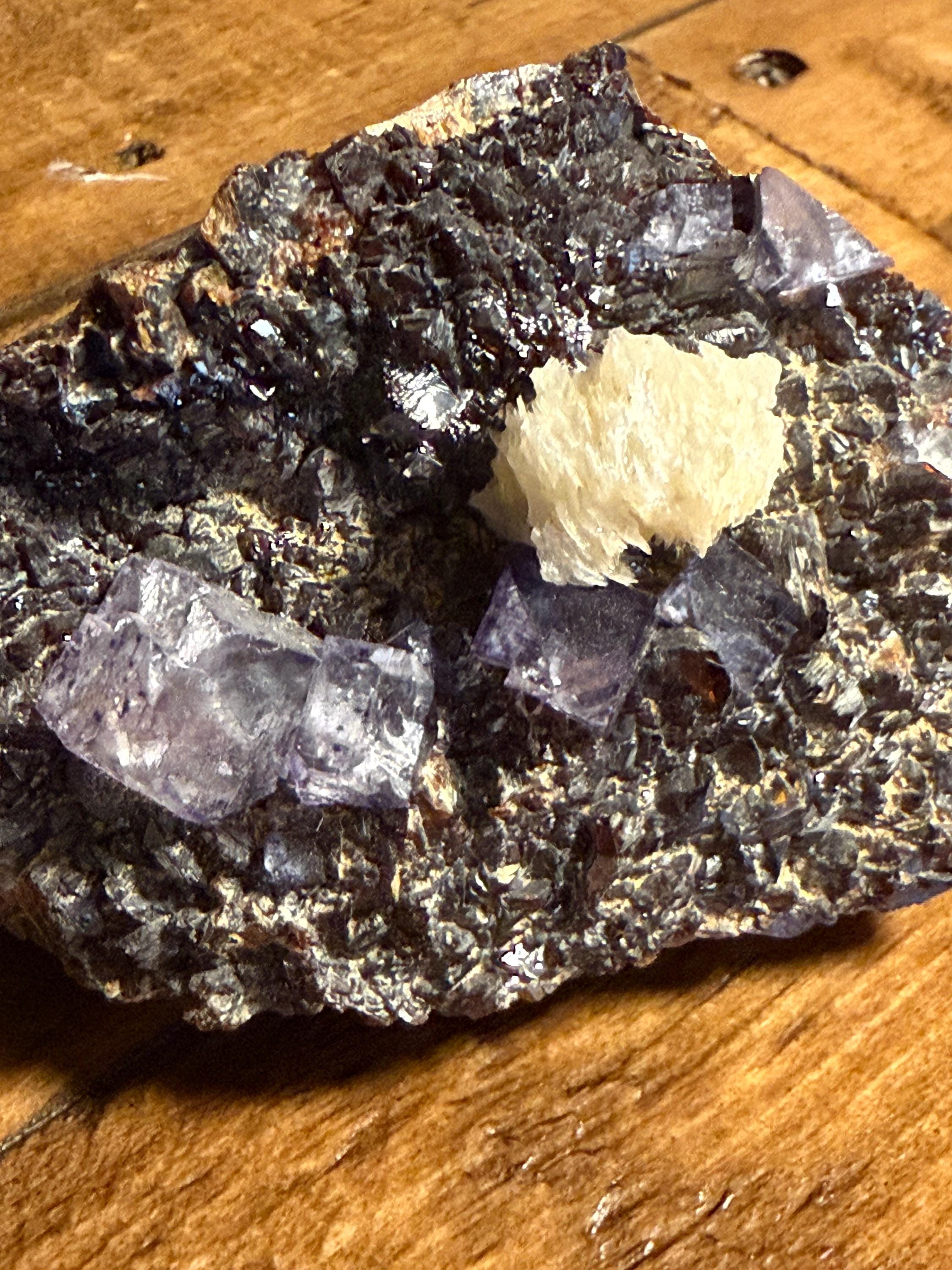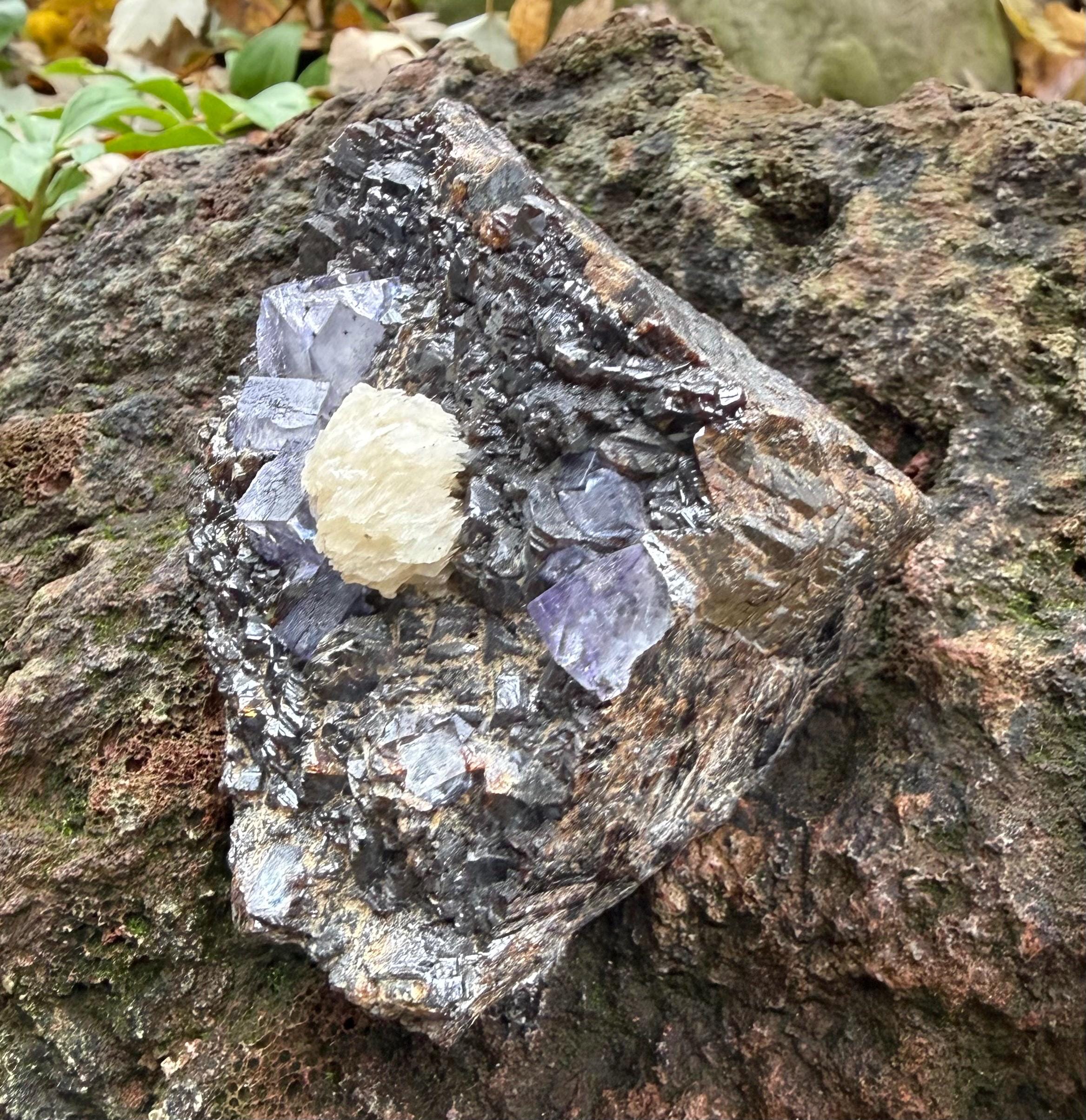 A vintage RAW Fluorite, Calcite and Sphalerite cluster from Illinois.