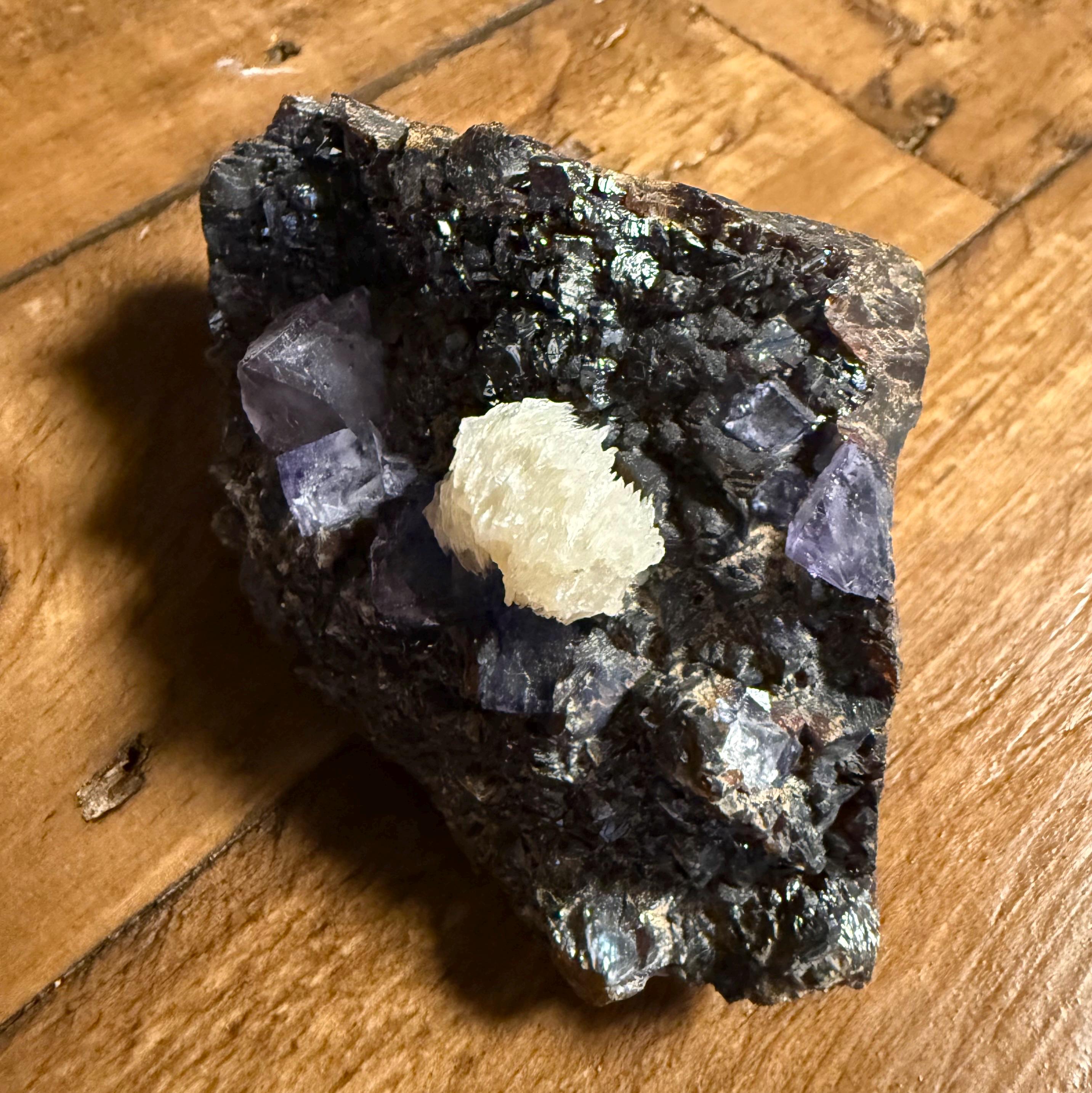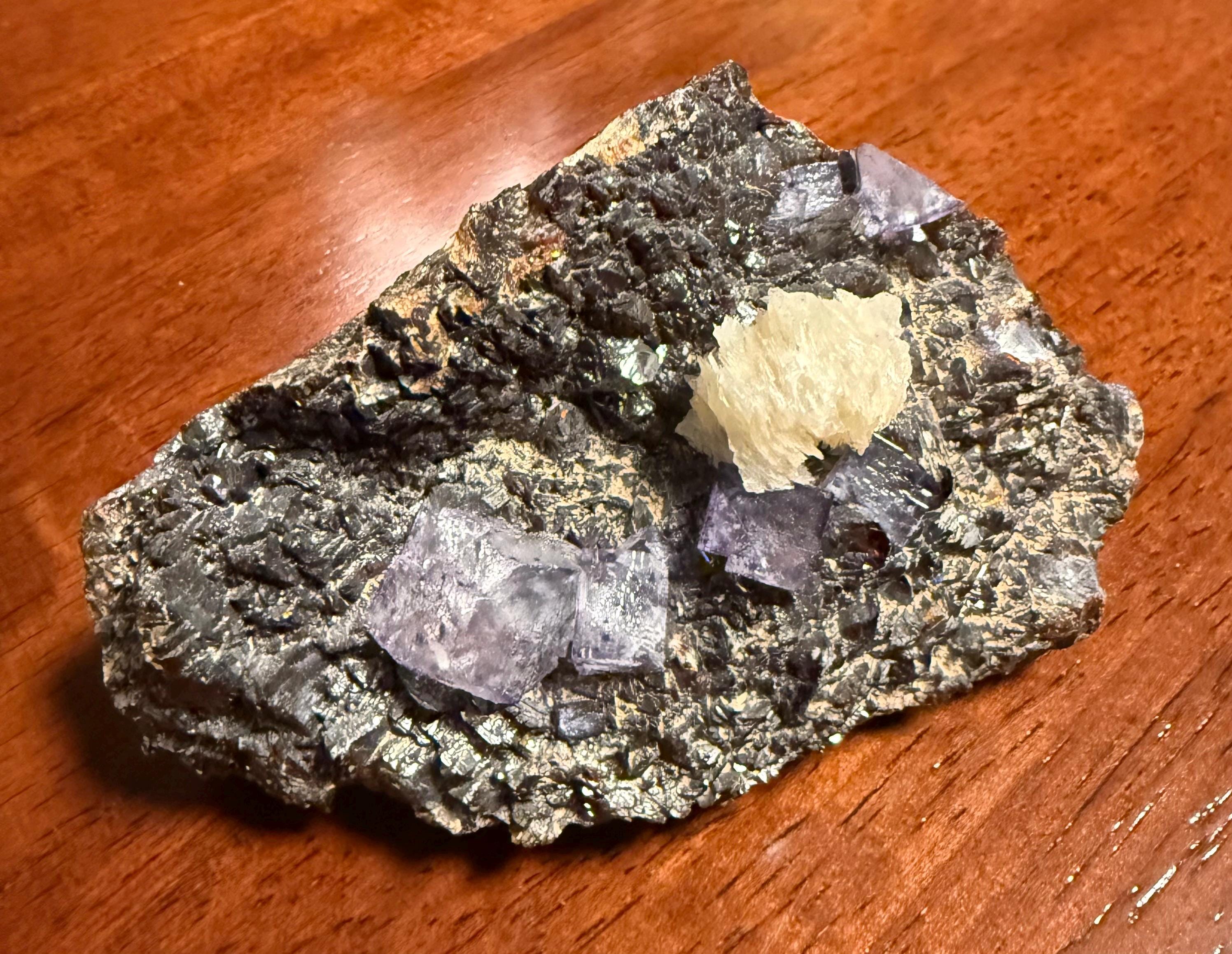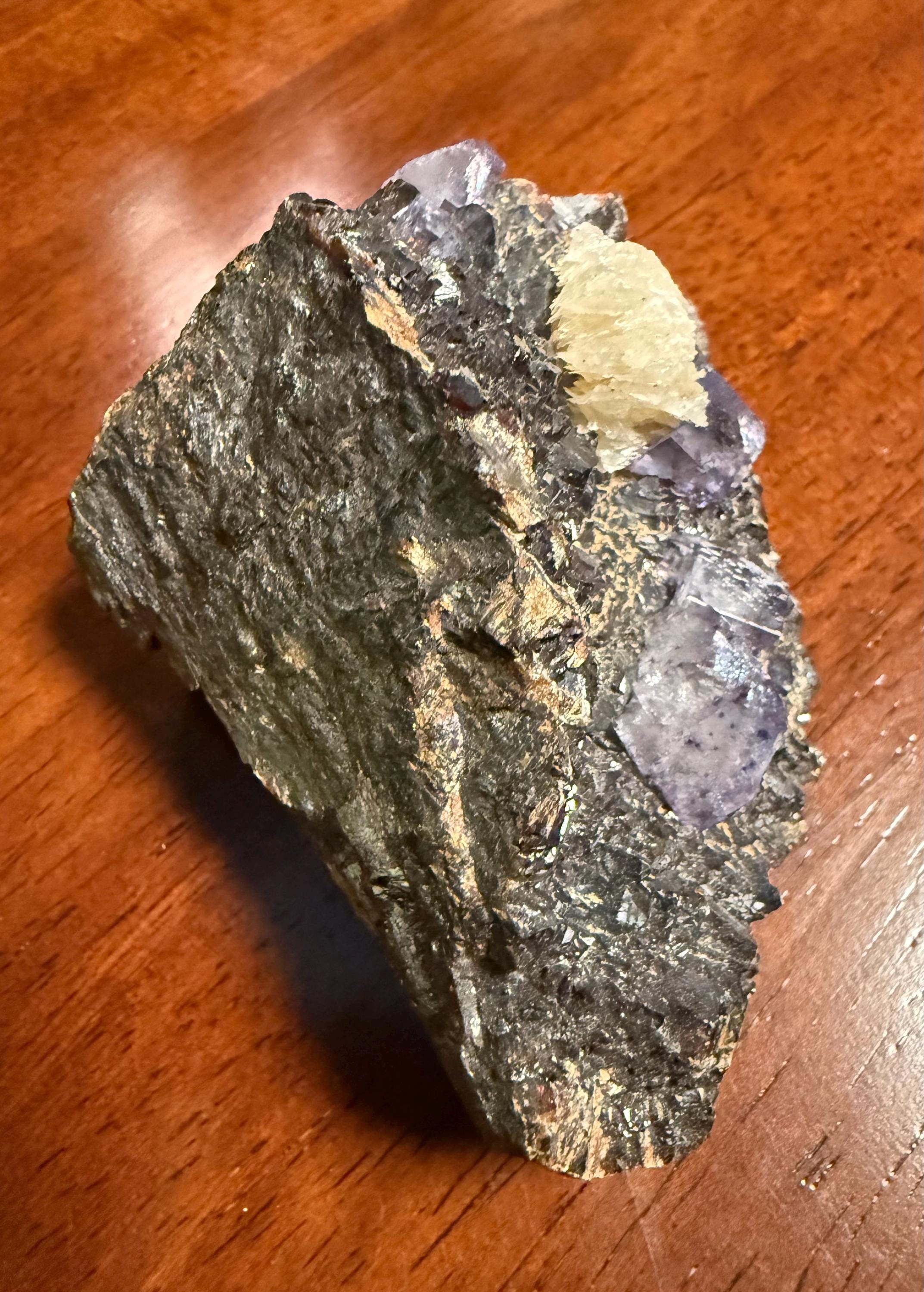 A vintage RAW Fluorite, Calcite and Sphalerite cluster from Illinois.
