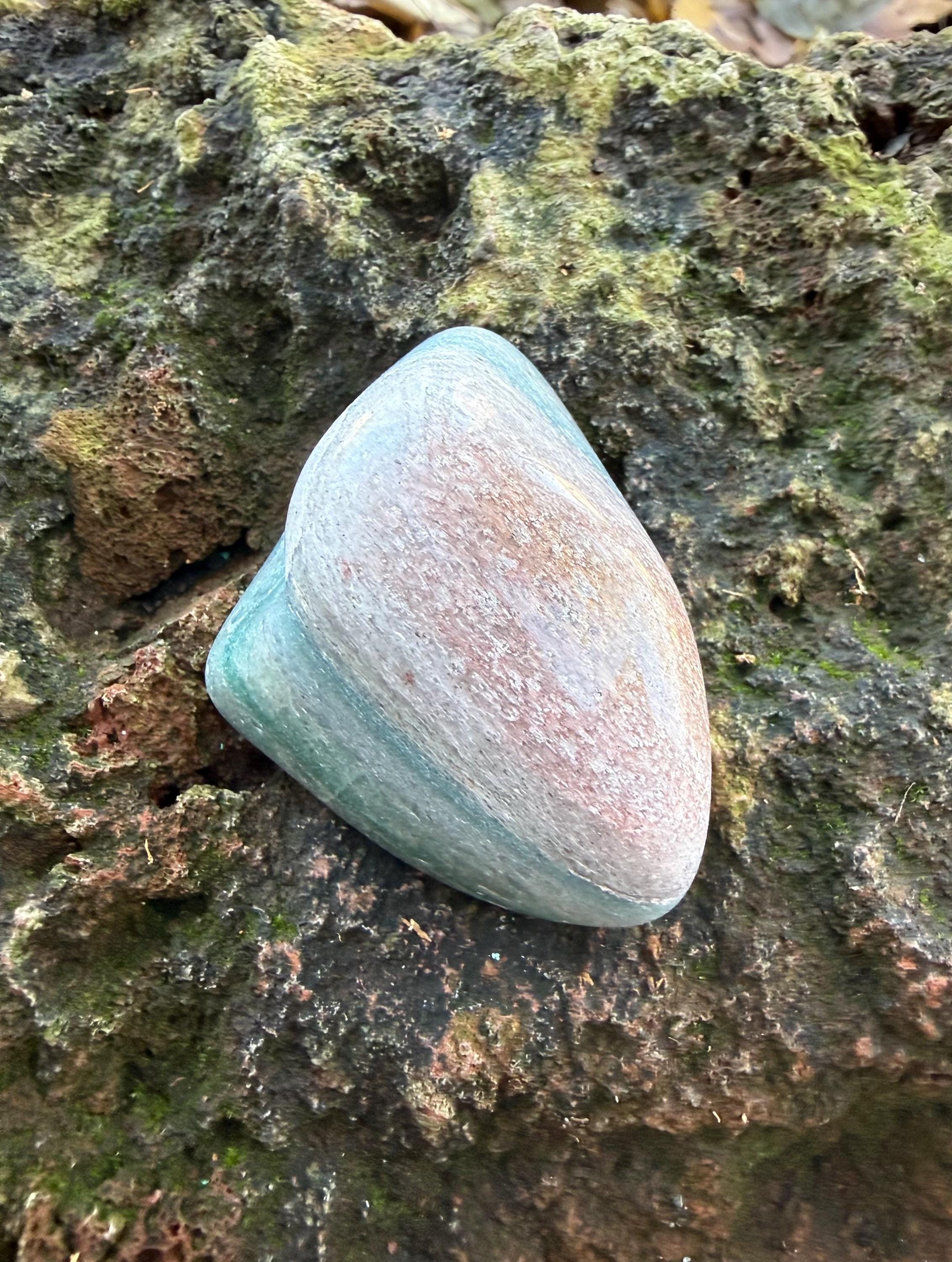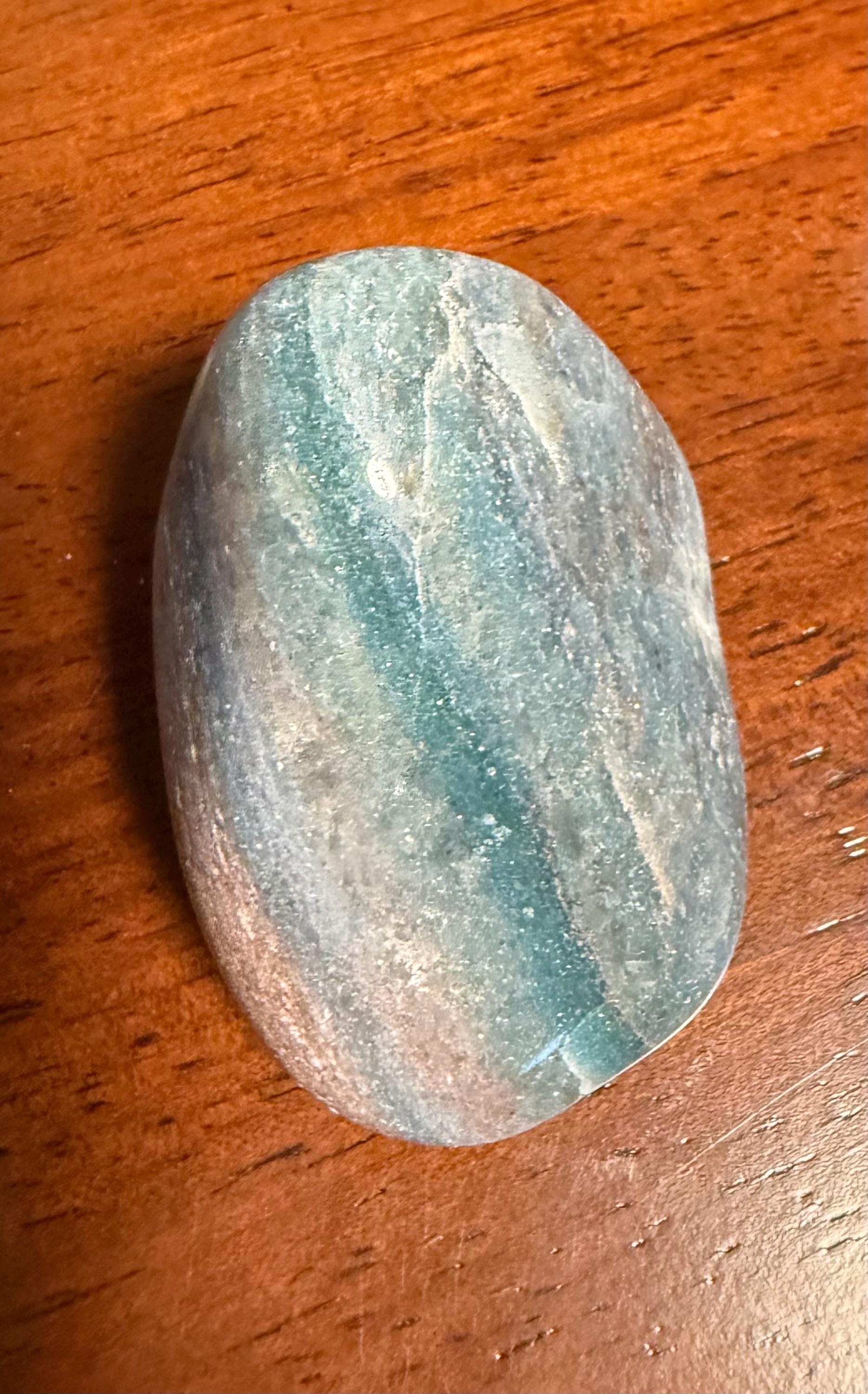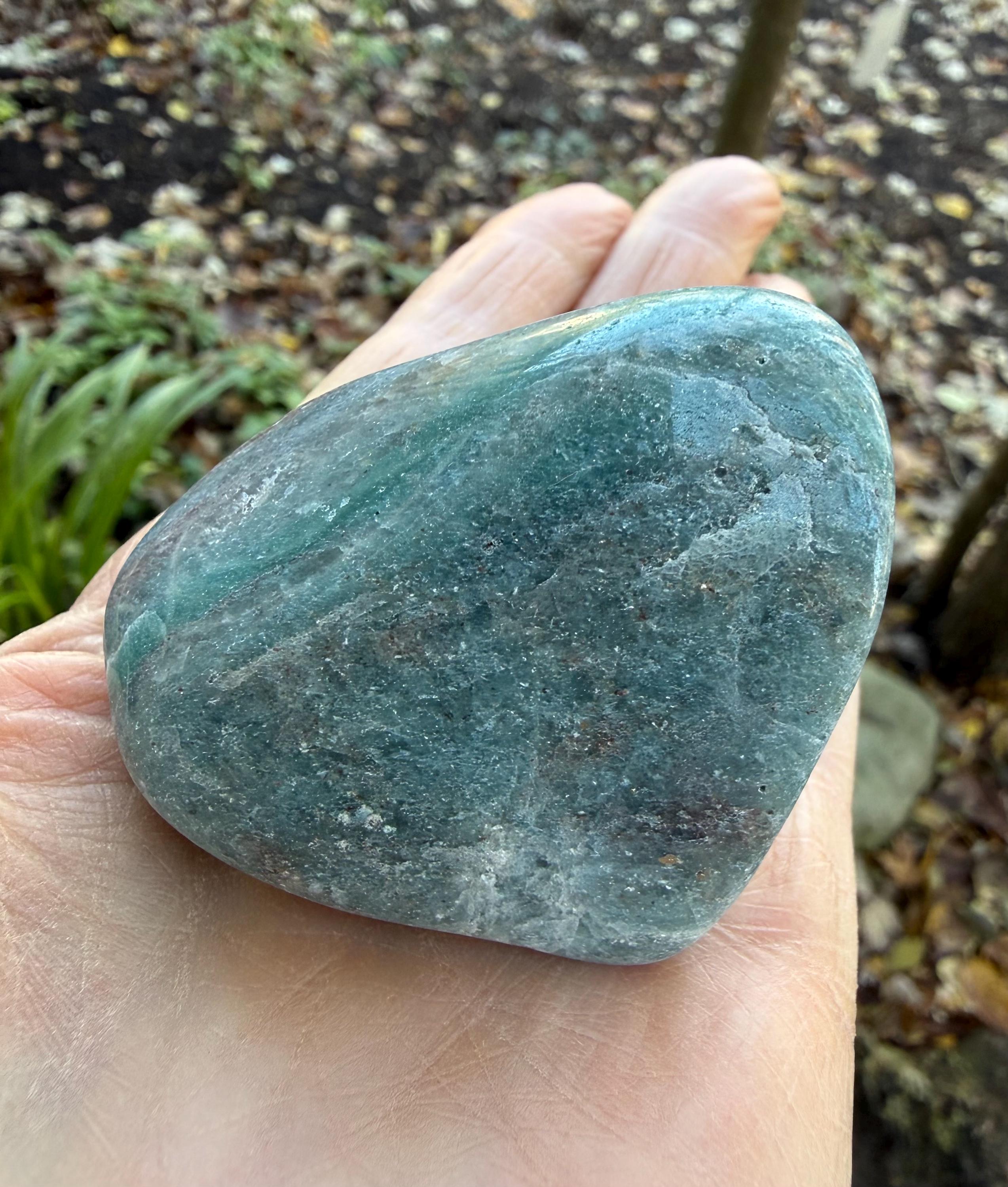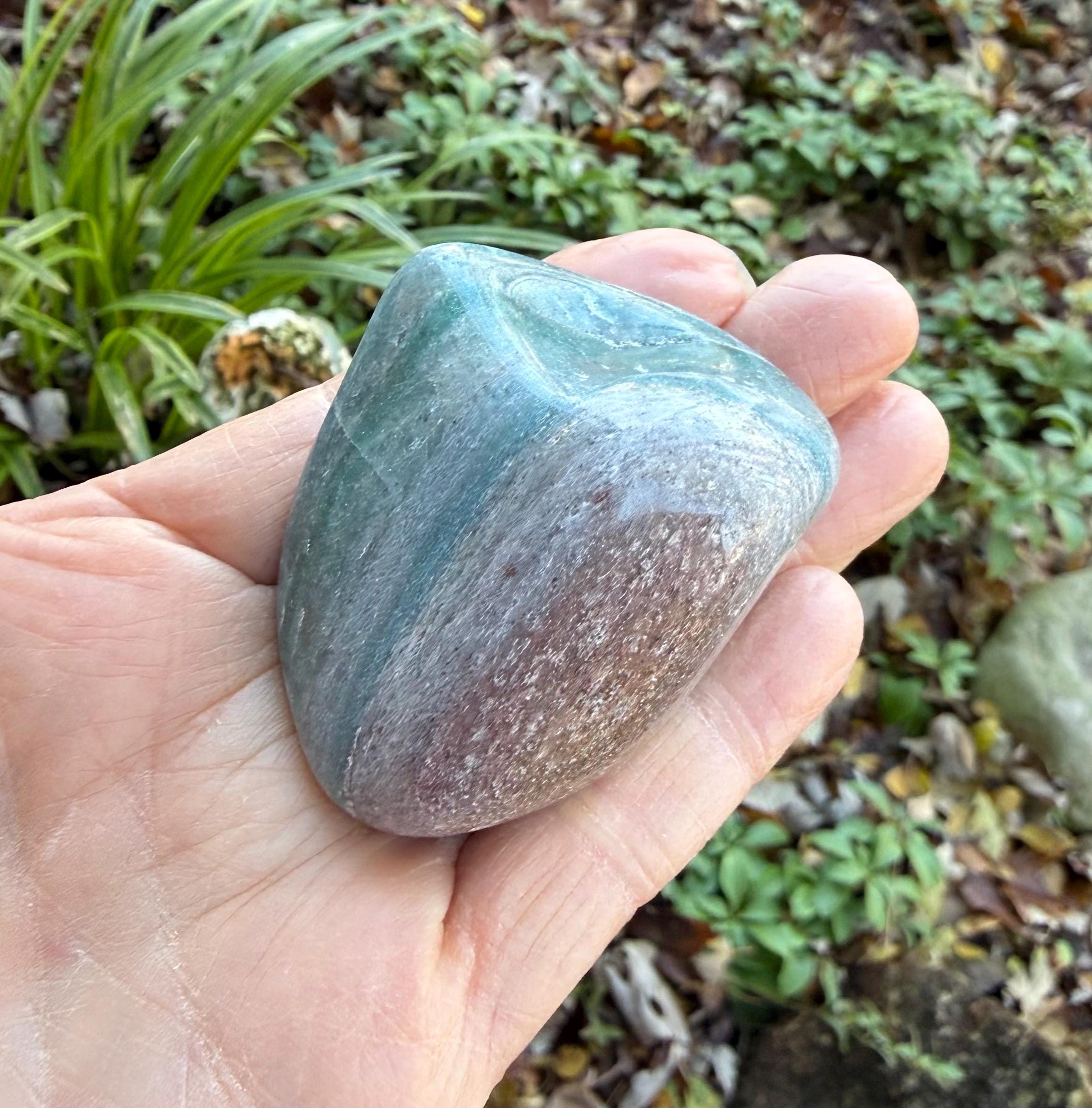 This is a gorgeous freeform palm stone of polished Blue Aventurine with some pink and teal coloring.