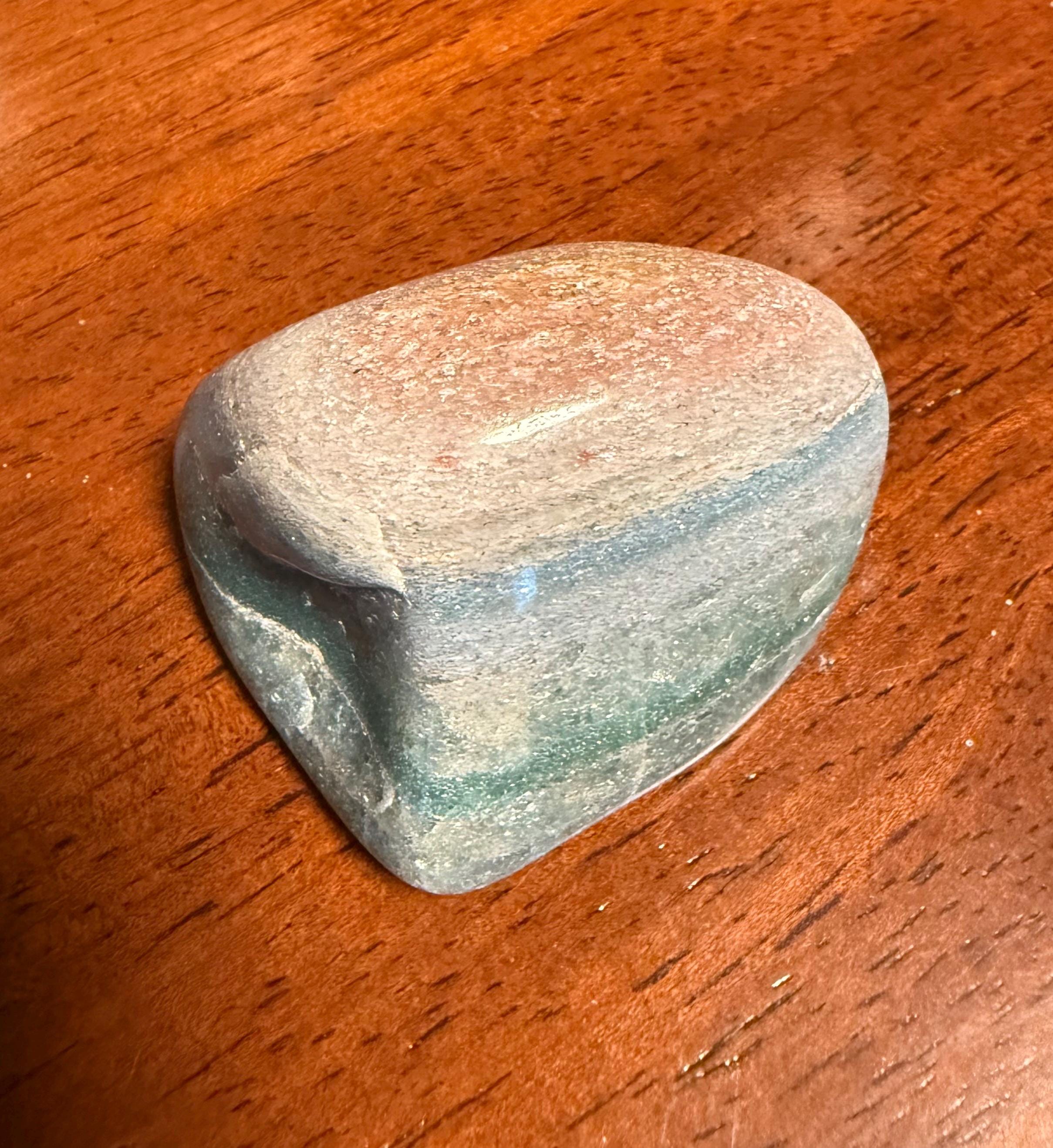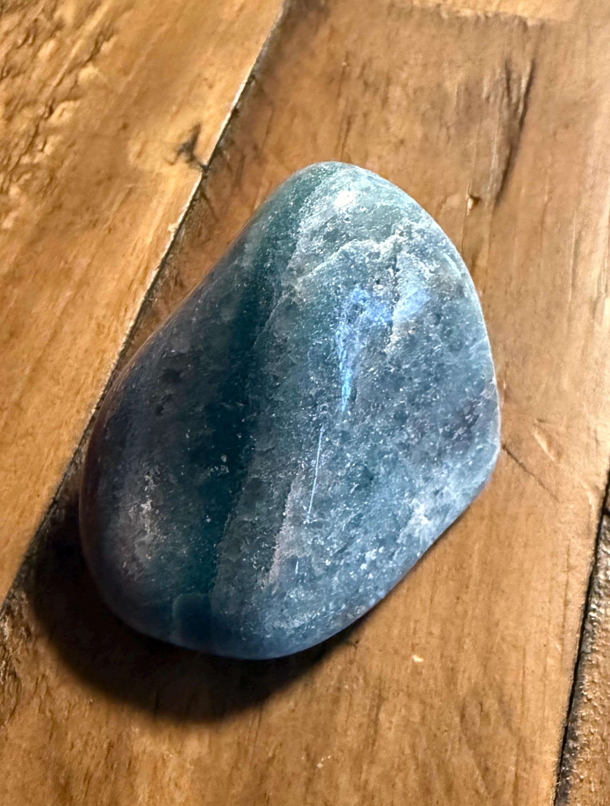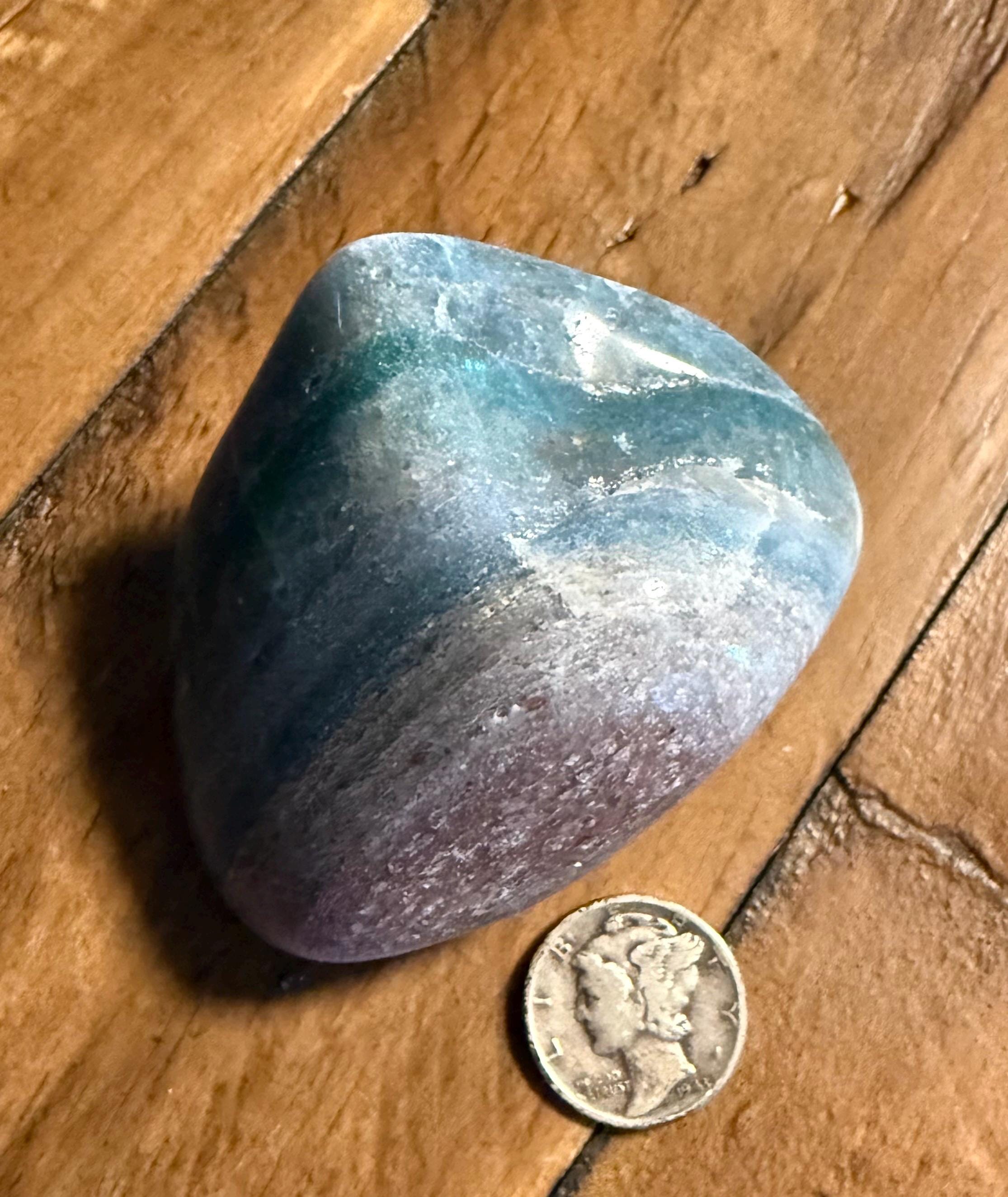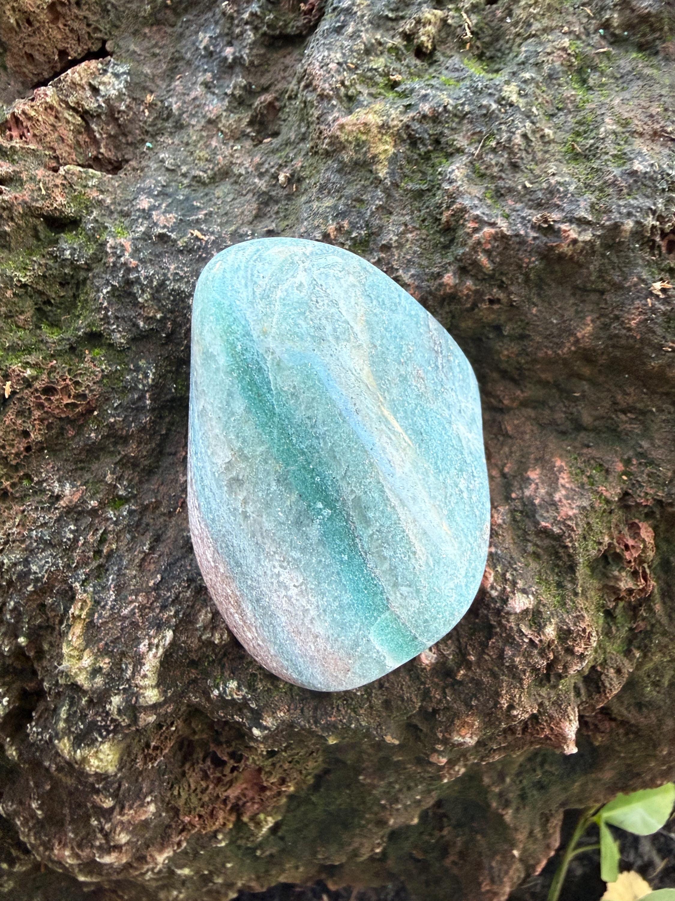 This is a gorgeous freeform palm stone of polished Blue Aventurine with some pink and teal coloring.