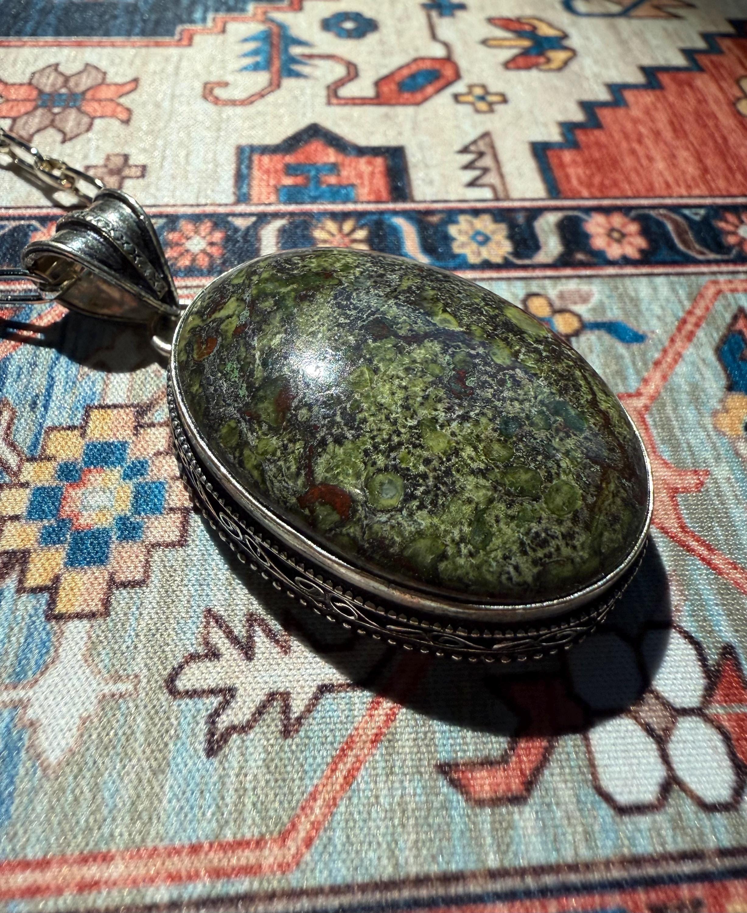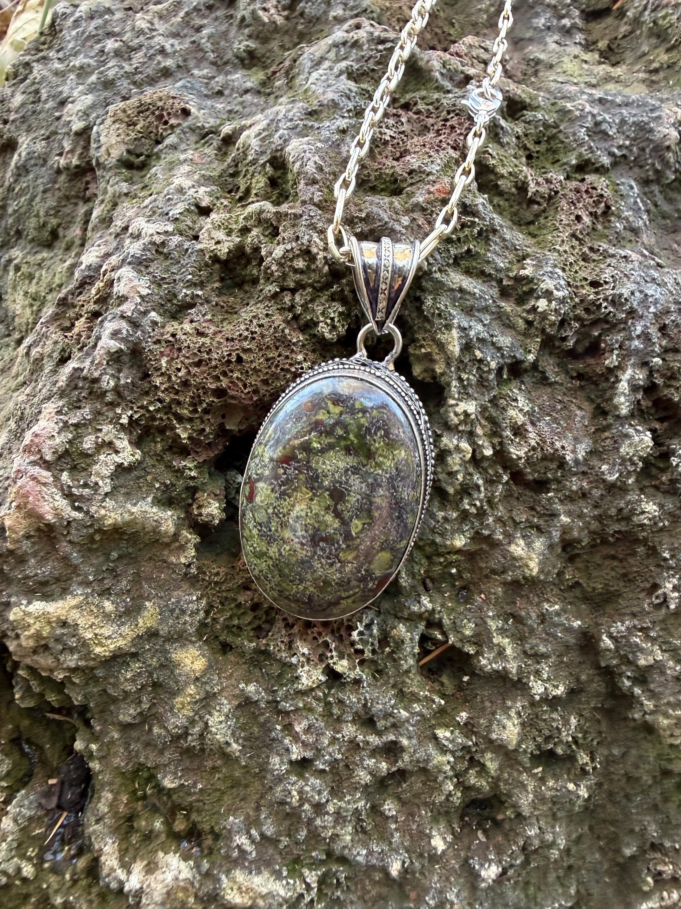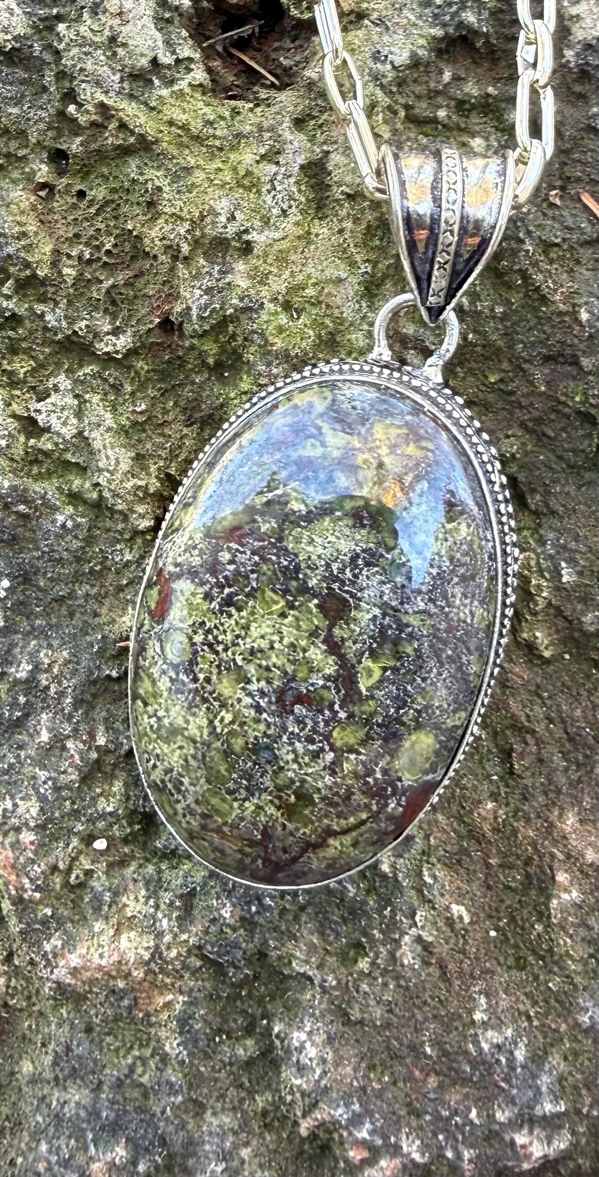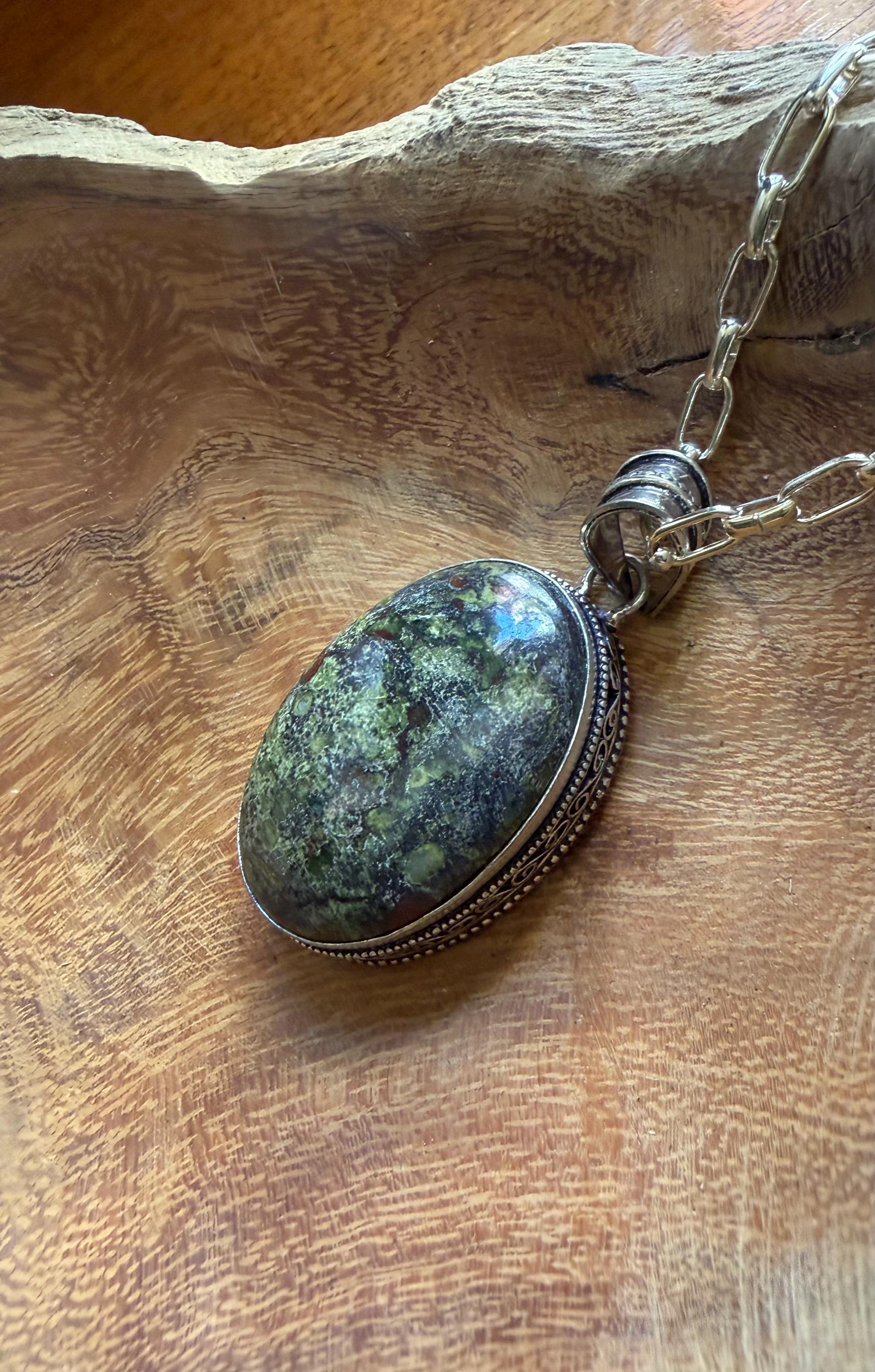 A truly gorgeous large Dragon Stone pendant in green with a touch of Red Jasper.