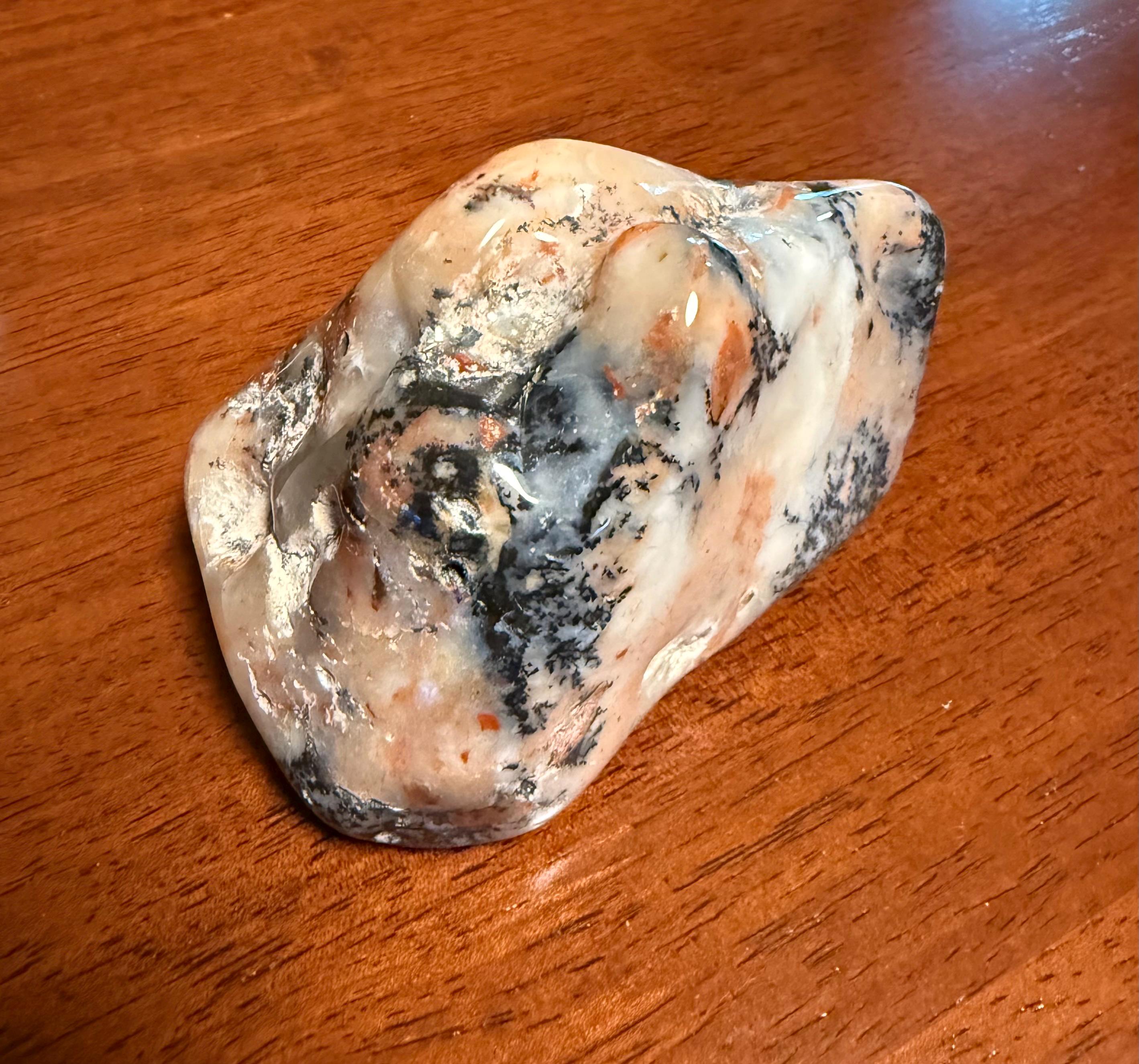 Beautifully colored with pale green and black inclusions of Manganese with a touch of orange from oxides.