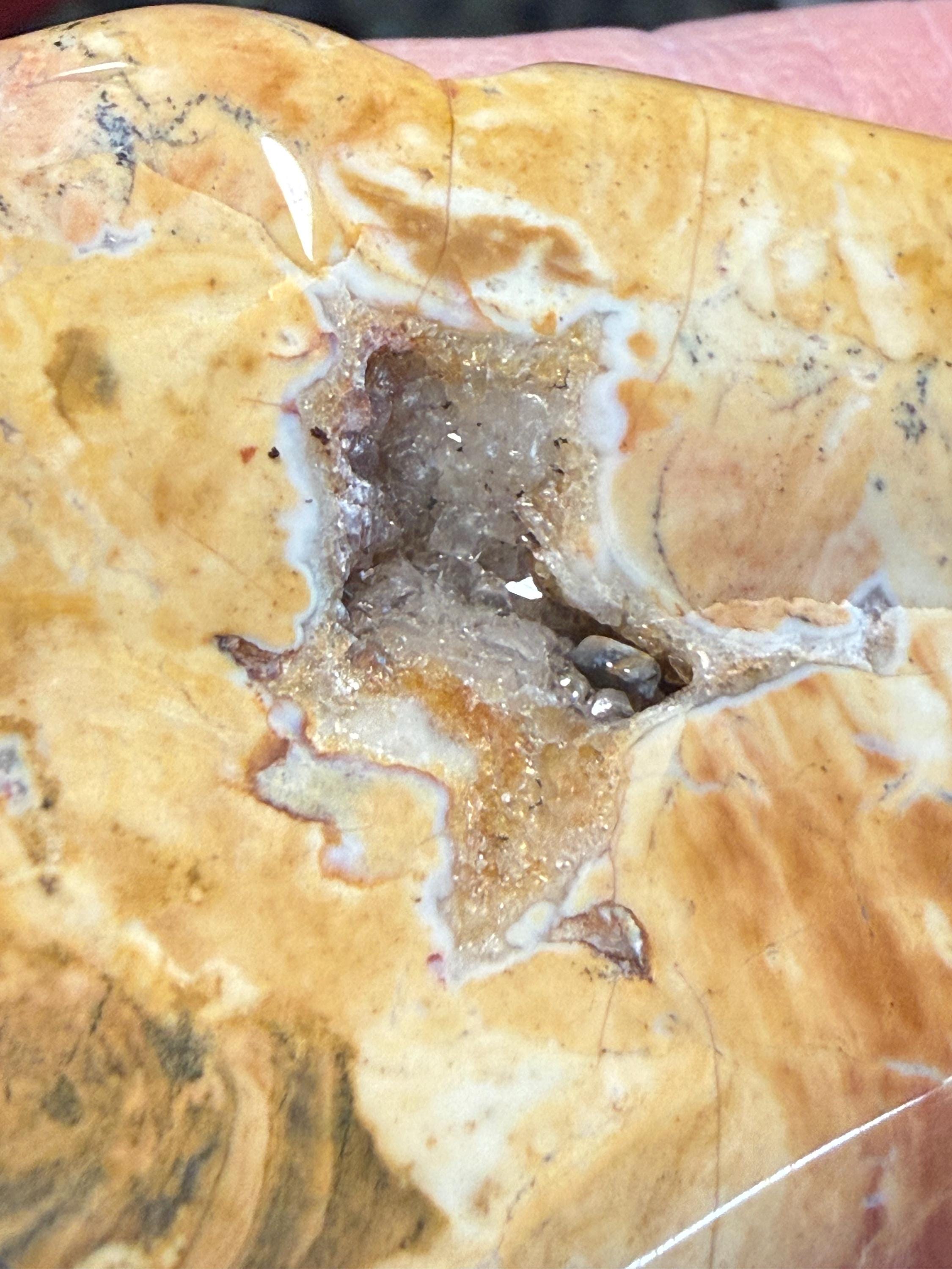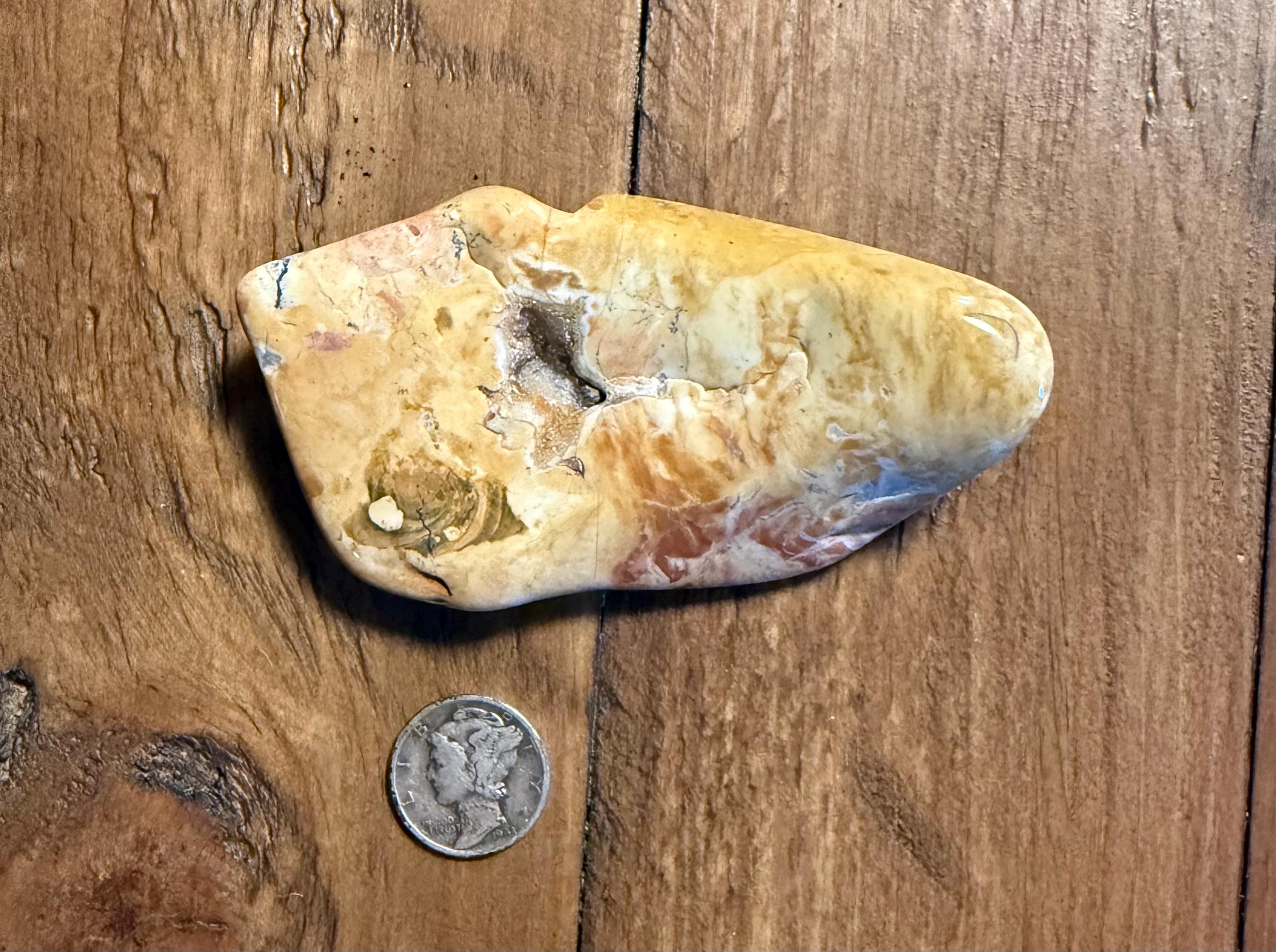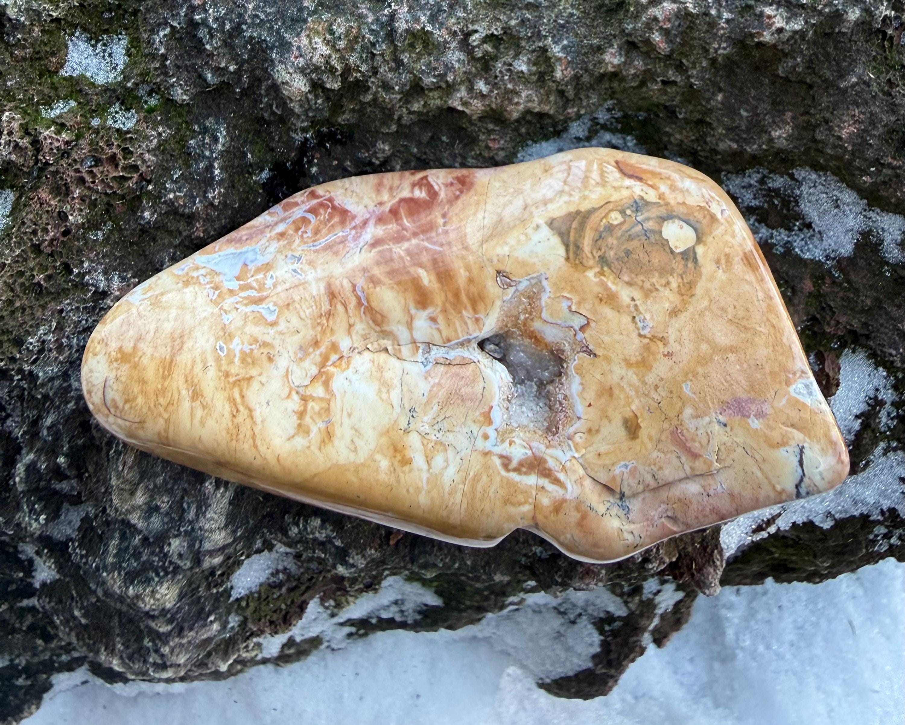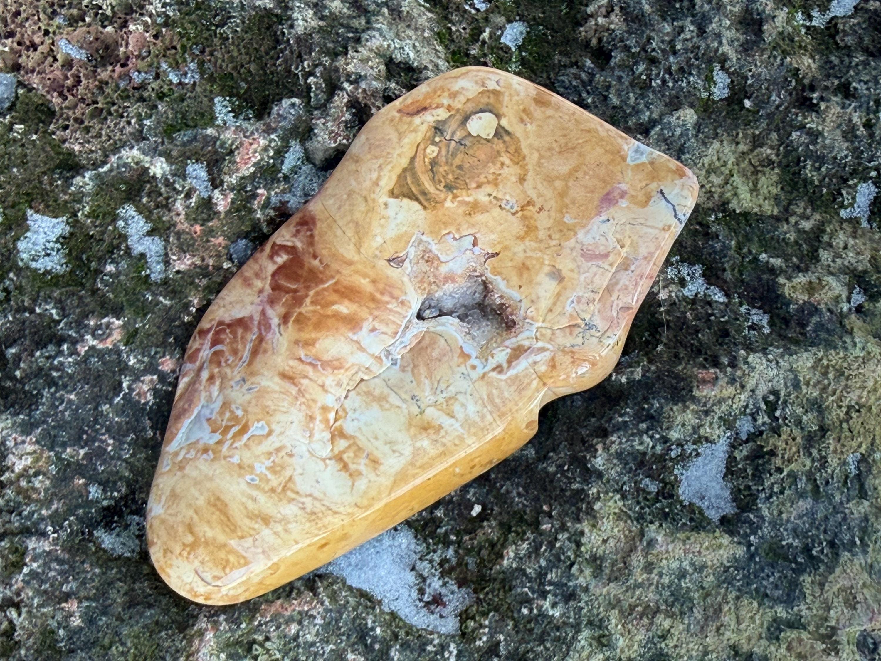 A beautiful freeform palm slab of natural Rainbow Flint from Ohio with colors of yellow, dark grey, orange, and gold with a gorgeous central druzy cavern on one side and an orb on the other side.