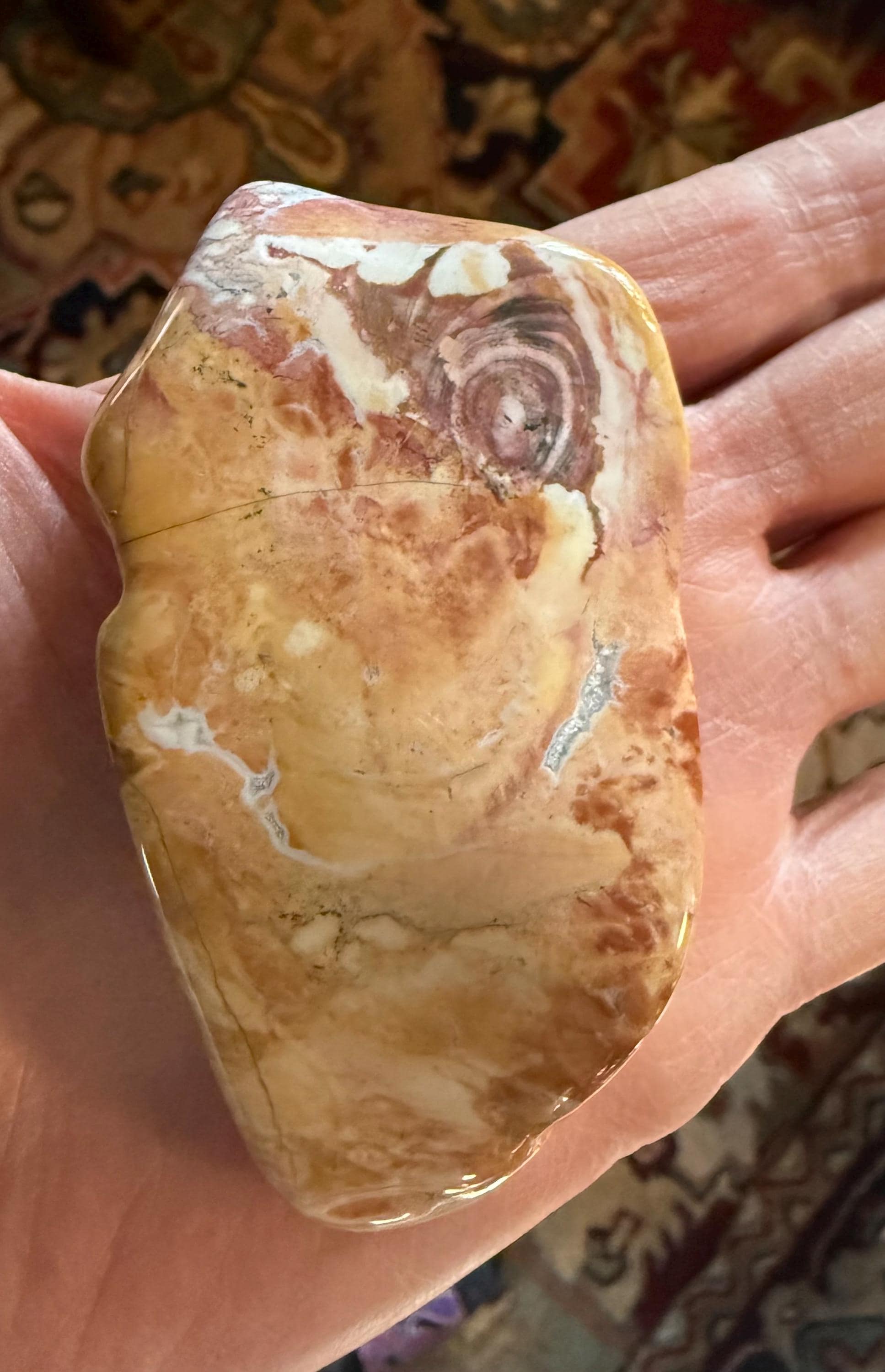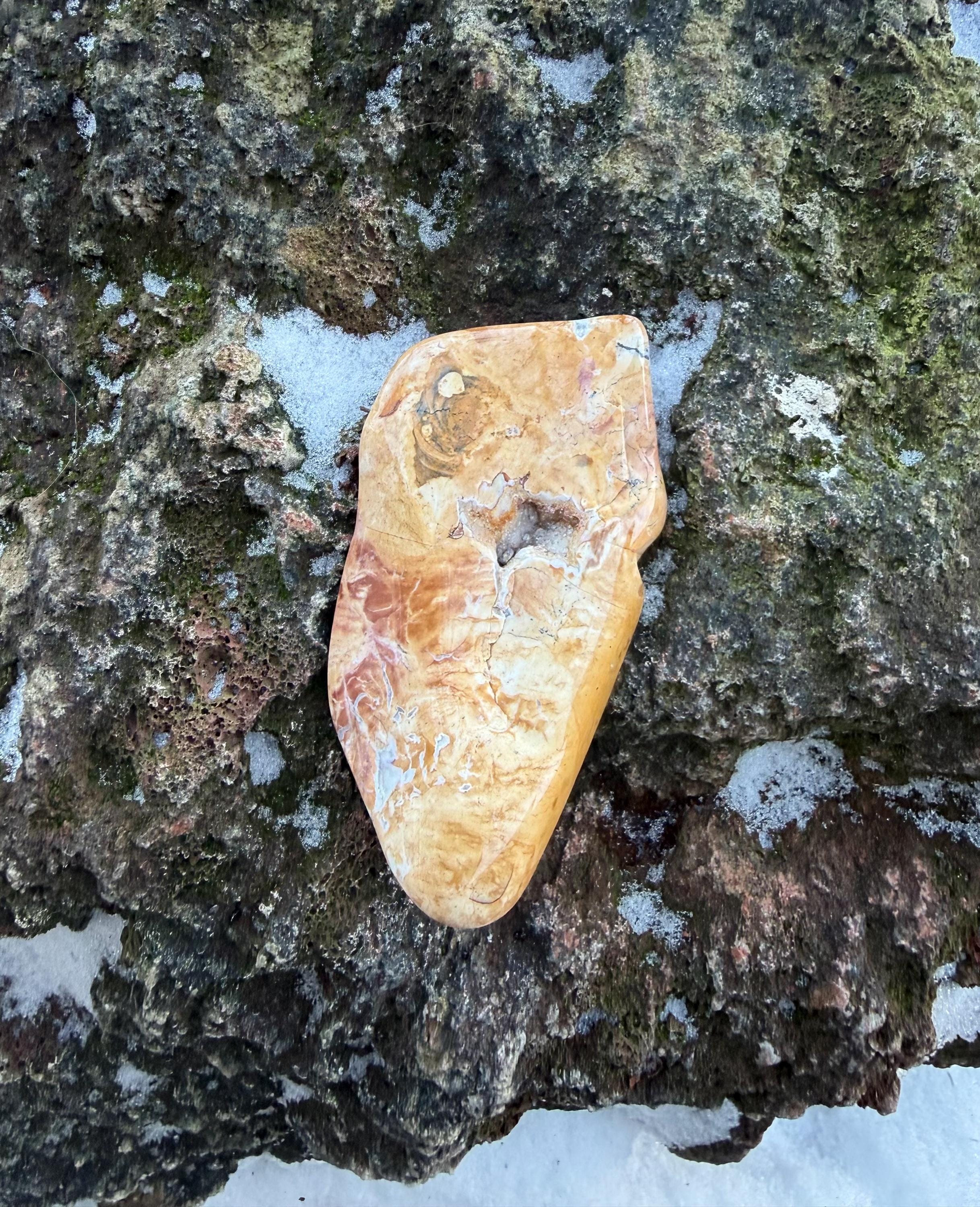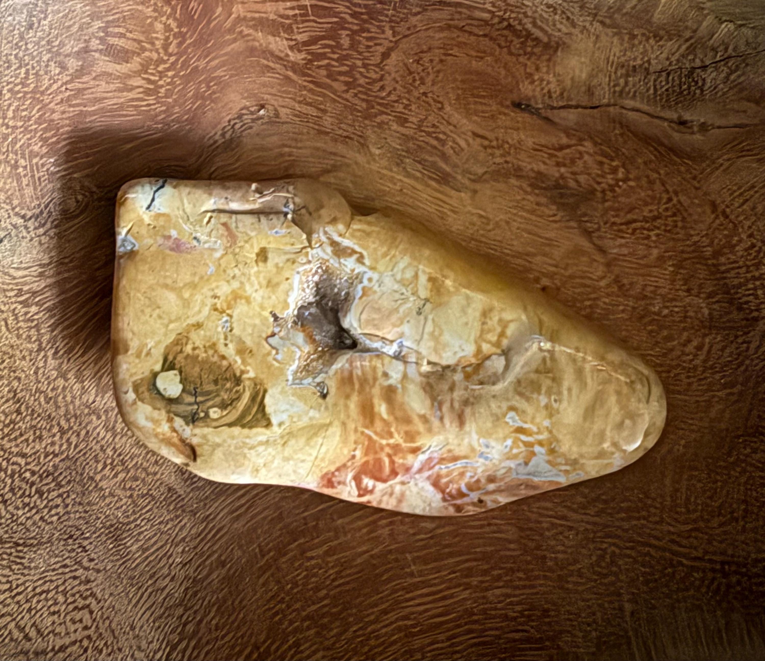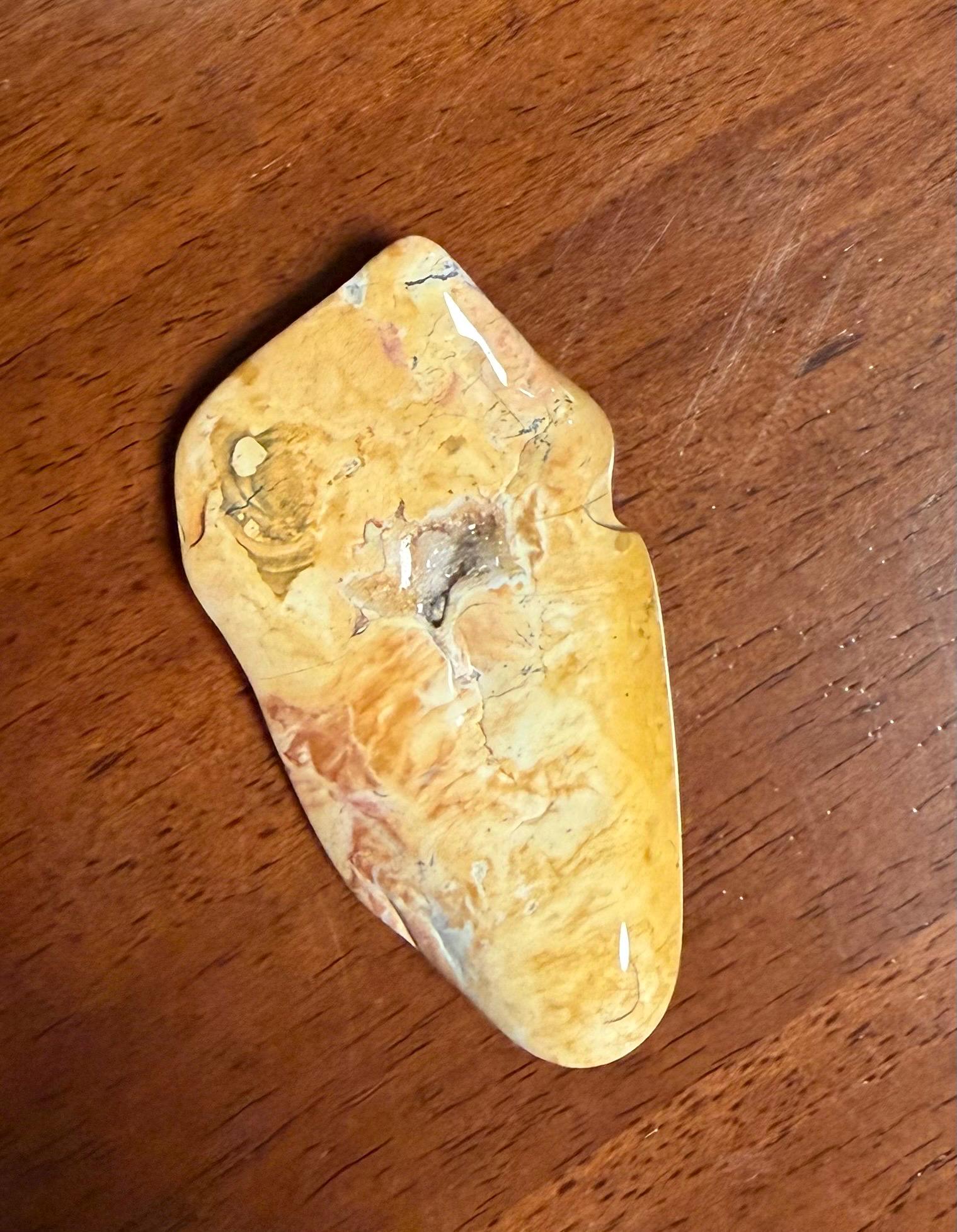 A beautiful freeform palm slab of natural Rainbow Flint from Ohio with colors of yellow, dark grey, orange, and gold with a gorgeous central druzy cavern on one side and an orb on the other side.