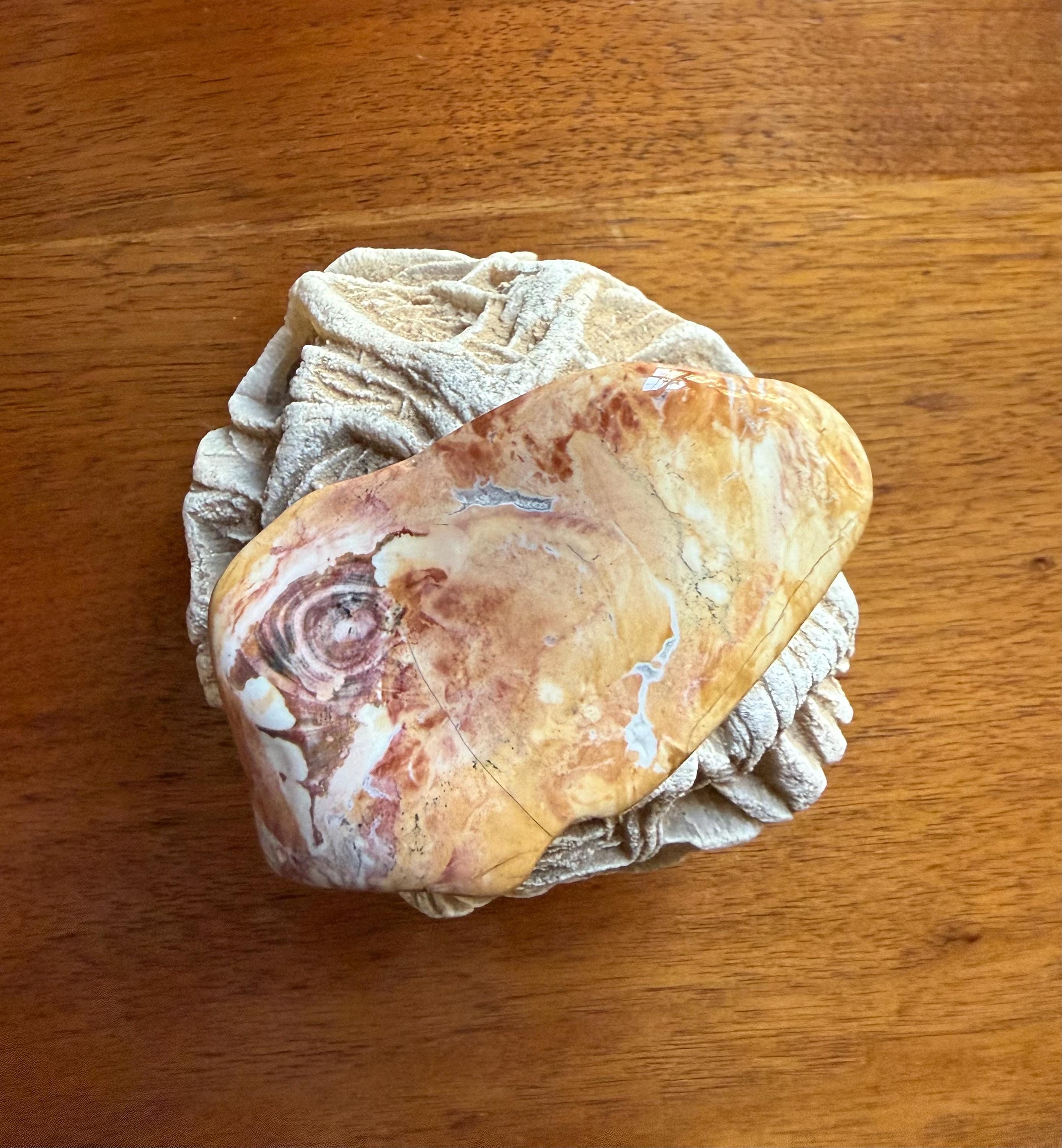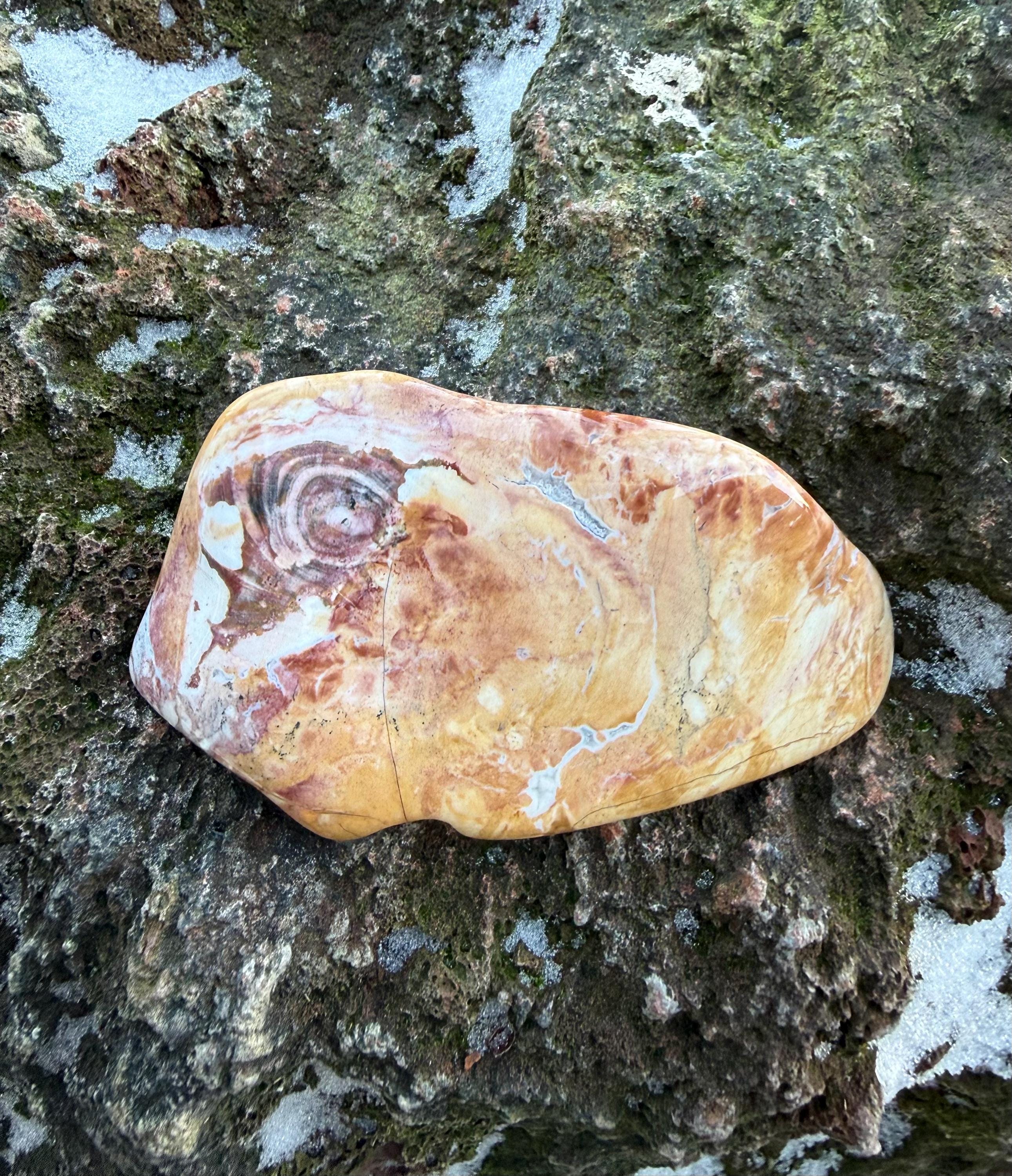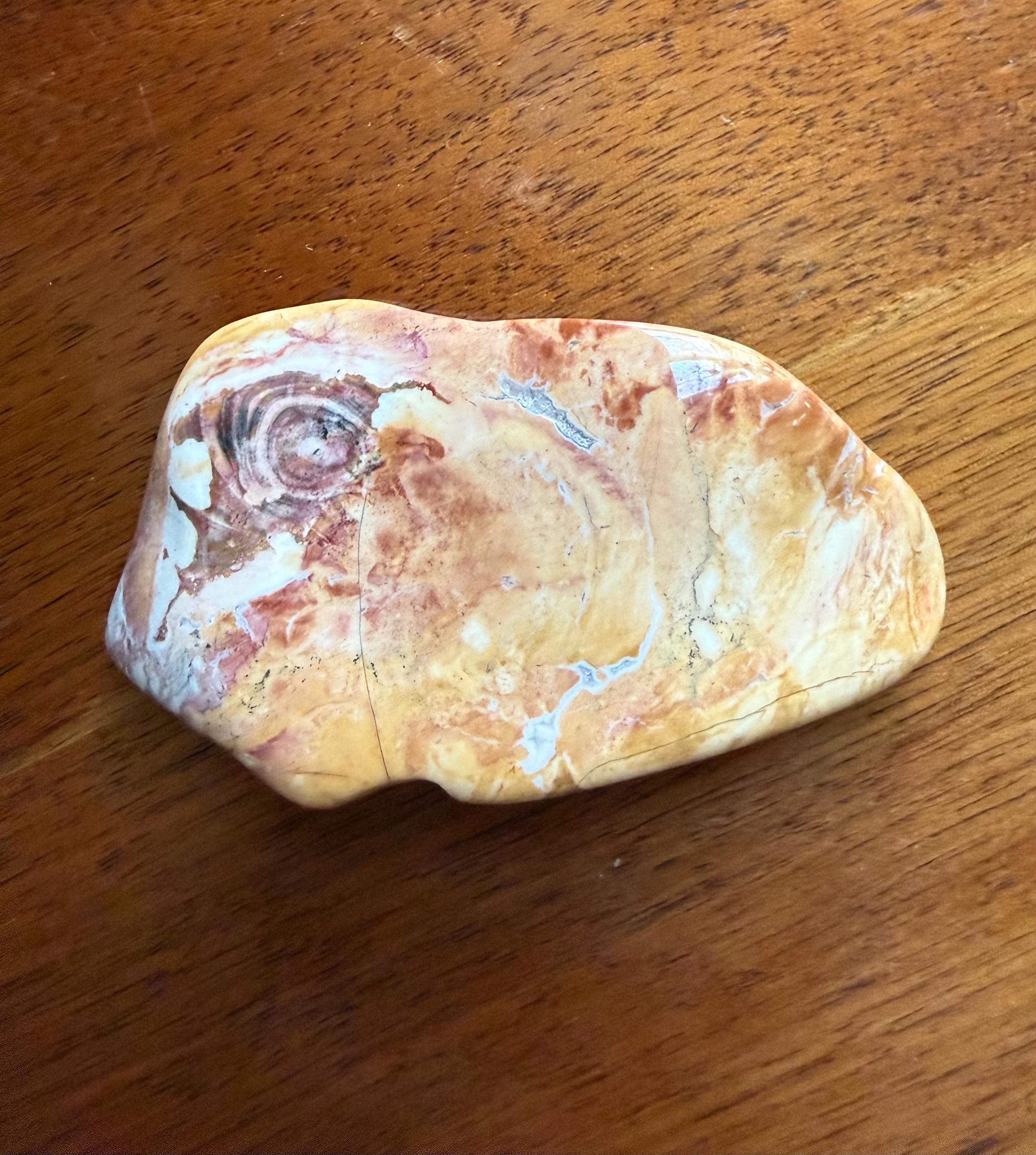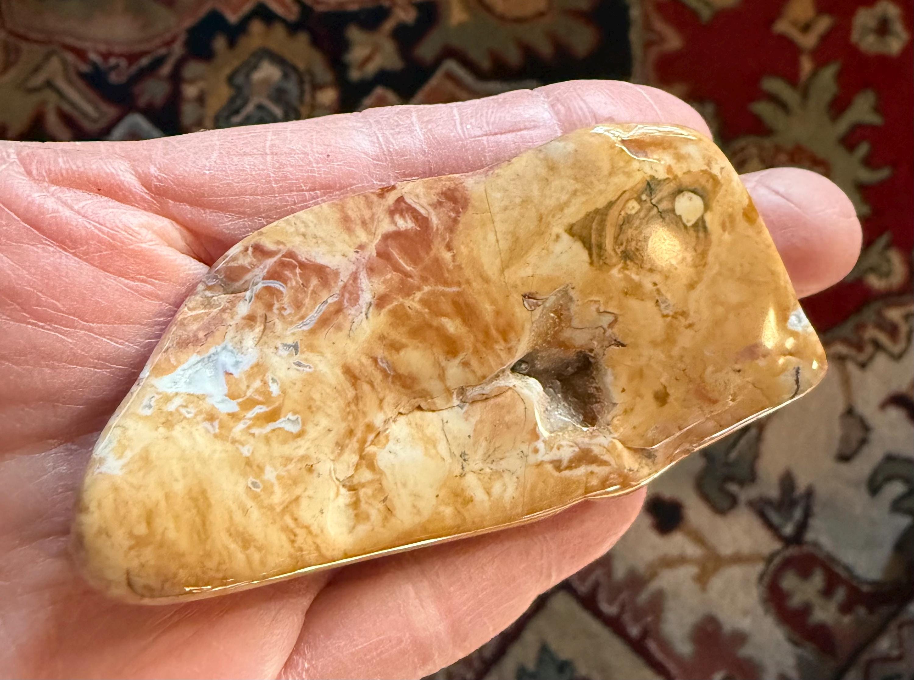 A beautiful freeform palm slab of natural Rainbow Flint from Ohio with colors of yellow, dark grey, orange, and gold with a gorgeous central druzy cavern on one side and an orb on the other side.
