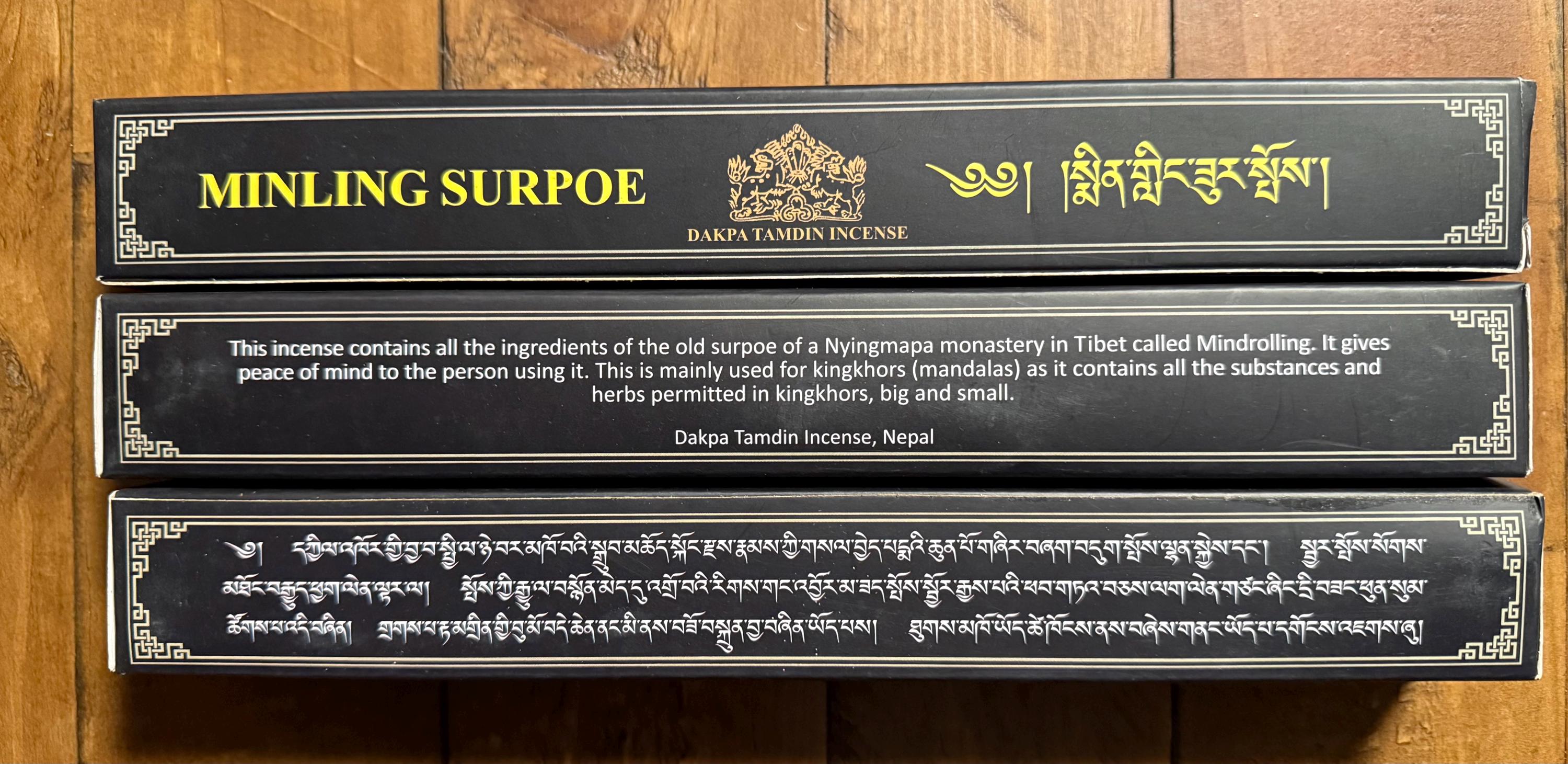 Minling Surpoe incense by Dakpa Tamdin contains all the ingredients of the surpoe of the Nyingmapa Mindroling monastery in Tibet.