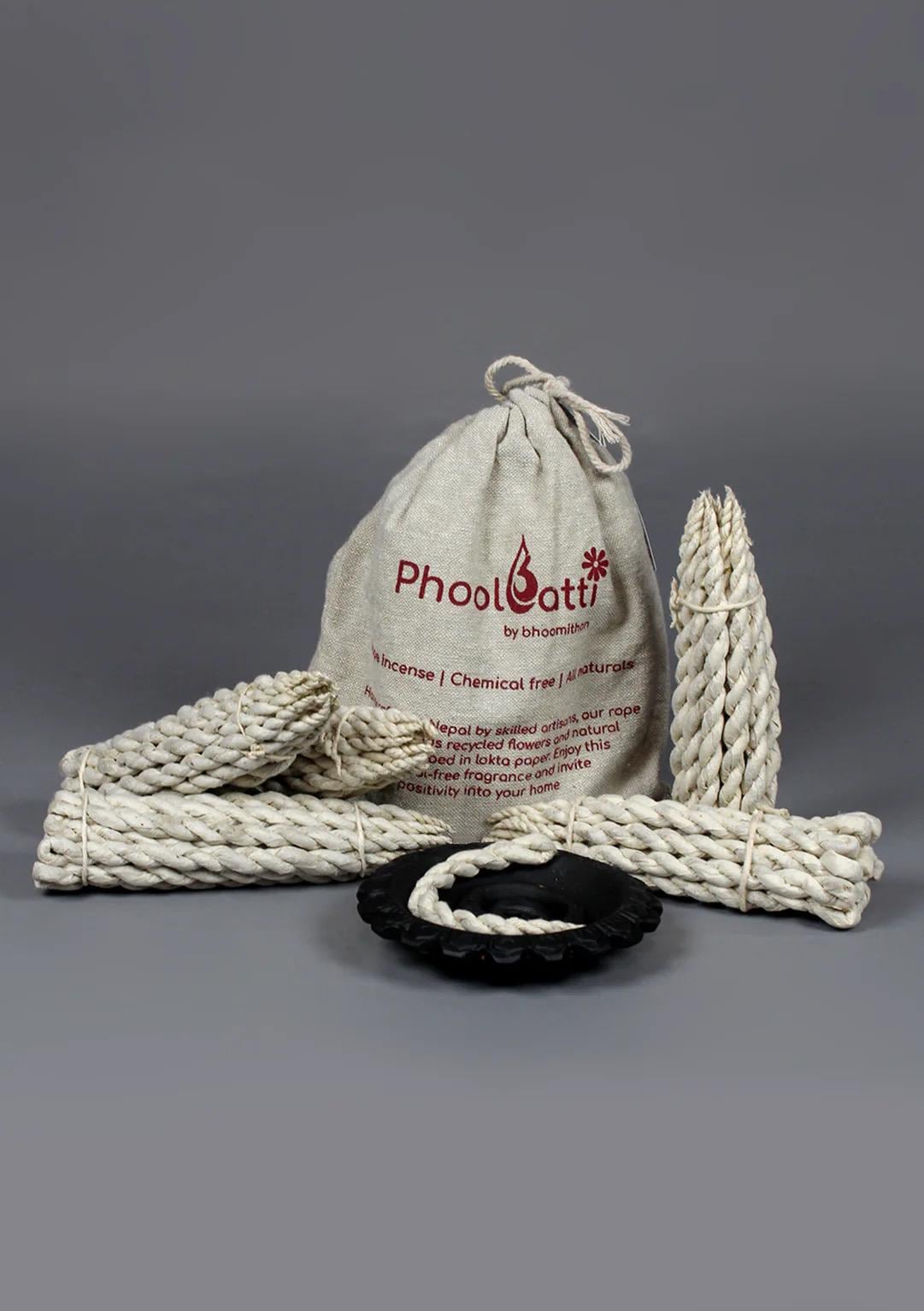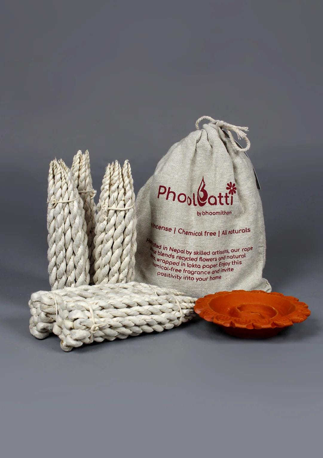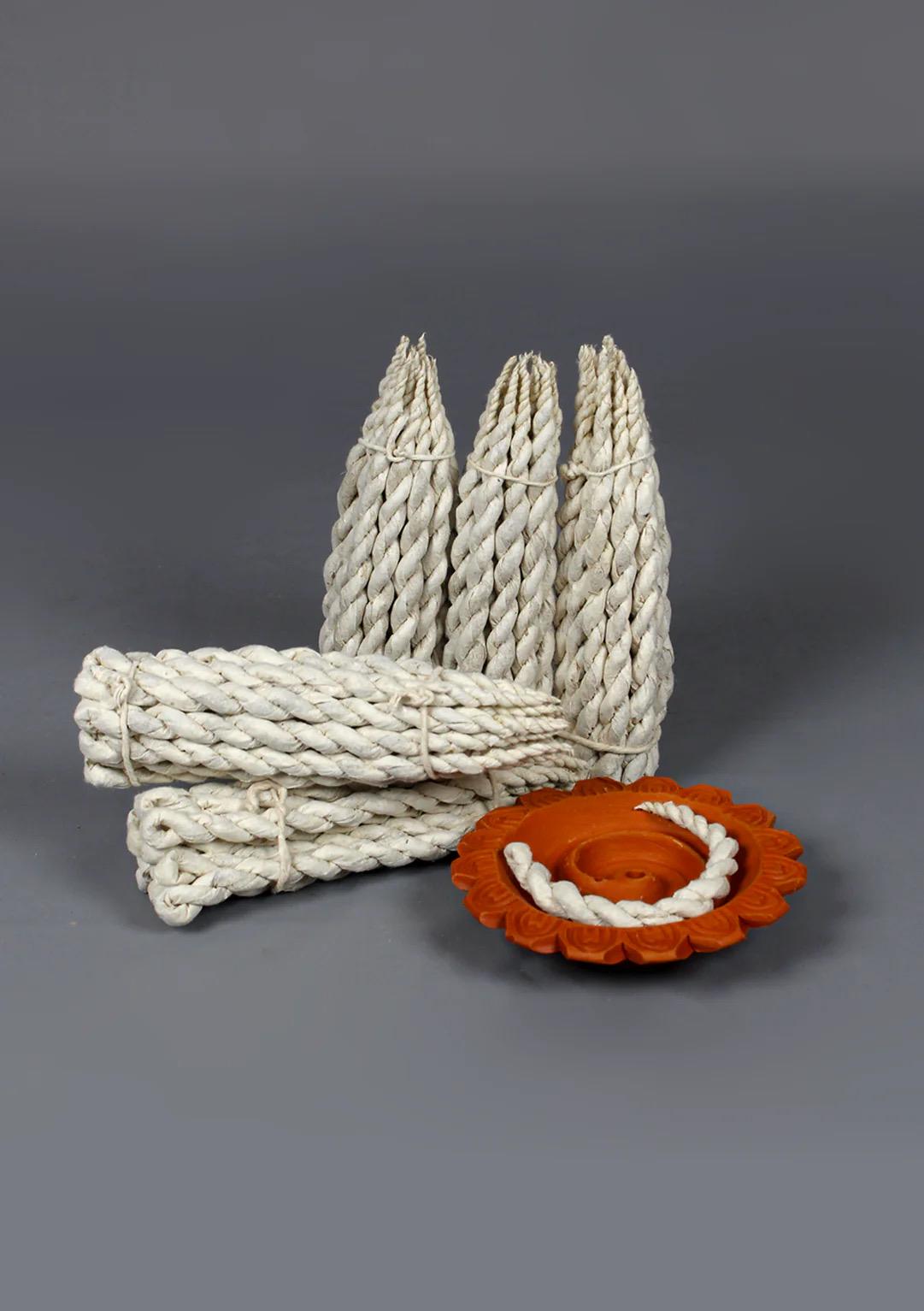 Phoolbatti Rope Incense with Spiral Clay Incense Burner in a burlap bag: includes 5 bundles with 15 ropes incense each = 75 ropes in total, Weight: 120 grams approx