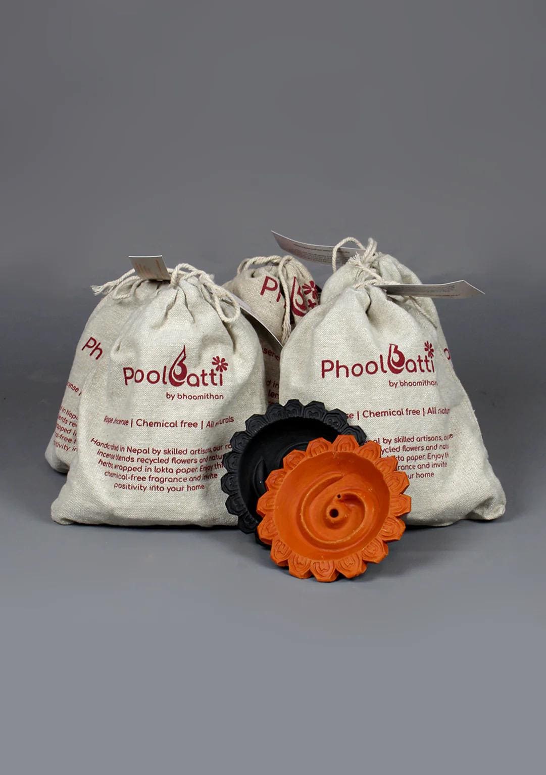 Each bag comes with a spiral clay incense burner, chosen at random in black or natural brown.
