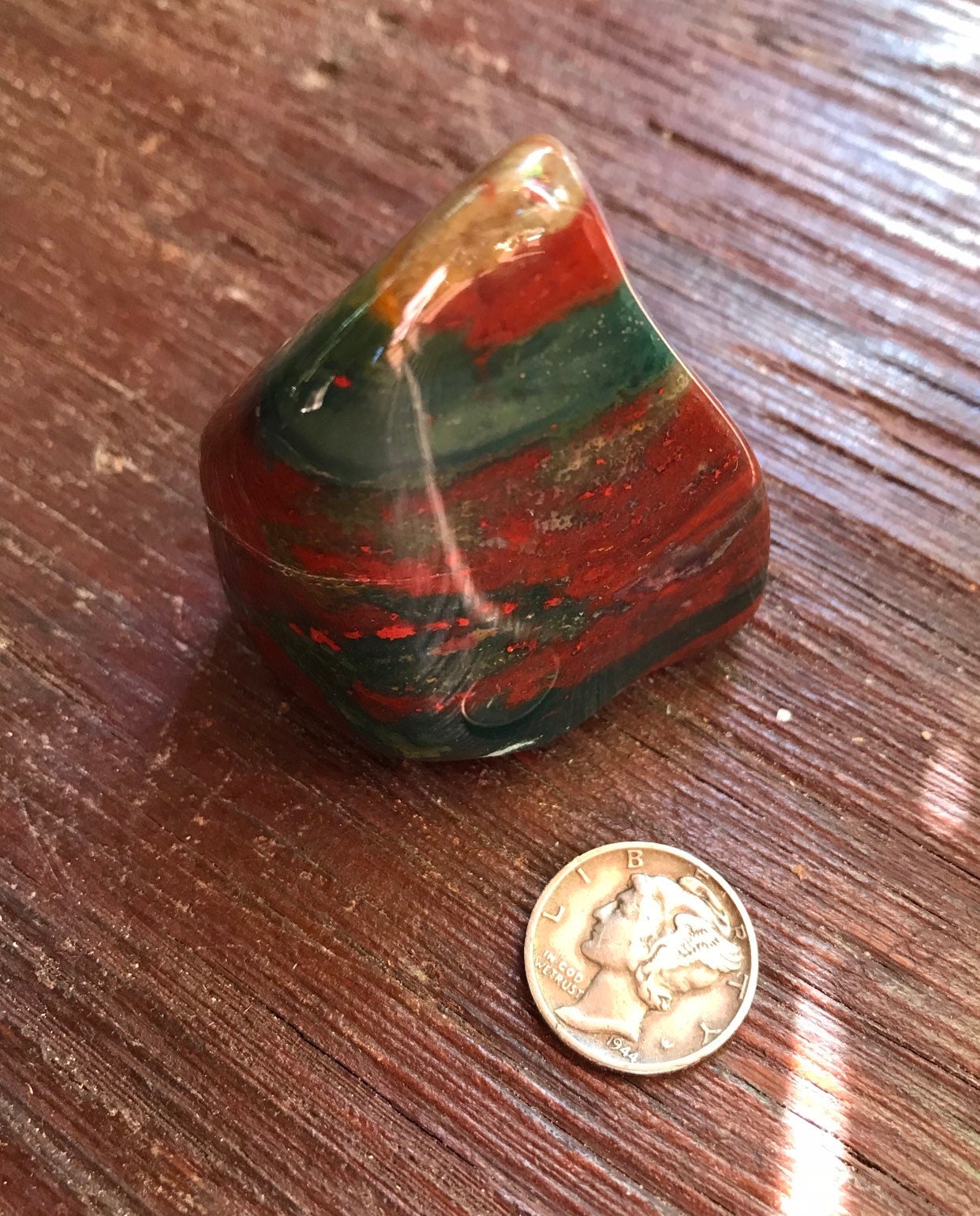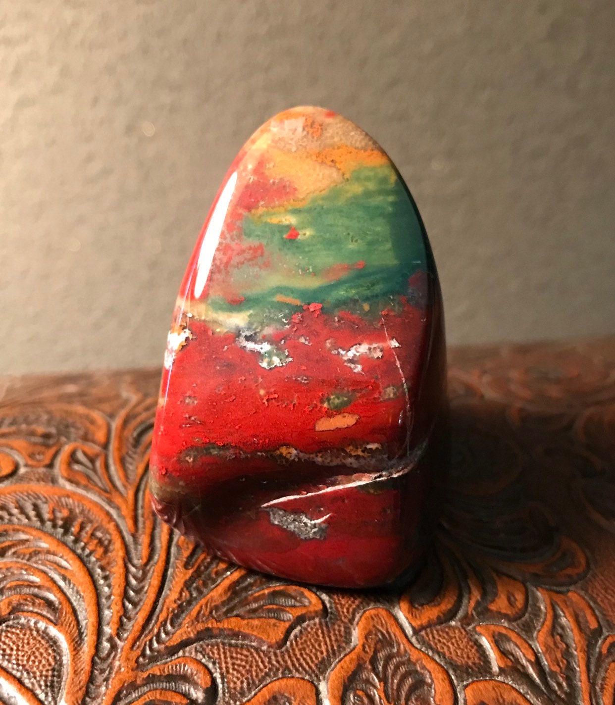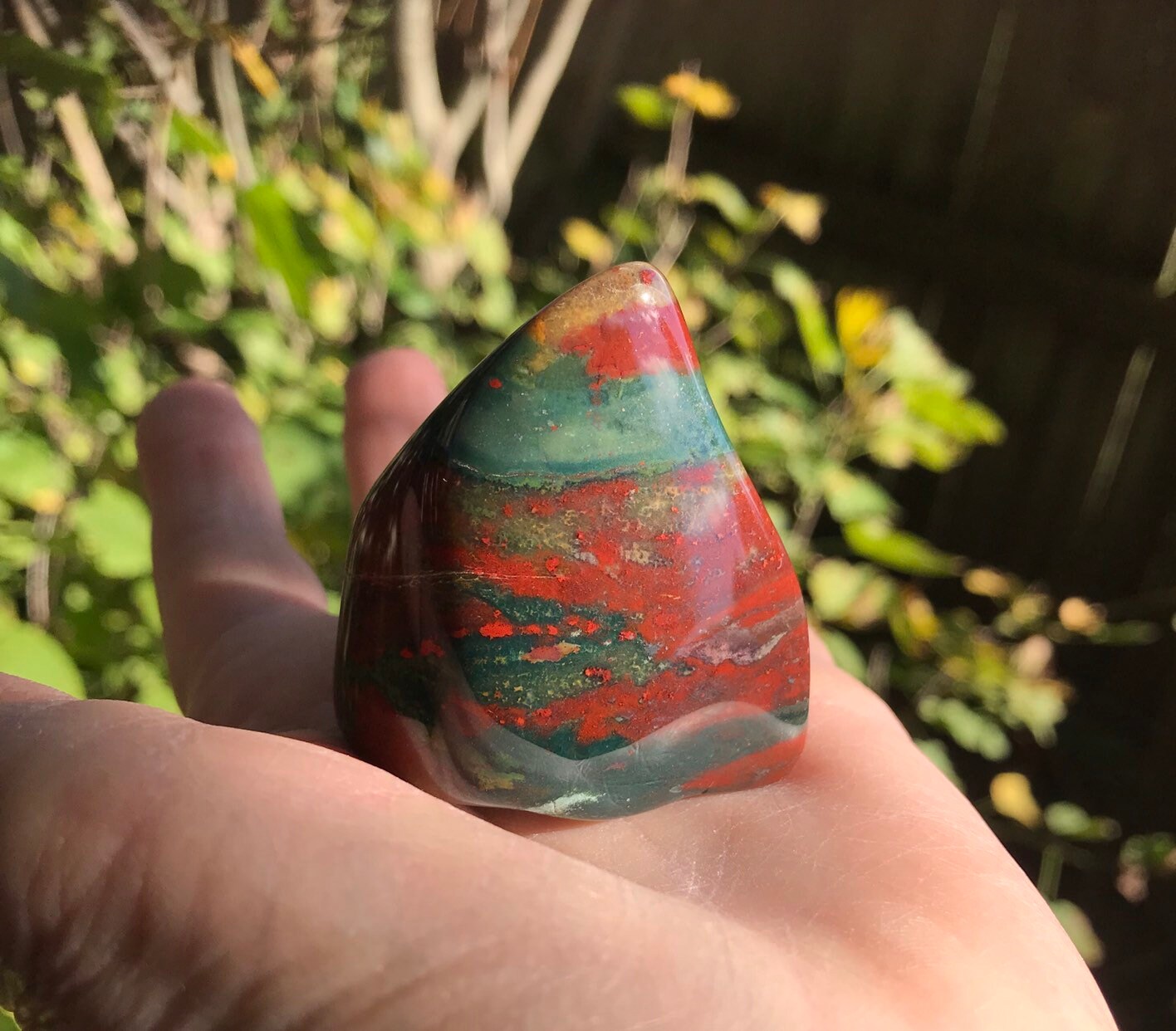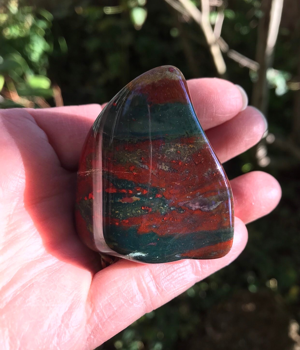 A lovely free form polished Bloodstone palm stone that stands up on one end.