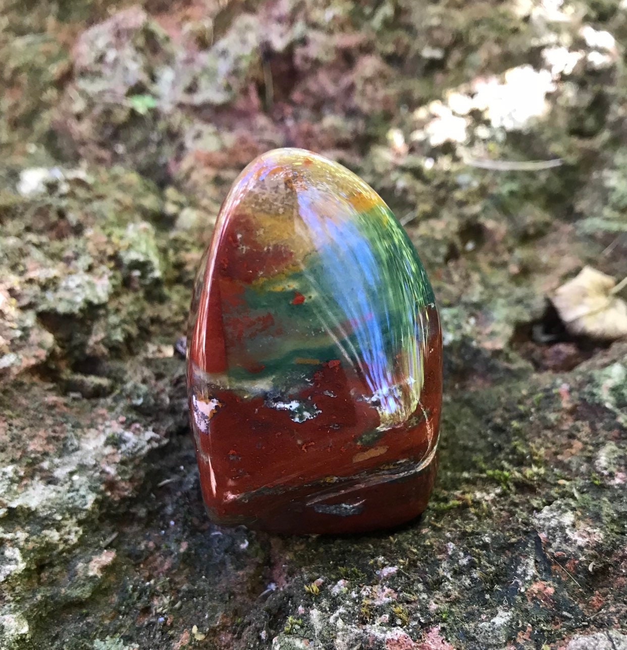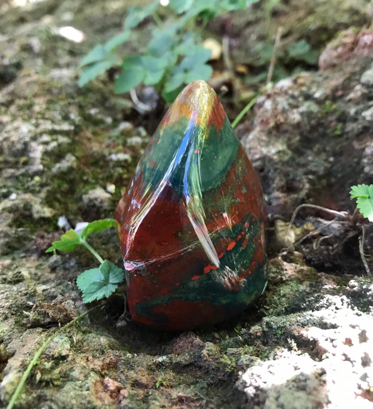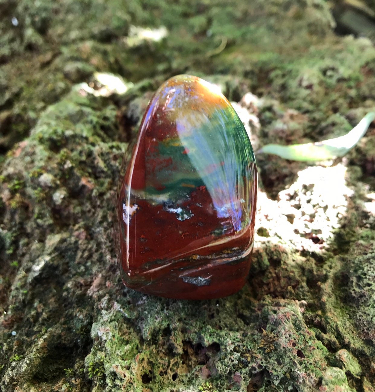 This lovely stone has gorgeous shades of green, and patterning of red and yellow.